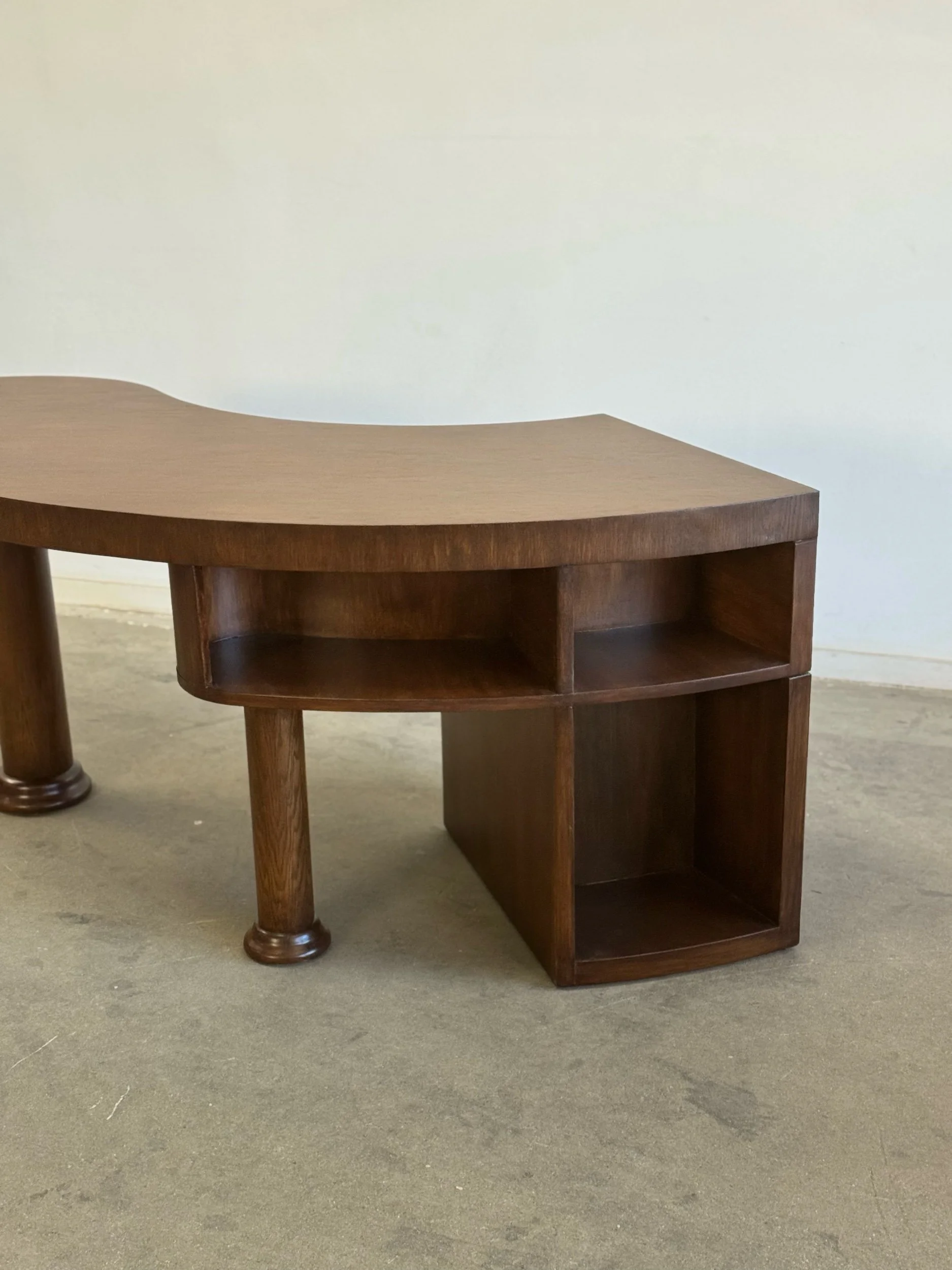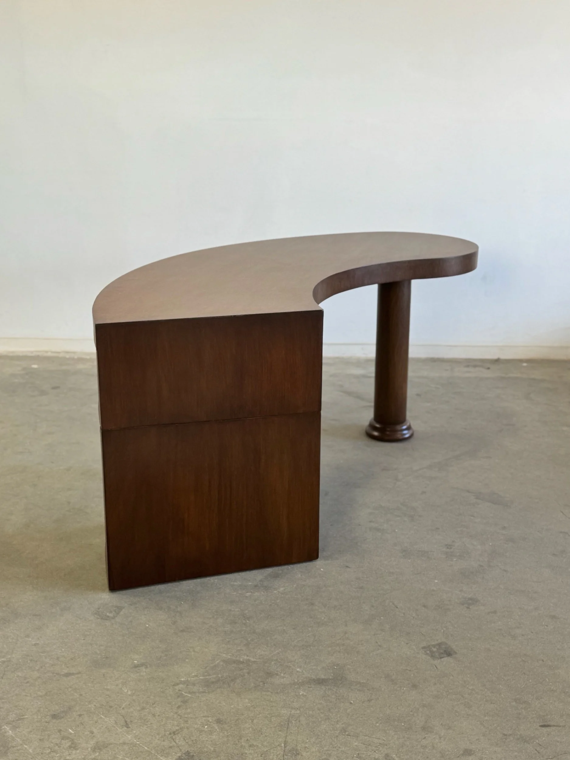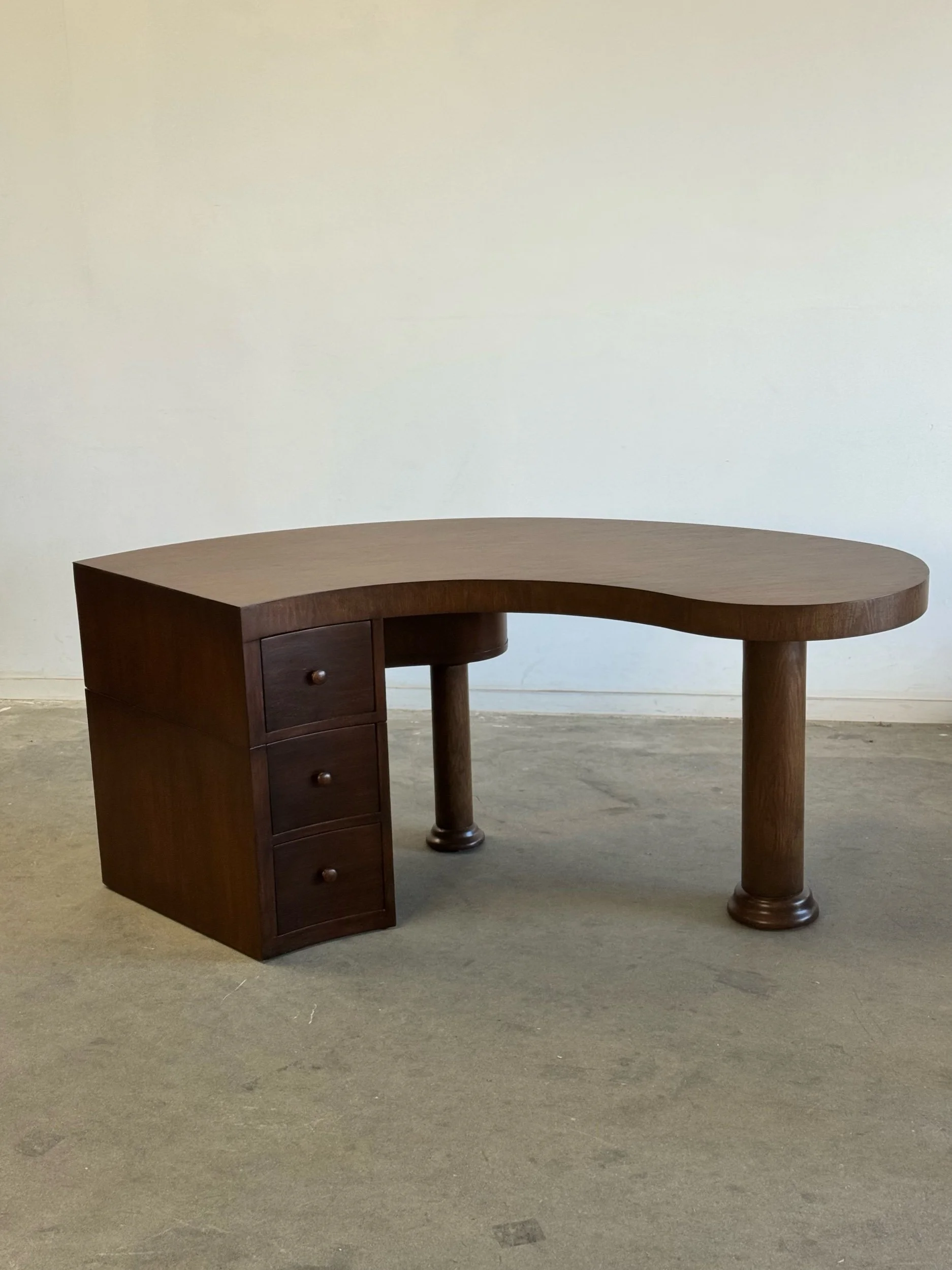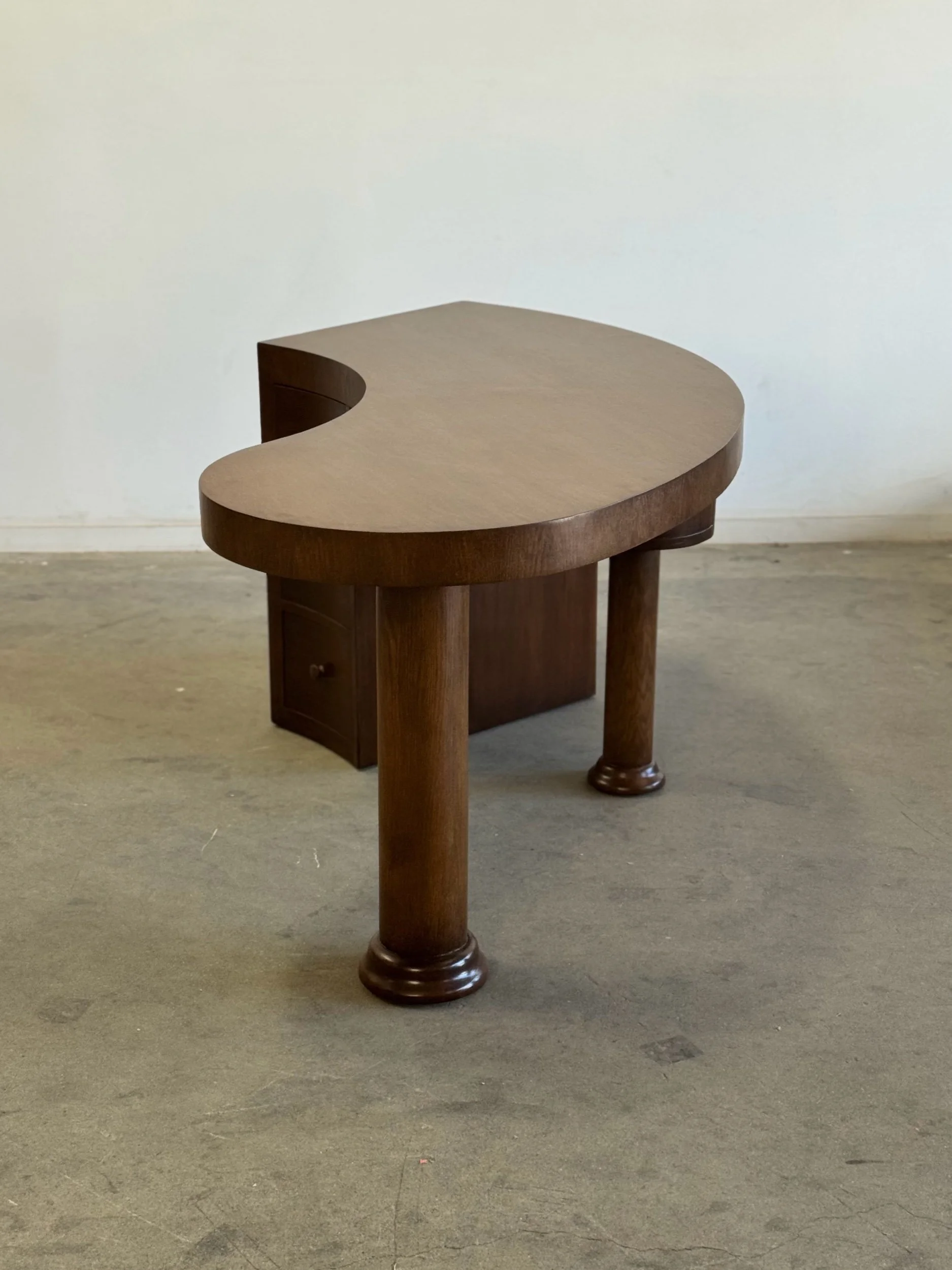Custom desk made previously circa 1980-90s. Unit was not made in house but we have fully restored this item. Unit features a very unique design with Victorian style column legs , and post modern surface elements. Kidney surface shows well with no major areas of wear and drawer portion dissembles at division for easier transportation. Desk features an open bookcase on the back portion and three deep drawers.