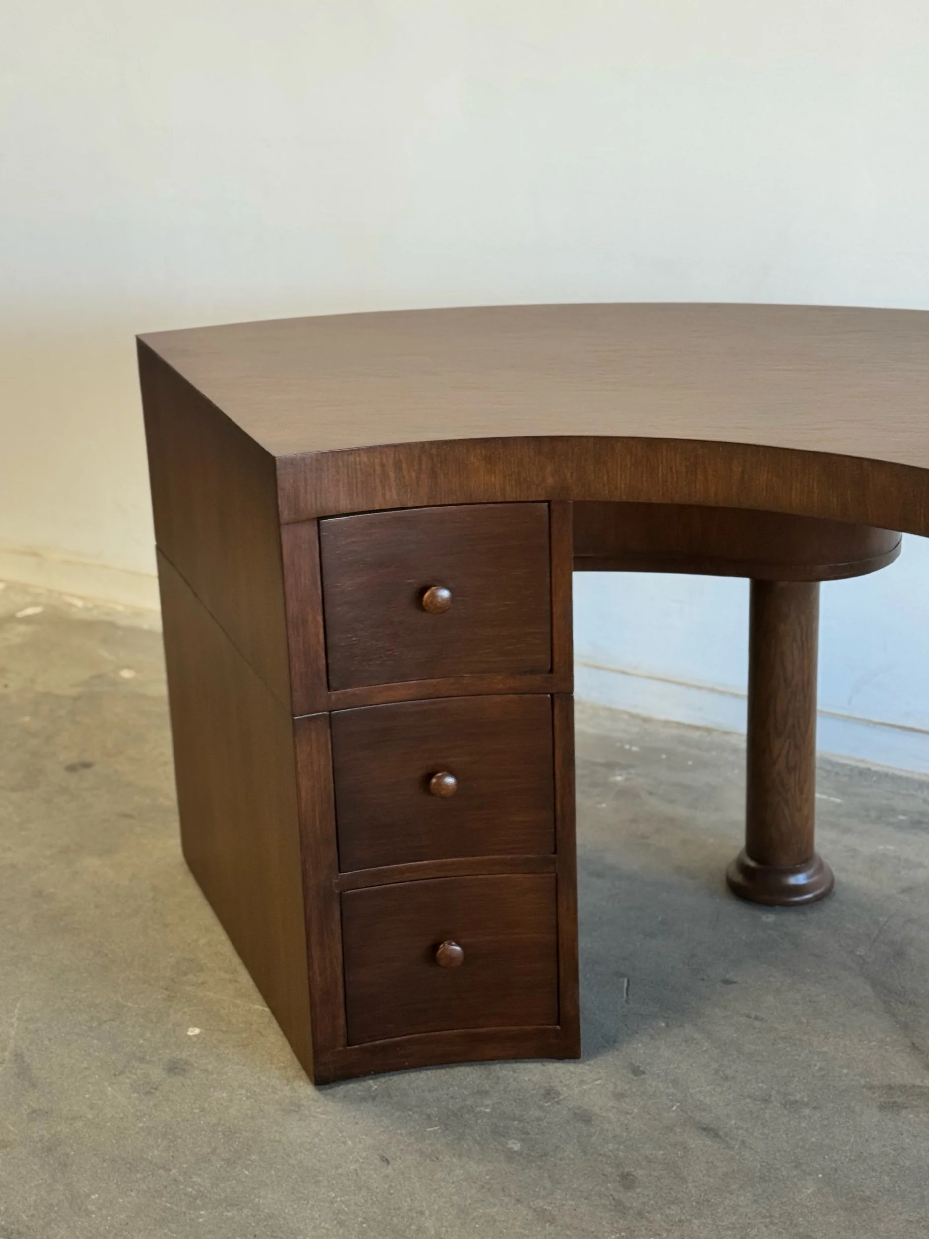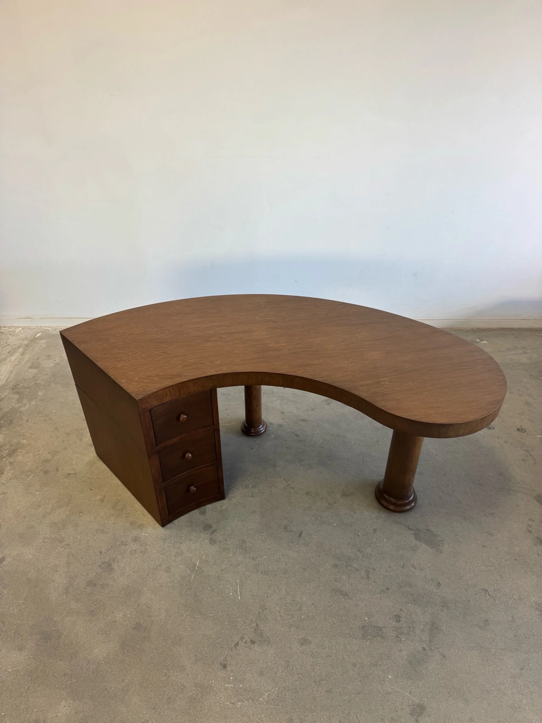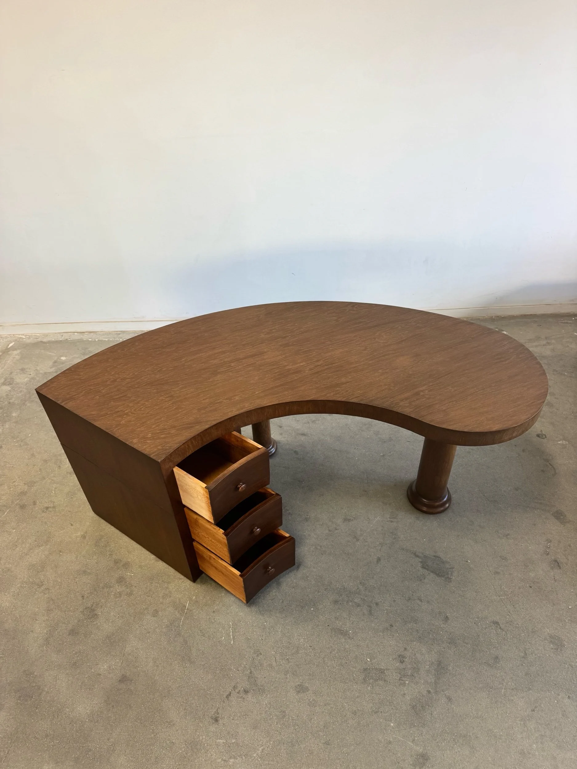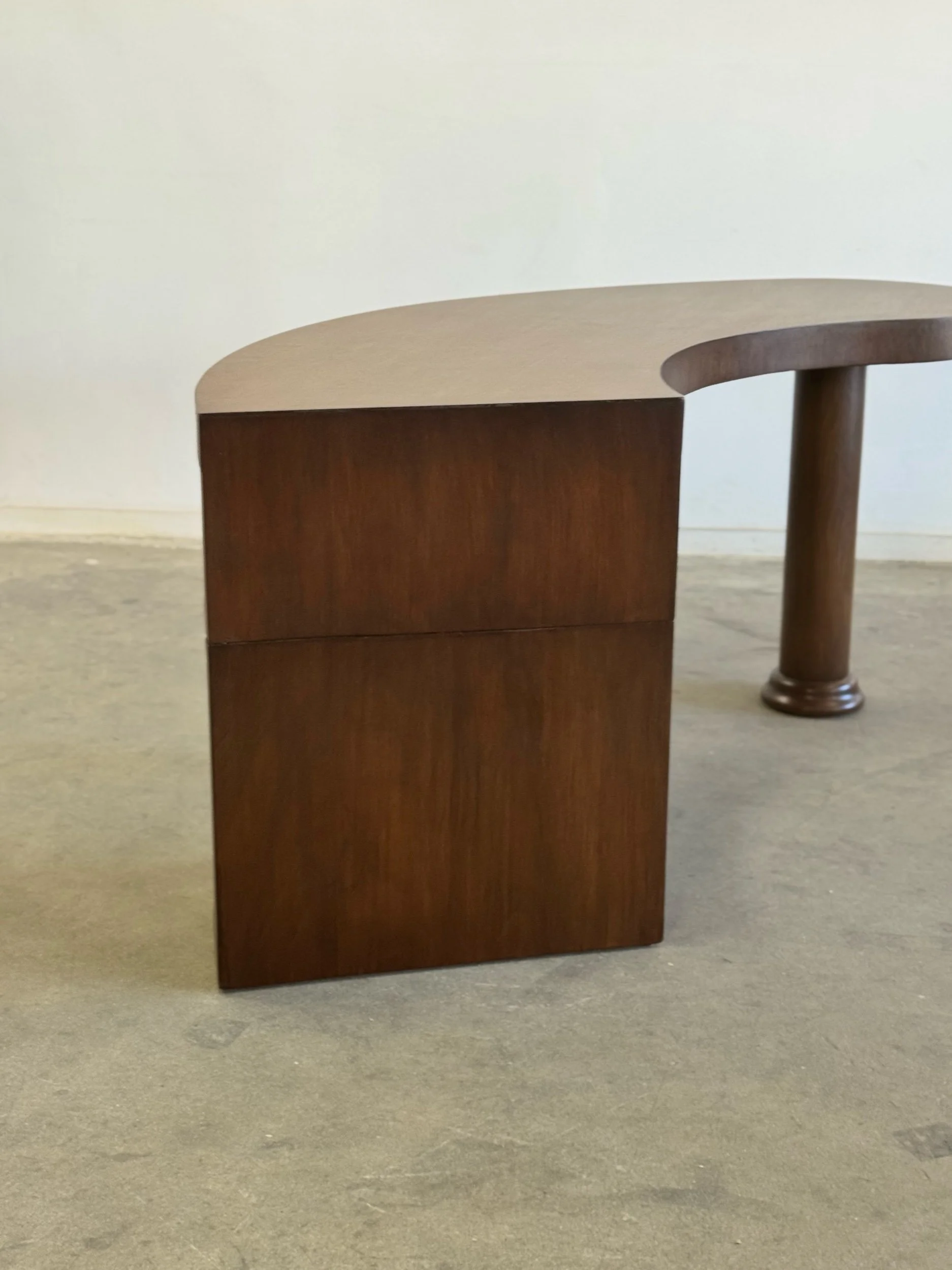 Custom desk made previously circa 1980-90s. Unit was not made in house but we have fully restored this item. Unit features a very unique design with Victorian style column legs , and post modern surface elements. Kidney surface shows well with no major areas of wear and drawer portion dissembles at division for easier transportation. Desk features an open bookcase on the back portion and three deep drawers.