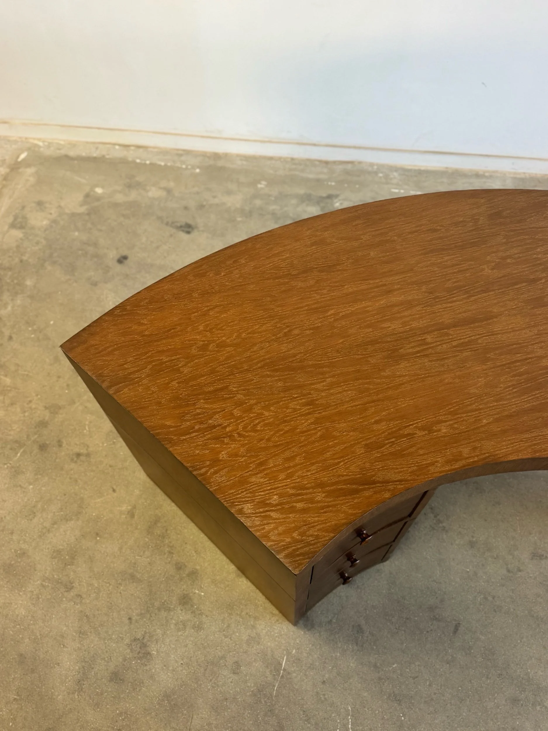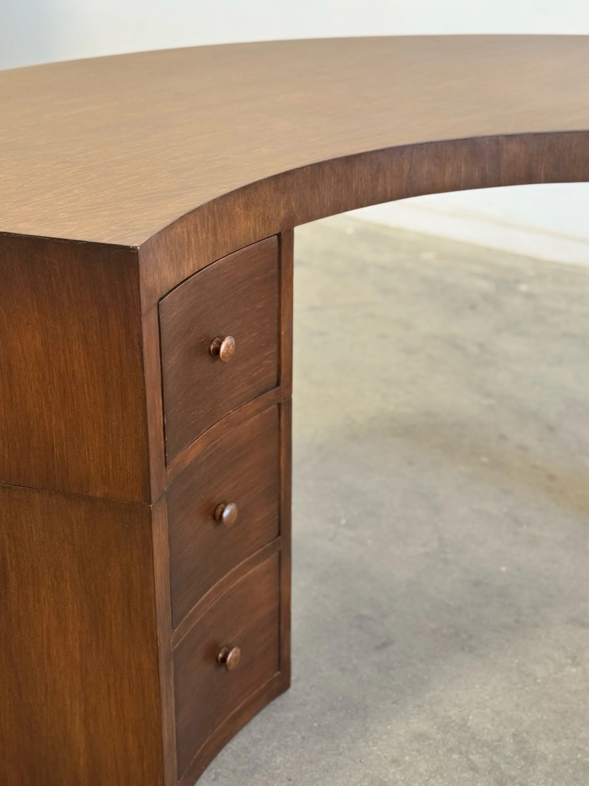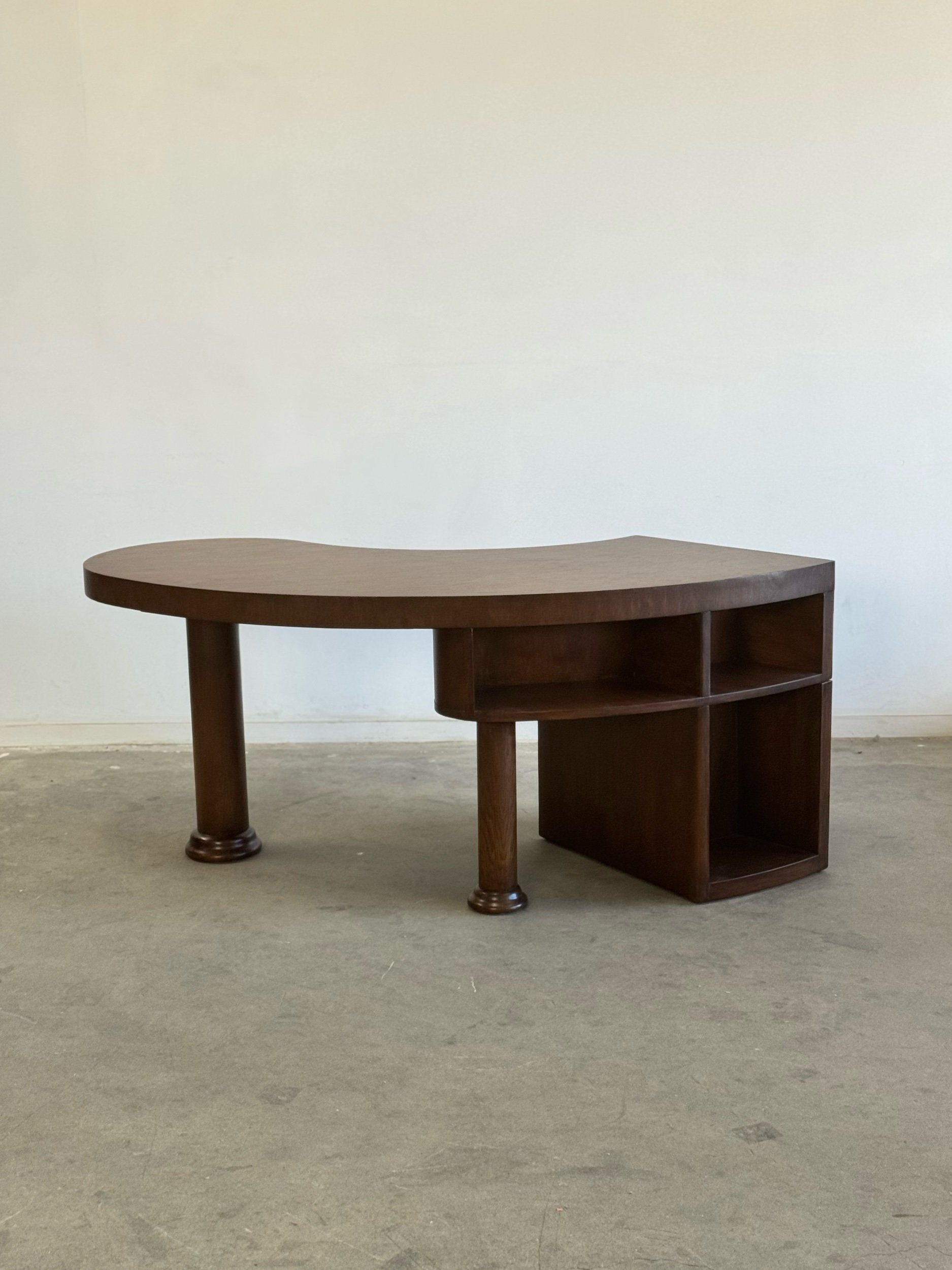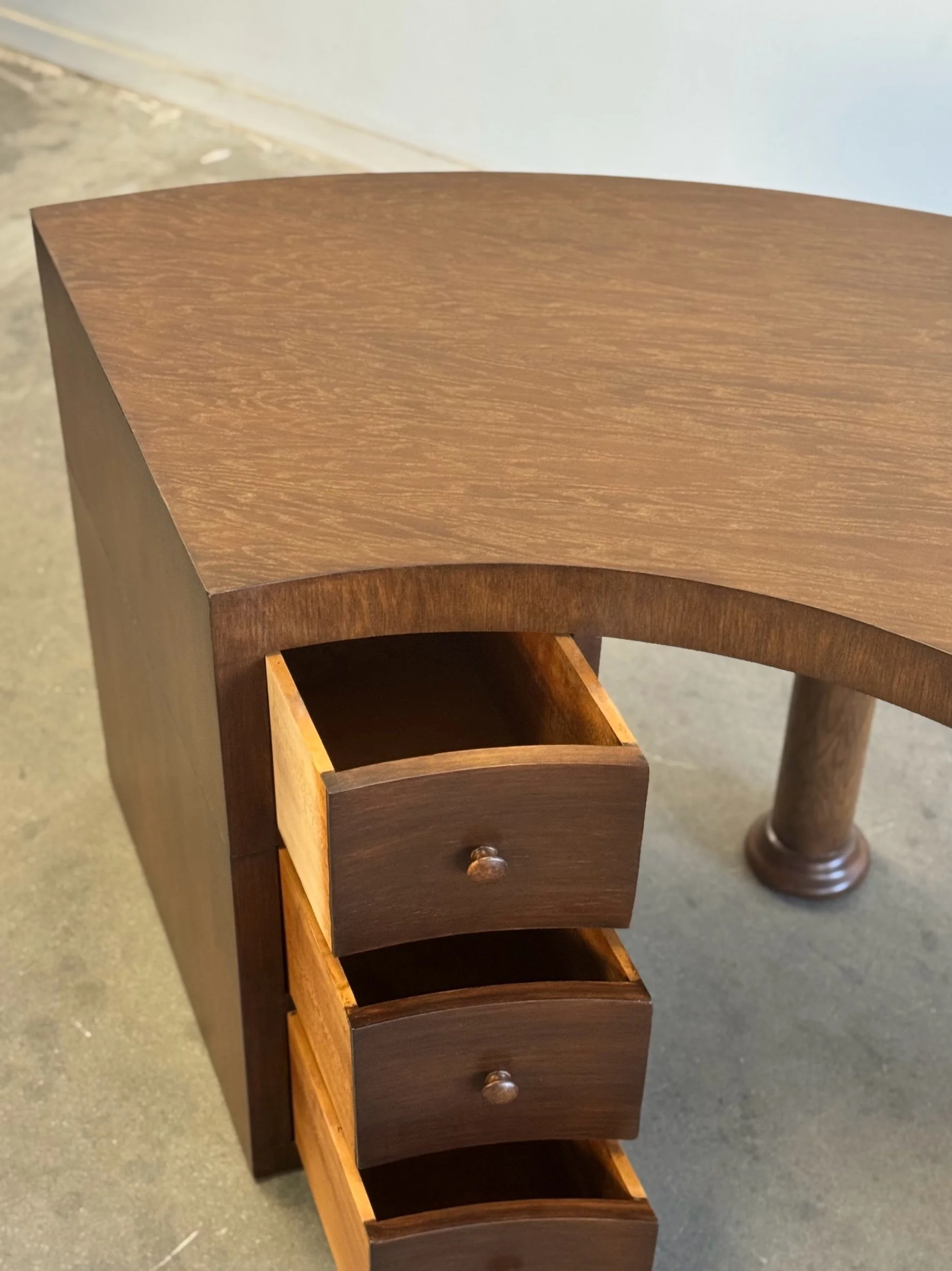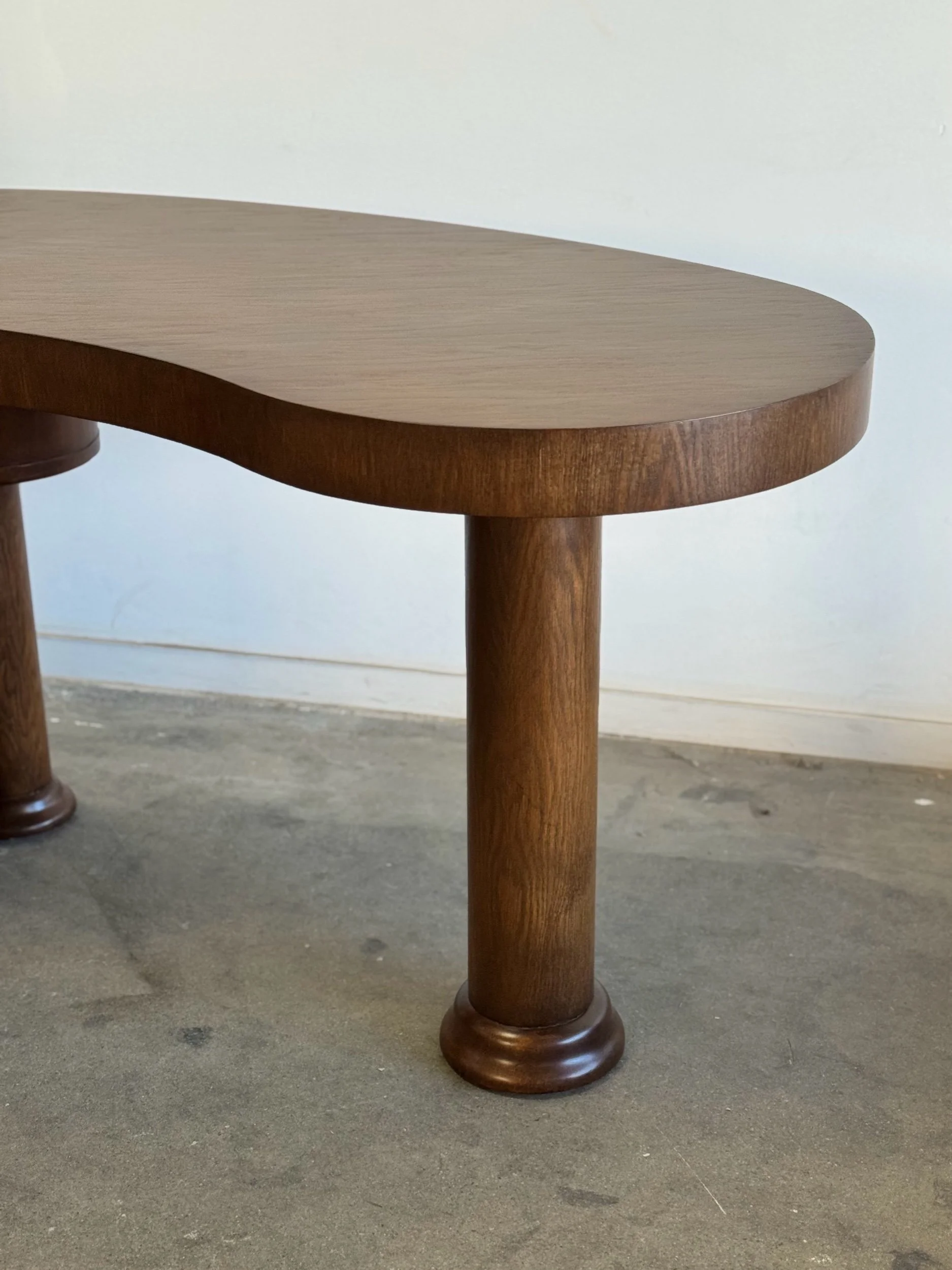 Custom desk made previously circa 1980-90s. Unit was not made in house but we have fully restored this item. Unit features a very unique design with Victorian style column legs , and post modern surface elements. Kidney surface shows well with no major areas of wear and drawer portion dissembles at division for easier transportation. Desk features an open bookcase on the back portion and three deep drawers.