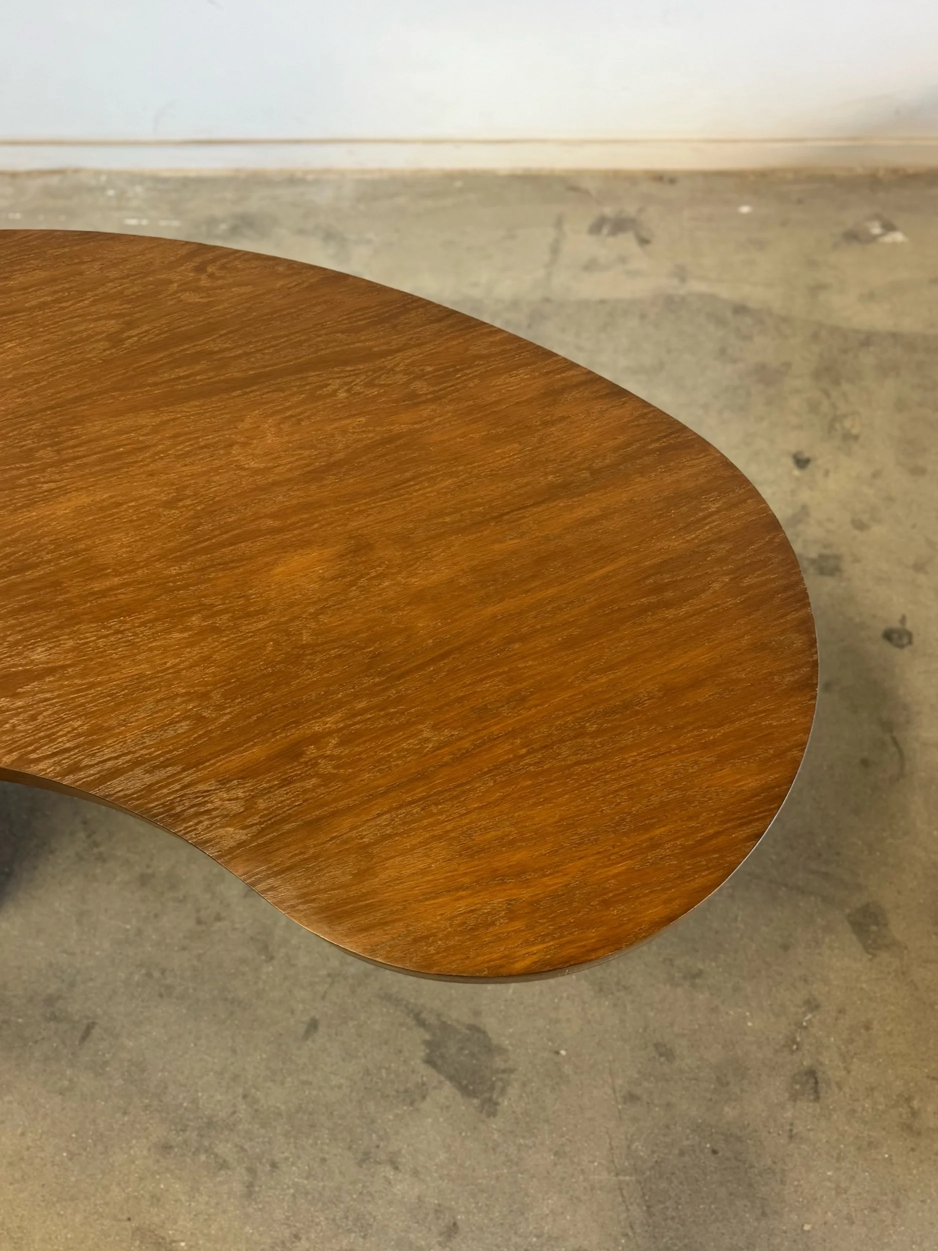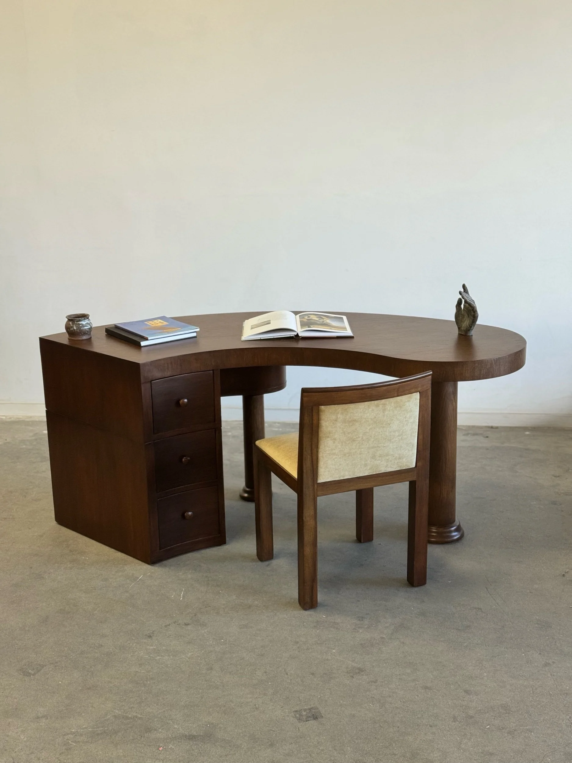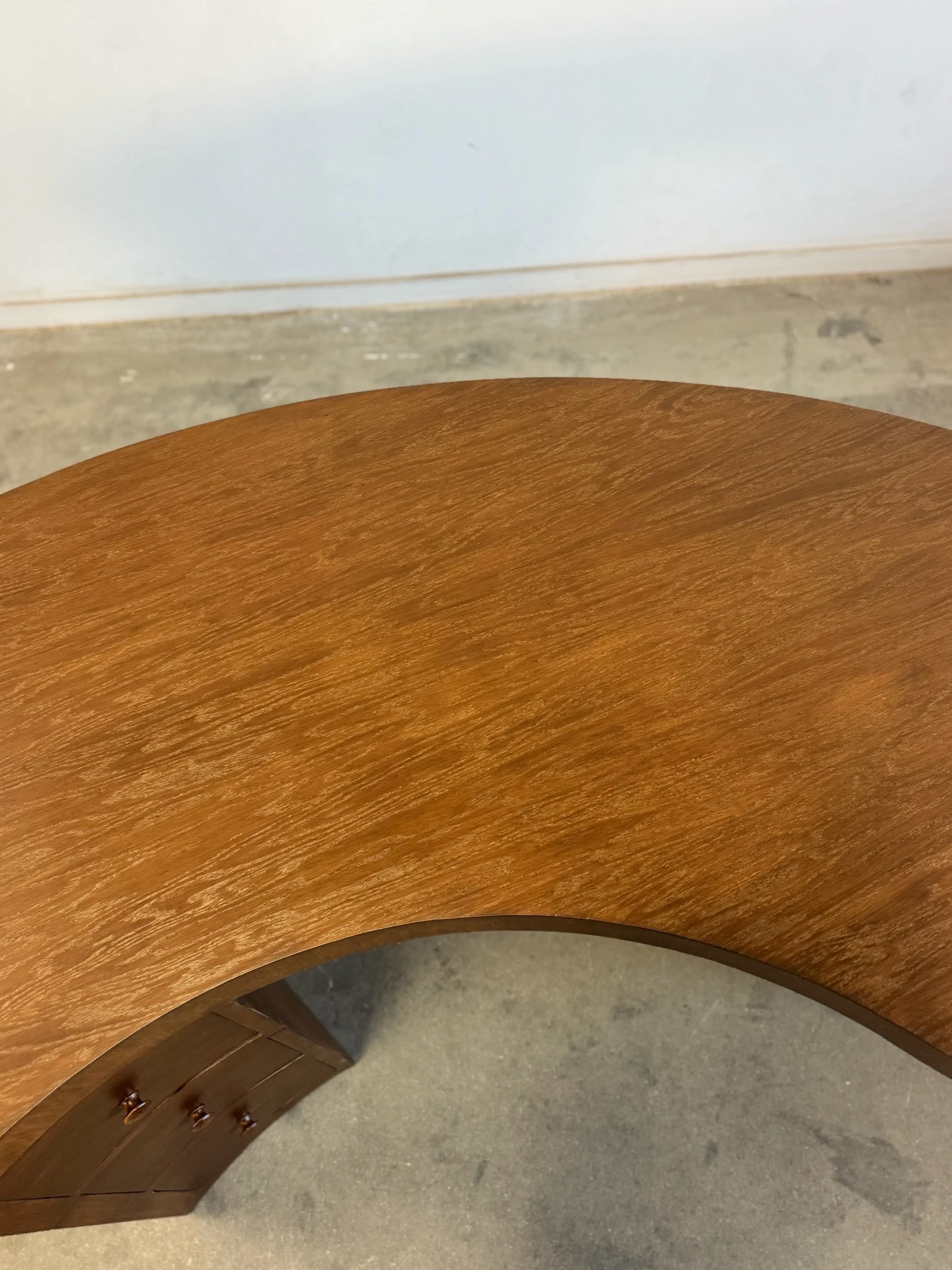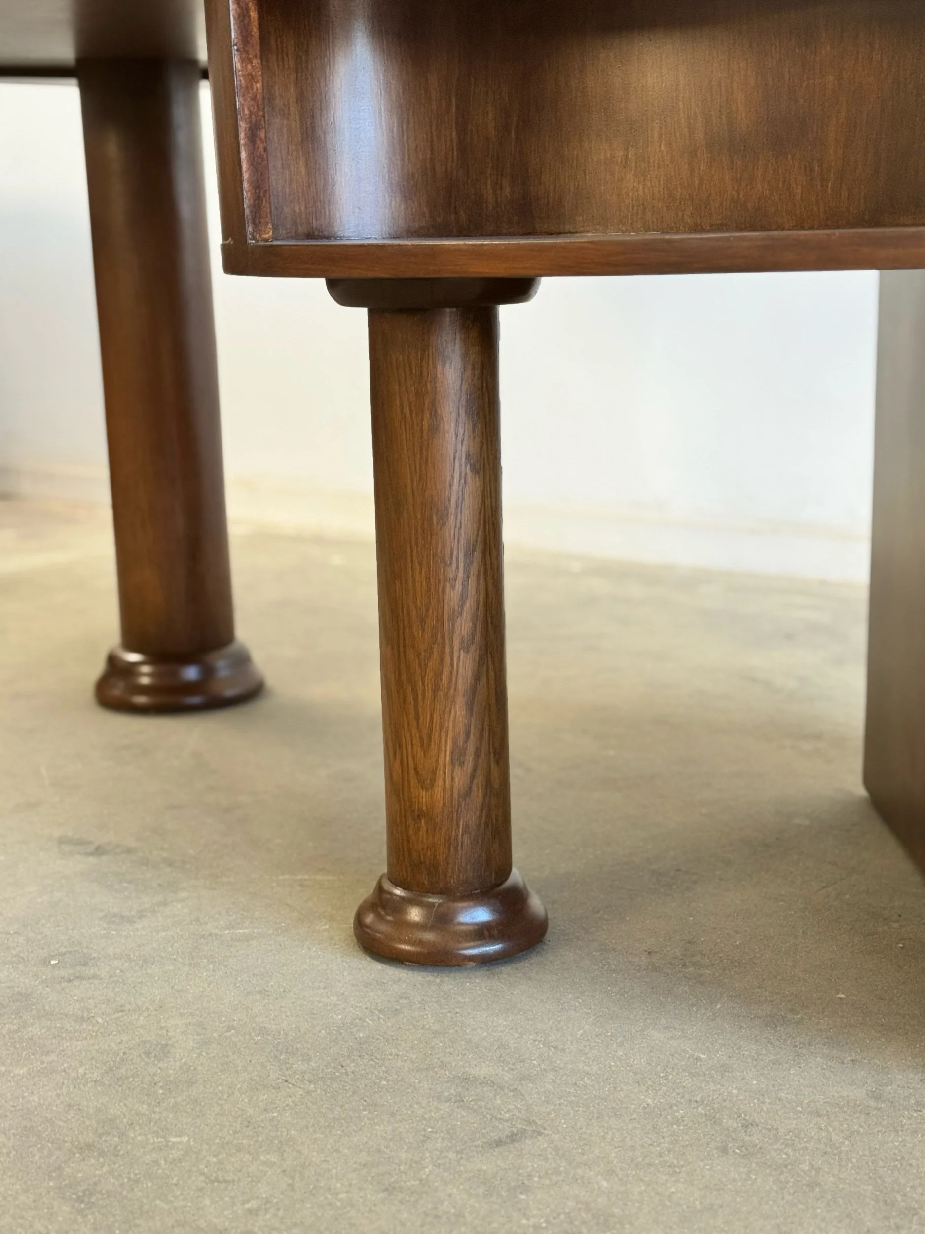 Custom desk made previously circa 1980-90s. Unit was not made in house but we have fully restored this item. Unit features a very unique design with Victorian style column legs , and post modern surface elements. Kidney surface shows well with no major areas of wear and drawer portion dissembles at division for easier transportation. Desk features an open bookcase on the back portion and three deep drawers.