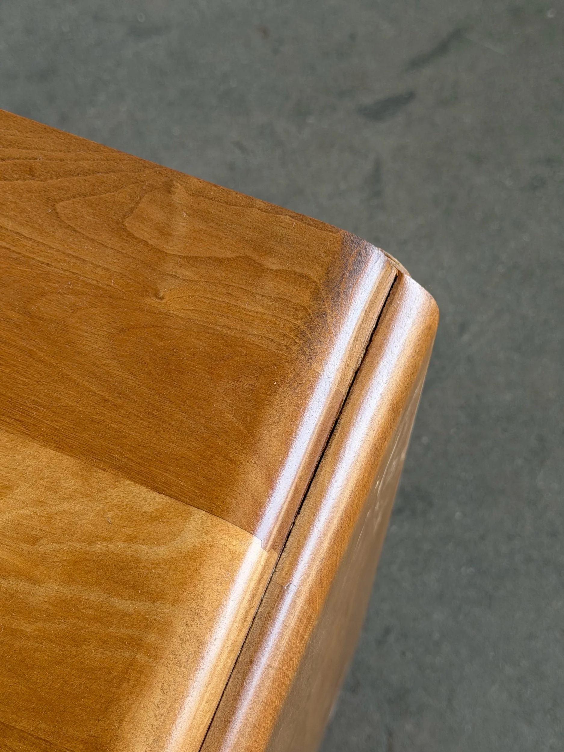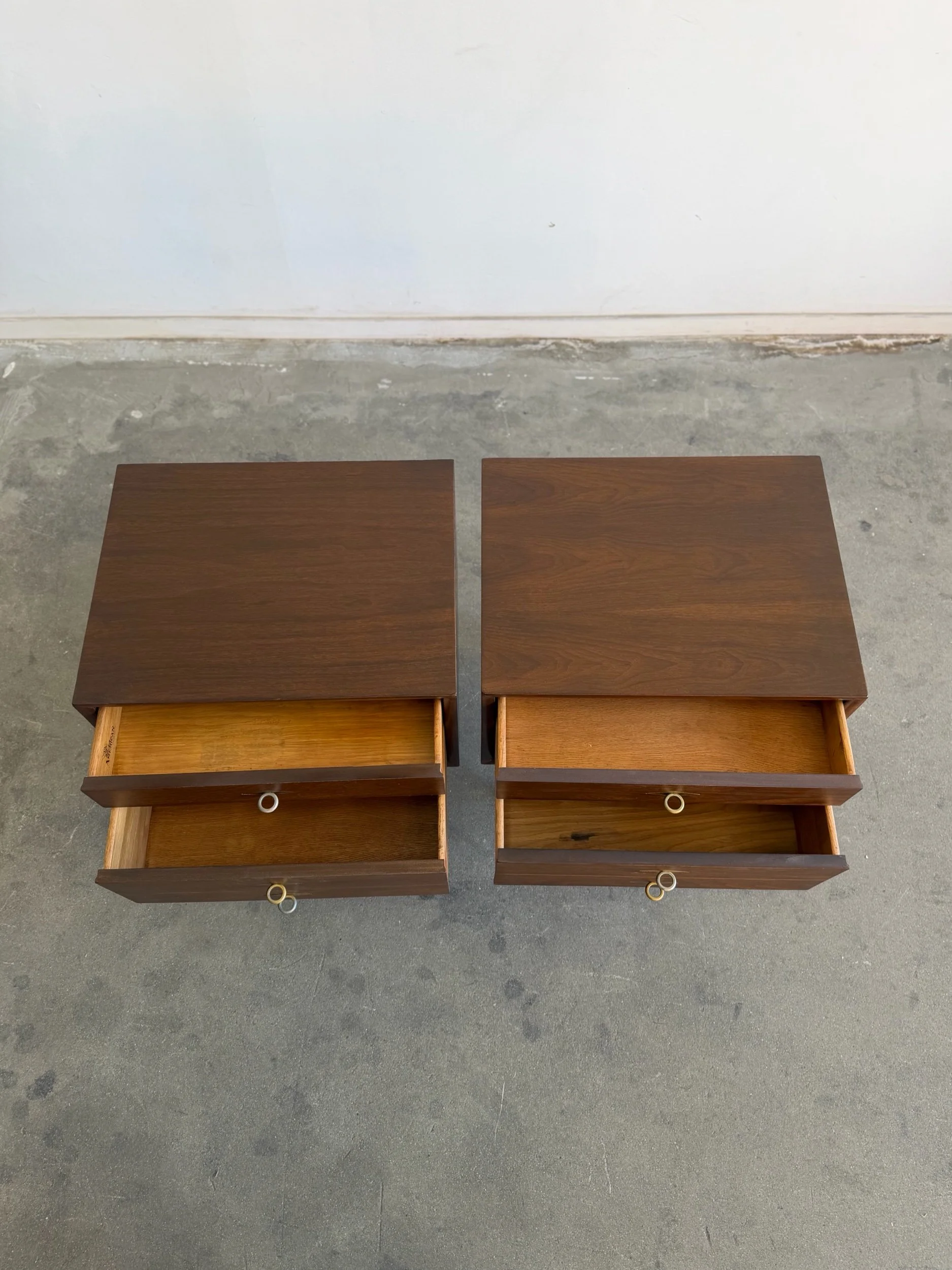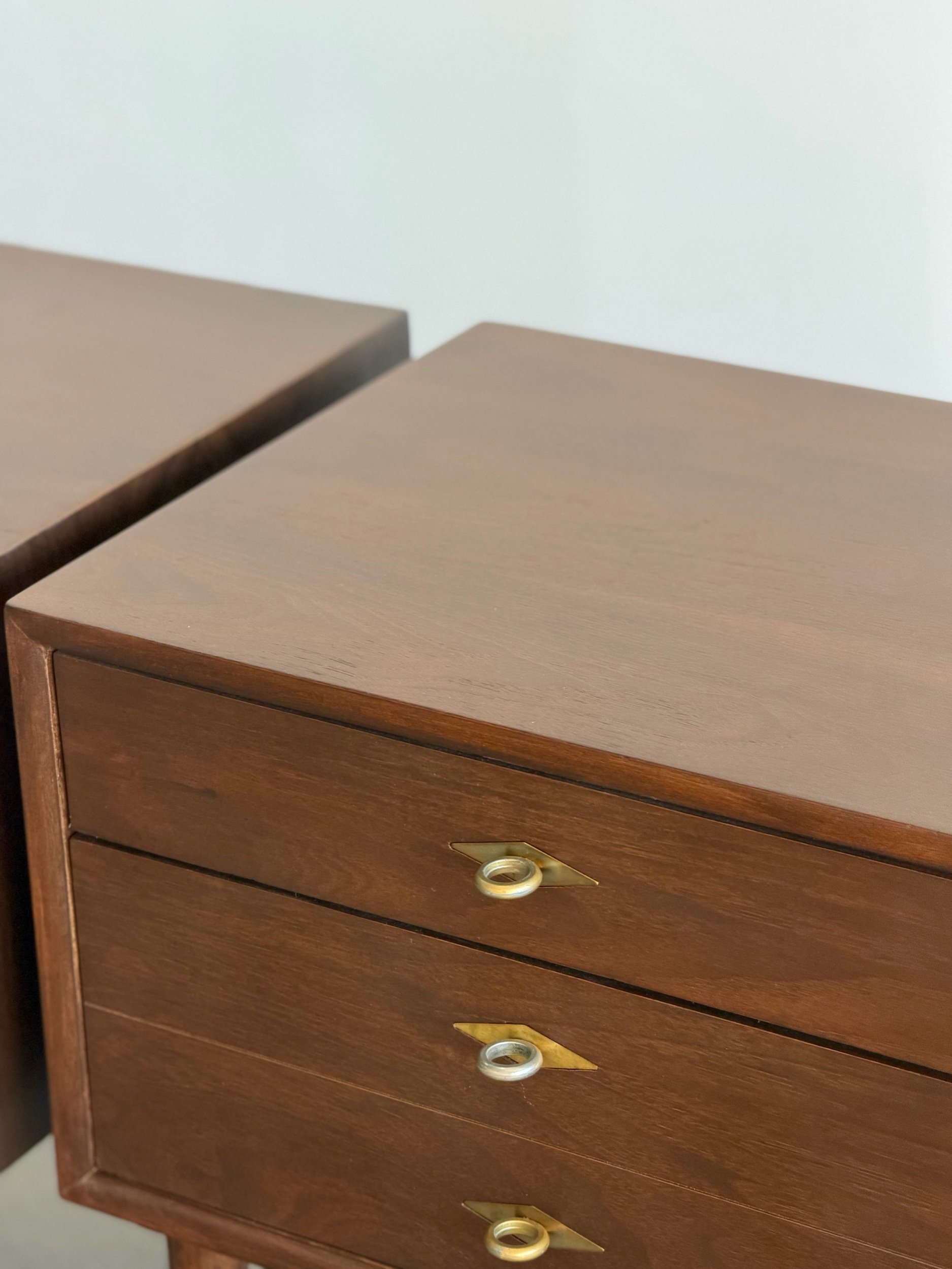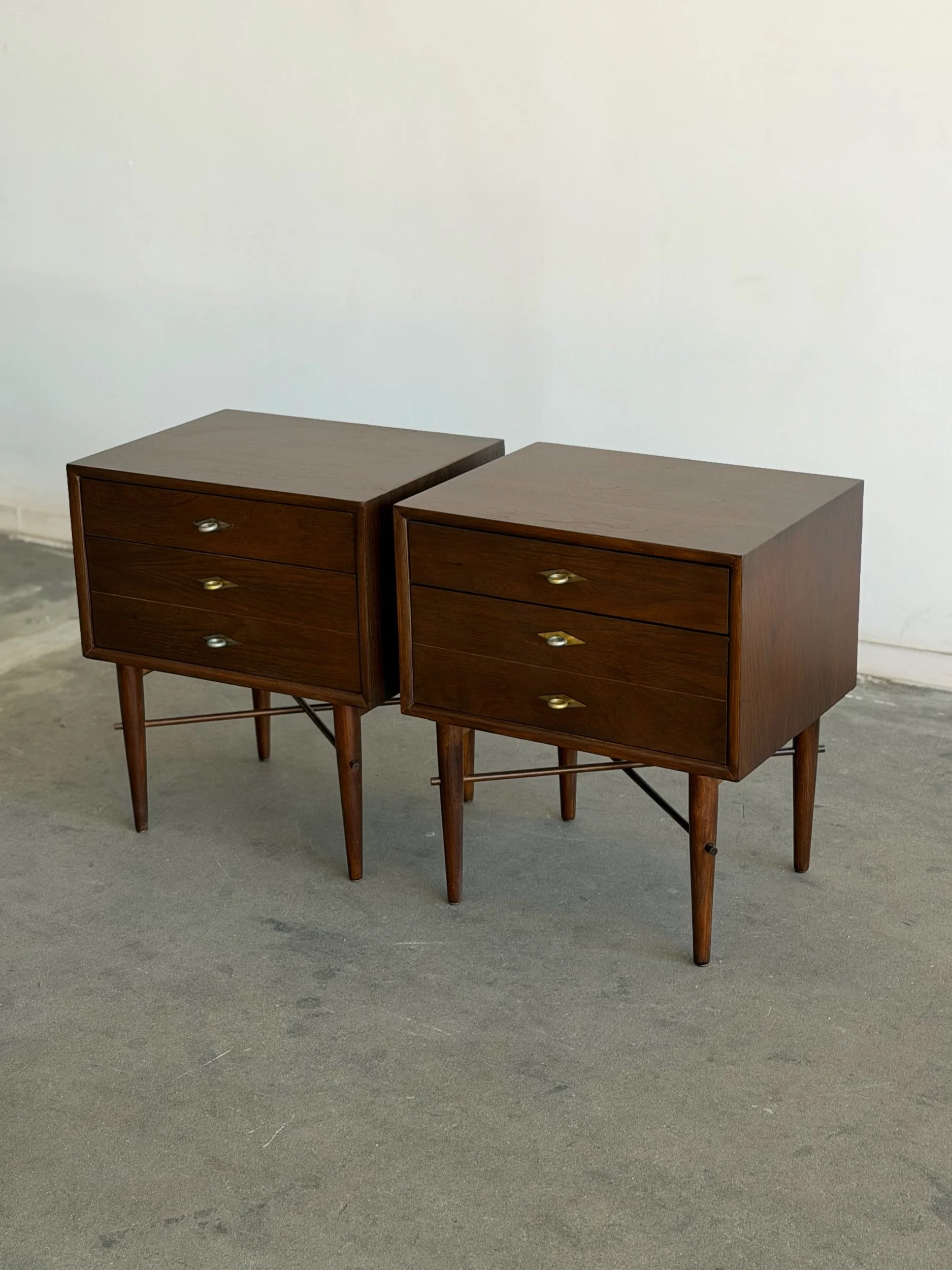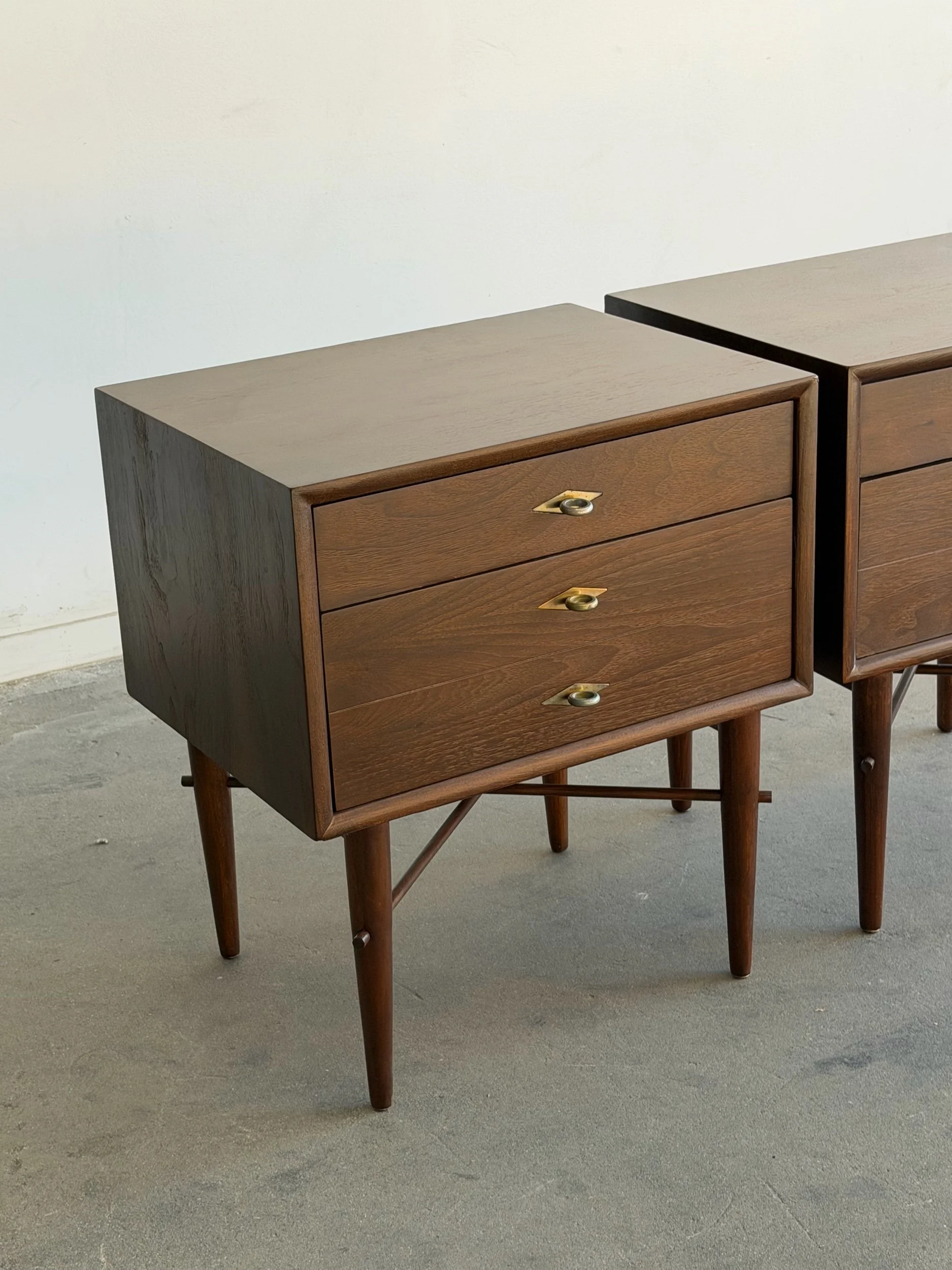Fully restored walnut nightstands in a dark finish. Each unit is structurally sound and sturdy with no wobble. Units feature inset brass hardware , dowel supports , and units still have original manufacturer stamp.