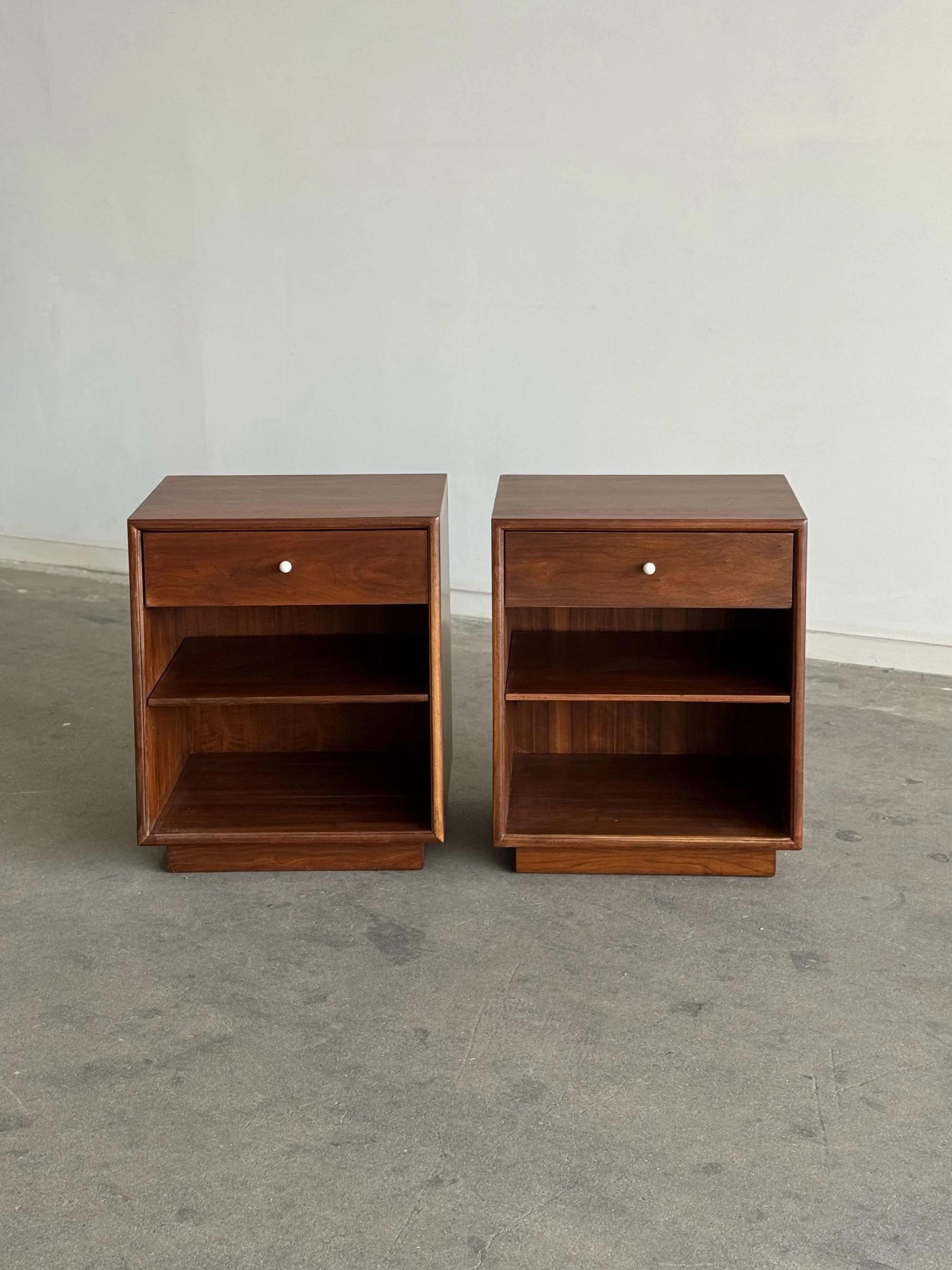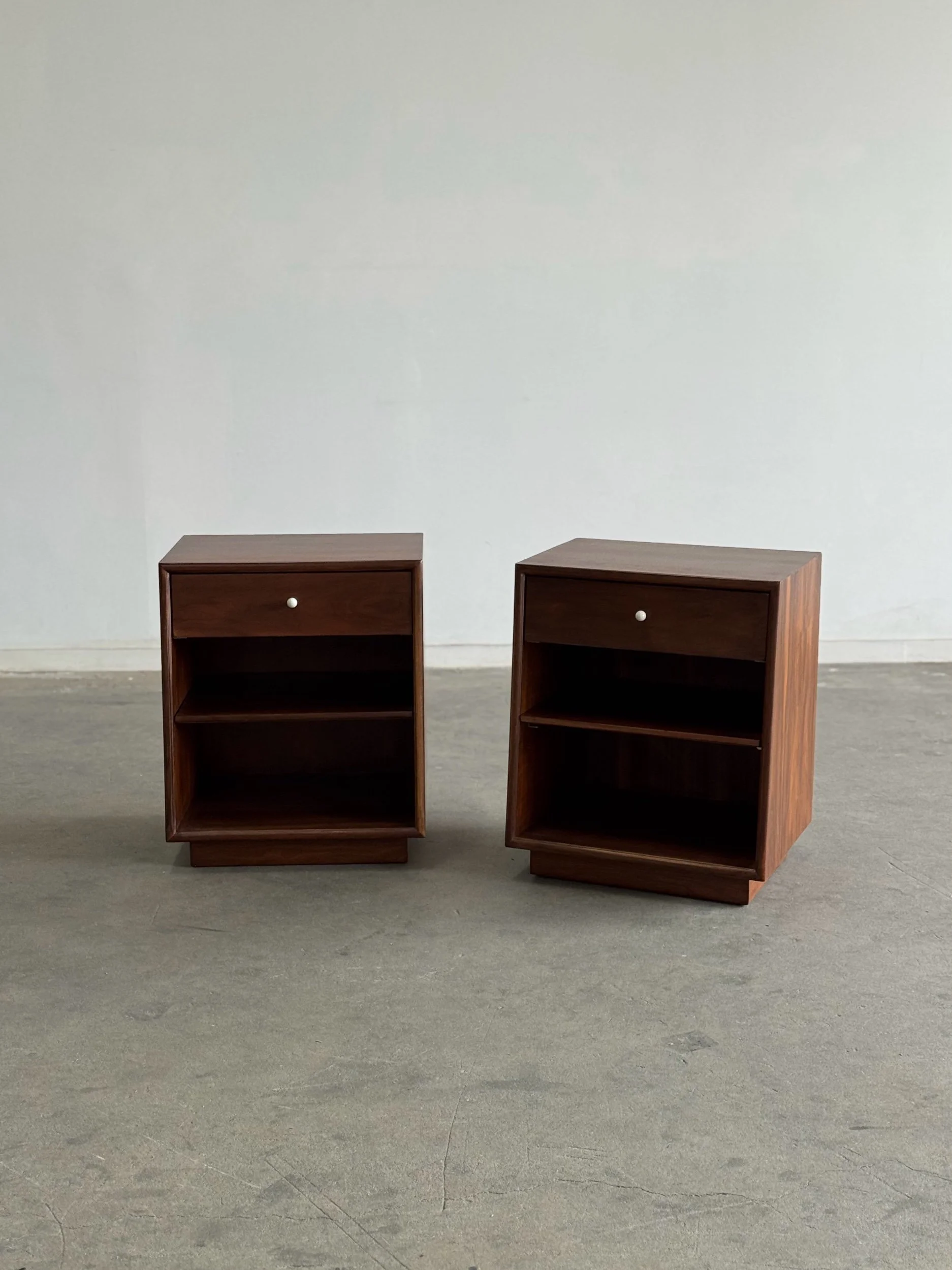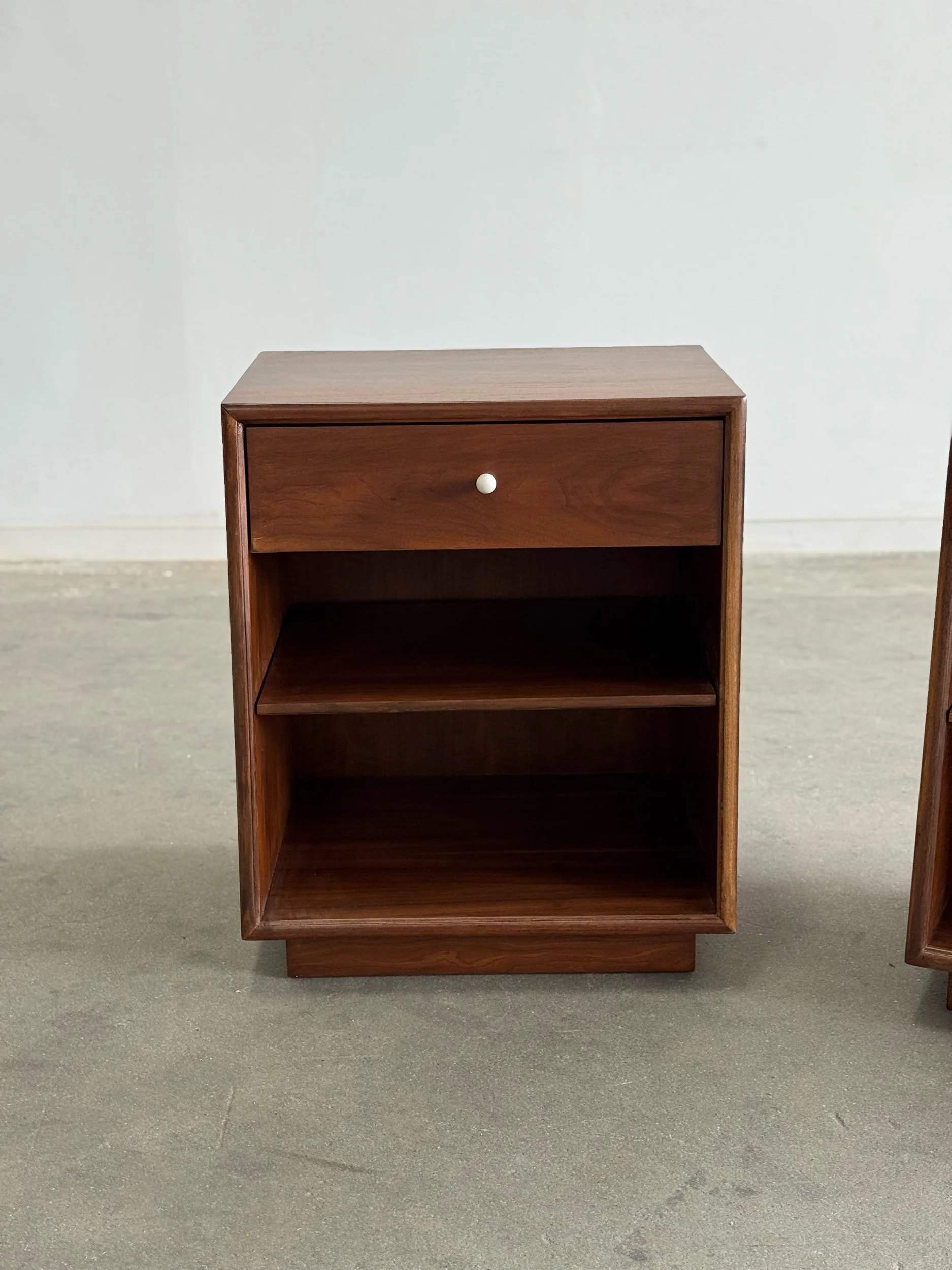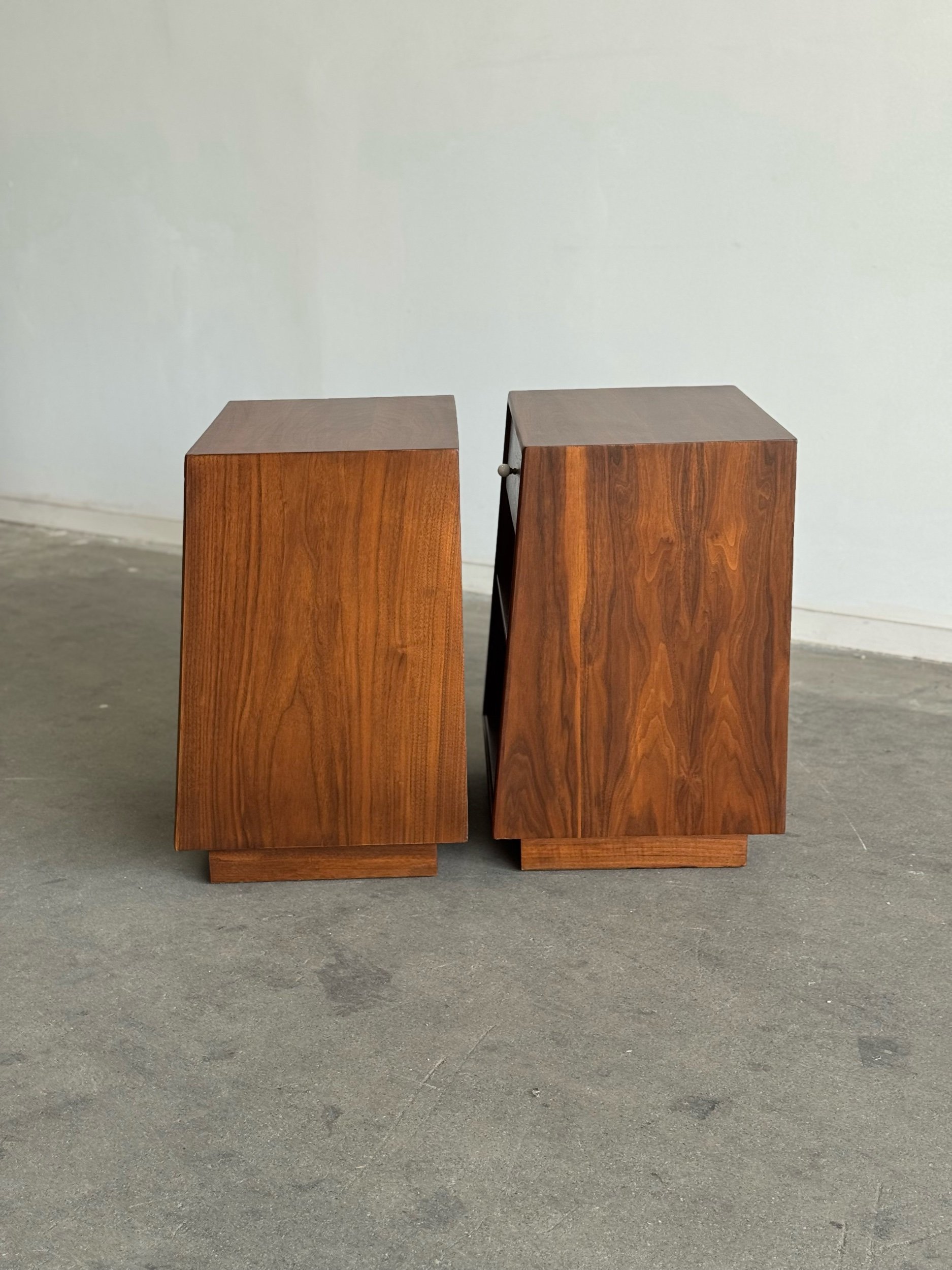 Fully restored nightstands with one removable shelf , and well preserved original porcelain hardware. Each unit shows well with no major areas of wear. Nightstands are structurally sound and sturdy. Price is for the pair.