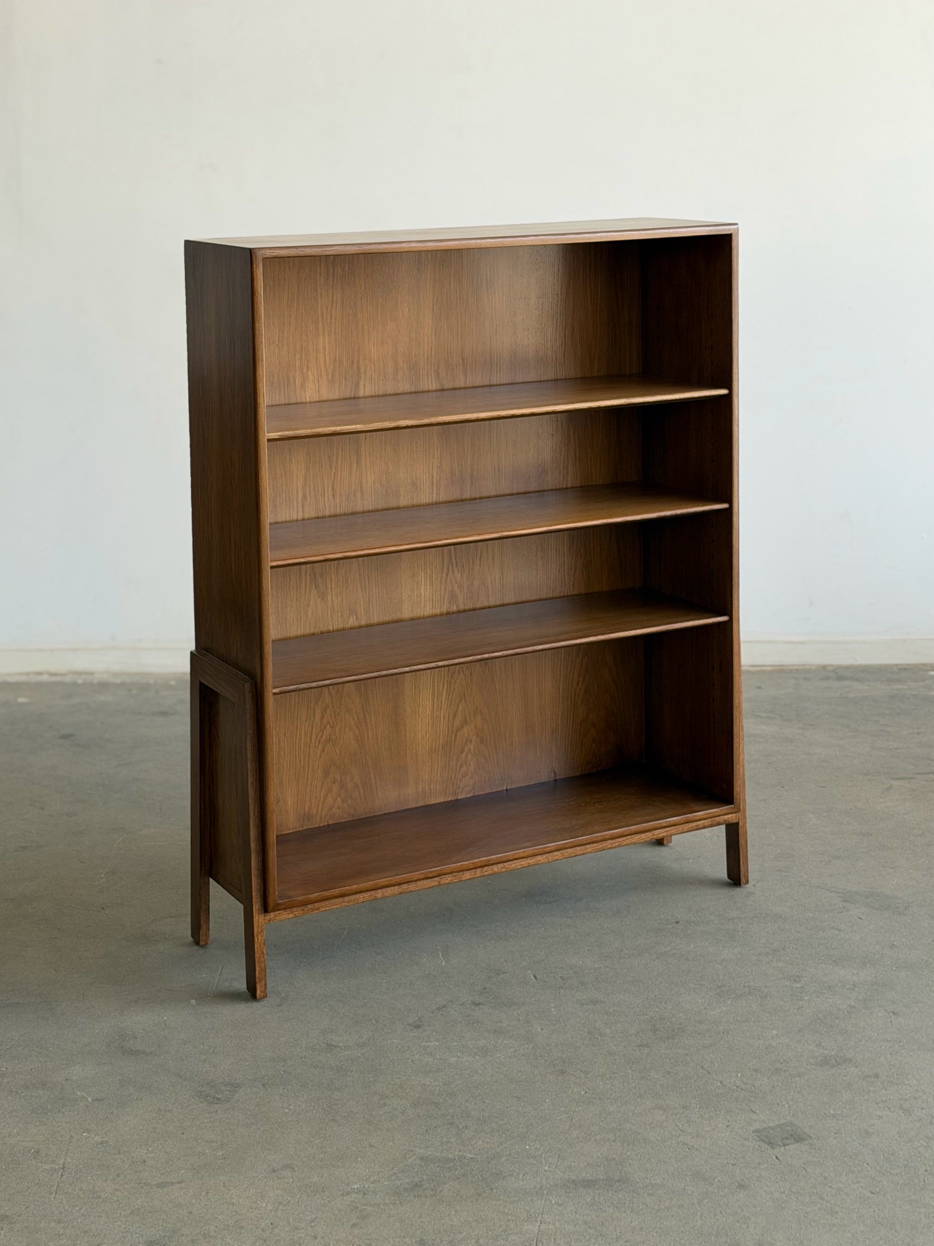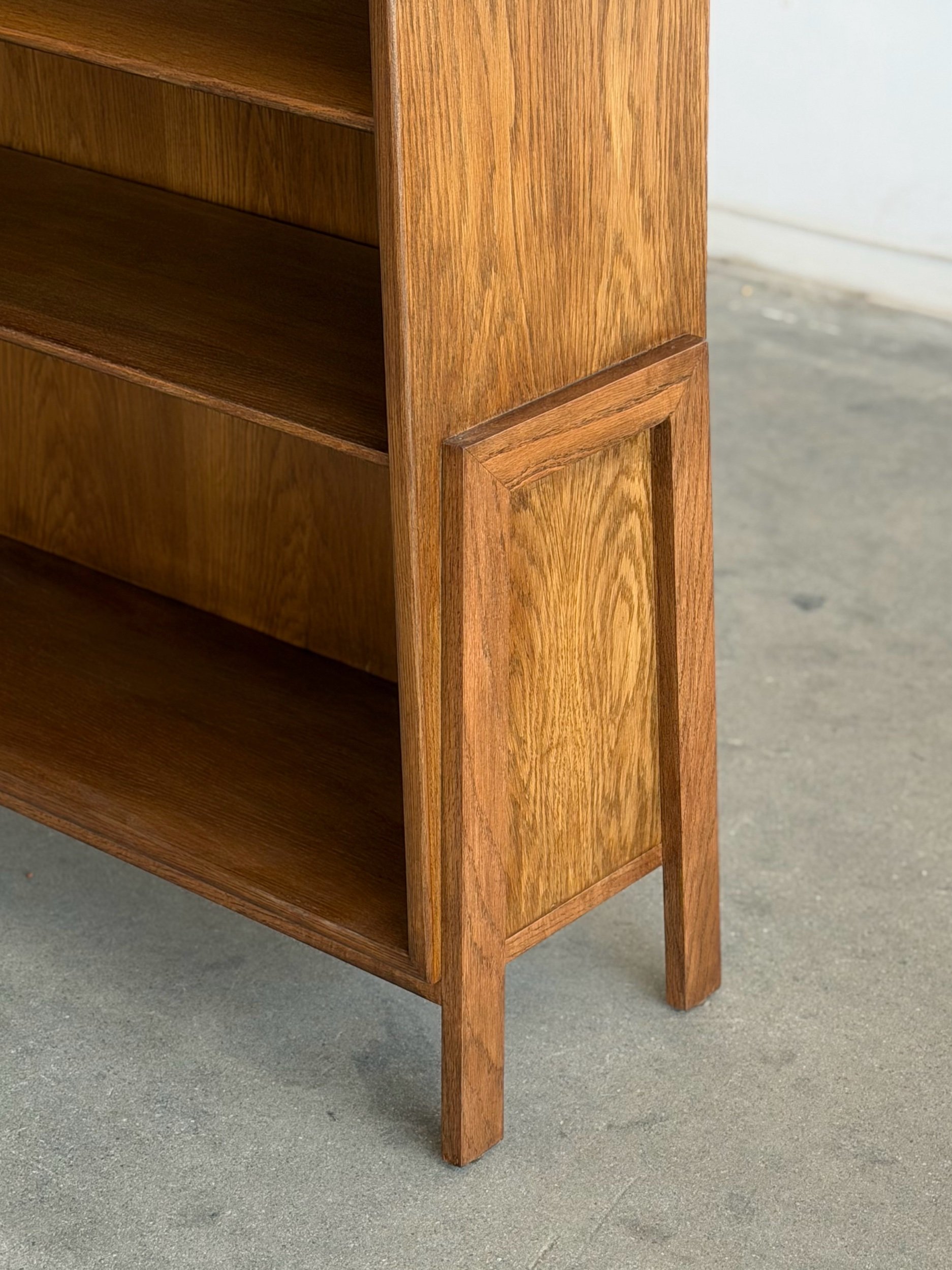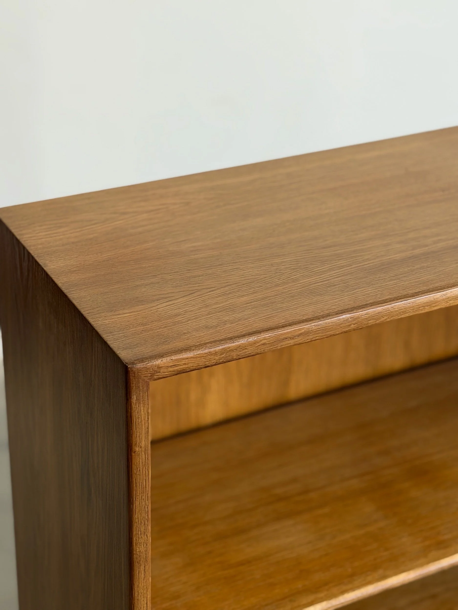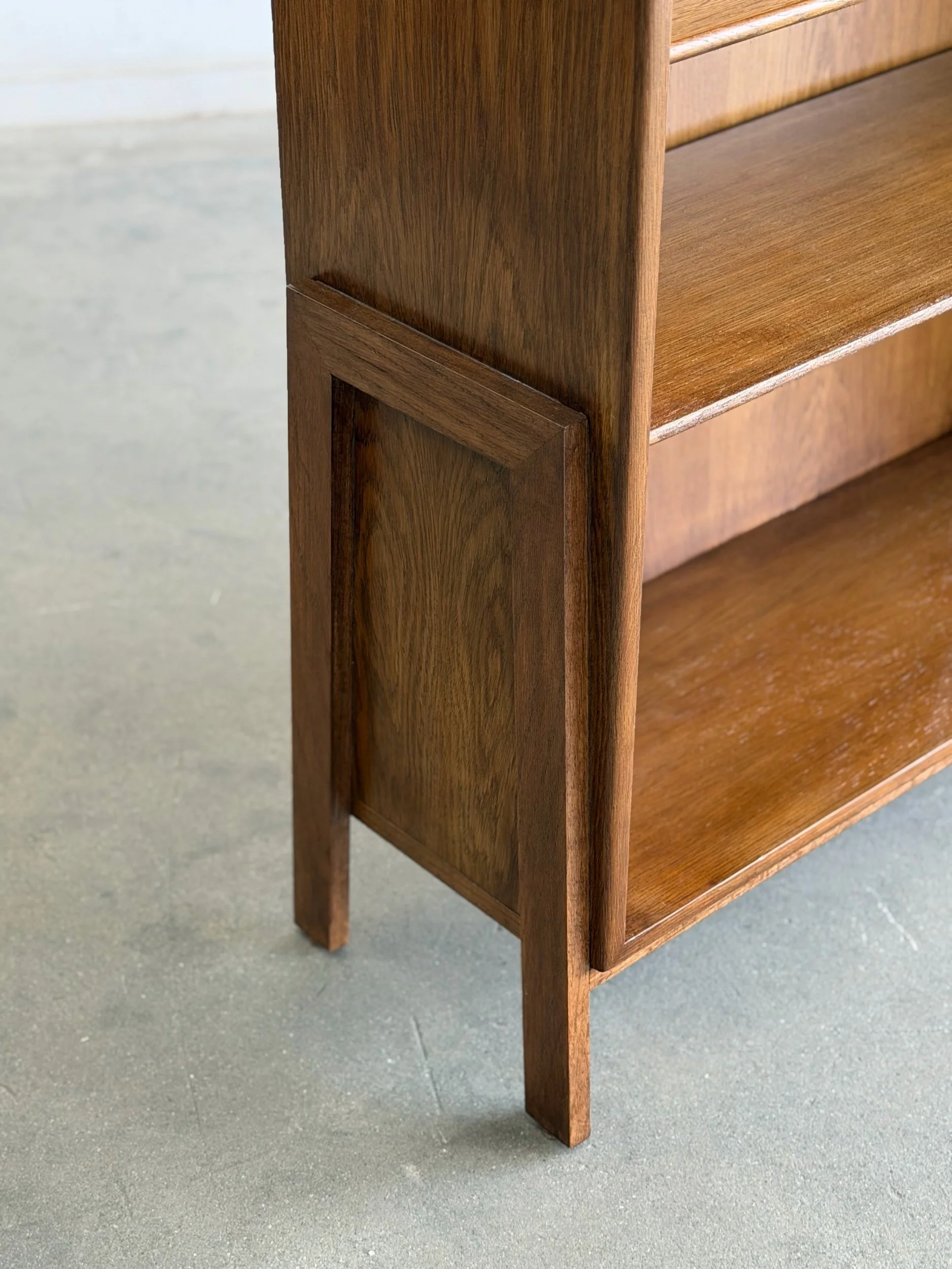 Reimagined bookcase in teak and oak .This unit has newly fabricated solid oak legs . Unit is structurally sound and sturdy with no major areas of wear. Item has been refinished and shows well.