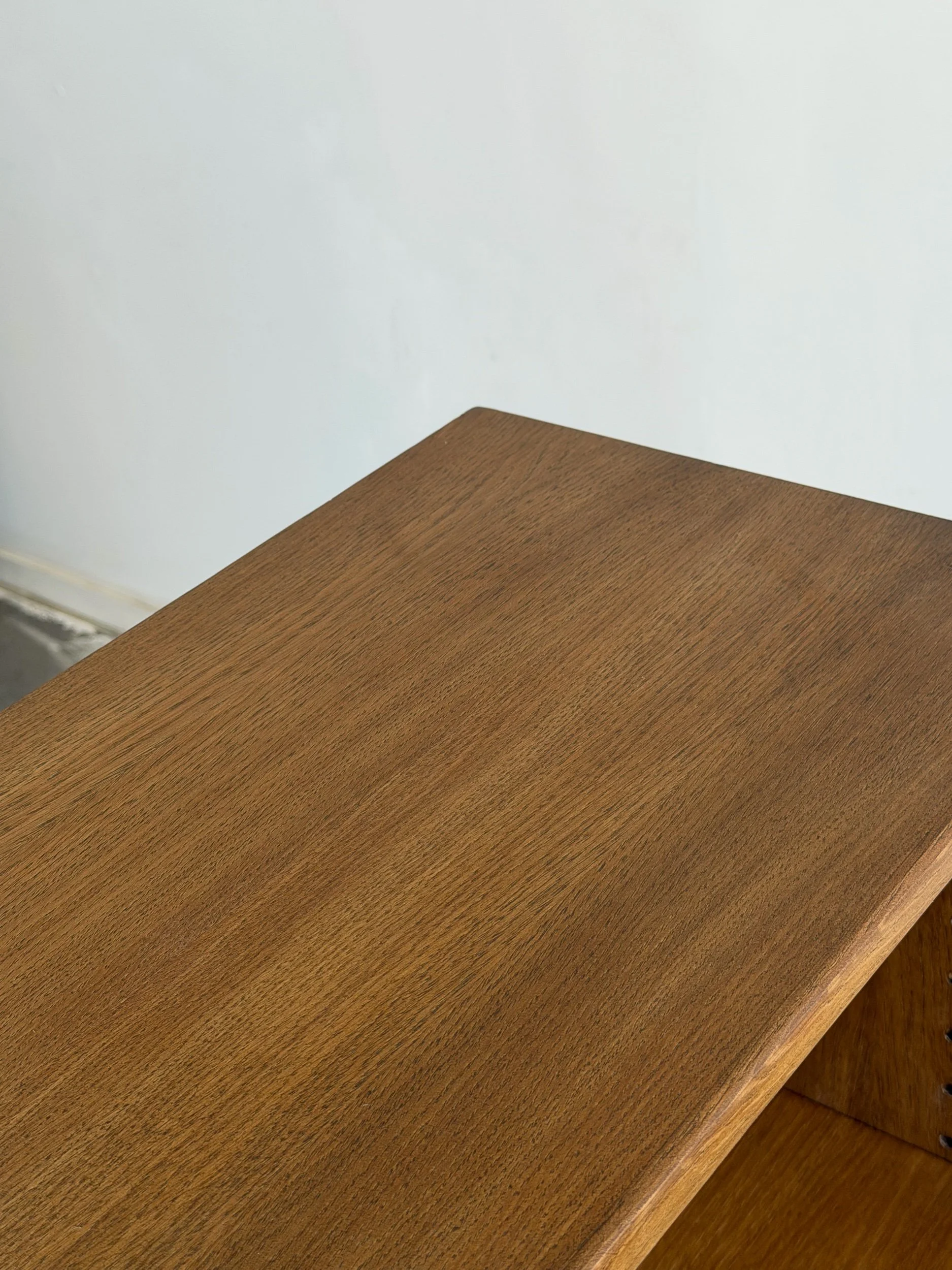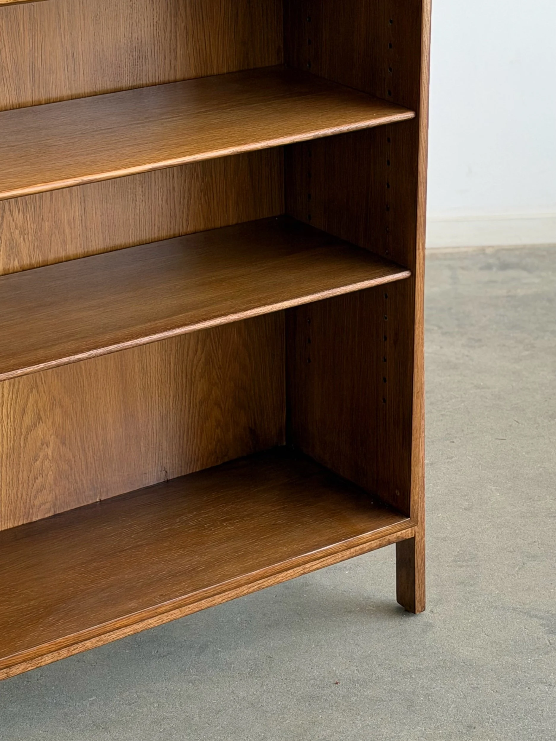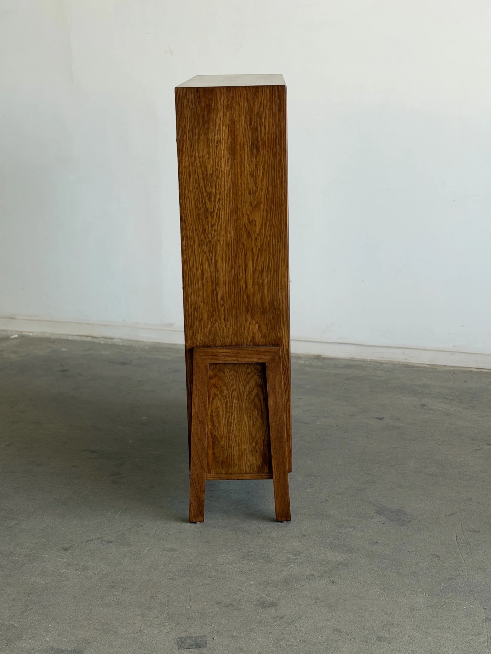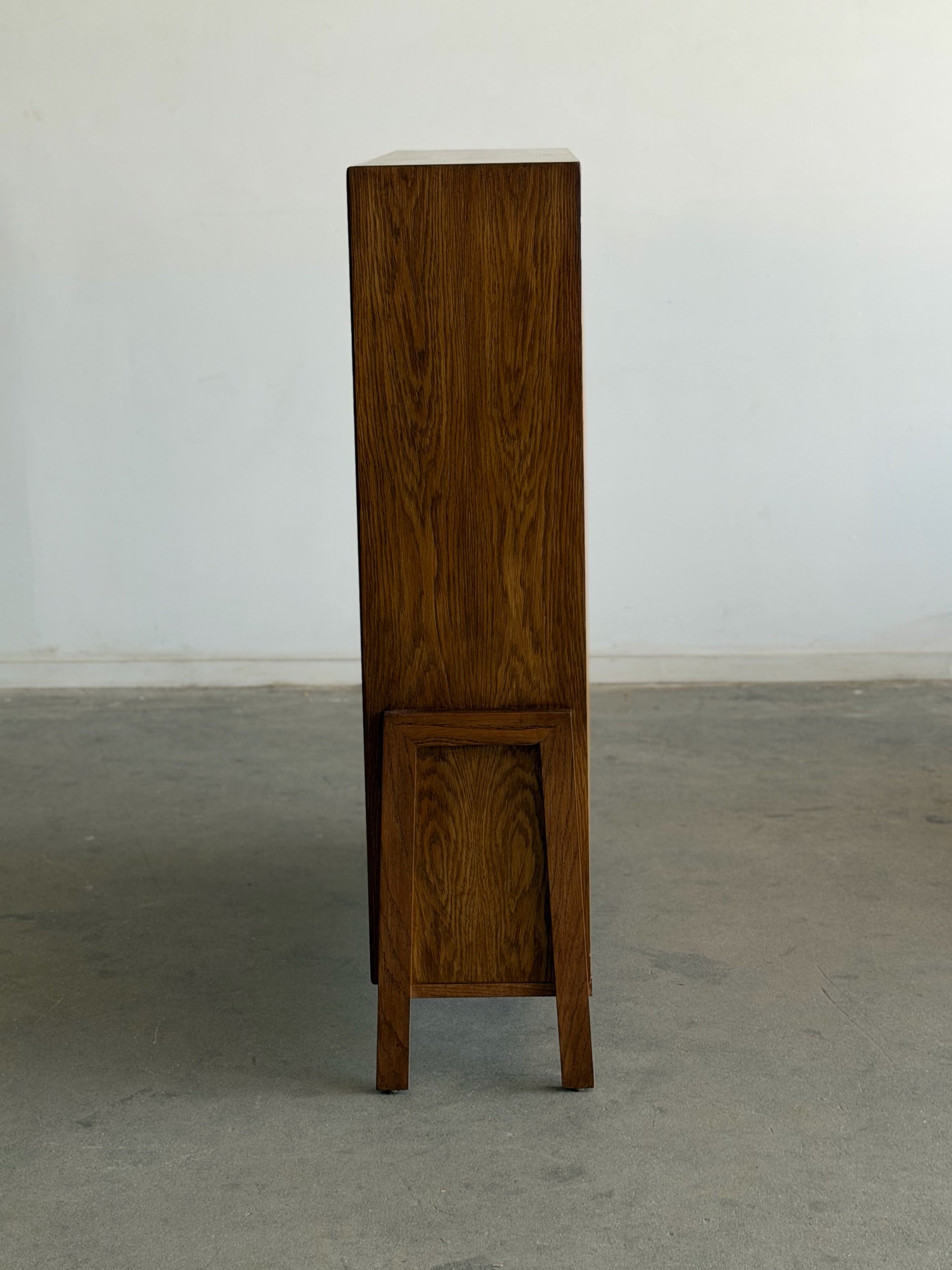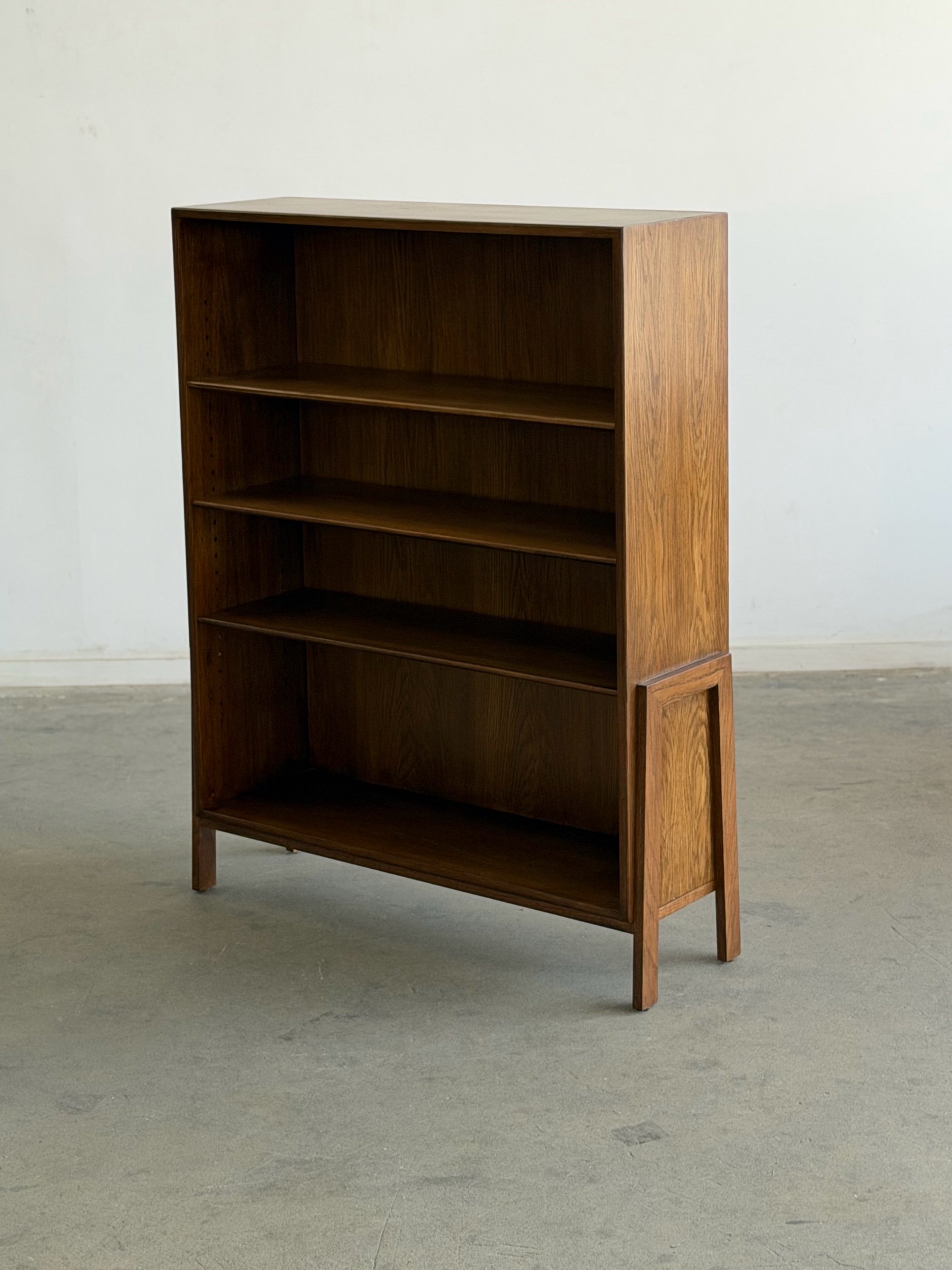 Reimagined bookcase in teak and oak .This unit has newly fabricated solid oak legs . Unit is structurally sound and sturdy with no major areas of wear. Item has been refinished and shows well.