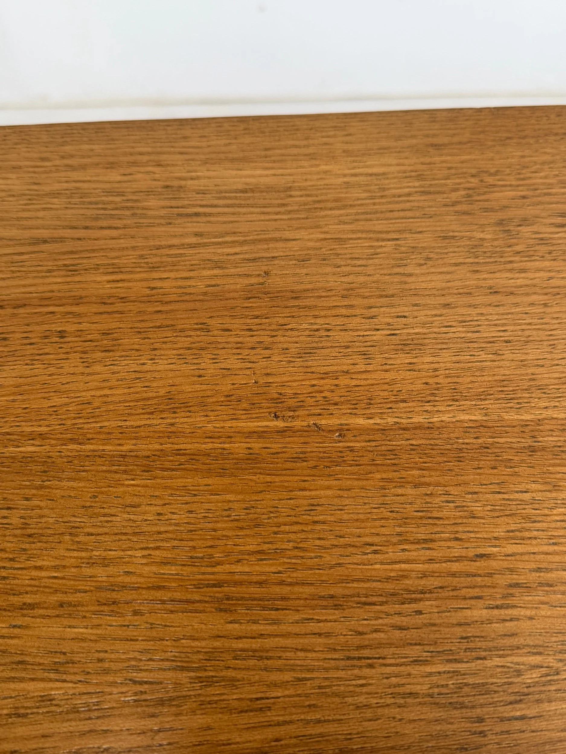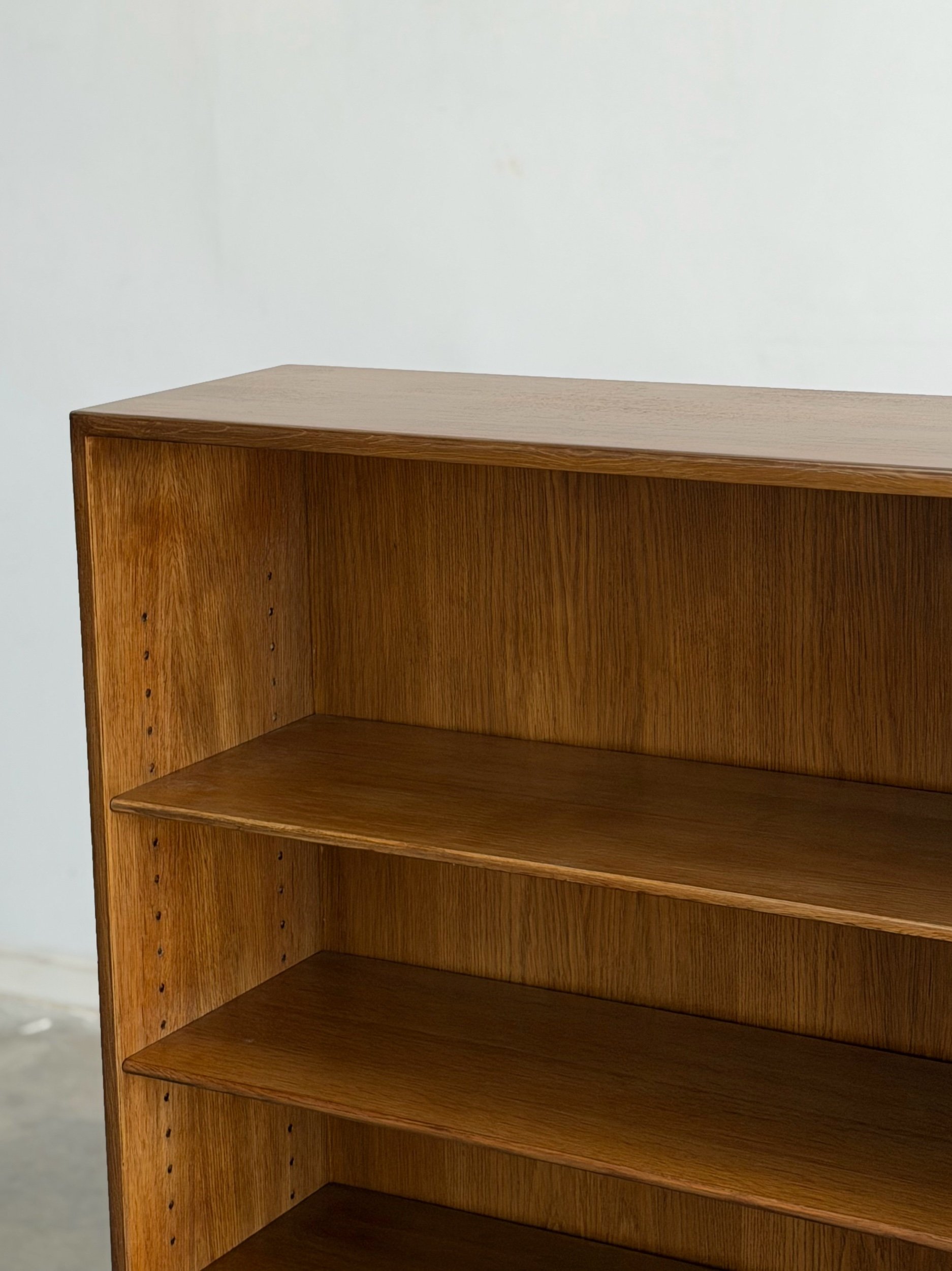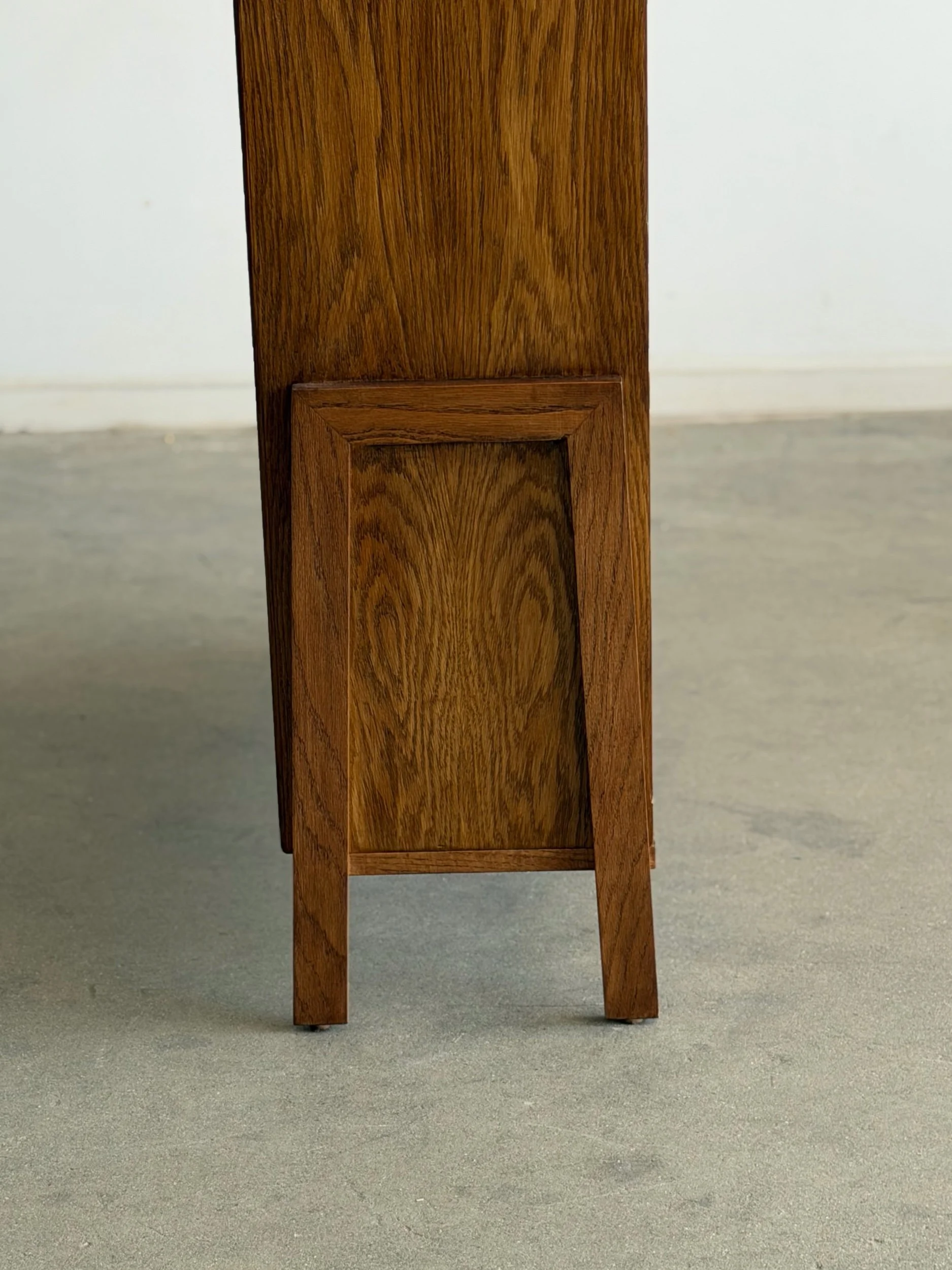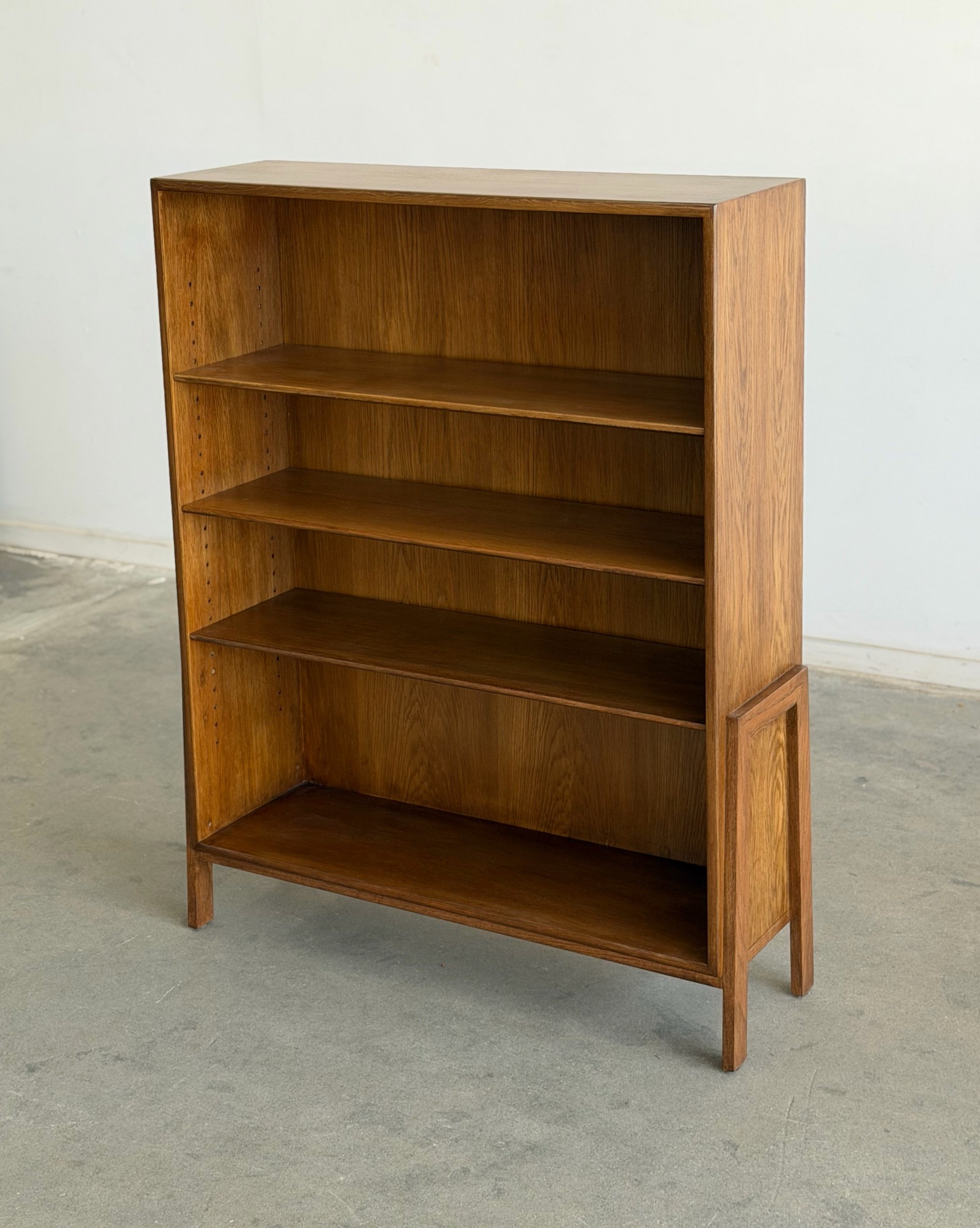 Reimagined bookcase in teak and oak .This unit has newly fabricated solid oak legs . Unit is structurally sound and sturdy with no major areas of wear. Item has been refinished and shows well.