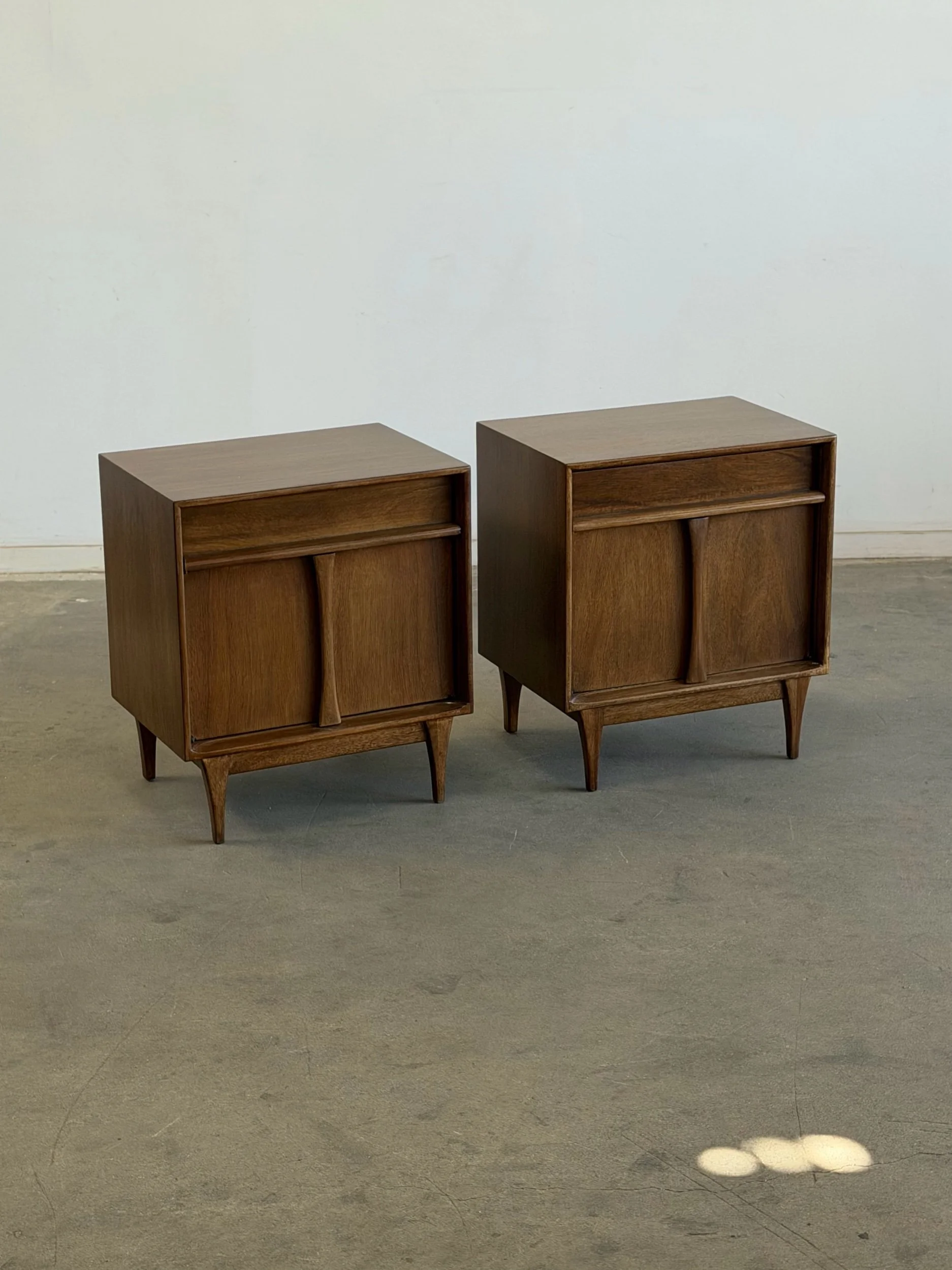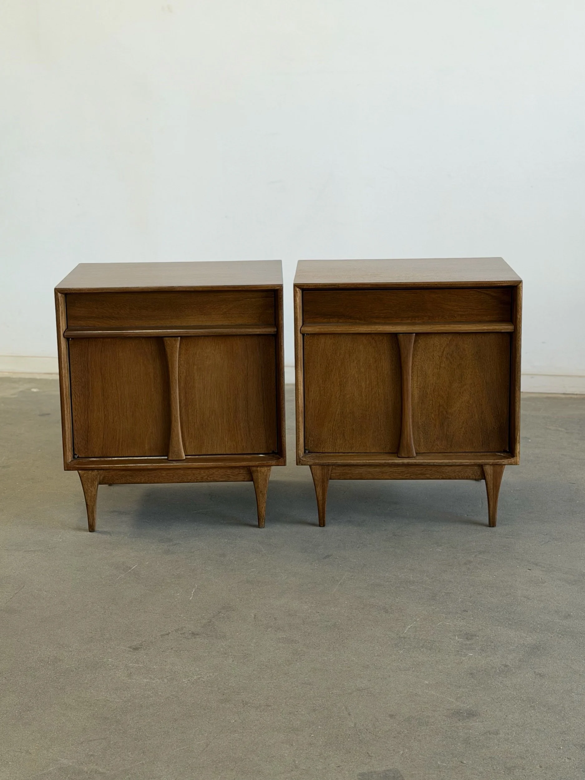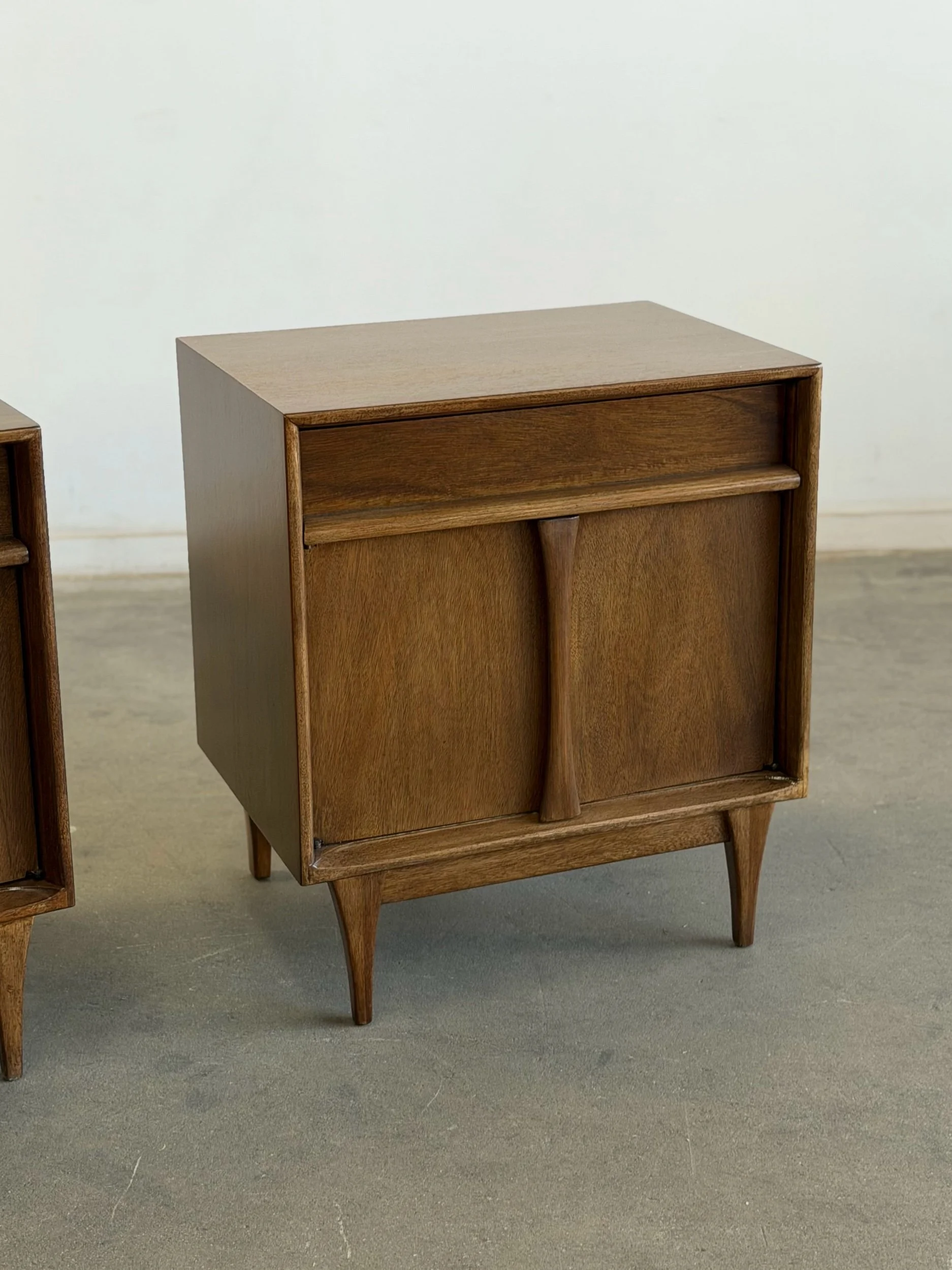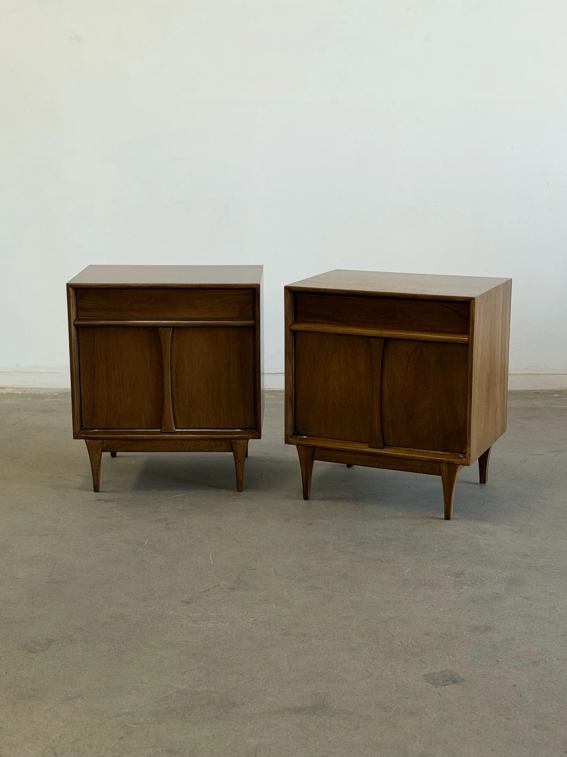Pair of vintage Red Lion inspired nightstands, professionally restored and in excellent condition. Unit is fully functional and ready for a new home. Each piece features a warm wood finish, clean lines, and distinctive curved sliding doors, reflecting a mid-century design.