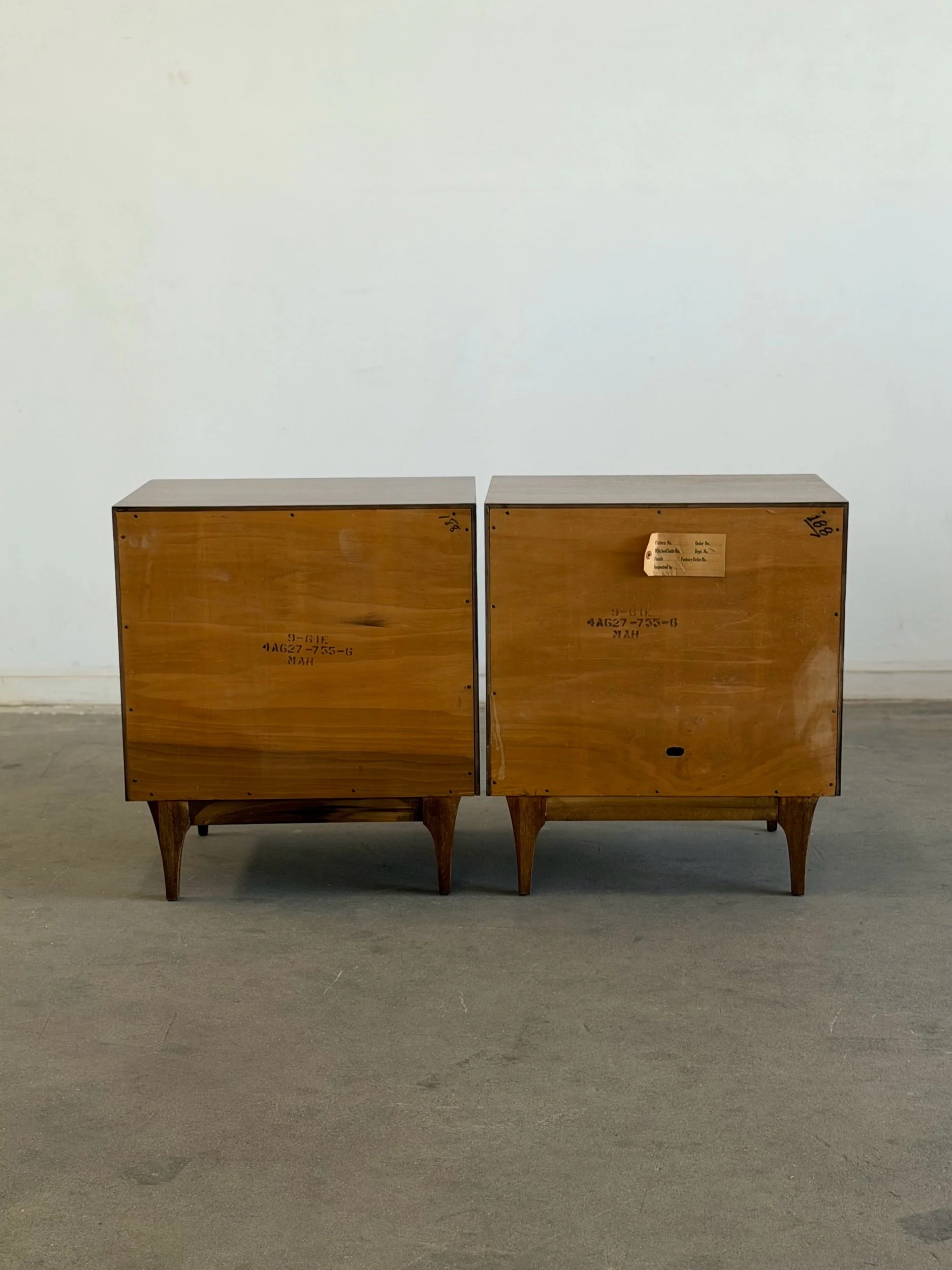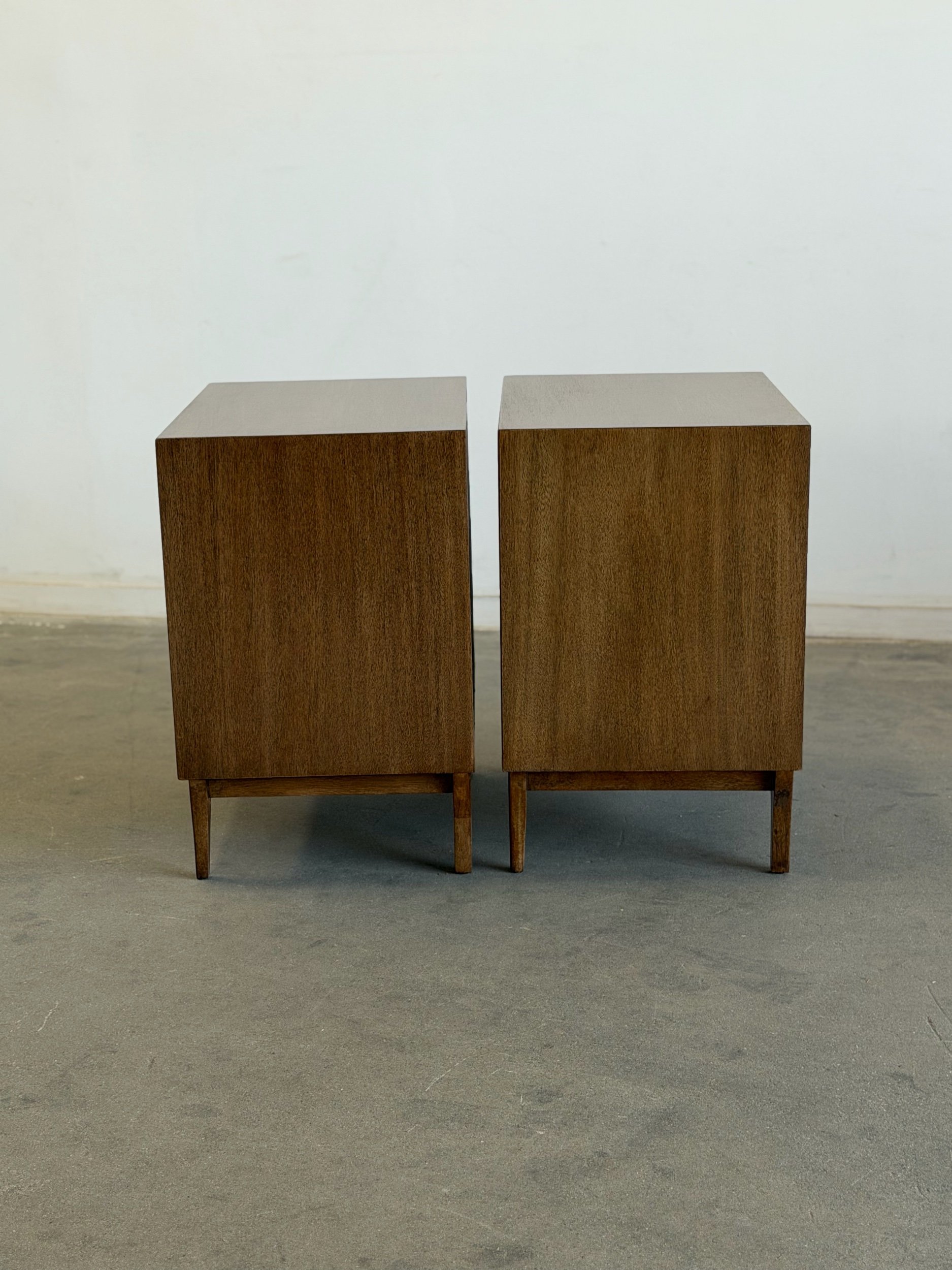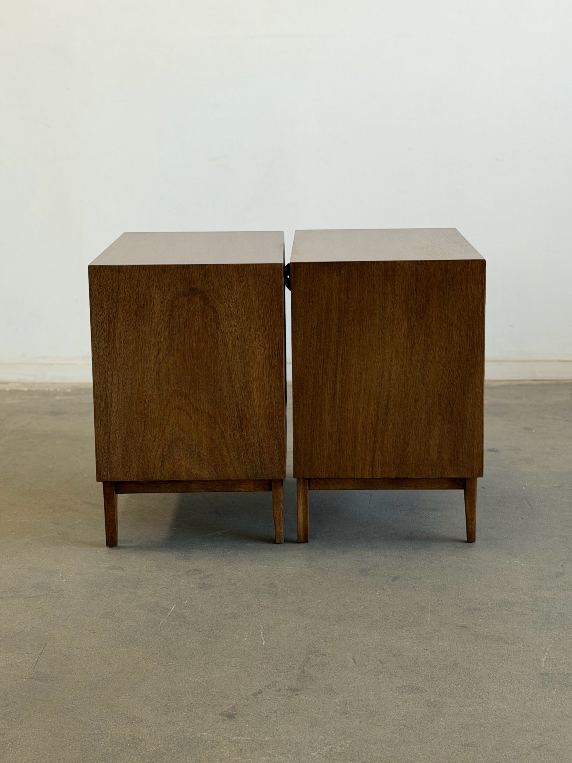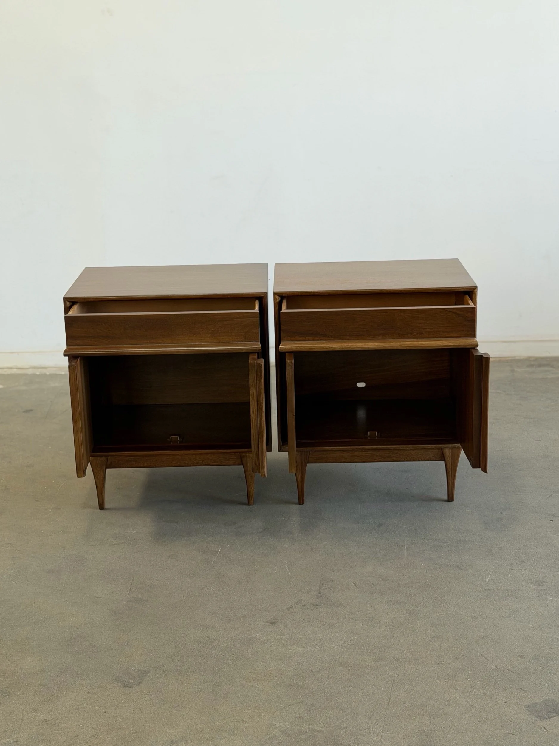 Pair of vintage Red Lion inspired nightstands, professionally restored and in excellent condition. Unit is fully functional and ready for a new home. Each piece features a warm wood finish, clean lines, and distinctive curved sliding doors, reflecting a mid-century design.