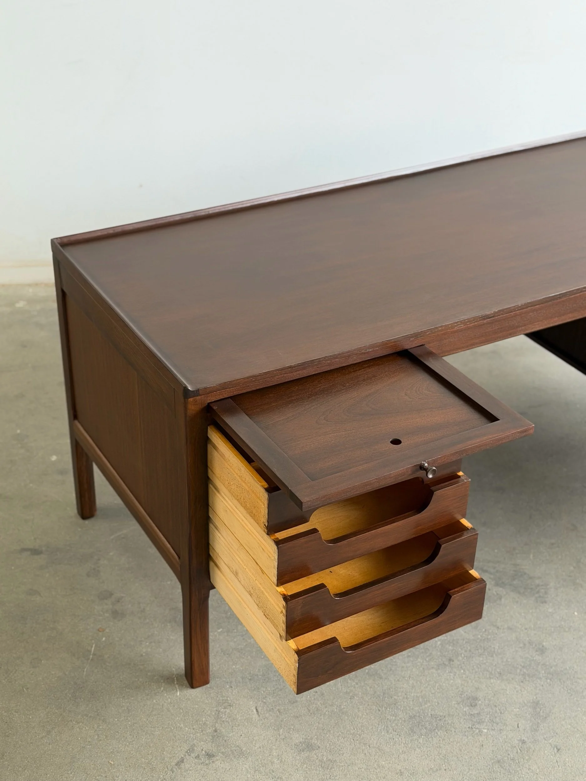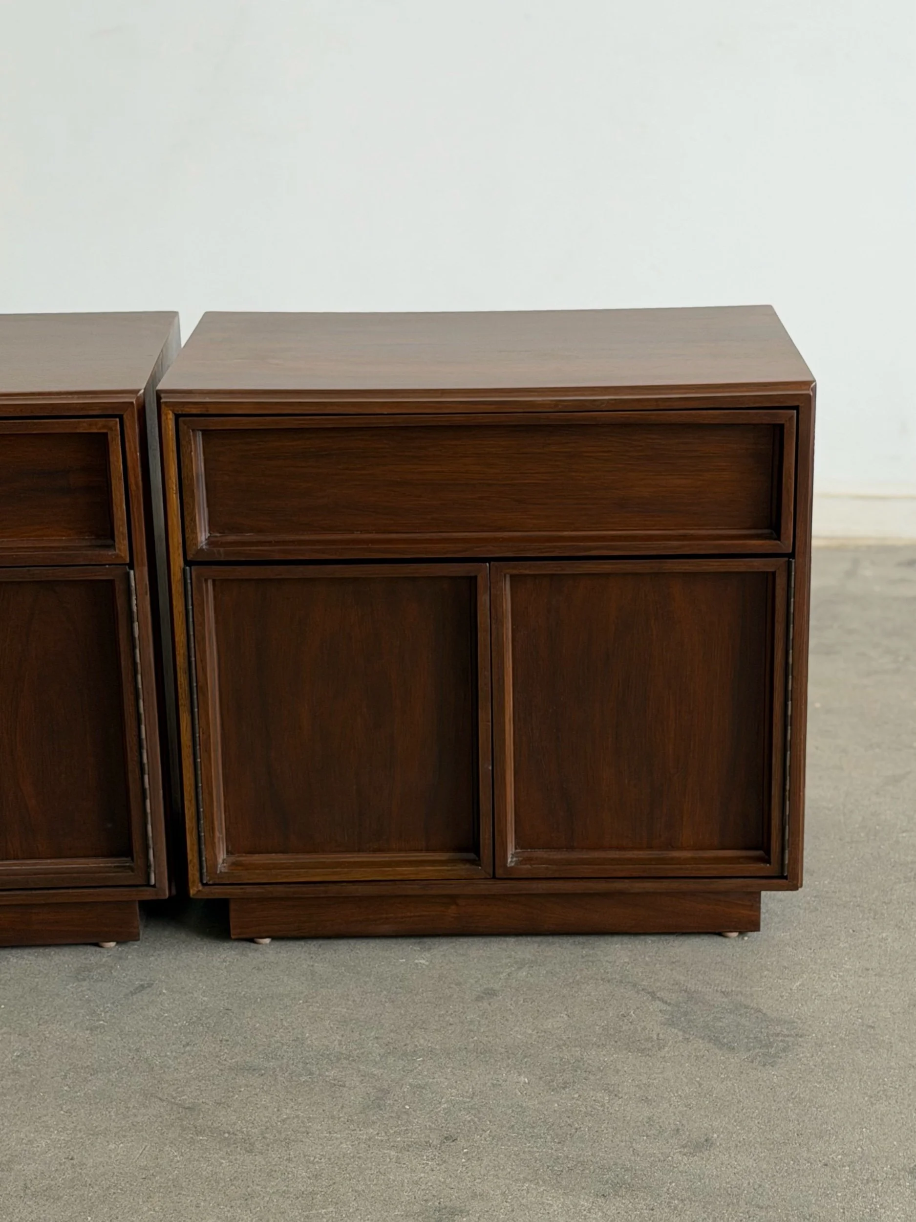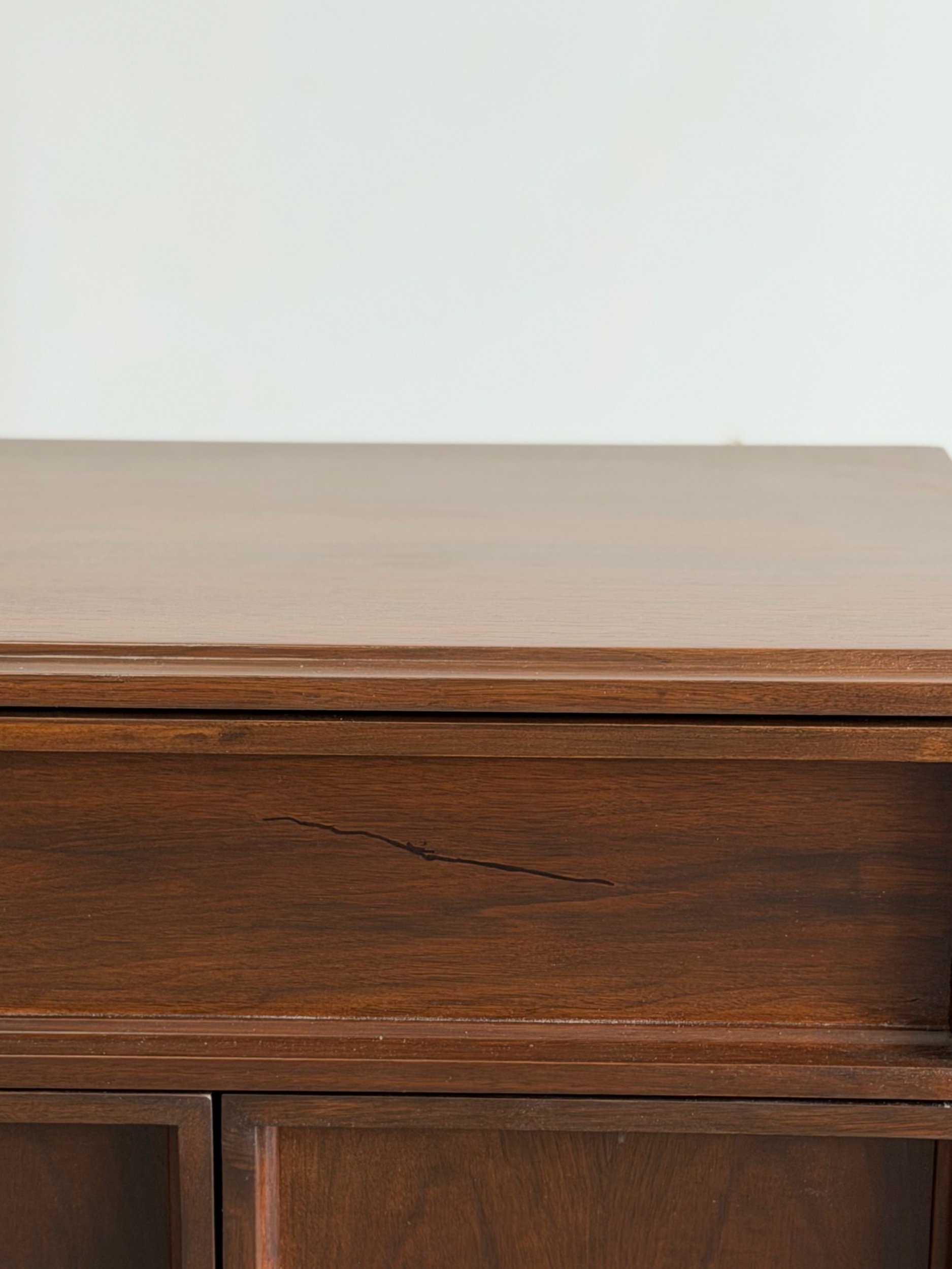 Fully restored with new refinish and touch ups. Featuring a wide drawer at the top and a larger cabinet section below with double doors. It has a floating appearance with as warm, reddish brown finish that highlights the natural walnut grain.