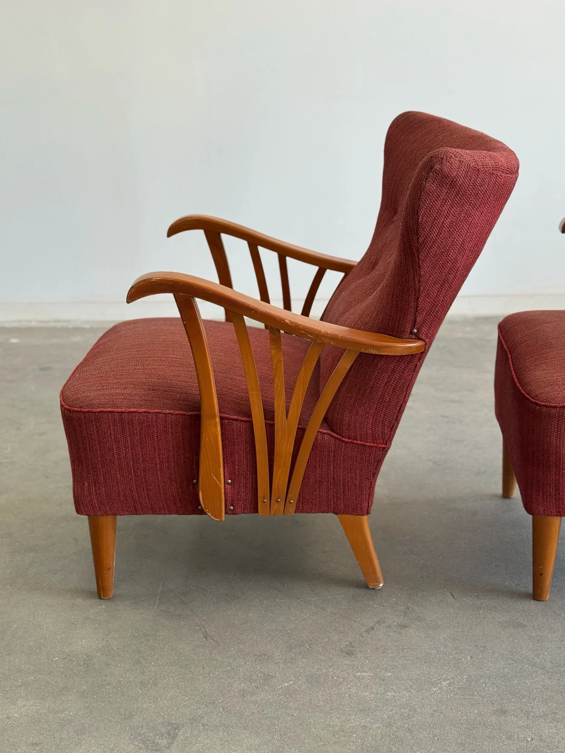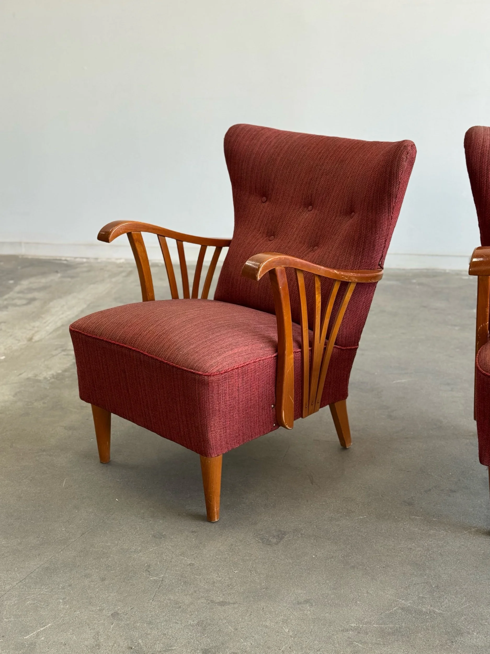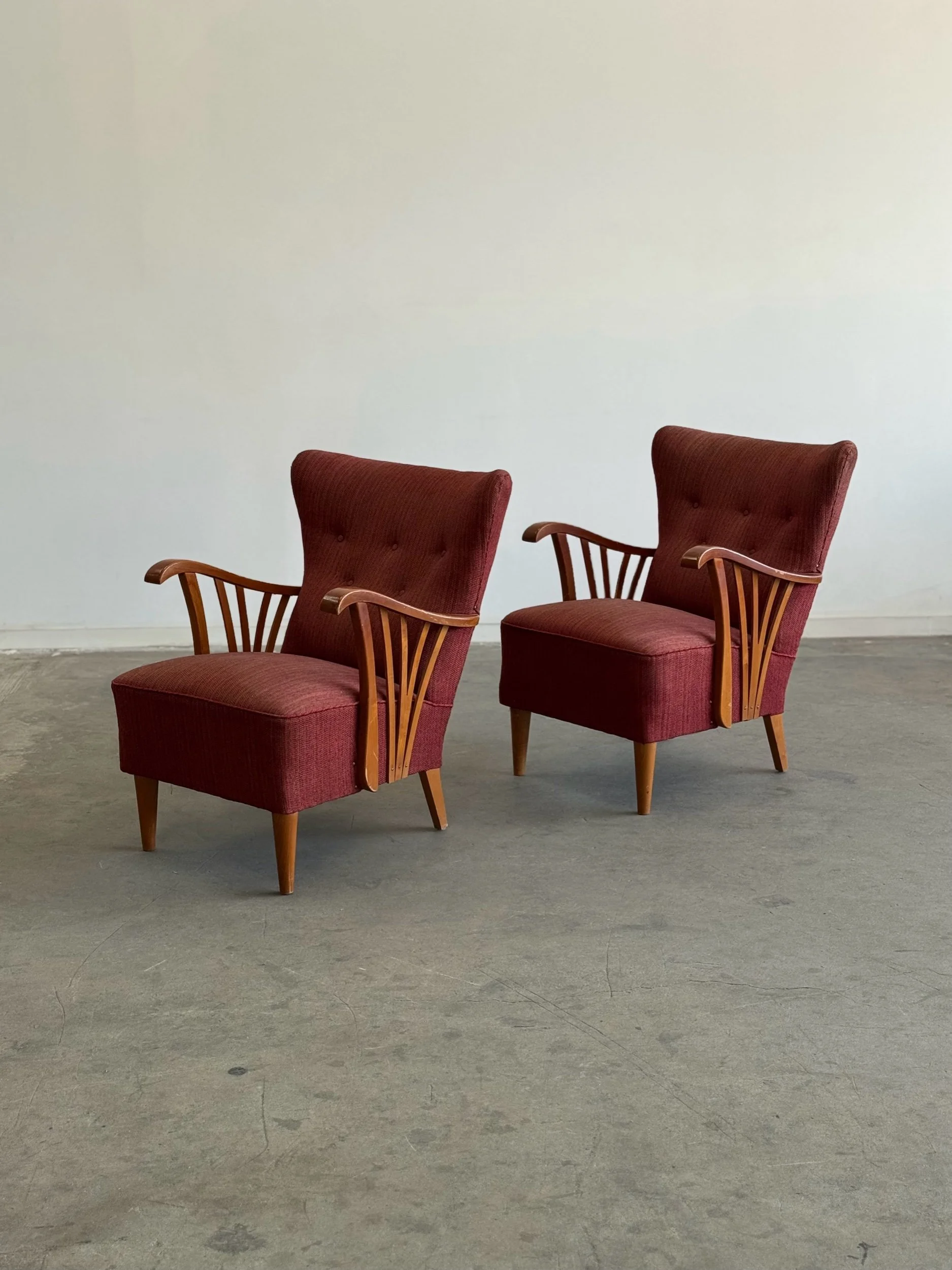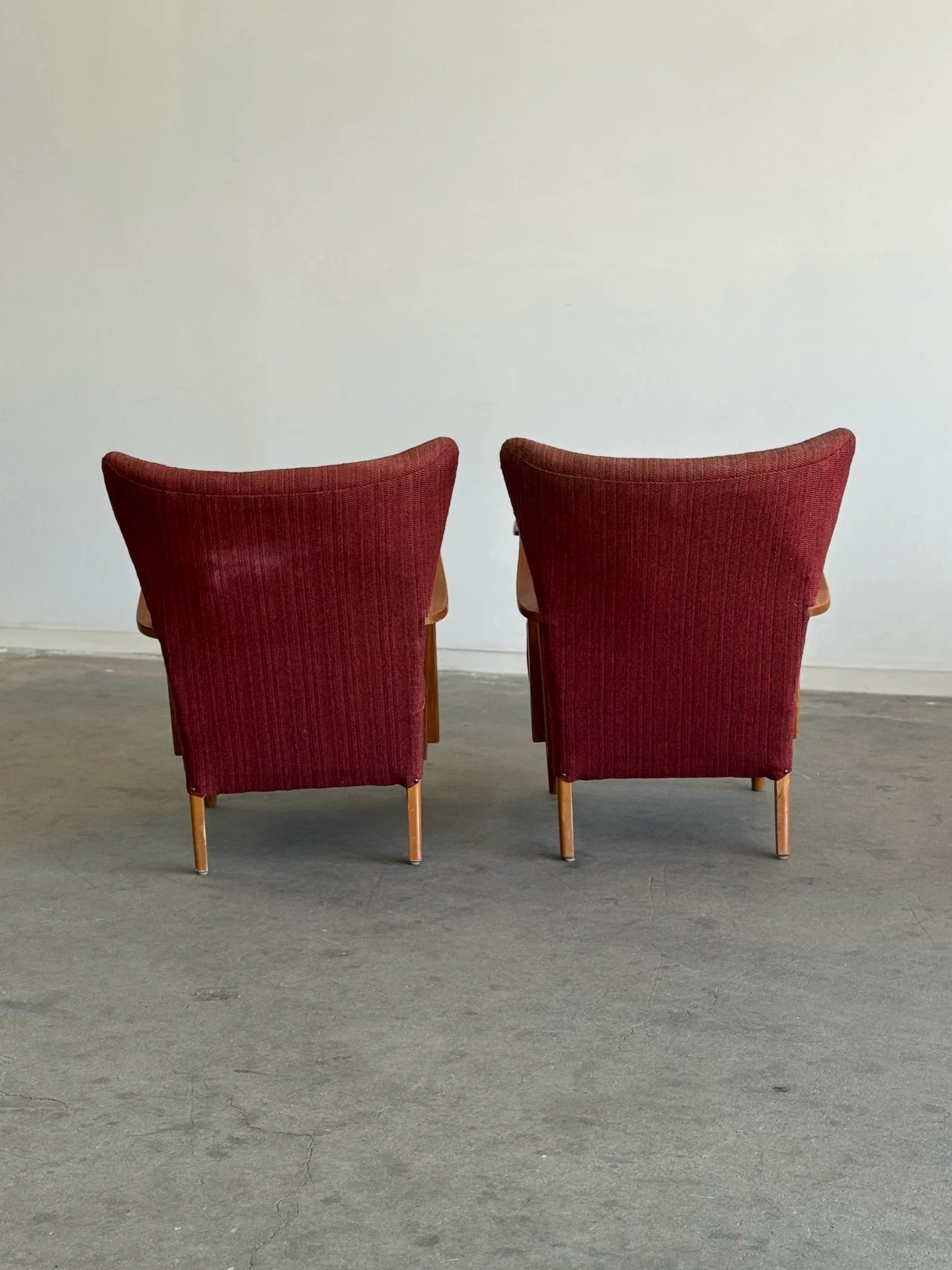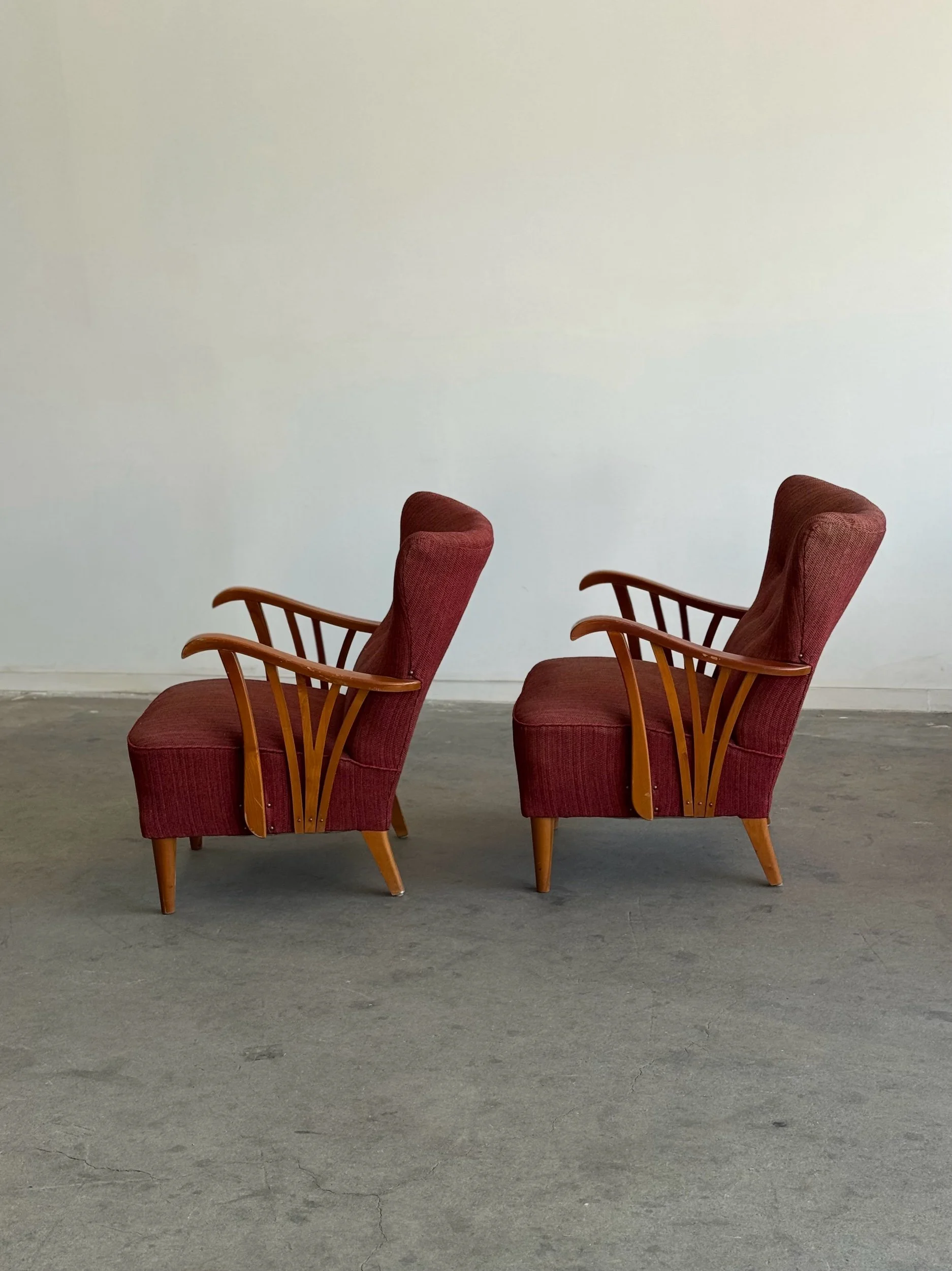 Elegant and inviting, this pair of Swedish Modern lounge chairs embodies the understated sophistication of Scandinavian design. Featuring sculptural slatted arms, tapered legs, and gently curved backs, they blend warmth, comfort, and craftsmanship in perfect balance. Upholstered in its original rich burgundy fabric with a soft texture that complements the natural wood tones. These are in their original condition without restoration.