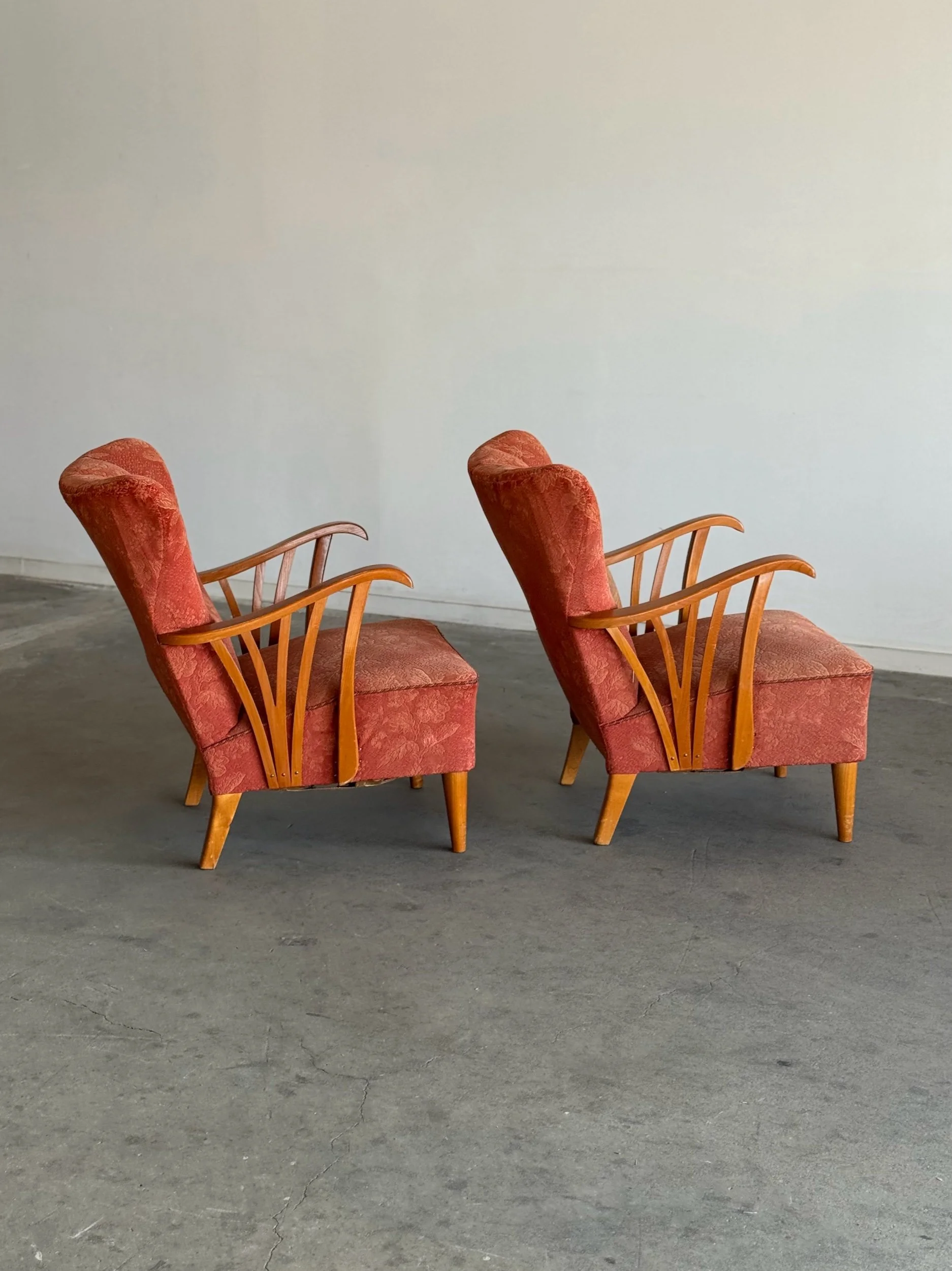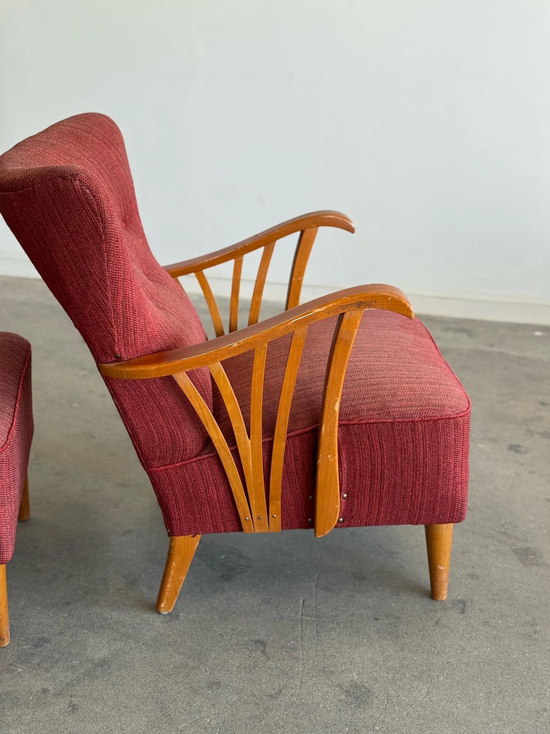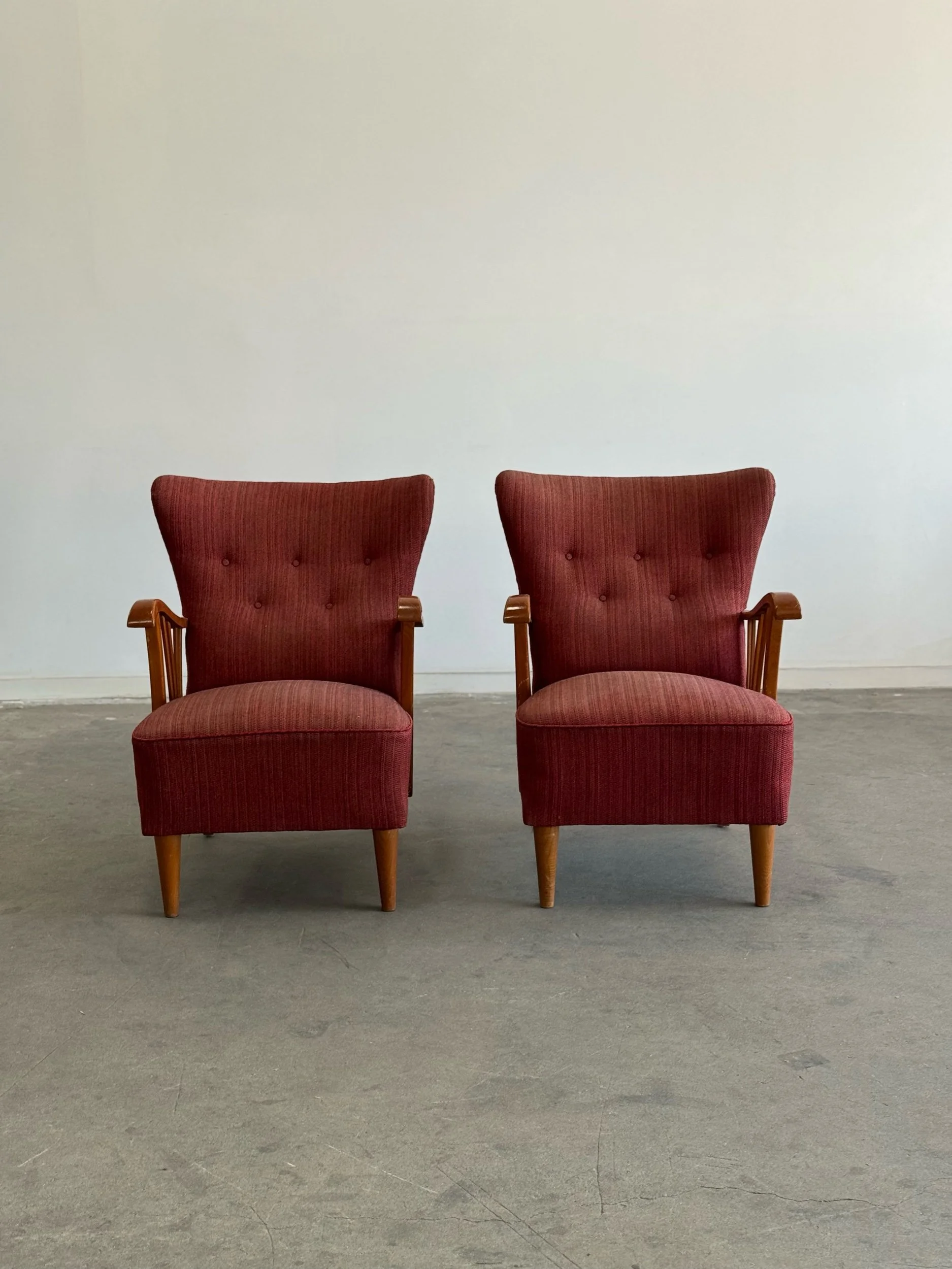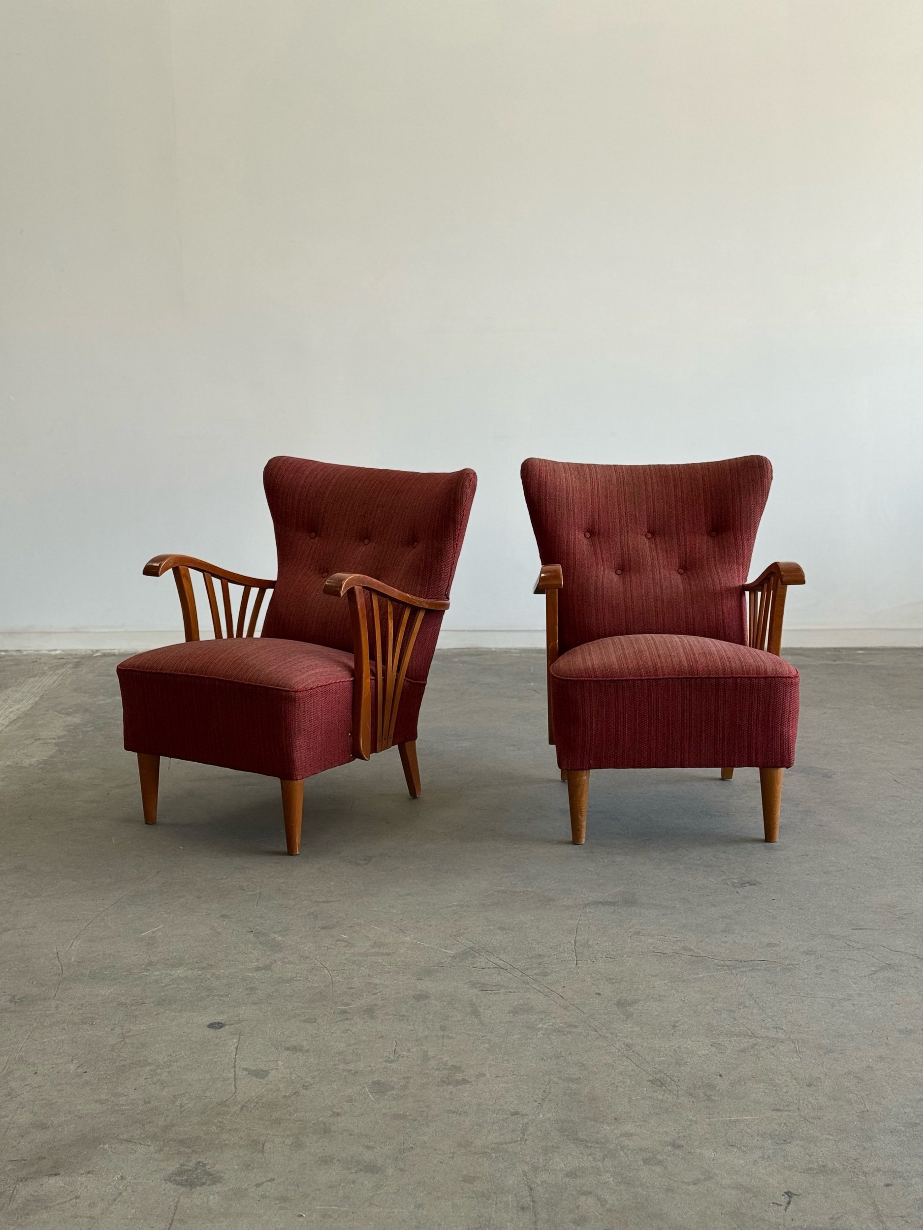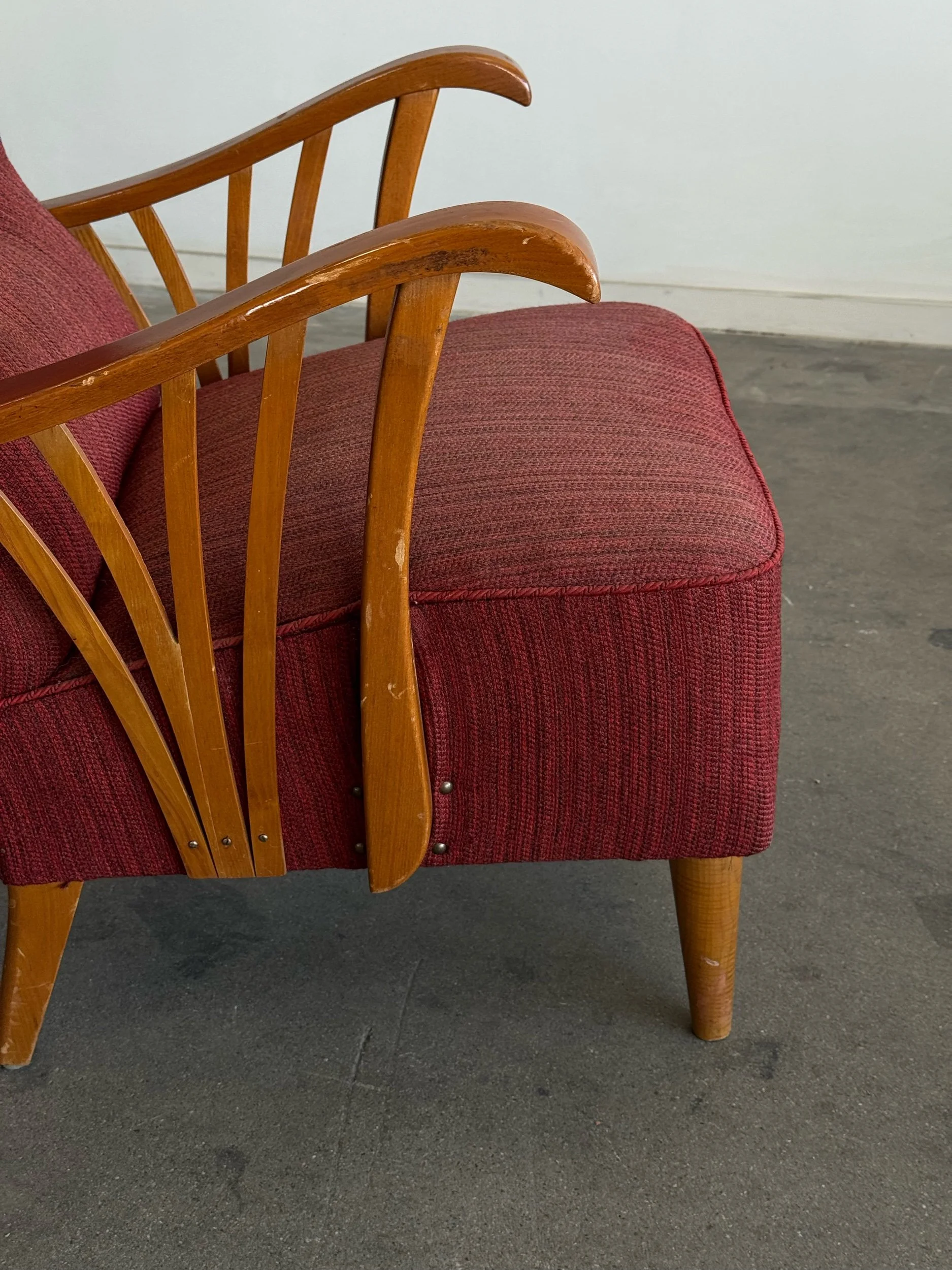 Elegant and inviting, this pair of Swedish Modern lounge chairs embodies the understated sophistication of Scandinavian design. Featuring sculptural slatted arms, tapered legs, and gently curved backs, they blend warmth, comfort, and craftsmanship in perfect balance. Upholstered in its original rich burgundy fabric with a soft texture that complements the natural wood tones. These are in their original condition without restoration.