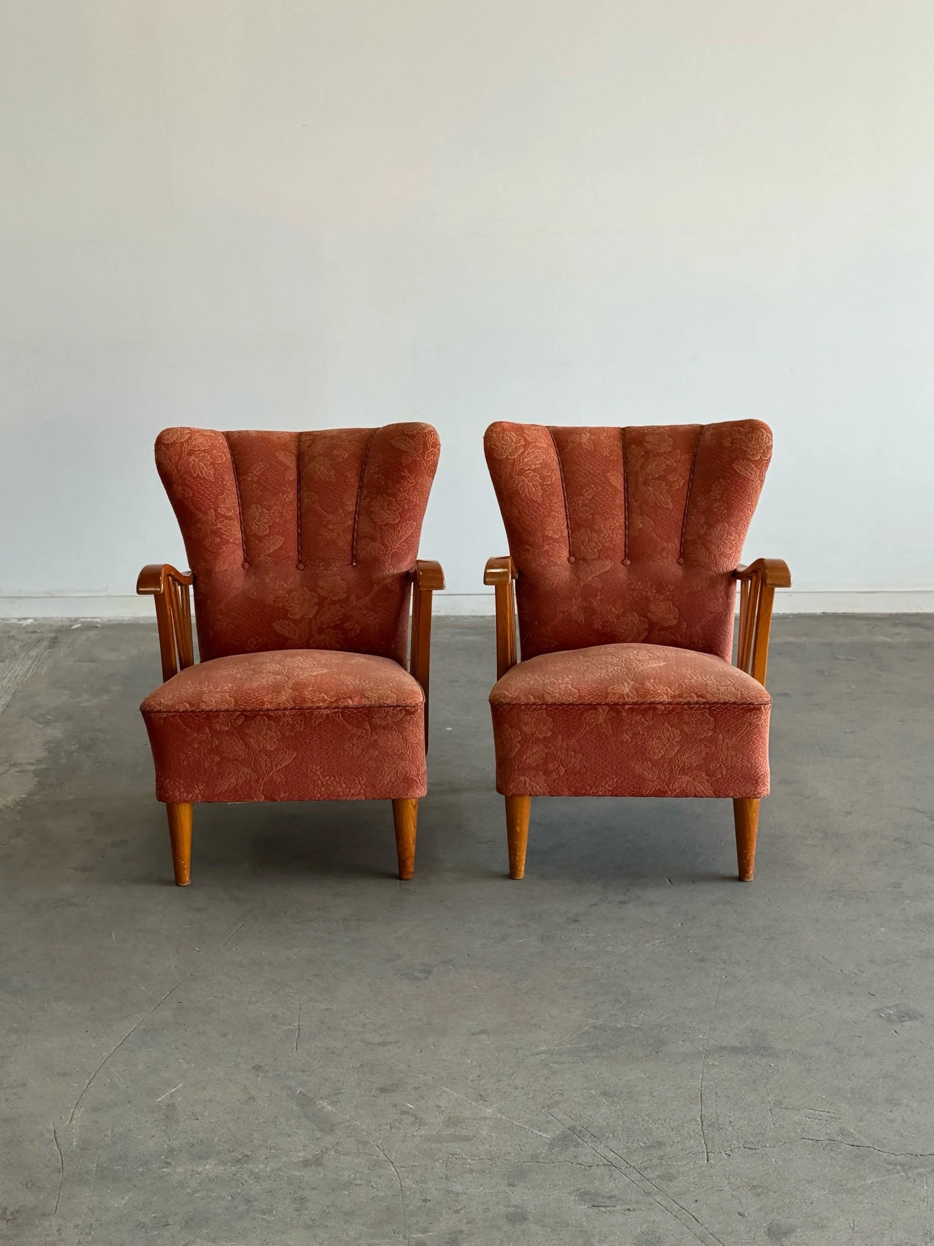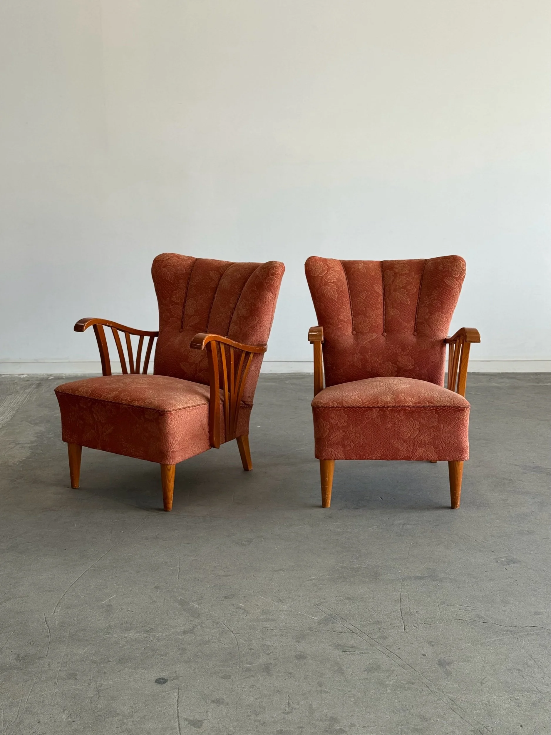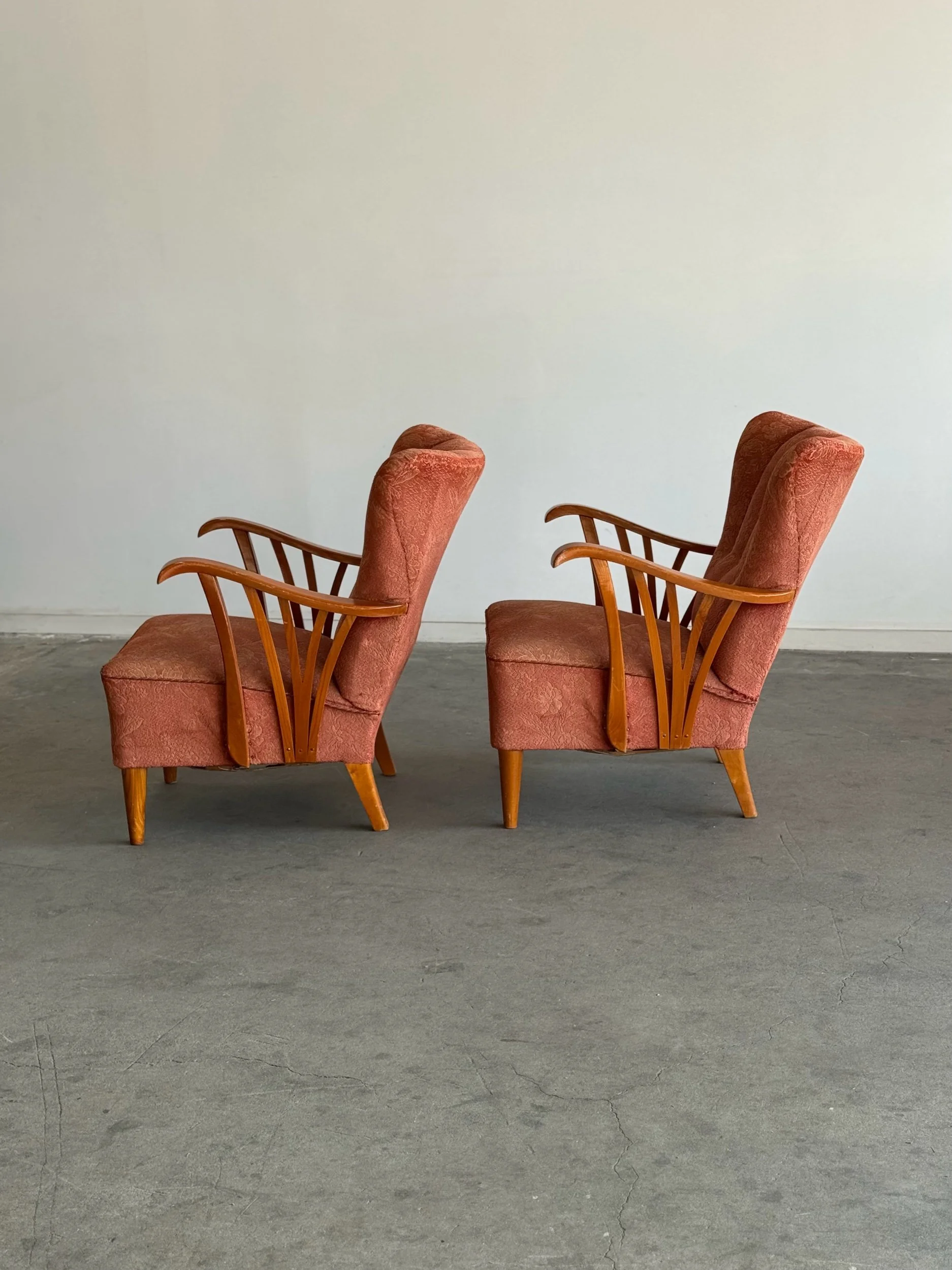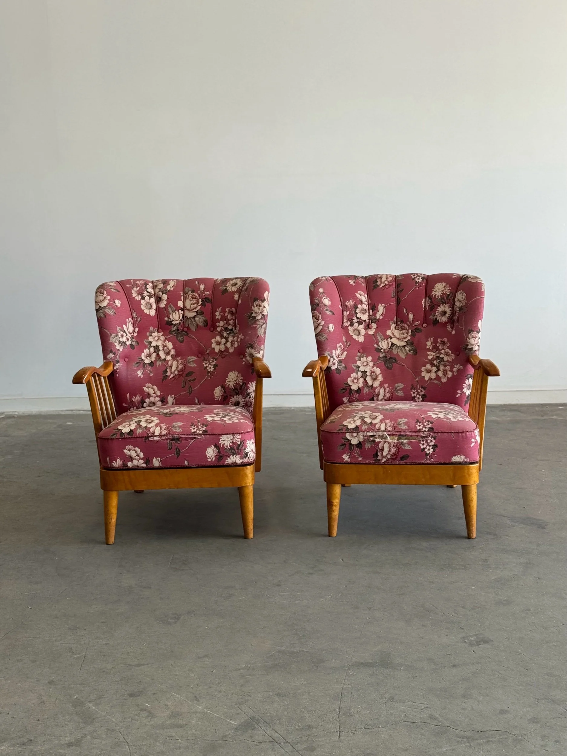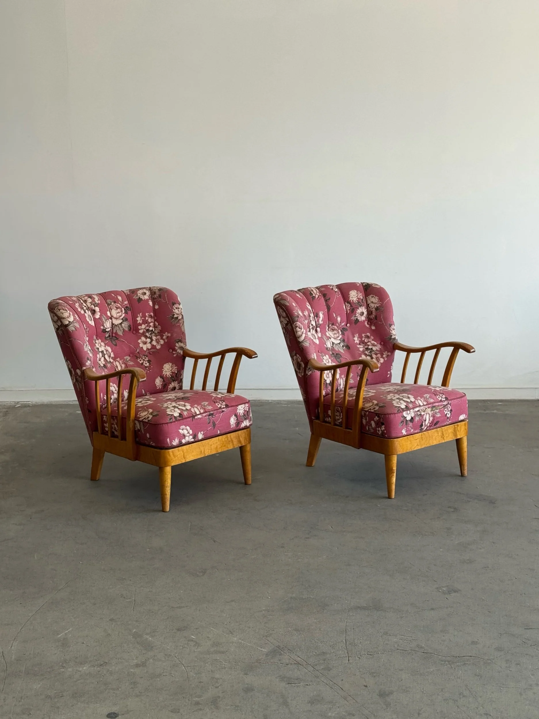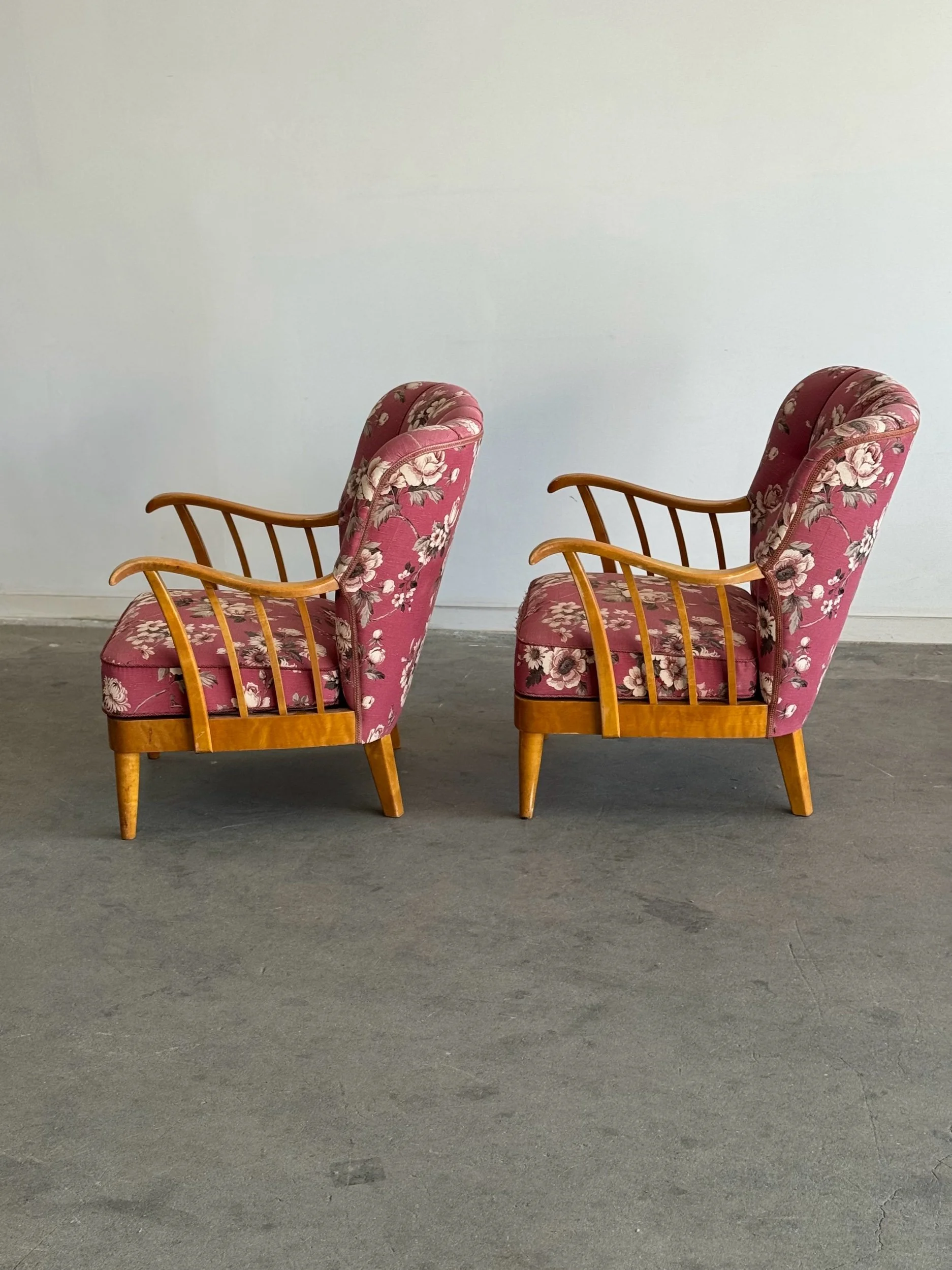 Elegant and inviting, this pair of Swedish Modern lounge chairs embodies the understated sophistication of Scandinavian design. Featuring sculptural slatted arms, tapered legs, and gently curved backs, they blend warmth, comfort, and craftsmanship in perfect balance. Upholstered in its original rich burgundy fabric with a soft texture that complements the natural wood tones. These are in their original condition without restoration.