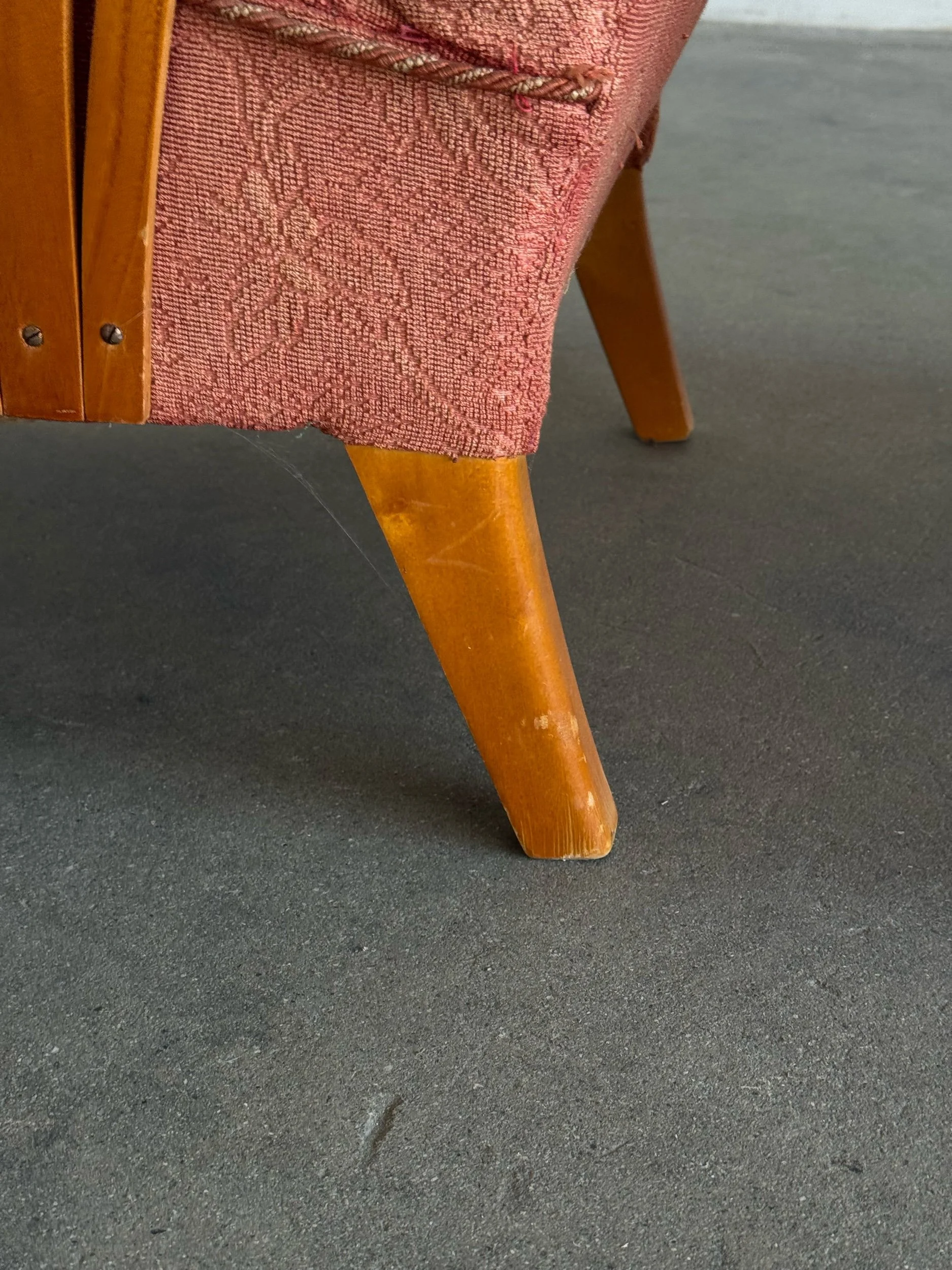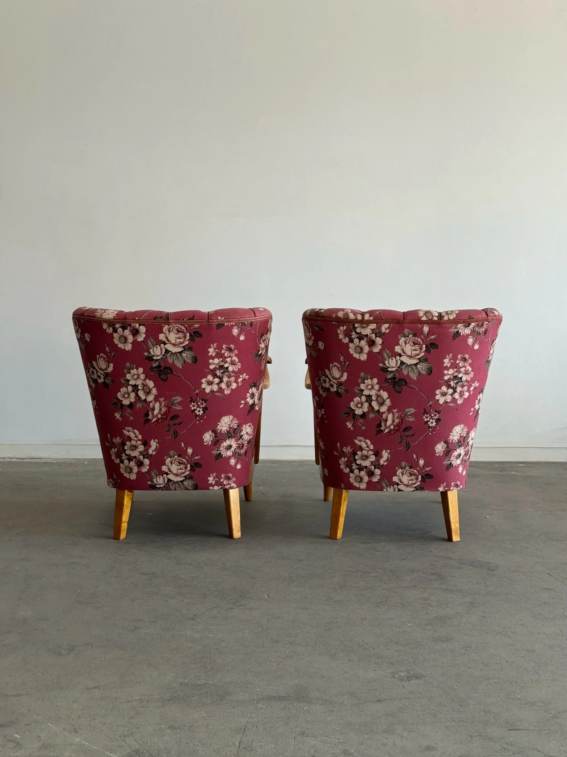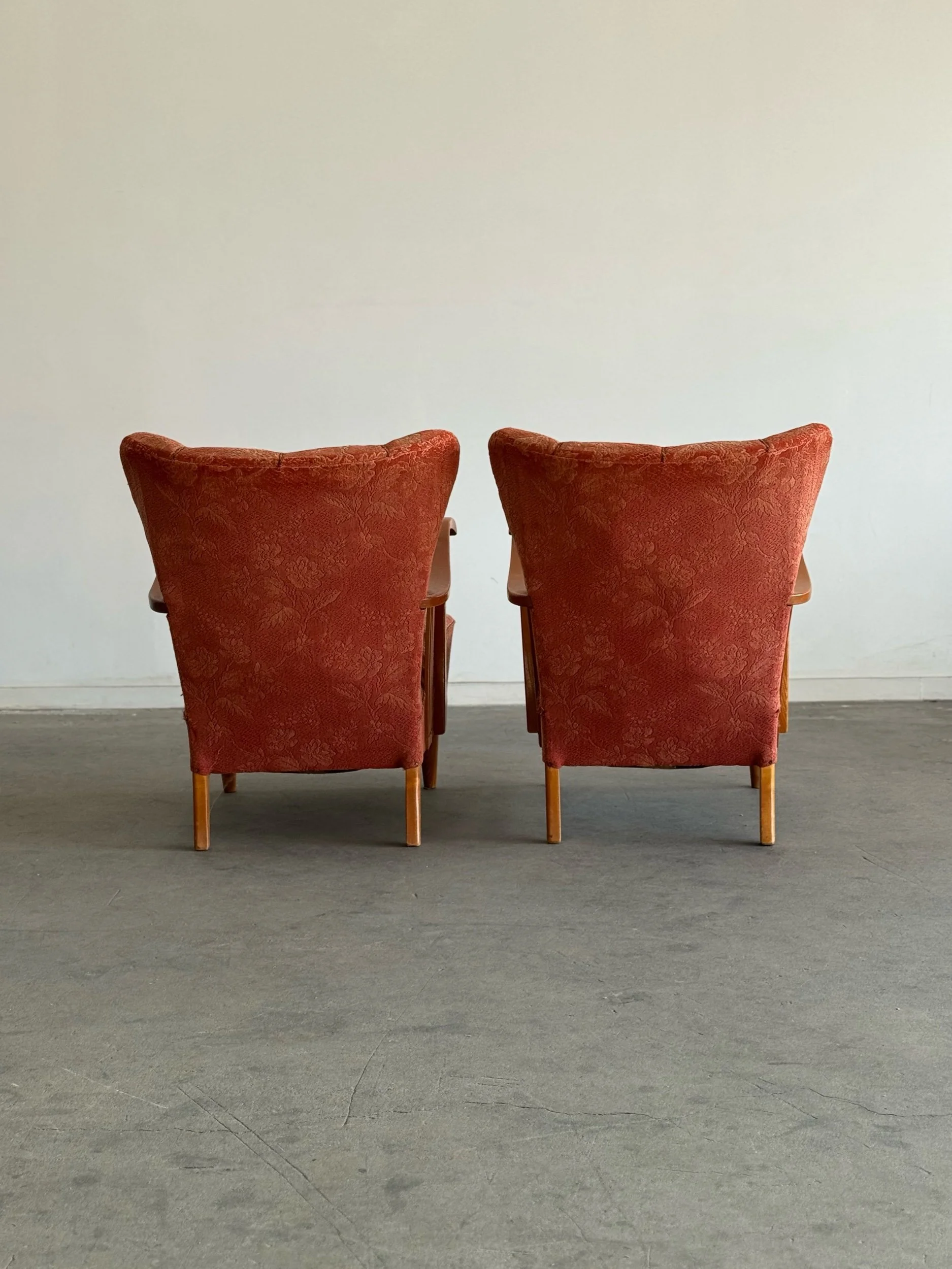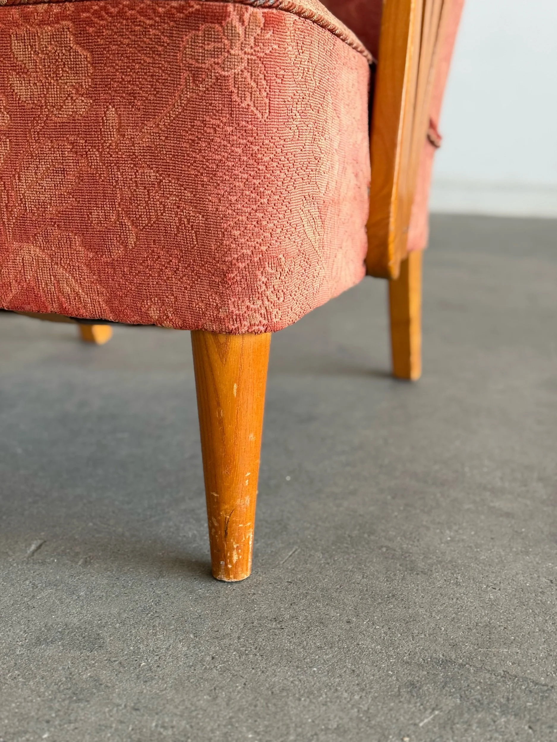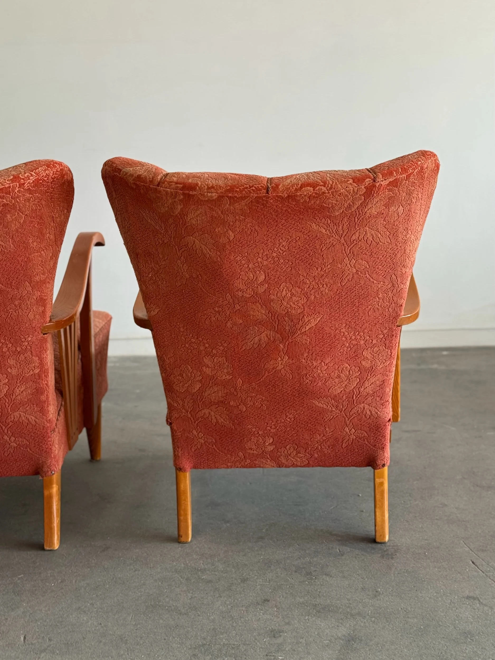 Elegant and inviting, this pair of Swedish Modern lounge chairs embodies the understated sophistication of Scandinavian design. Featuring sculptural slatted arms, tapered legs, and gently curved backs, they blend warmth, comfort, and craftsmanship in perfect balance. Upholstered in its original rich burgundy fabric with a soft texture that complements the natural wood tones. These are in their original condition without restoration.