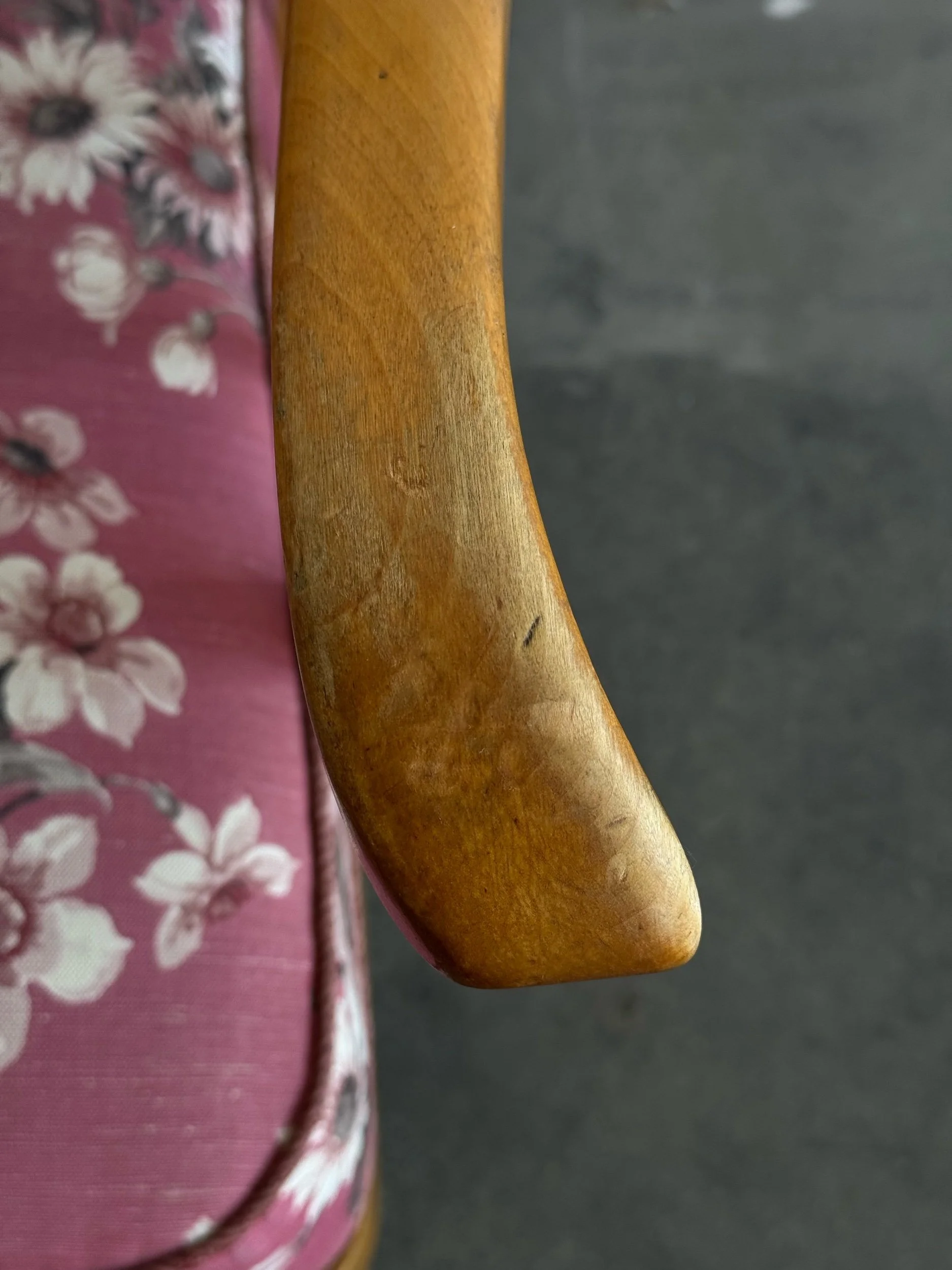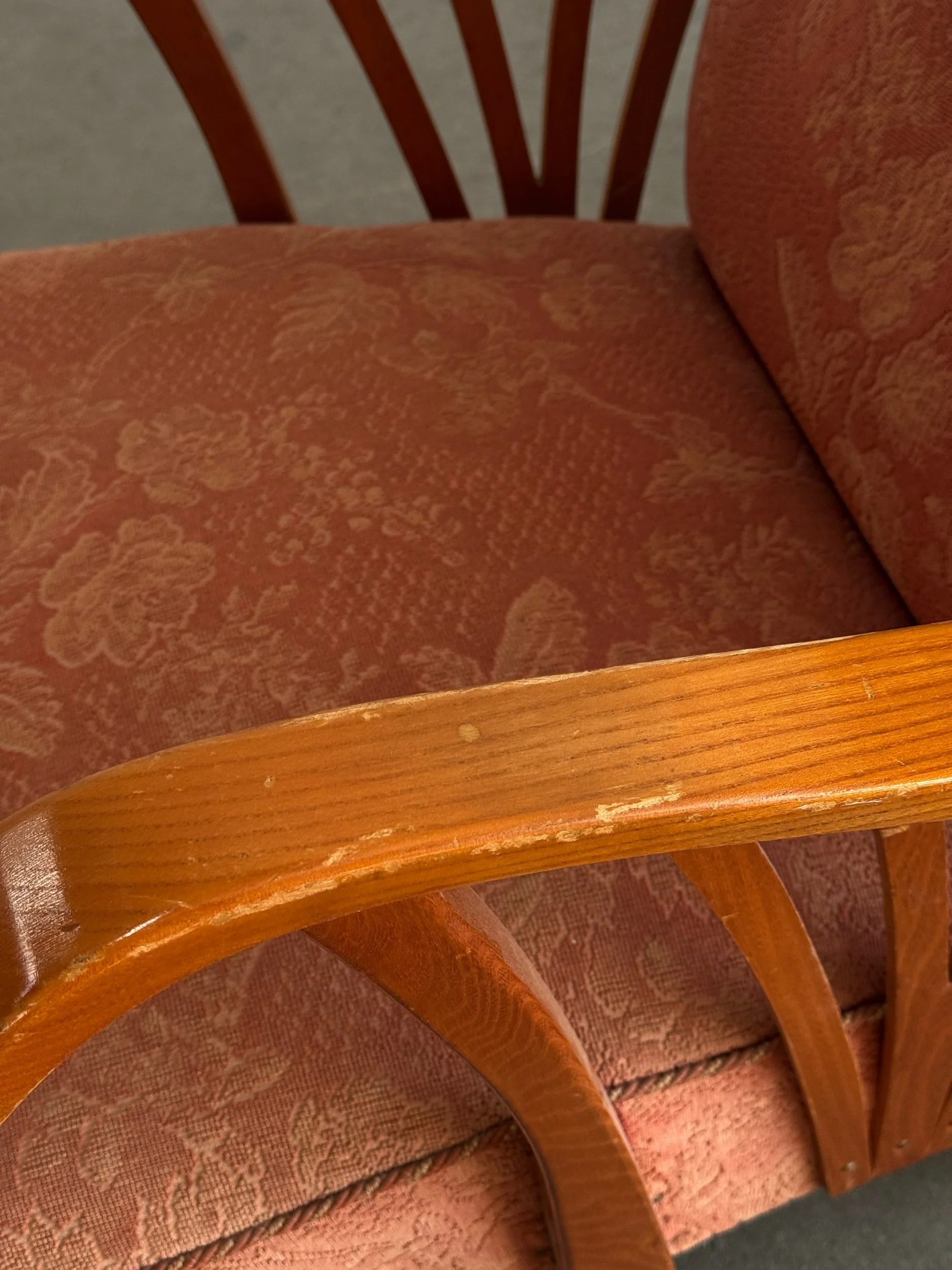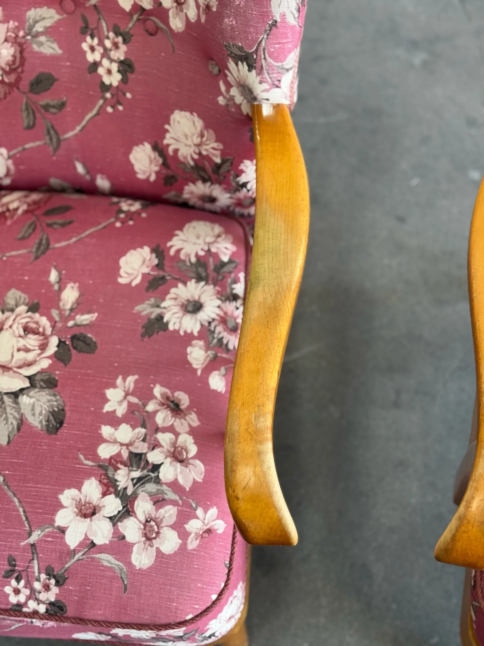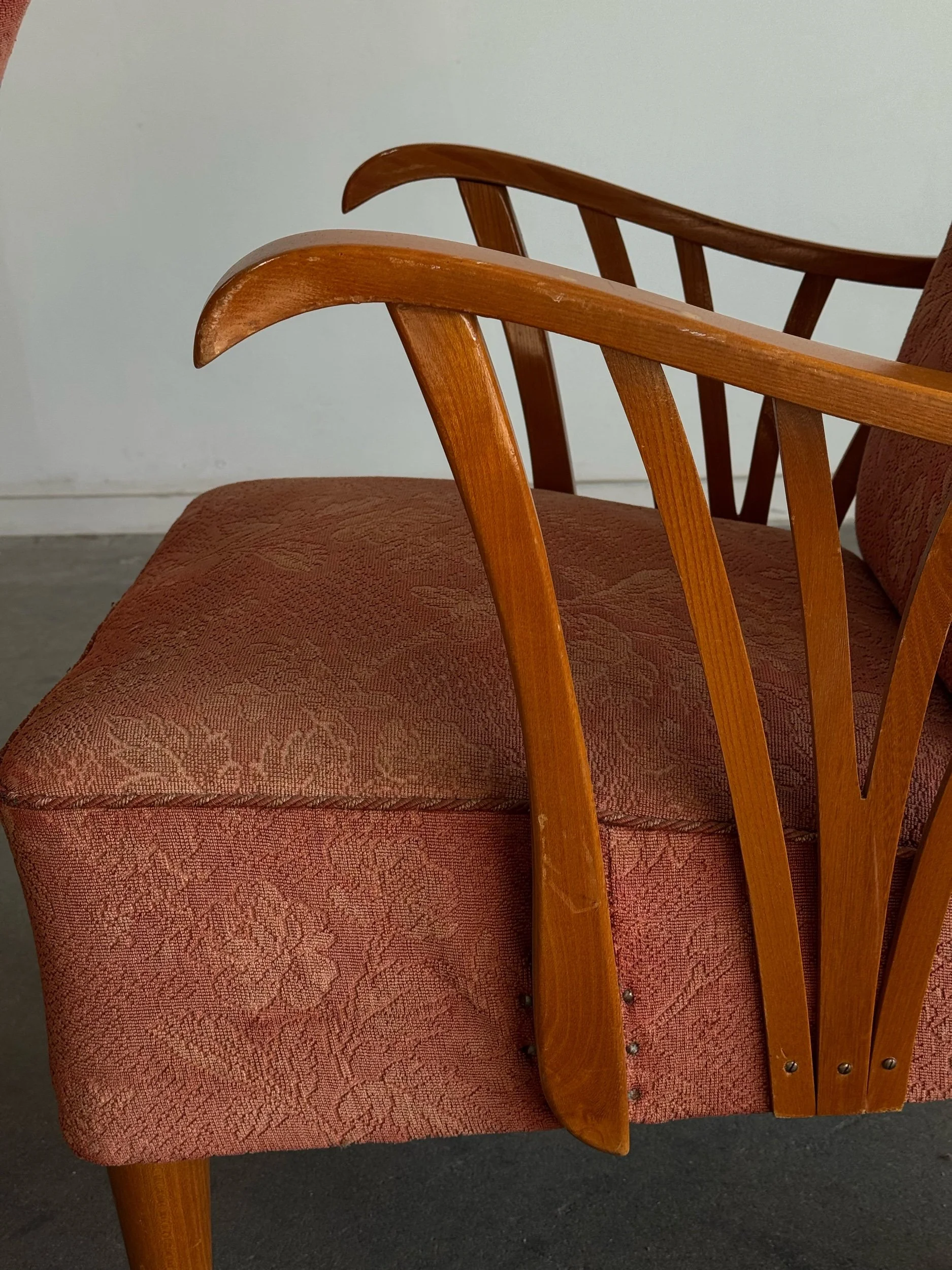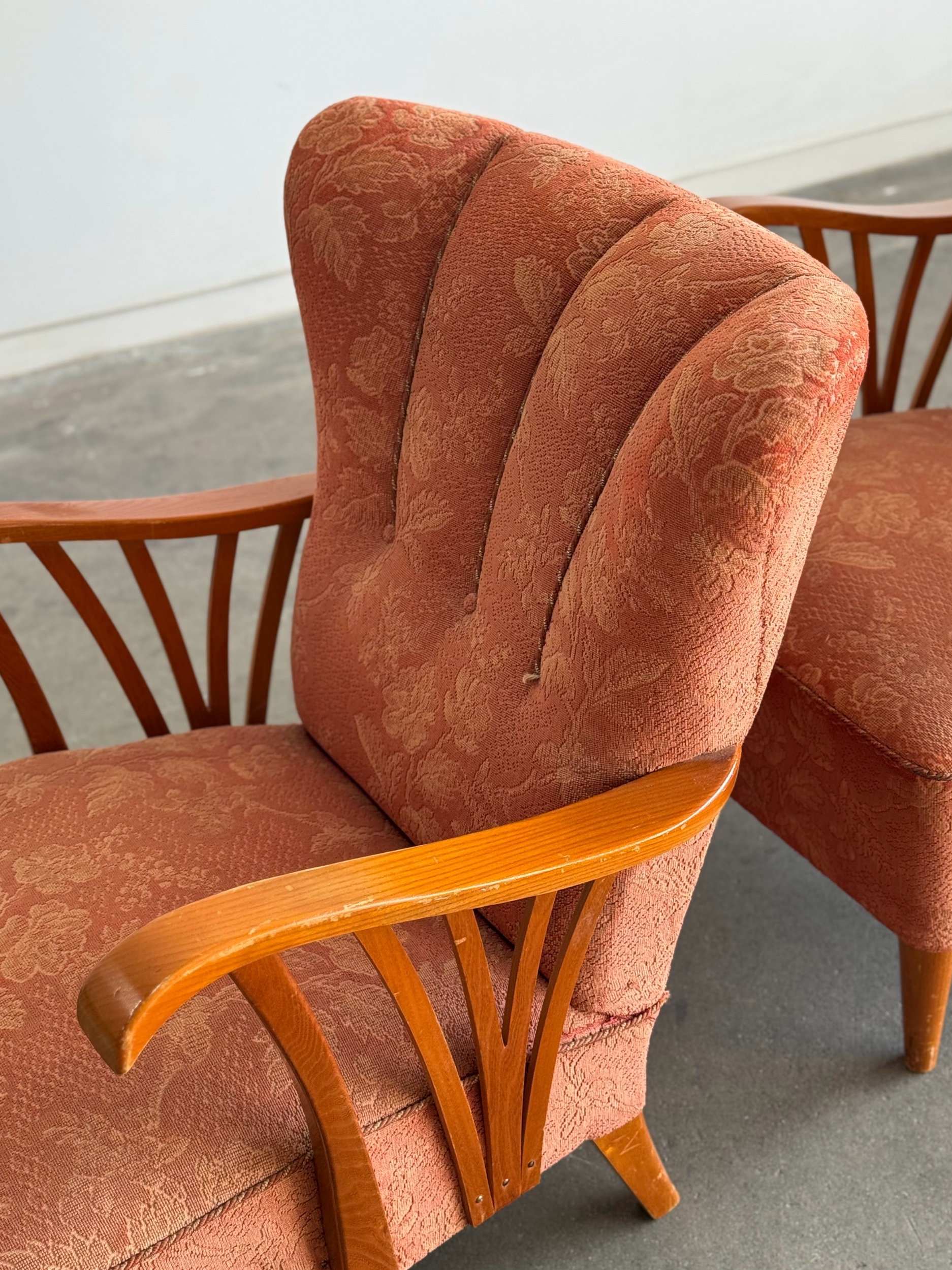 Elegant and inviting, this pair of Swedish Modern lounge chairs embodies the understated sophistication of Scandinavian design. Featuring sculptural slatted arms, tapered legs, and gently curved backs, they blend warmth, comfort, and craftsmanship in perfect balance. Upholstered in its original rich burgundy fabric with a soft texture that complements the natural wood tones. These are in their original condition without restoration.