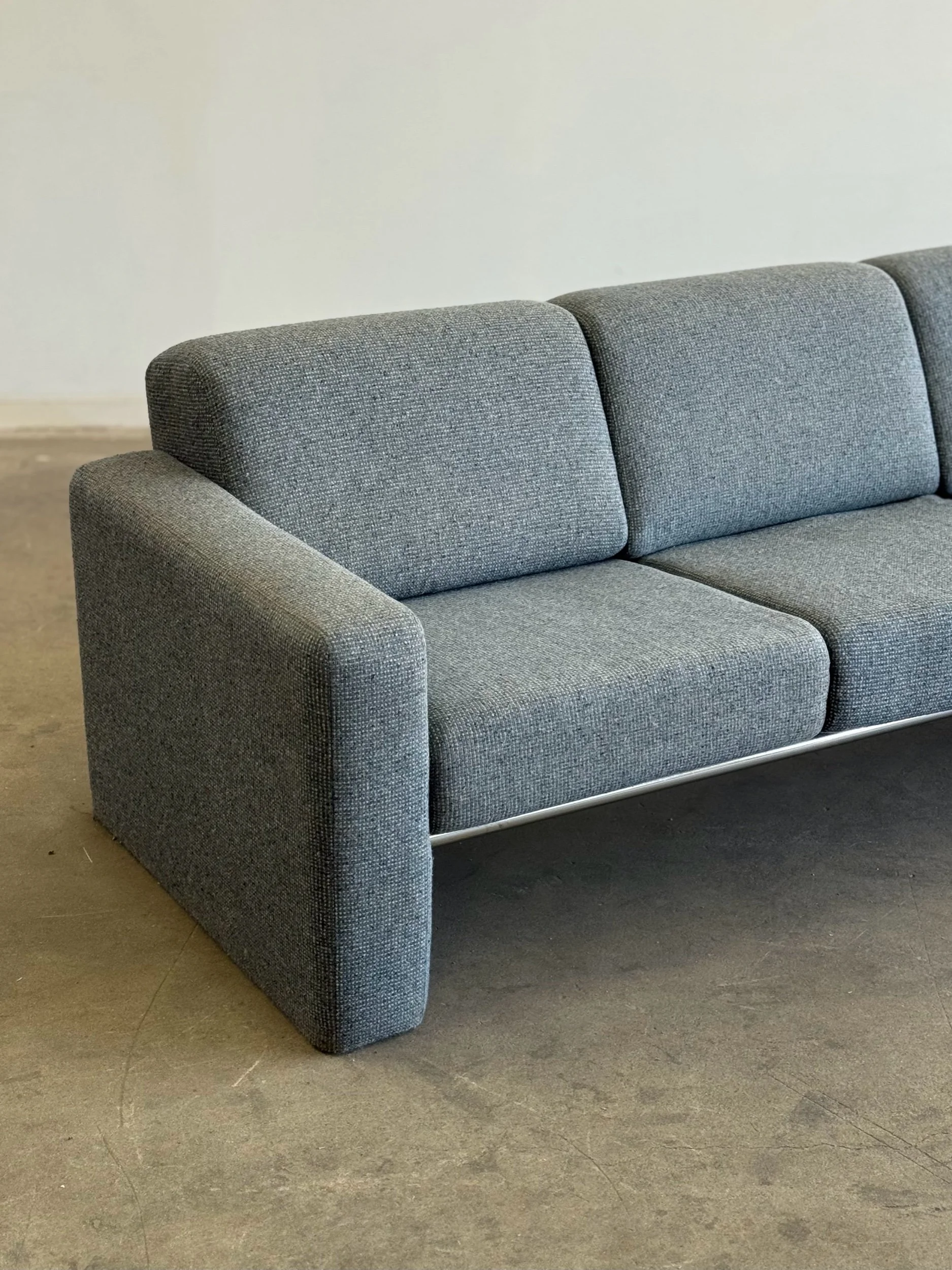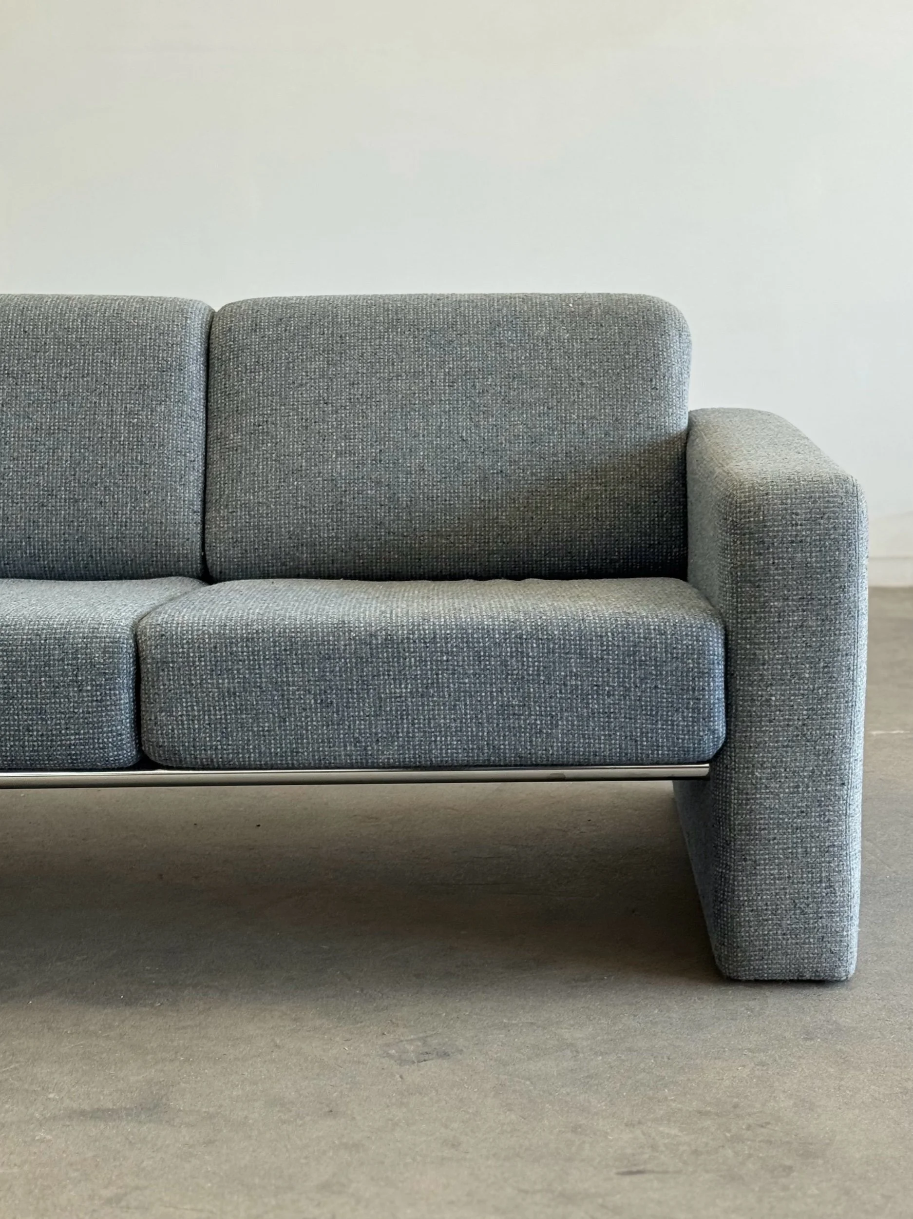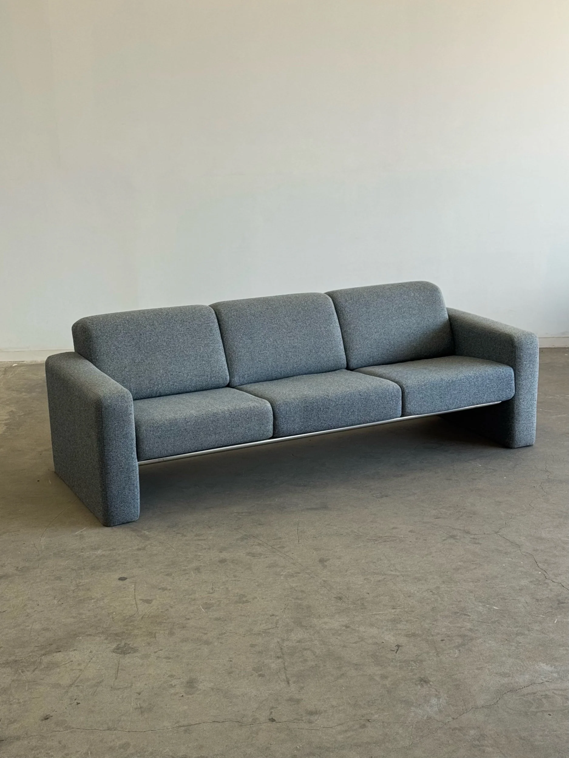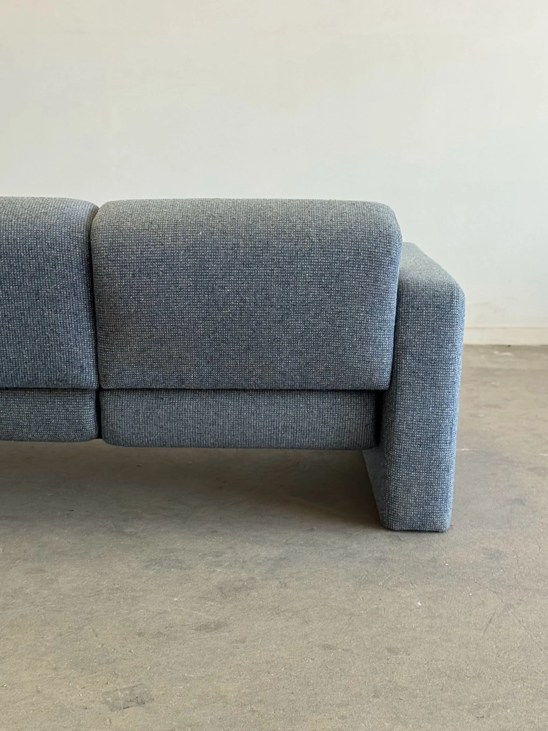 Chunky Post Modern Sofa in as found vintage condition. Unit features a great minimal design with very slight boxy edges. Reminiscent of the Herman Miller Chiclet Design but with added depth and thicker components. Unit is structurally sound and sturdy. Piece has original fabric that overall shows well with light fading and light wear. Item would benefit from upholstery but have plenty of life as shown.