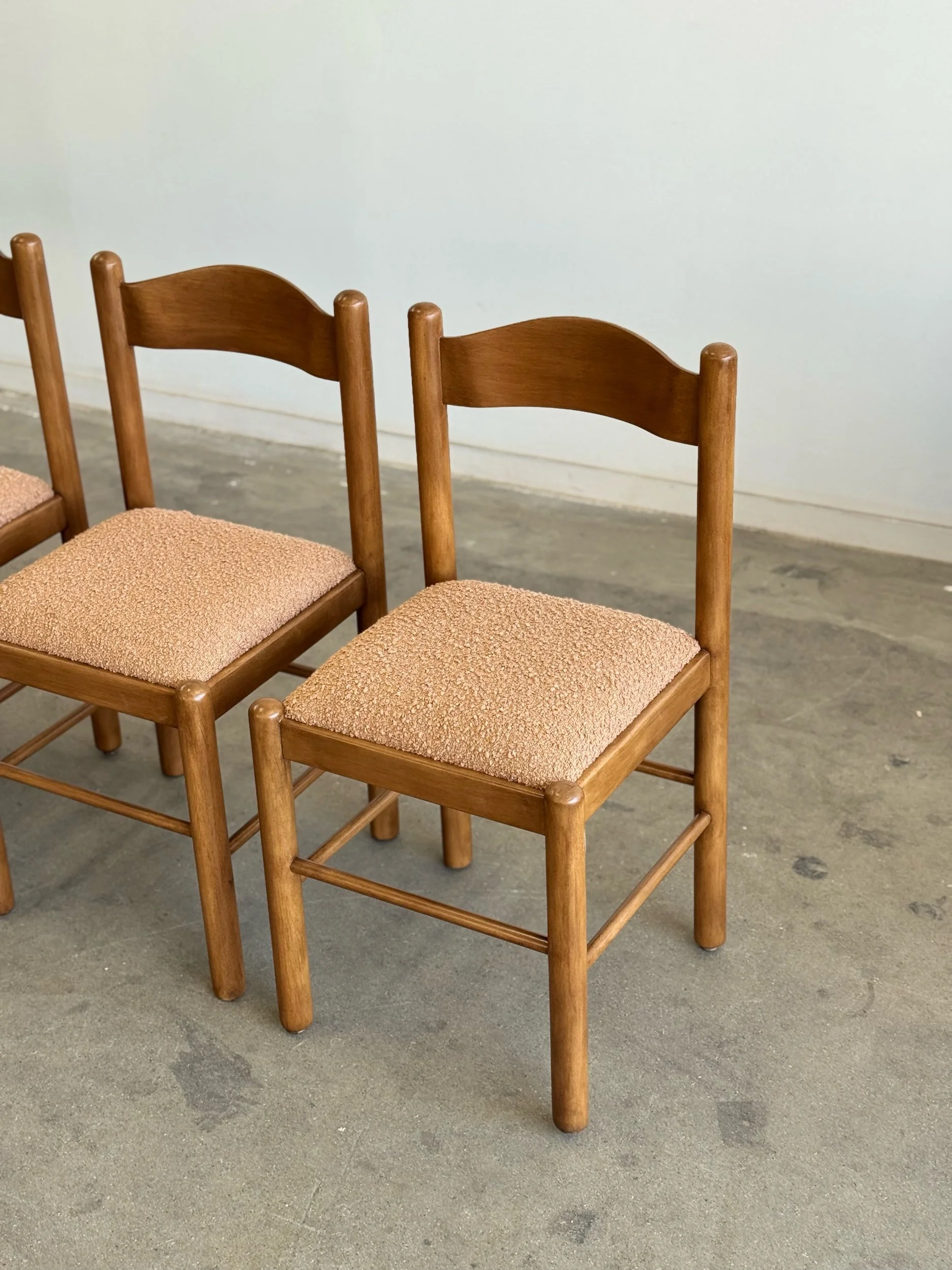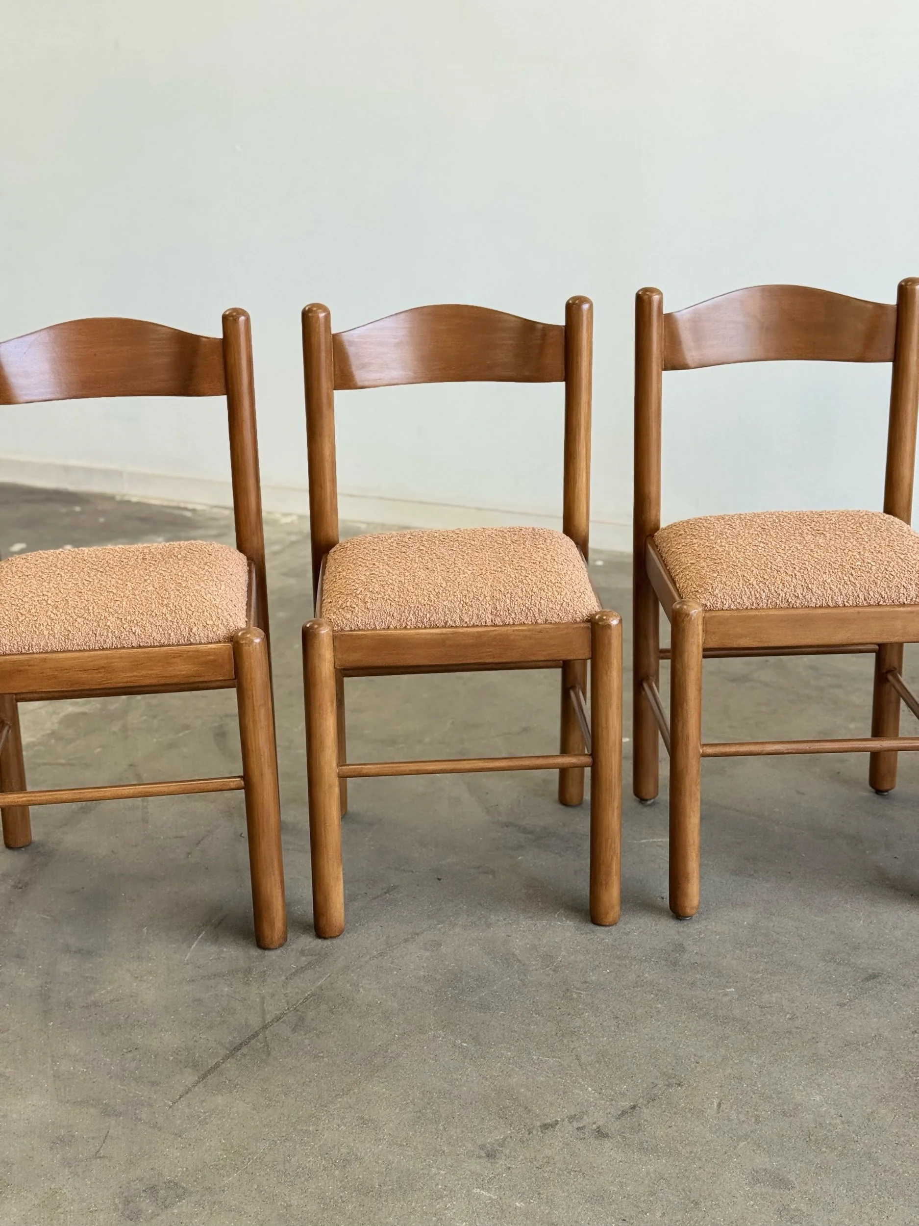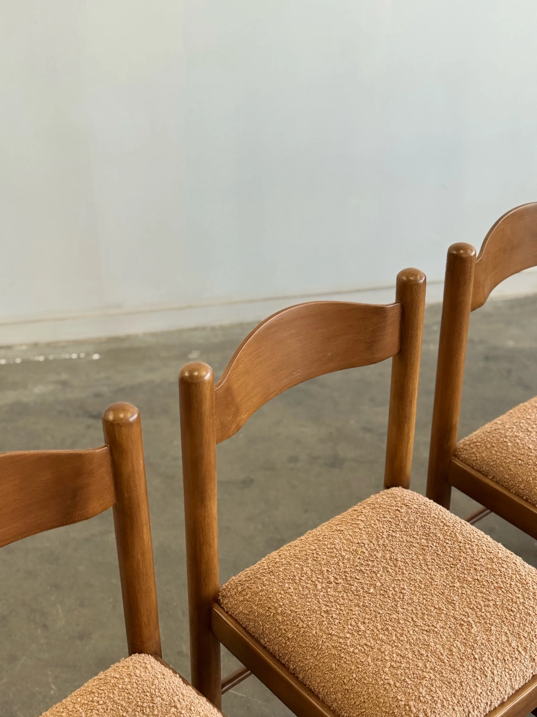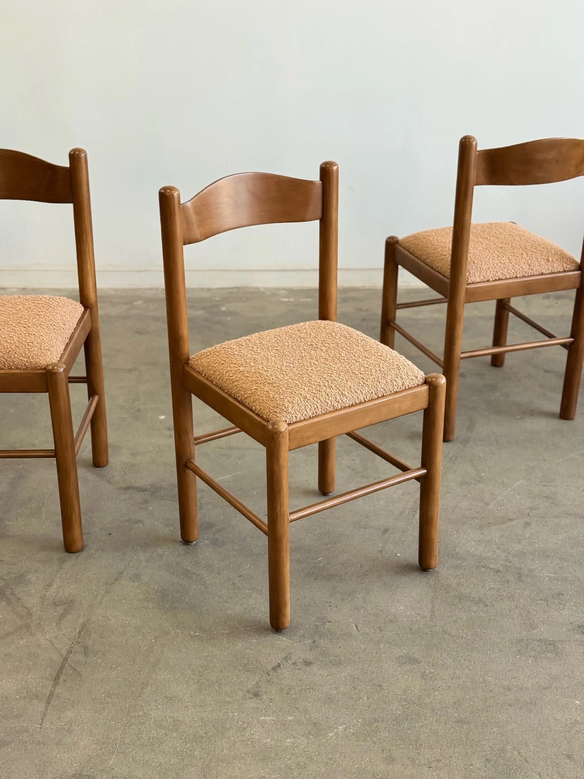 Vintage Magistretti Style dining chairs thoughtfully restored both structurally and aesthetically. Each unit has been reinforced where needed, carefully refinished, and reupholstered with bouclé fabric and new foam. Each chair shows well and is structurally sound.