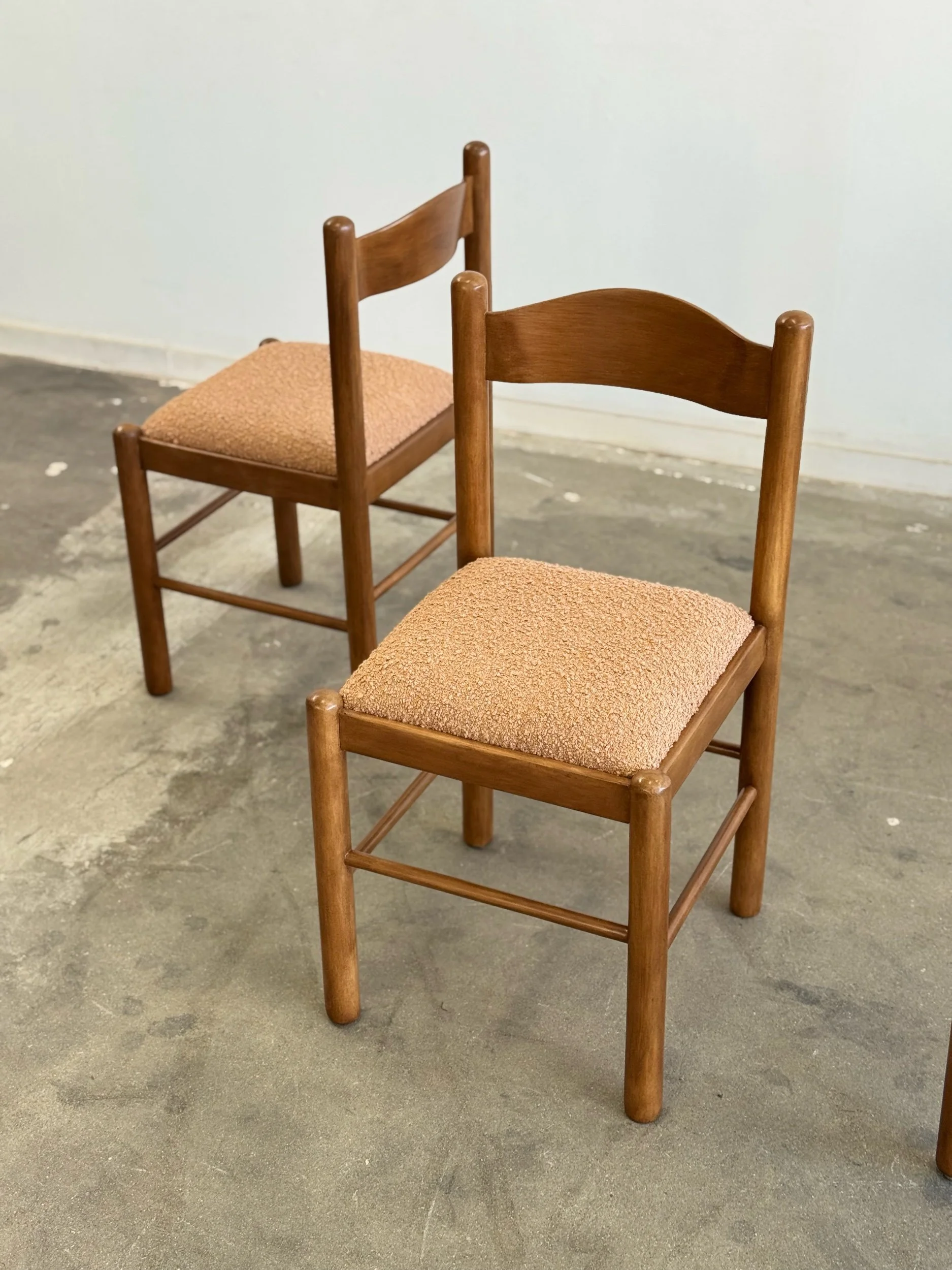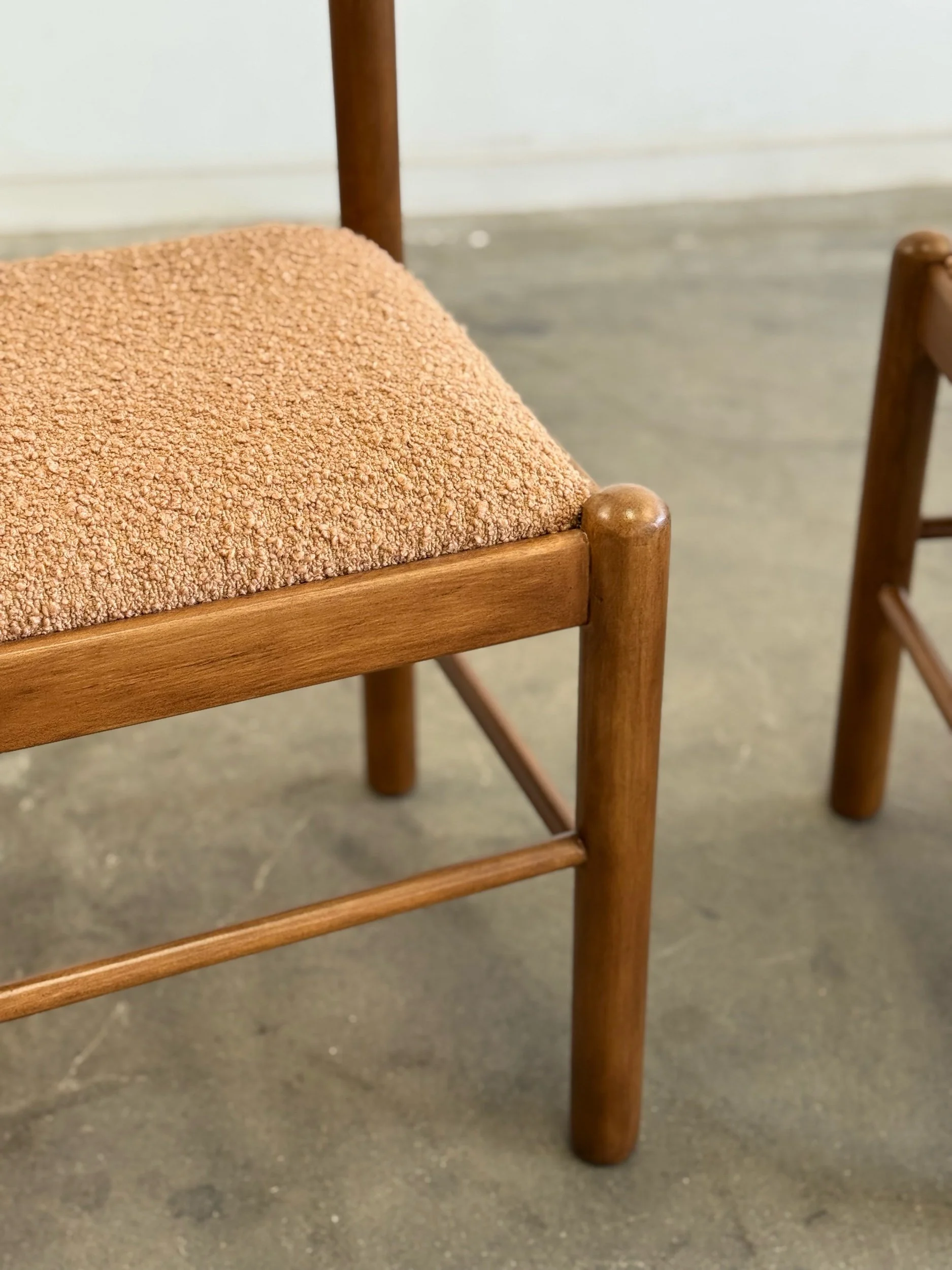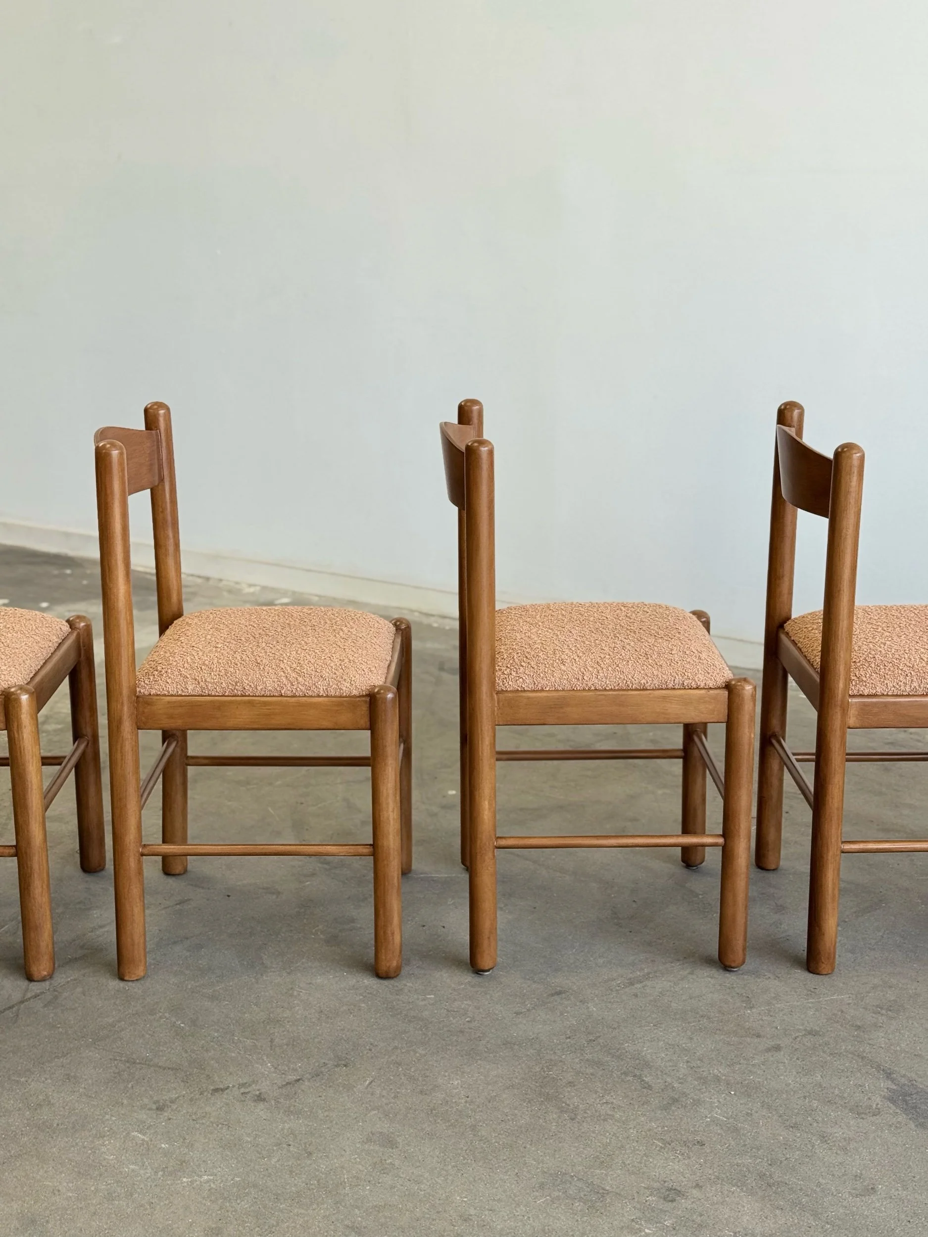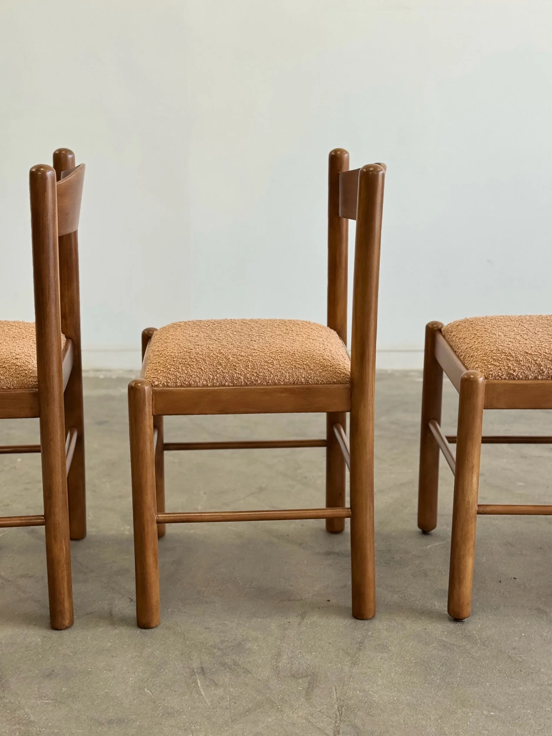 Vintage Magistretti Style dining chairs thoughtfully restored both structurally and aesthetically. Each unit has been reinforced where needed, carefully refinished, and reupholstered with bouclé fabric and new foam. Each chair shows well and is structurally sound.