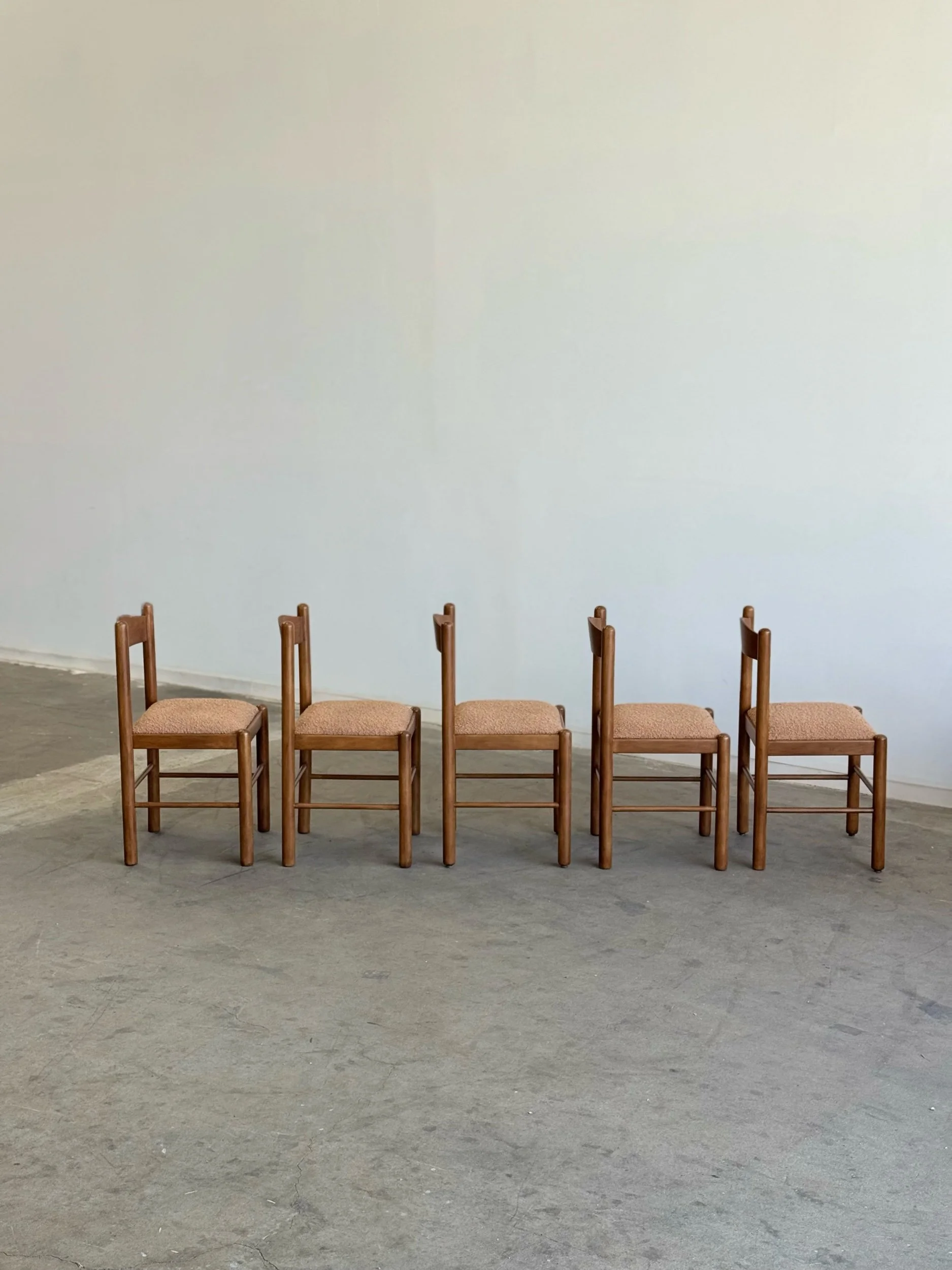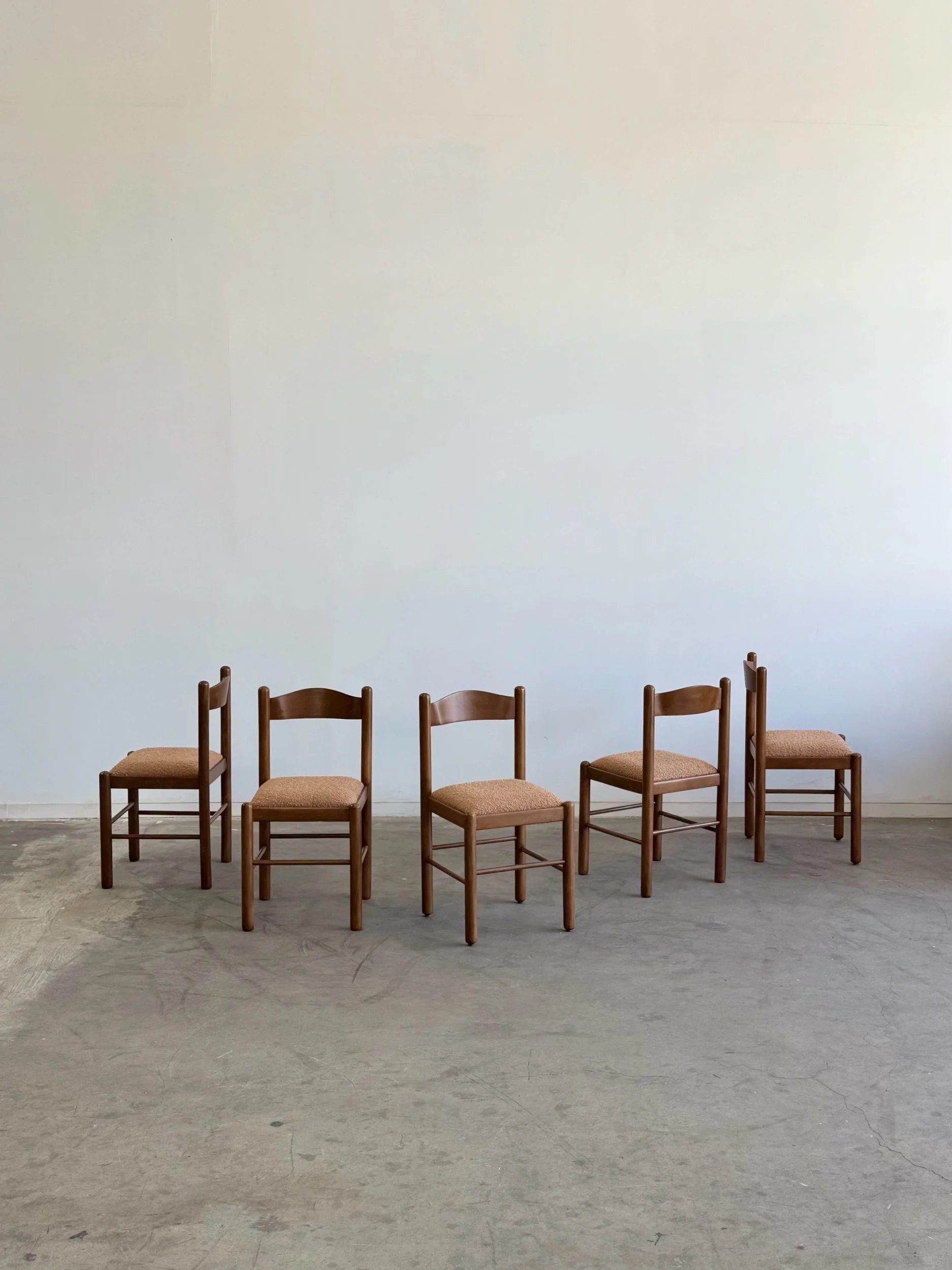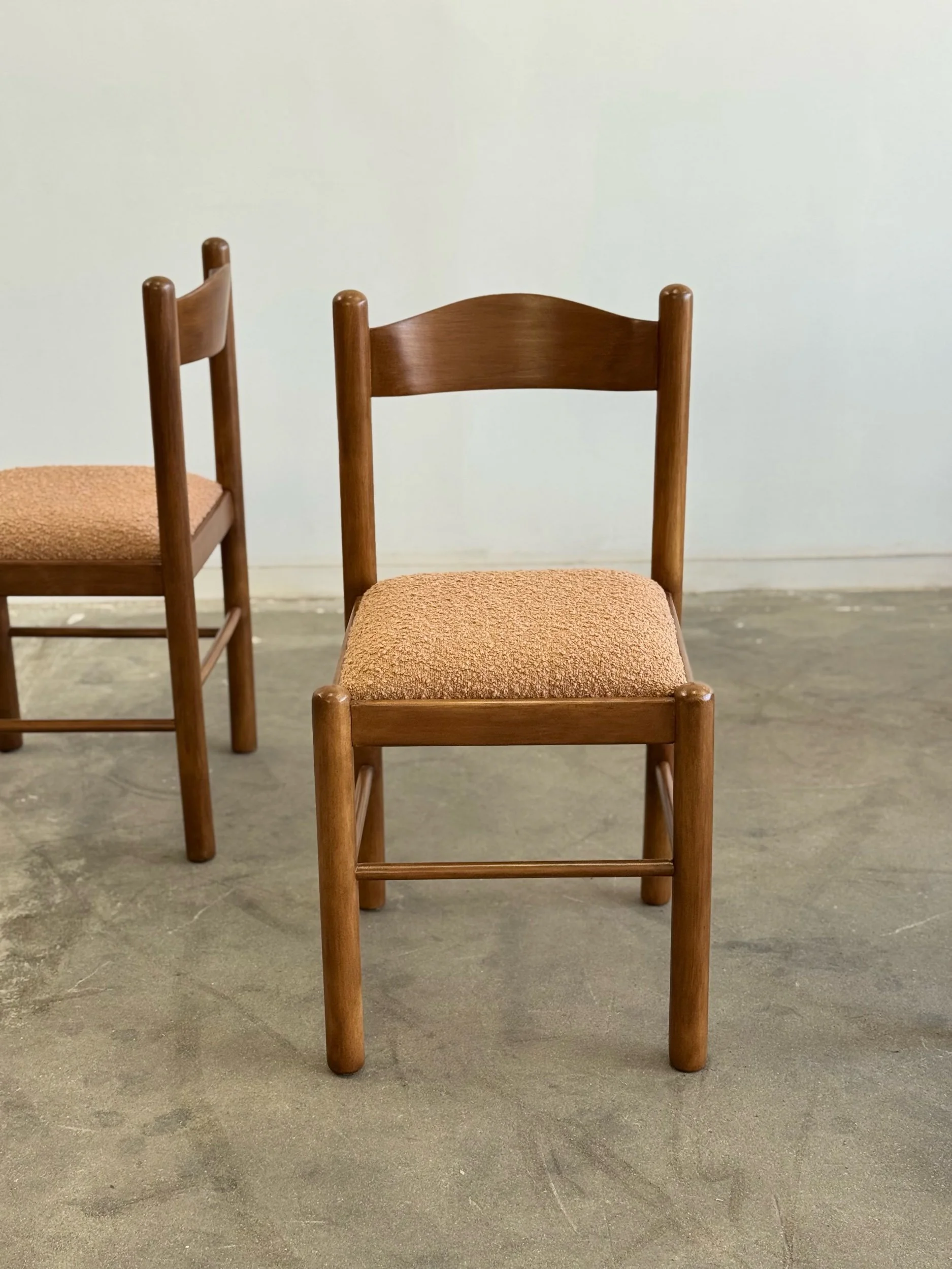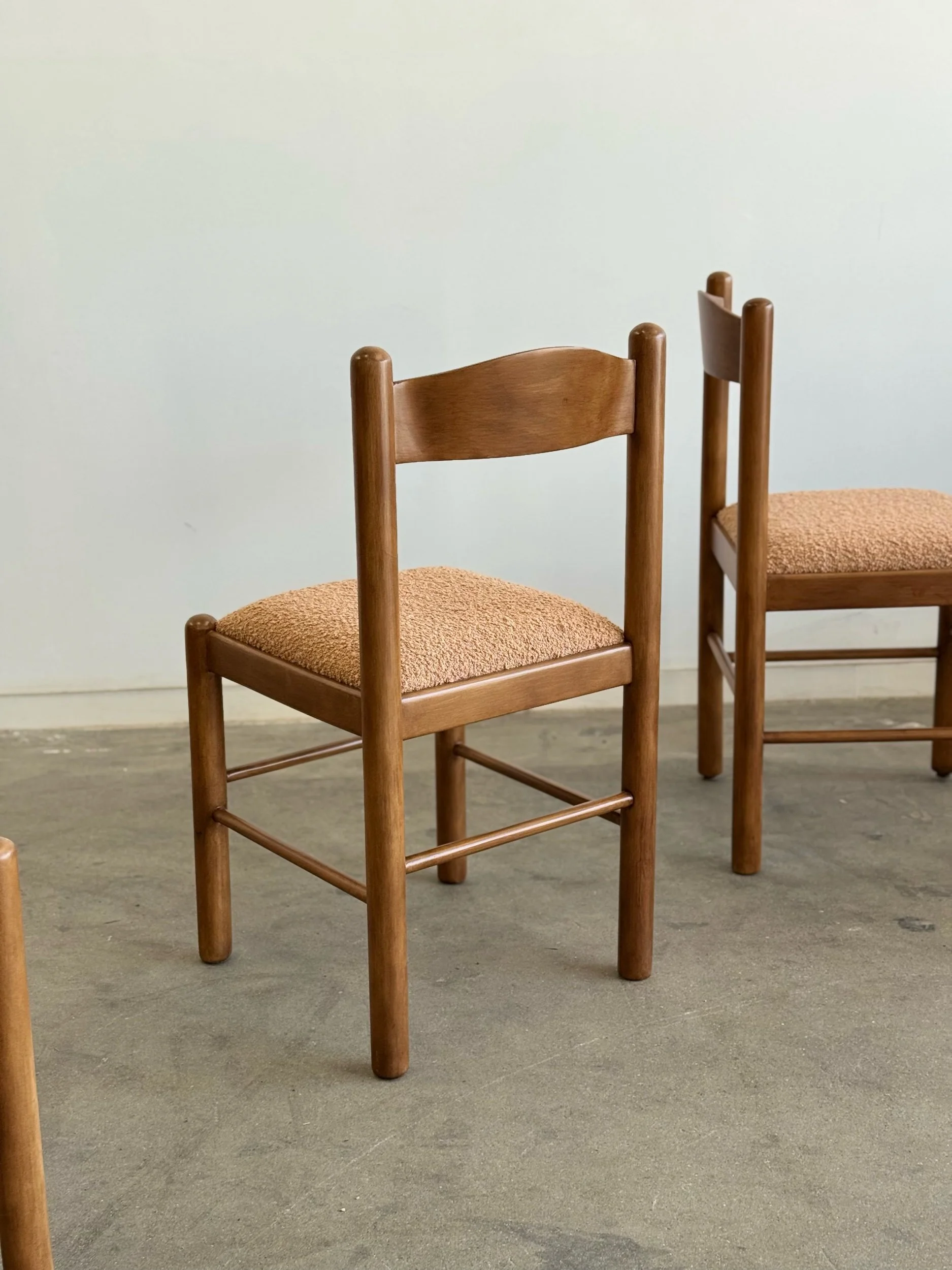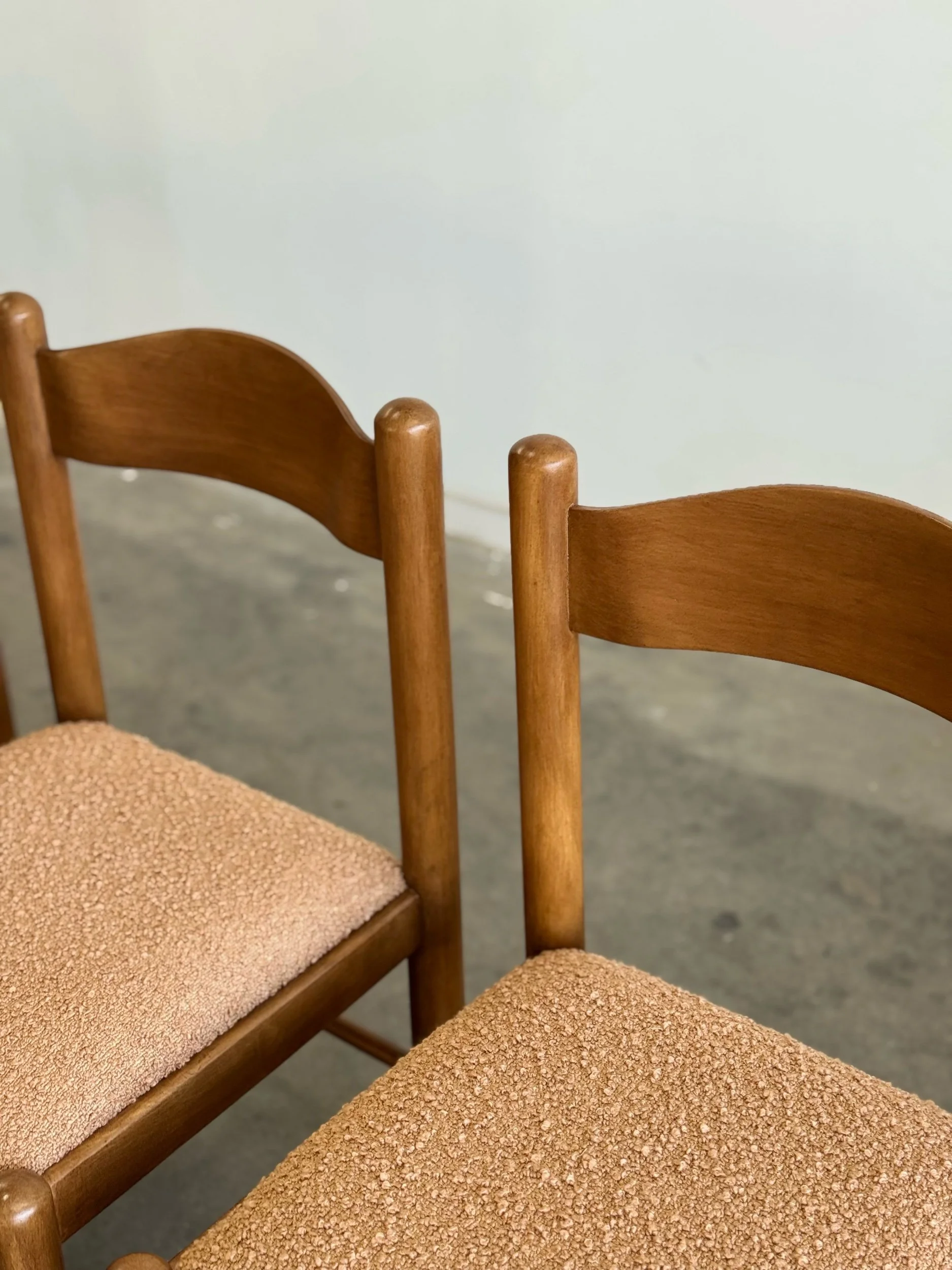 Vintage Magistretti Style dining chairs thoughtfully restored both structurally and aesthetically. Each unit has been reinforced where needed, carefully refinished, and reupholstered with bouclé fabric and new foam. Each chair shows well and is structurally sound.