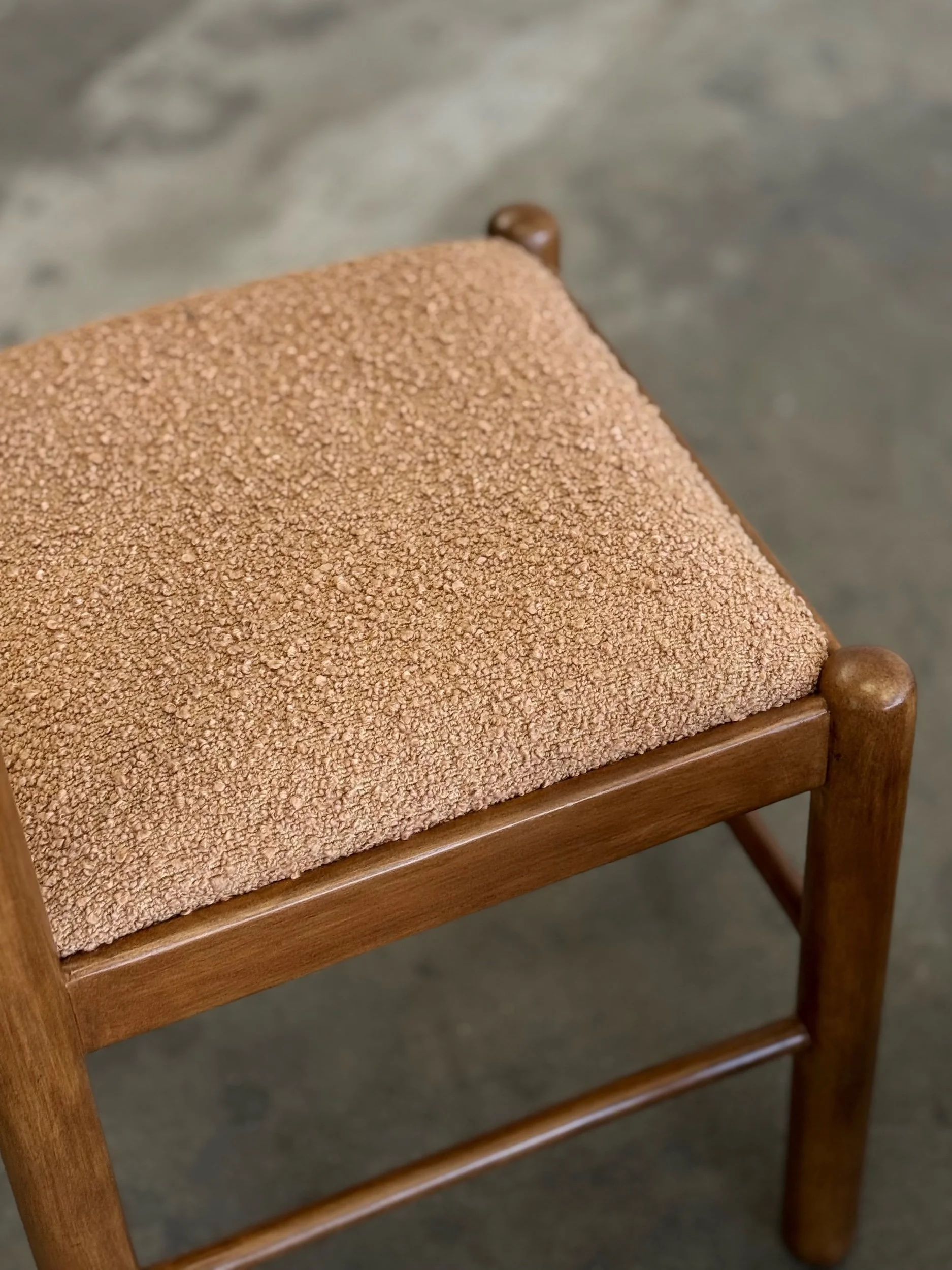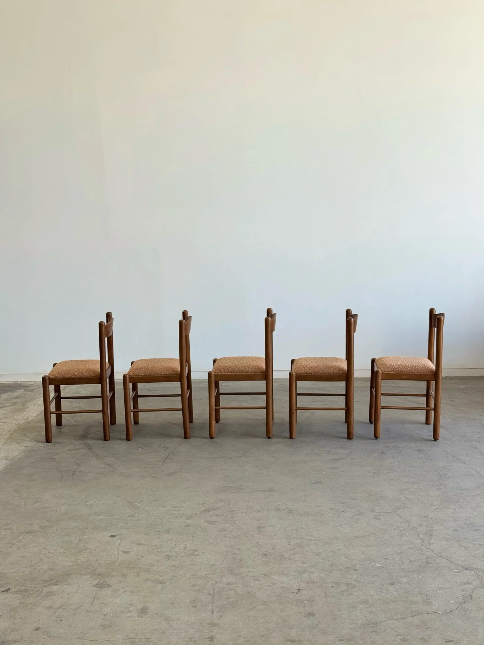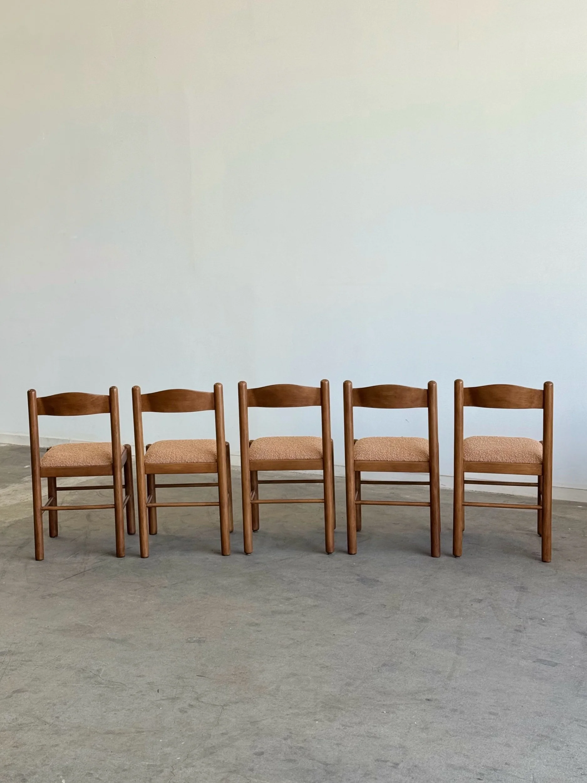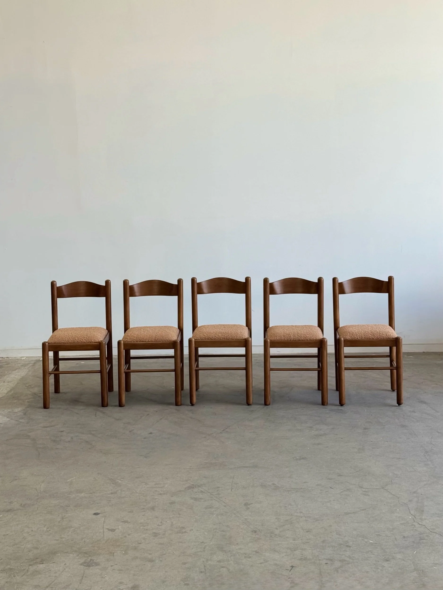 Vintage Magistretti Style dining chairs thoughtfully restored both structurally and aesthetically. Each unit has been reinforced where needed, carefully refinished, and reupholstered with bouclé fabric and new foam. Each chair shows well and is structurally sound.