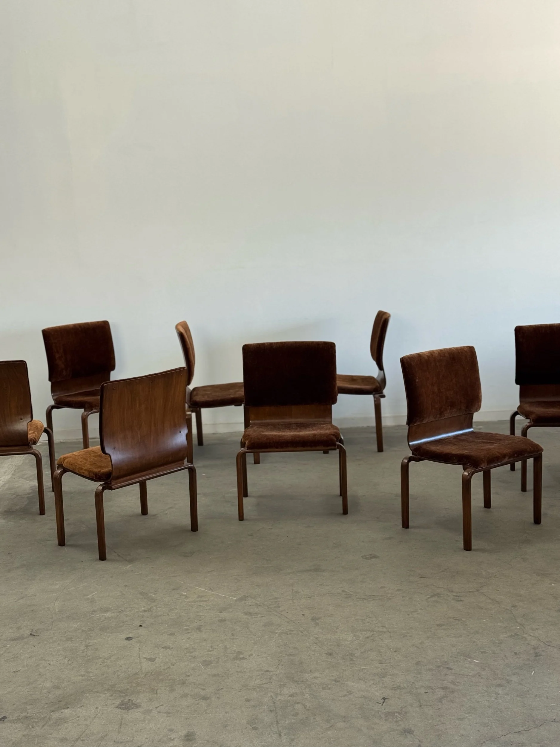 Fully restored bentwood dining chairs in excellent fully restored condition. Each unit shows be structurally sound , sturdy , and can be stacked . Chairs have fresh foam , new upholstery and have been finished in a medium dark walnut. Price is for the set of eight.