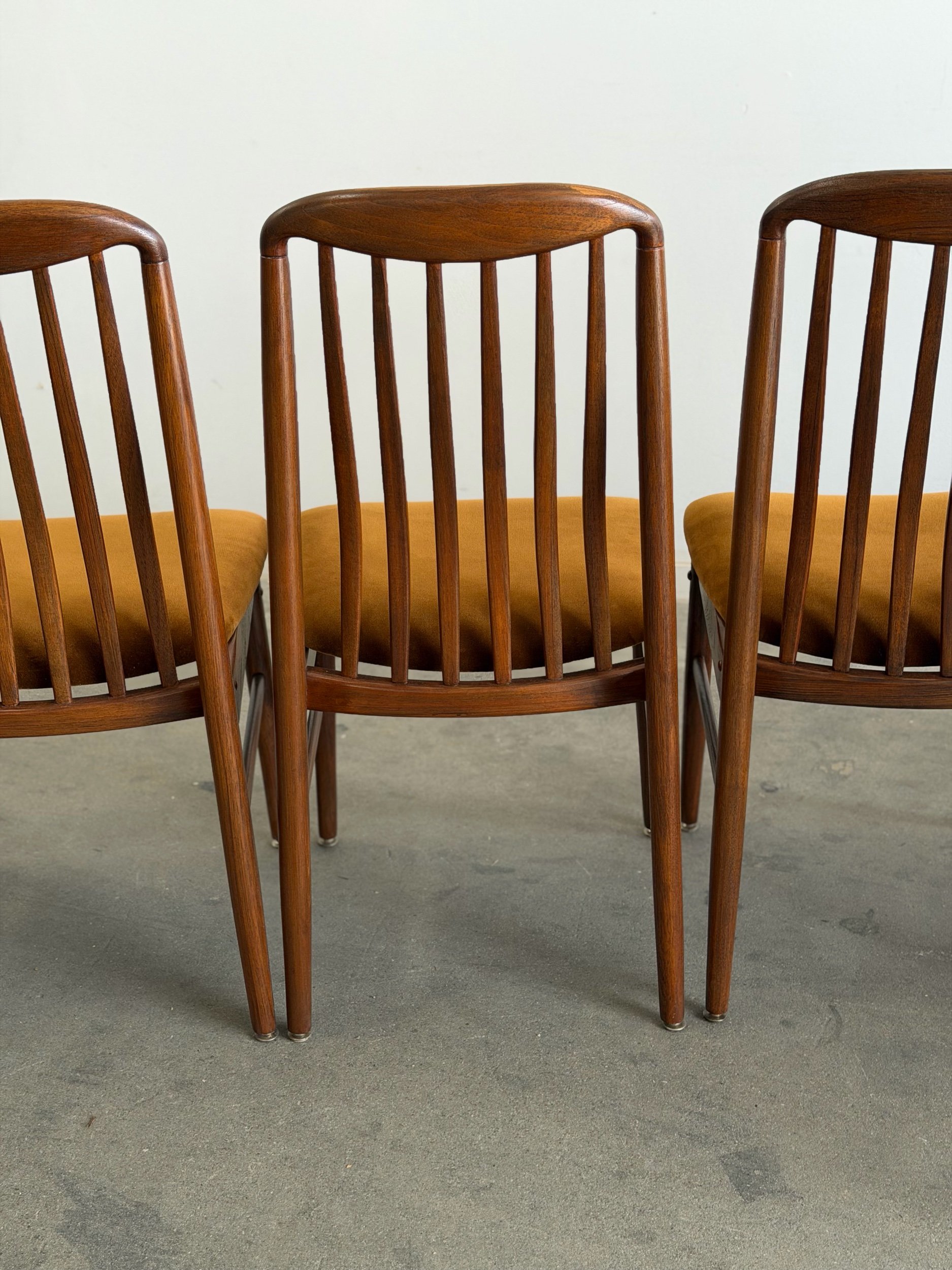 In excellent condition, fully restored teak wood danish modern chairs. They come in a set of six, a perfect touch to elevate your dining room. Carefully crafted from solid teak wood with a rich, warm honey colored grain. Its tapered legs and sleek, “airy” silhouette complement both a vintage and contemporary aesthetic.