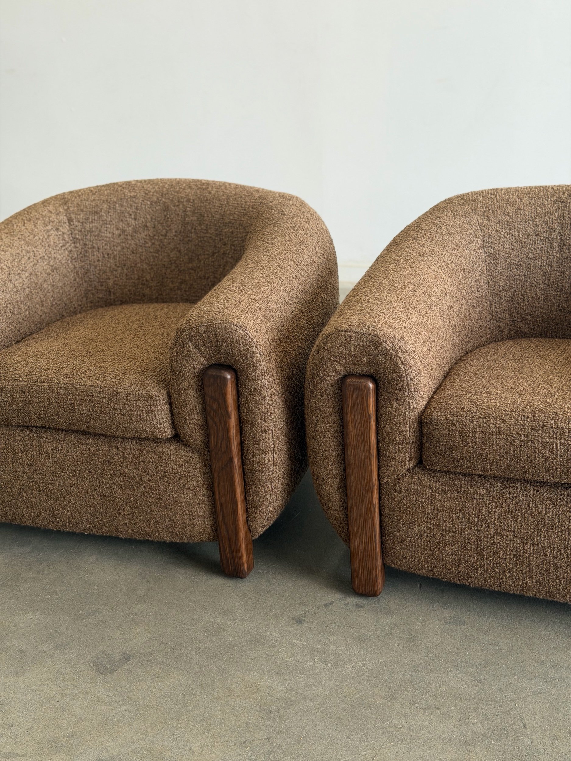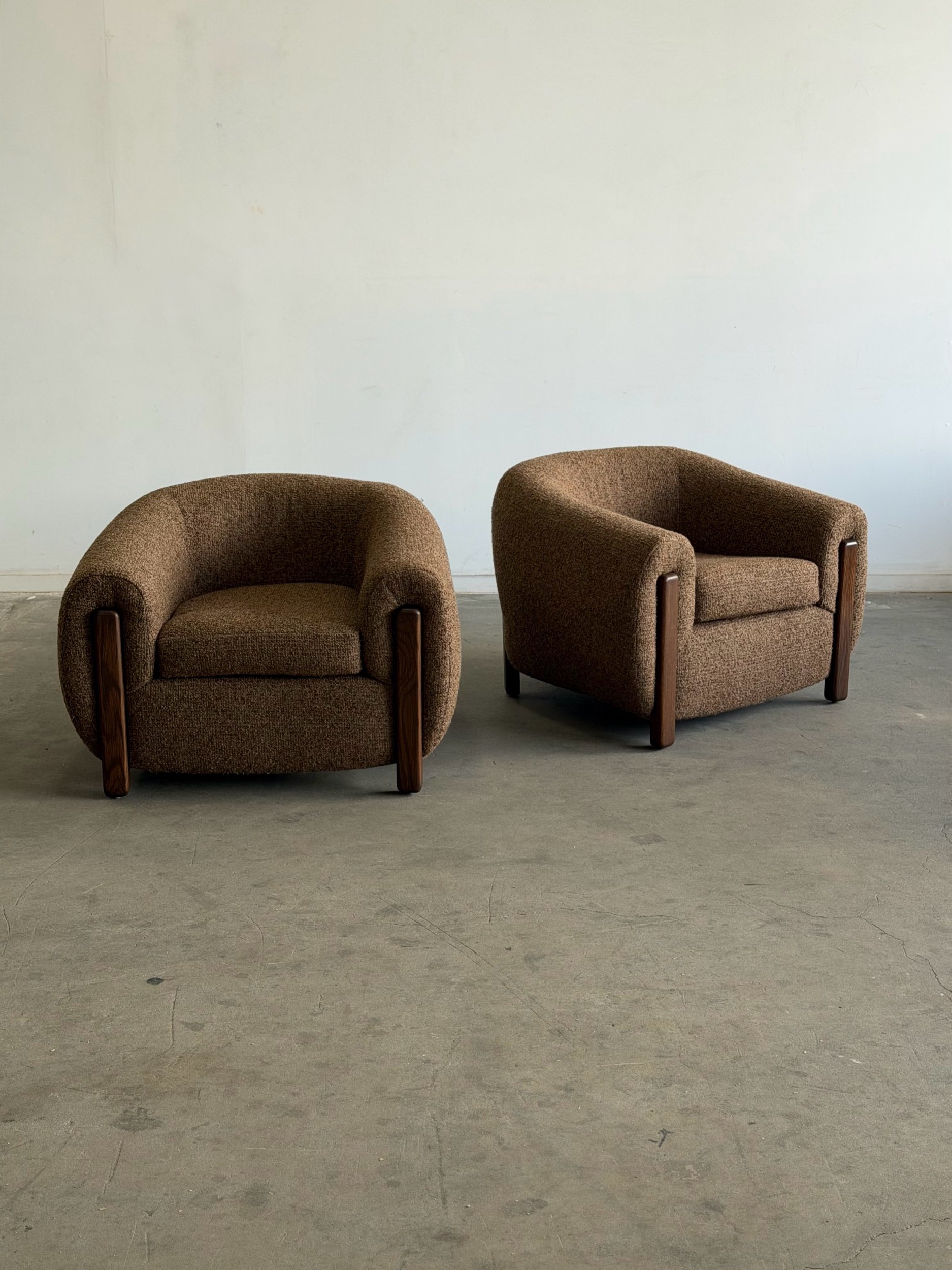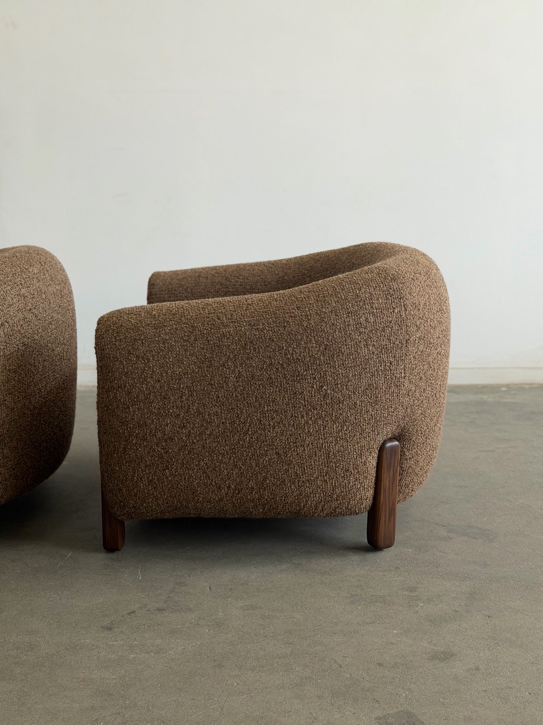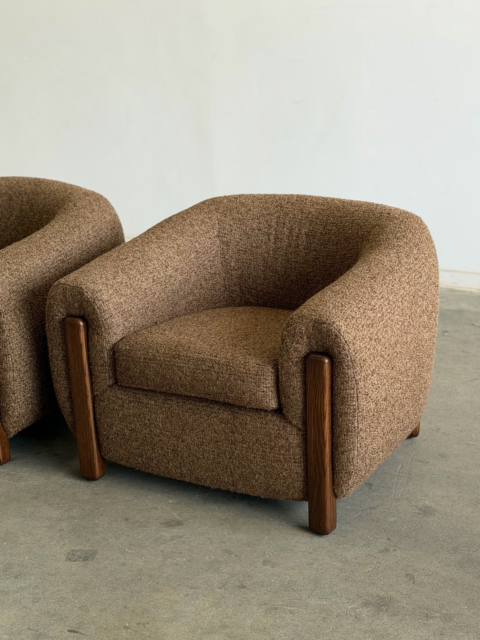 Pair of lounge Chairs custom-made for previous owners, newly restored in house and in great condition. Chairs were made to previous owners specifications . Each chair now features new fill and foam fresh straps, new nubby boucle. Solid oak legs have a medium dark walnut and both units are structurally sound and sturdy. Price is for the pair.