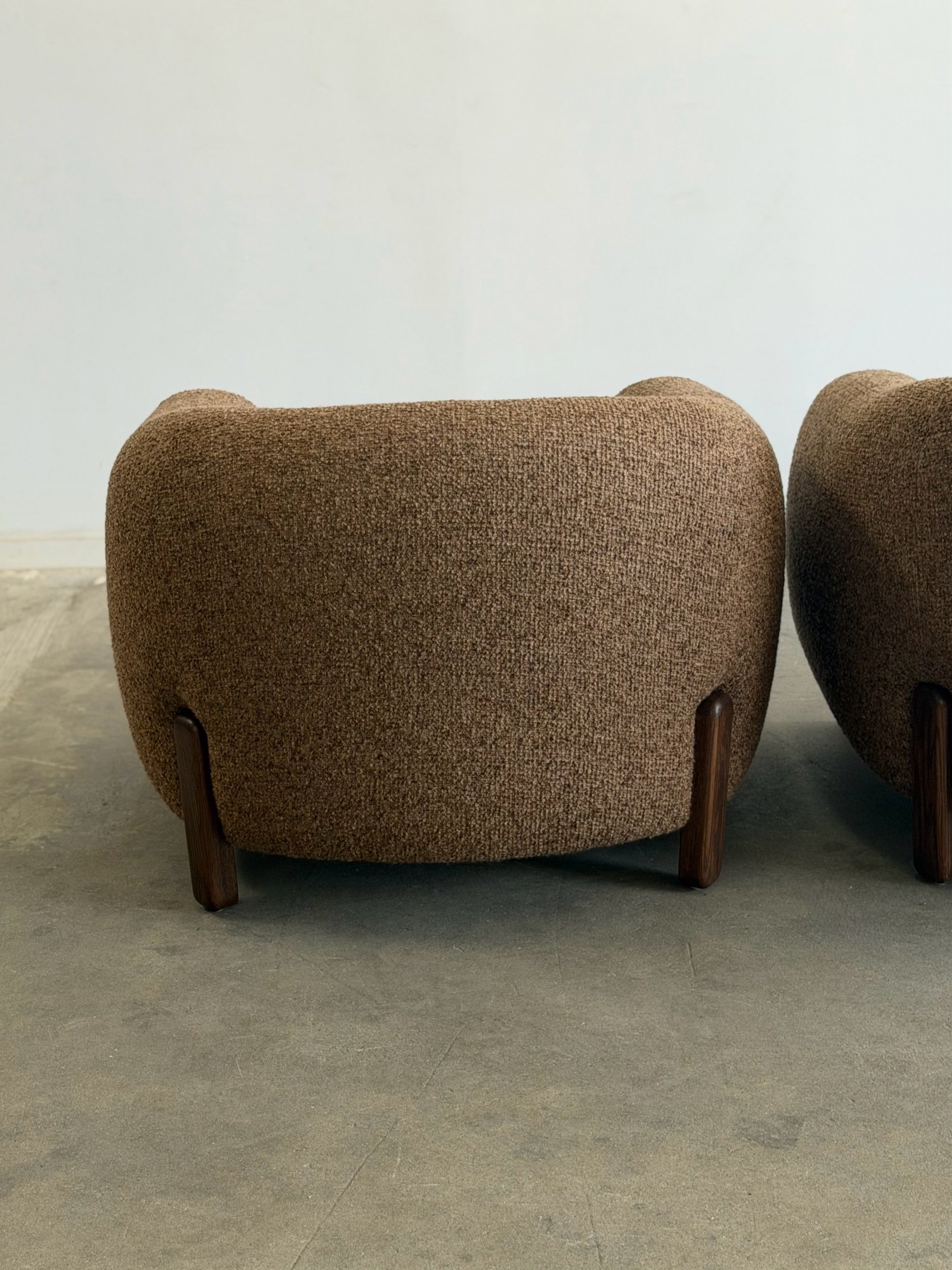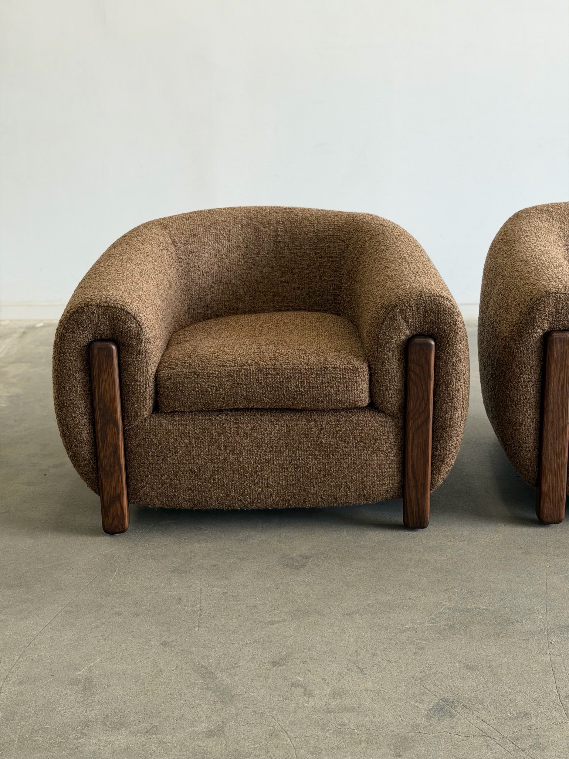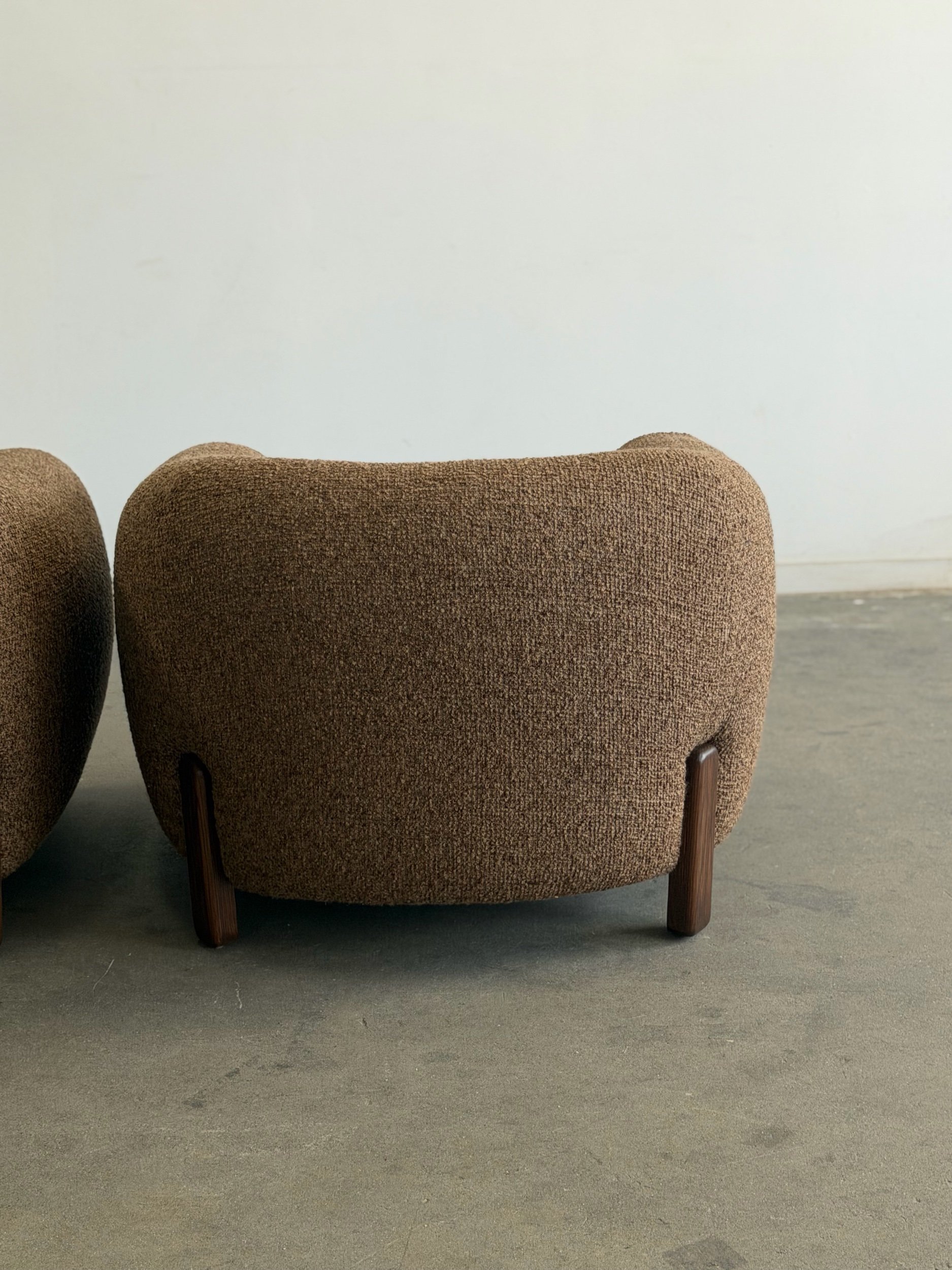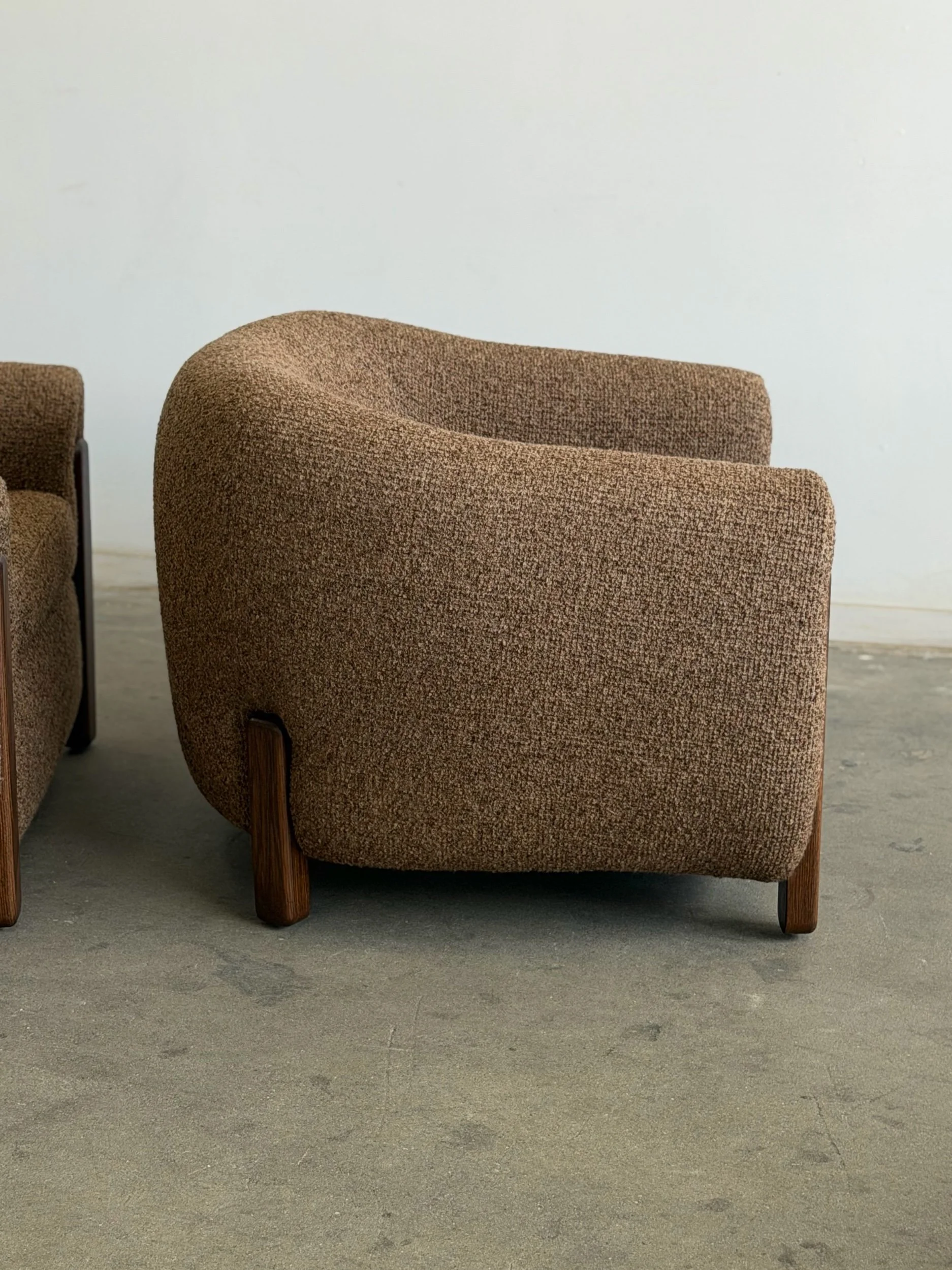 Pair of lounge Chairs custom-made for previous owners, newly restored in house and in great condition. Chairs were made to previous owners specifications . Each chair now features new fill and foam fresh straps, new nubby boucle. Solid oak legs have a medium dark walnut and both units are structurally sound and sturdy. Price is for the pair.