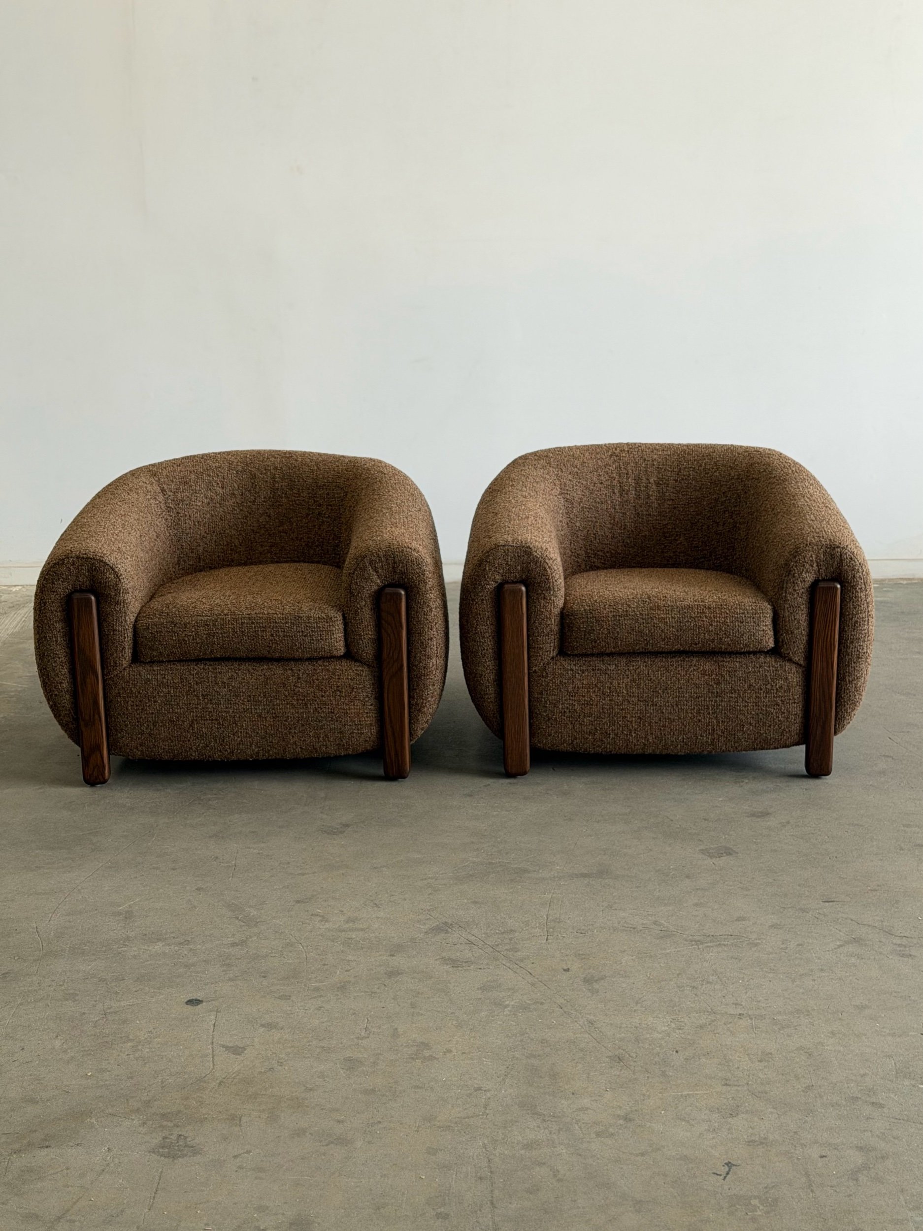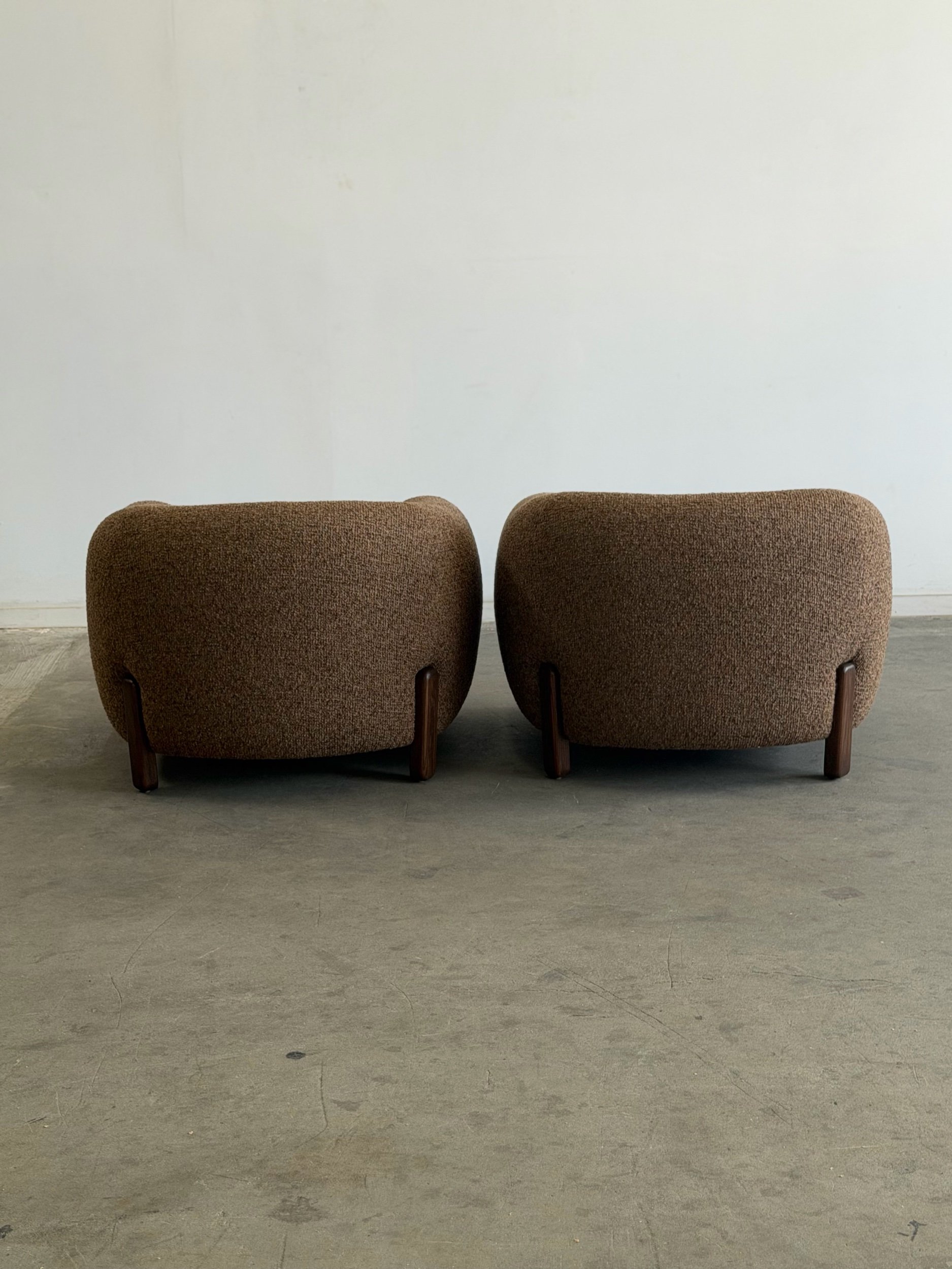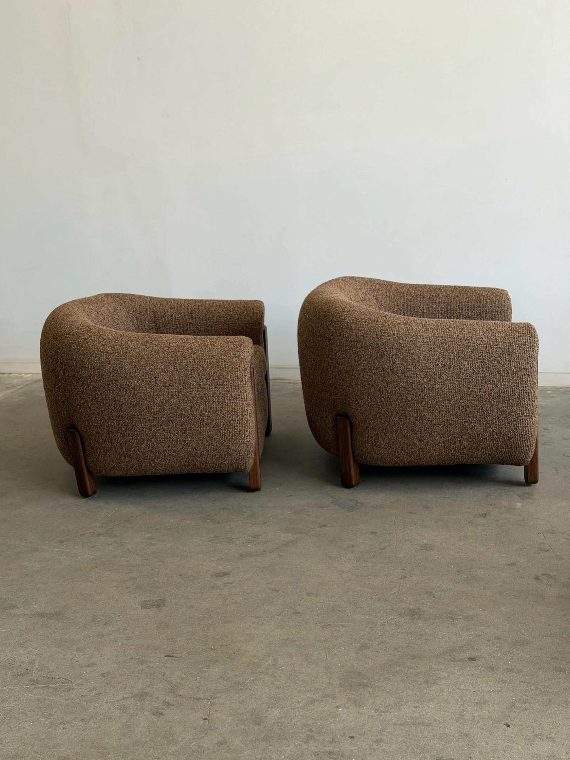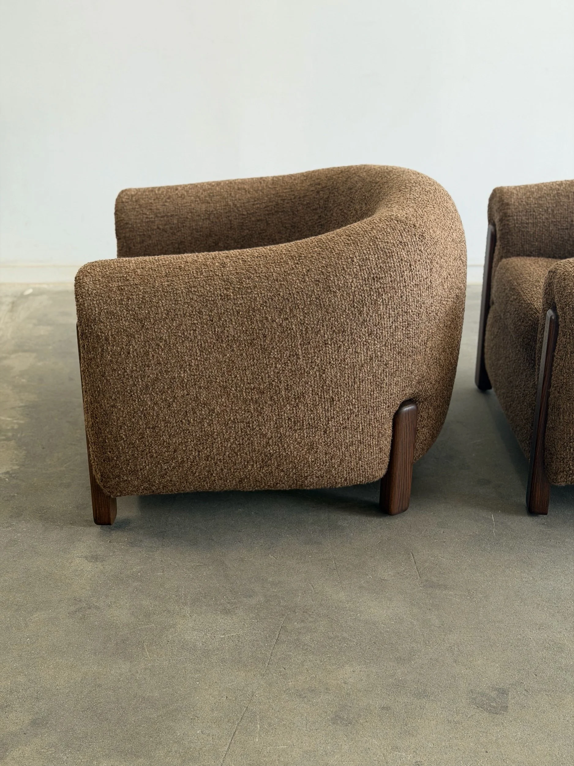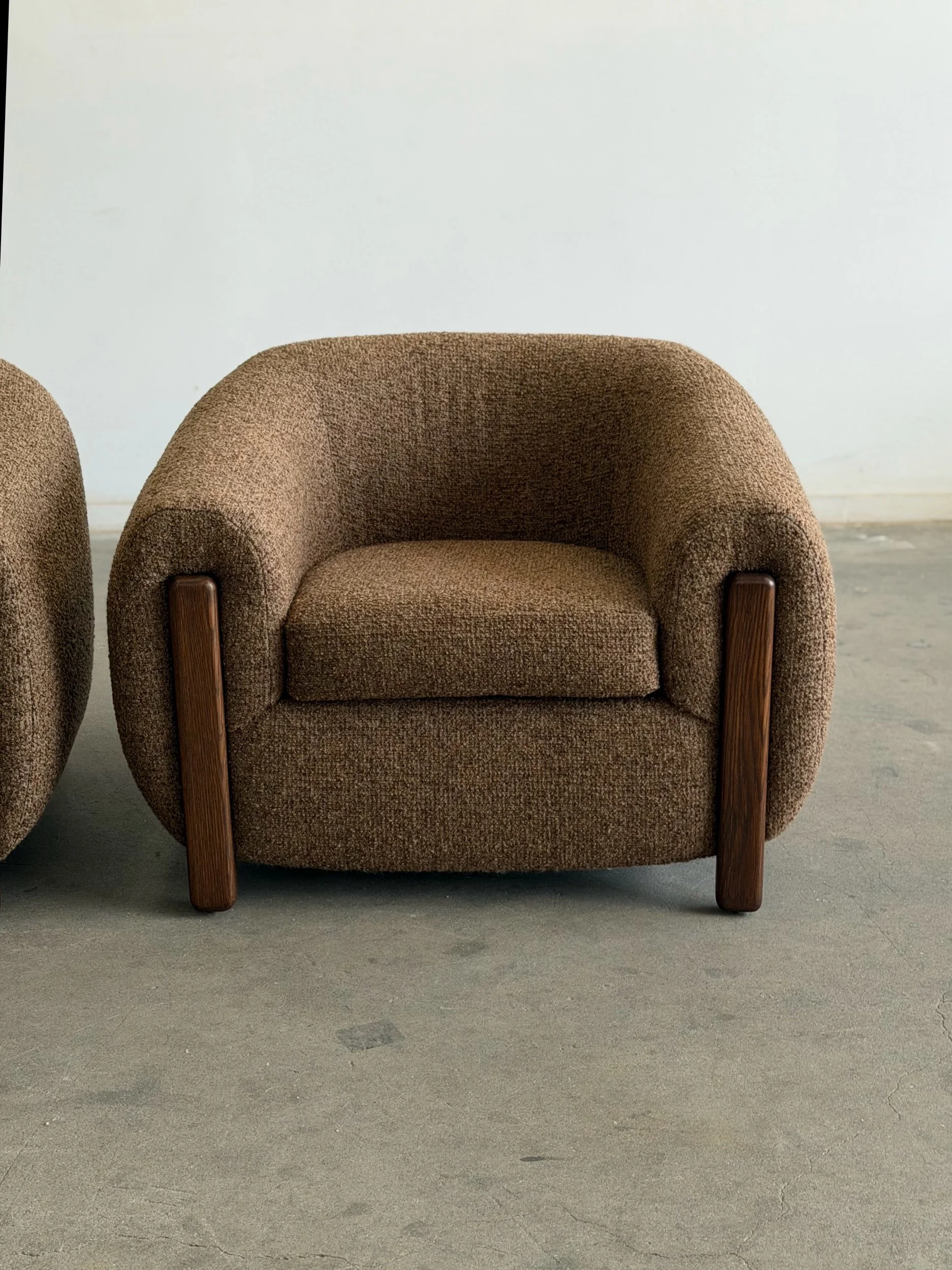 Pair of lounge Chairs custom-made for previous owners, newly restored in house and in great condition. Chairs were made to previous owners specifications . Each chair now features new fill and foam fresh straps, new nubby boucle. Solid oak legs have a medium dark walnut and both units are structurally sound and sturdy. Price is for the pair.