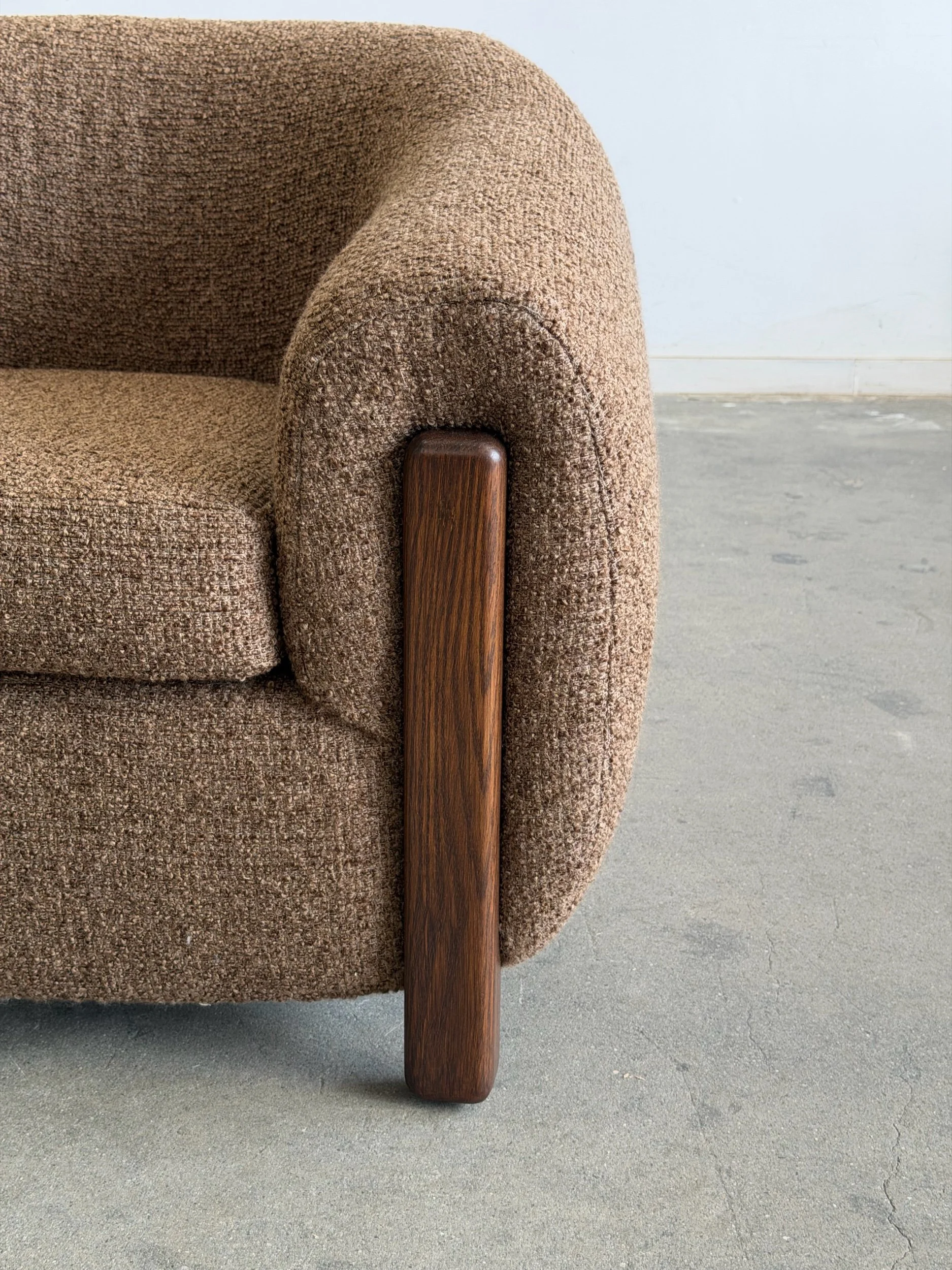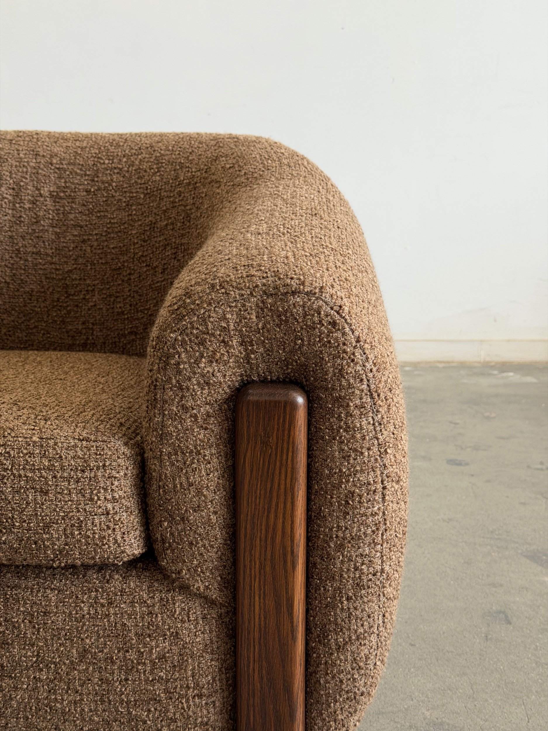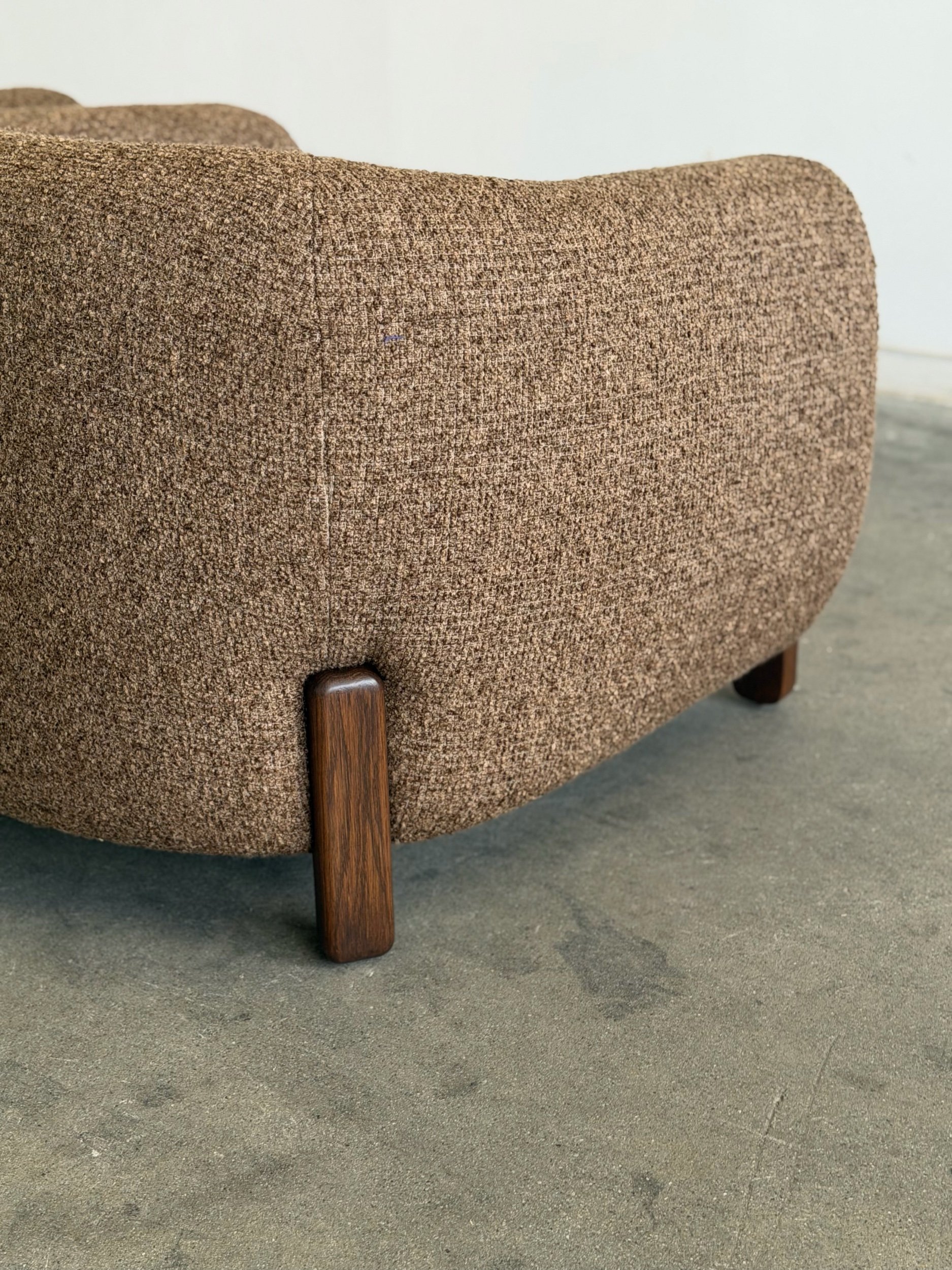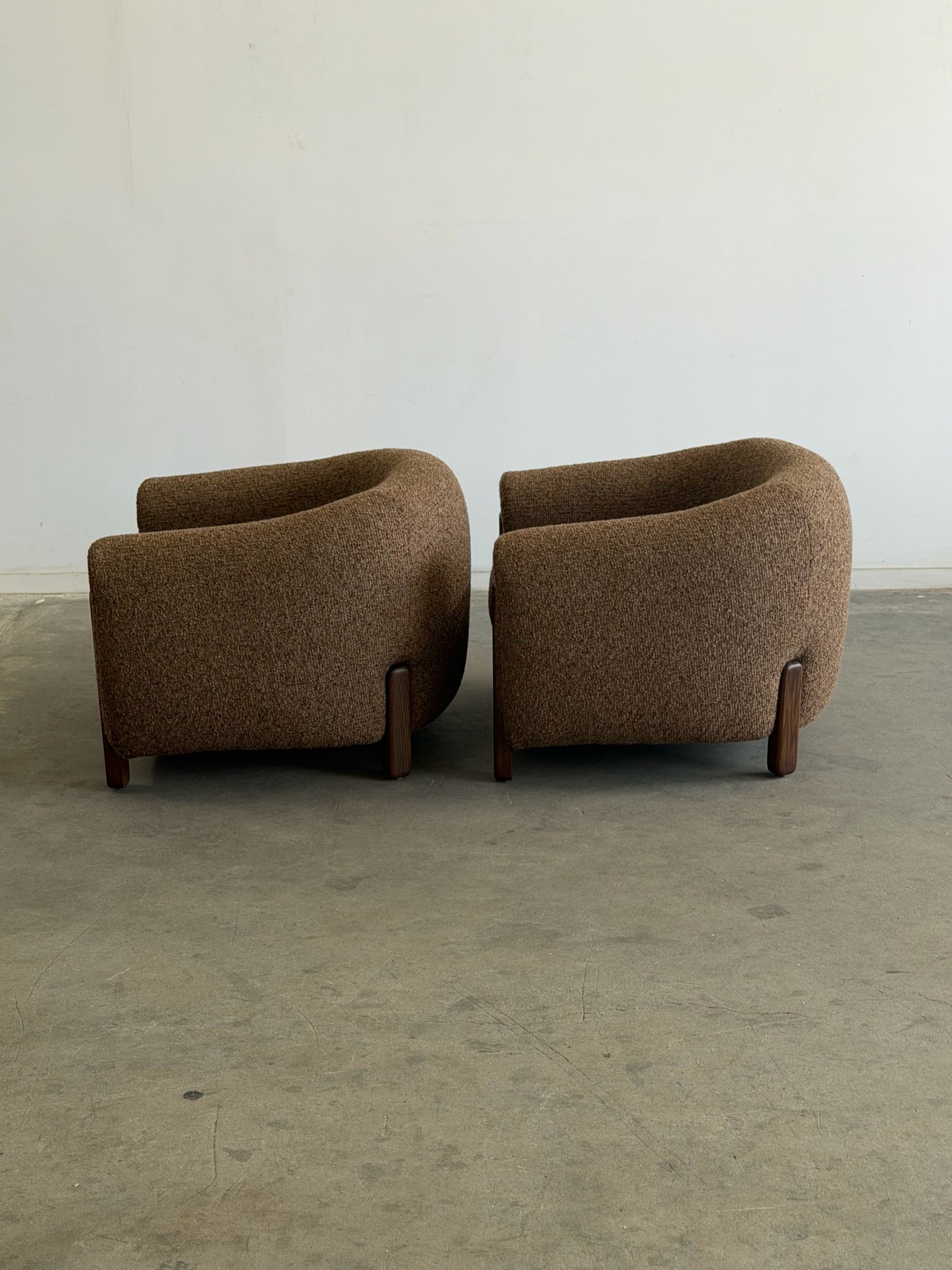 Pair of lounge Chairs custom-made for previous owners, newly restored in house and in great condition. Chairs were made to previous owners specifications . Each chair now features new fill and foam fresh straps, new nubby boucle. Solid oak legs have a medium dark walnut and both units are structurally sound and sturdy. Price is for the pair.