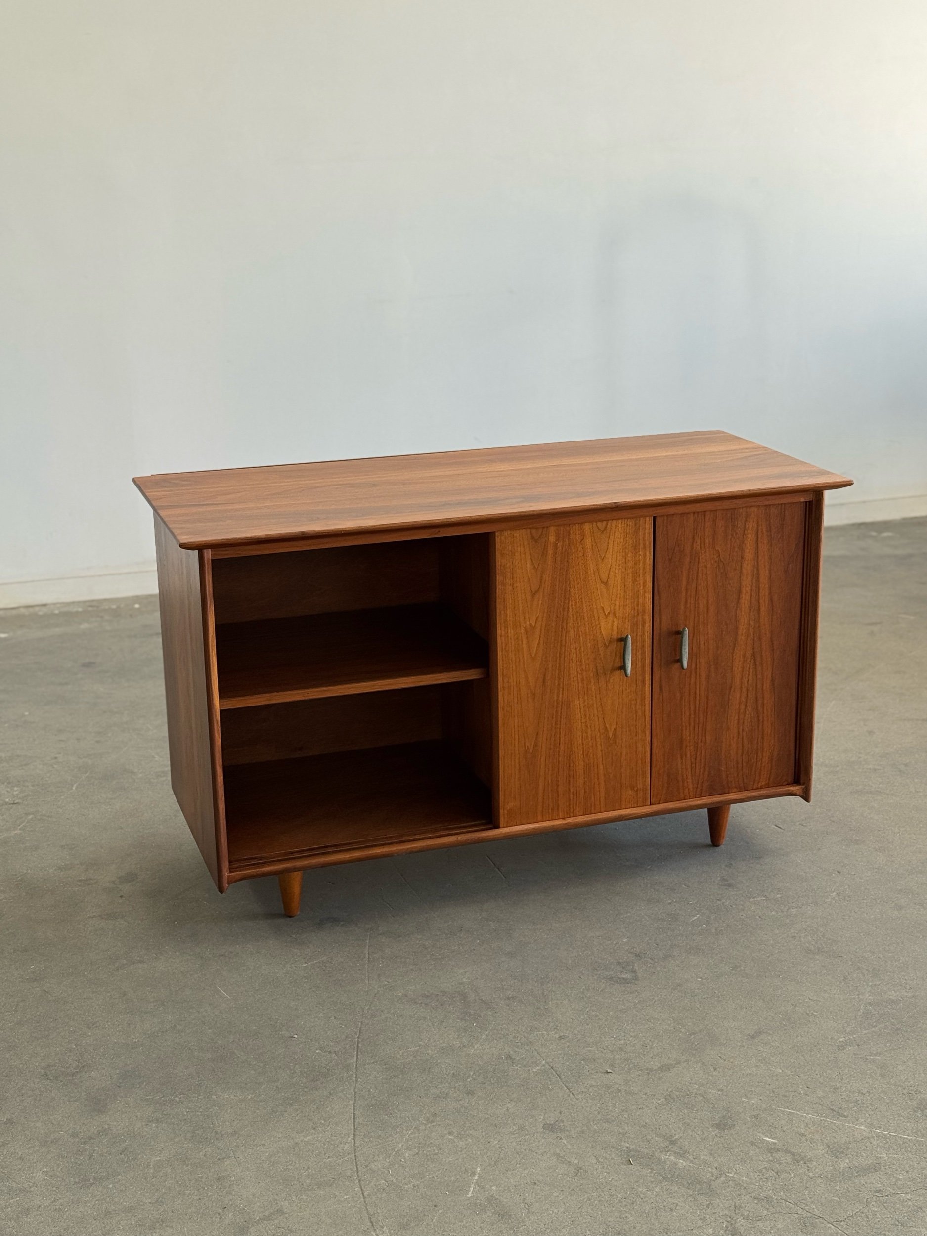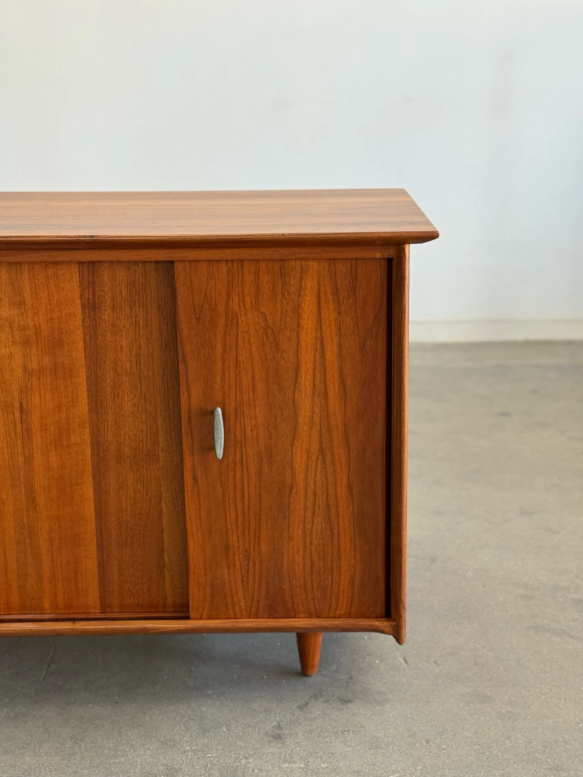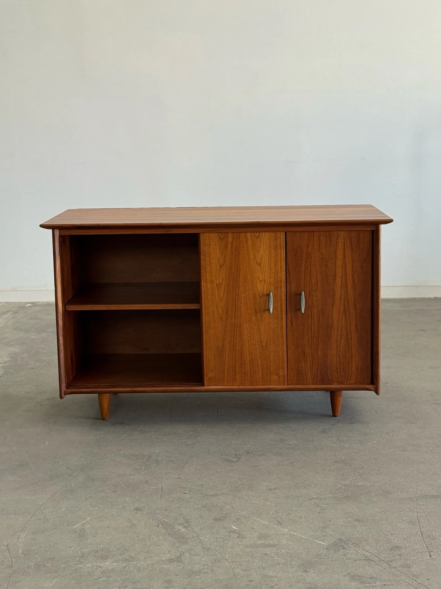 Fully restored walnut credenza in rarely seen solid walnut construction. Unit is structurally sound and fully functional with no major areas of wear. Unit has been clear coated to show natural hues and colors.