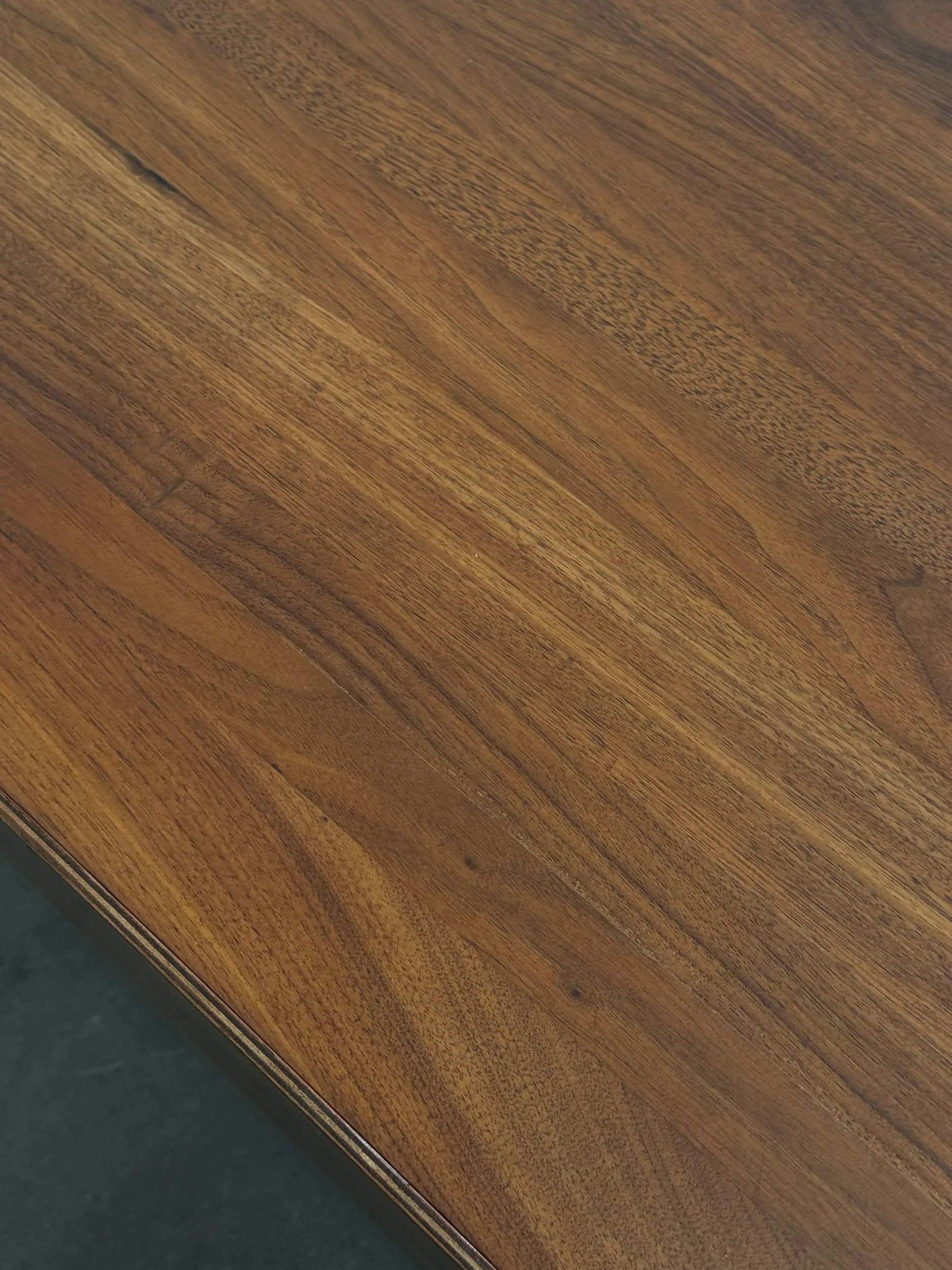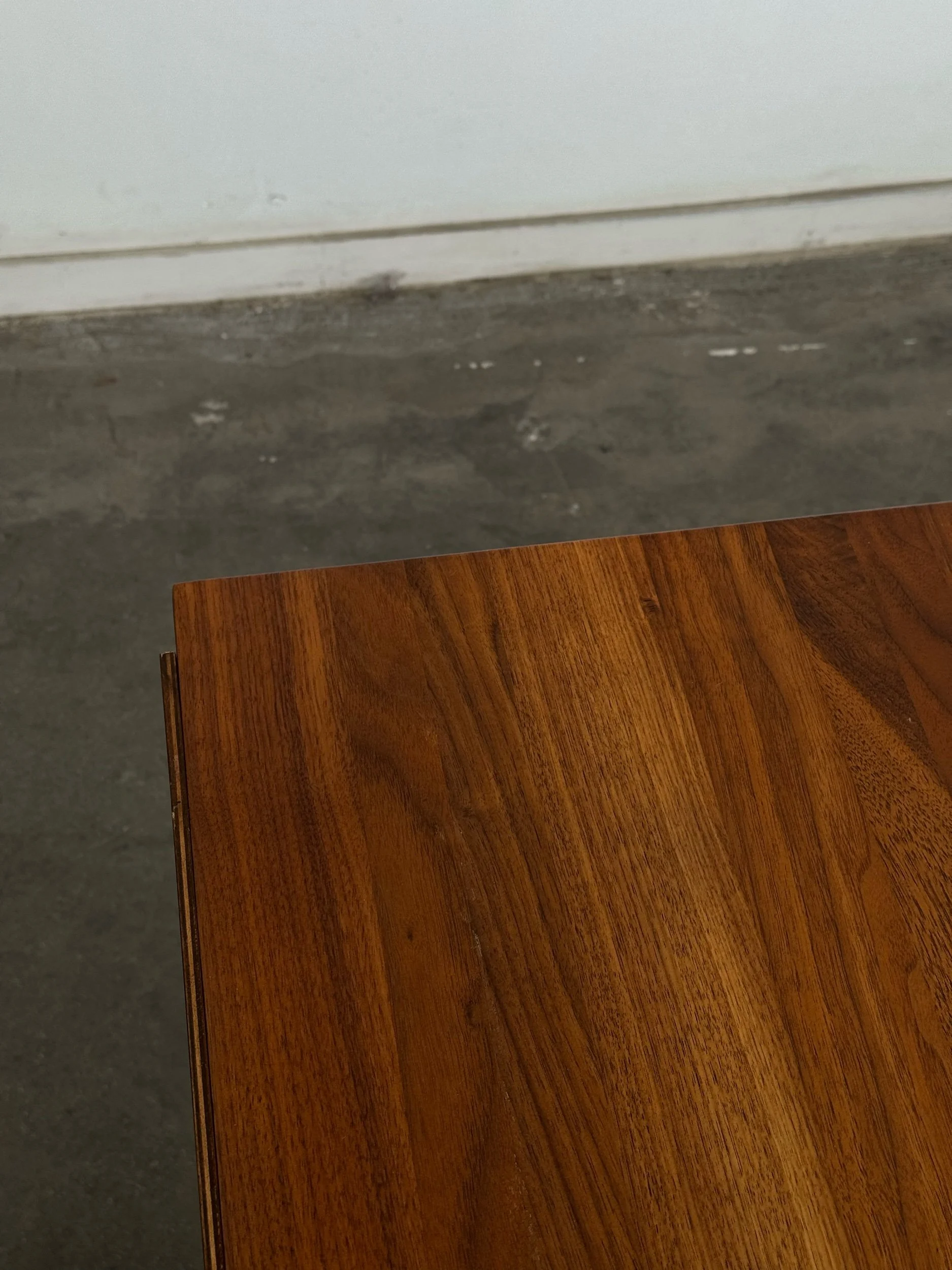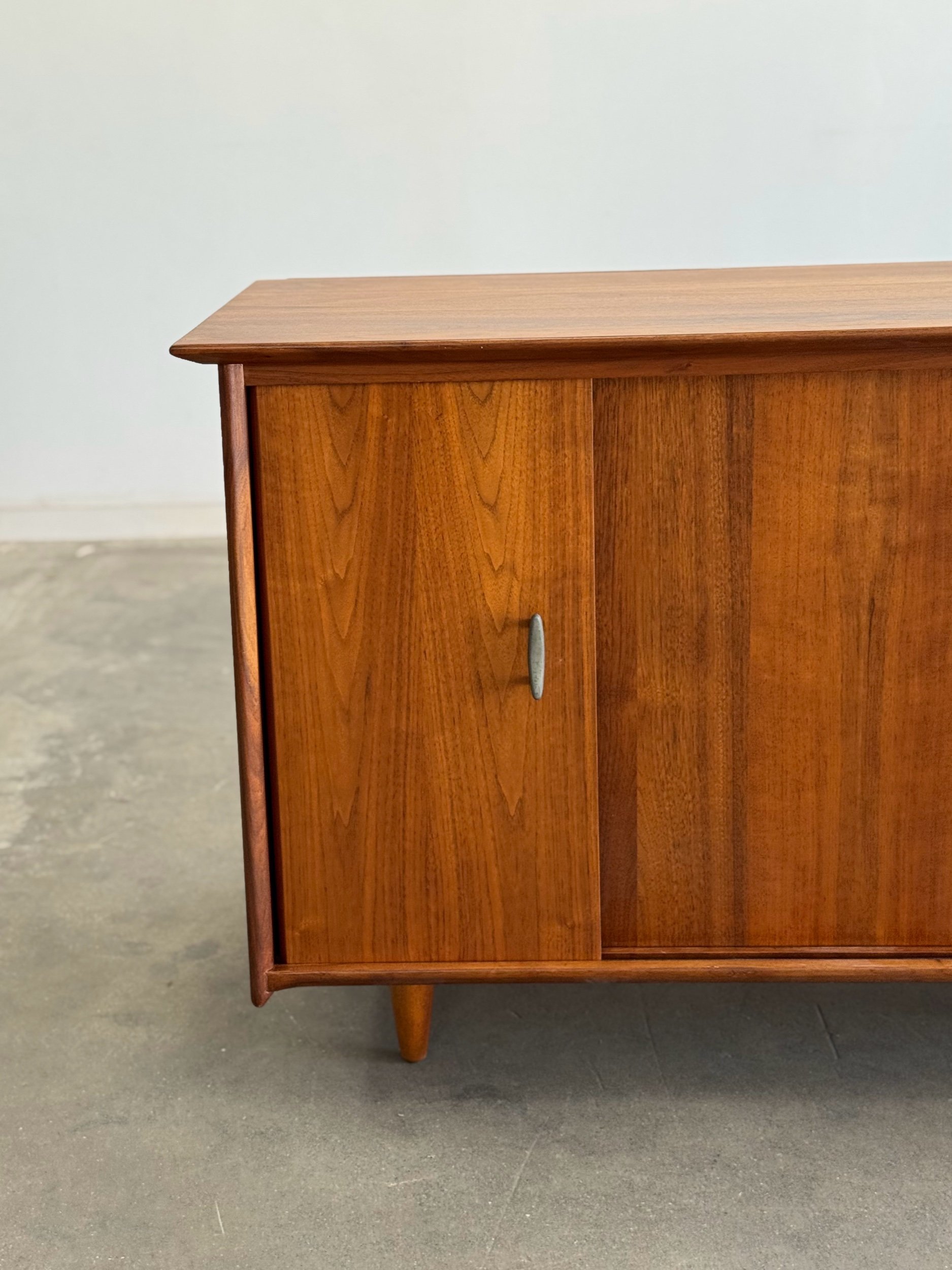 Fully restored walnut credenza in rarely seen solid walnut construction. Unit is structurally sound and fully functional with no major areas of wear. Unit has been clear coated to show natural hues and colors.
