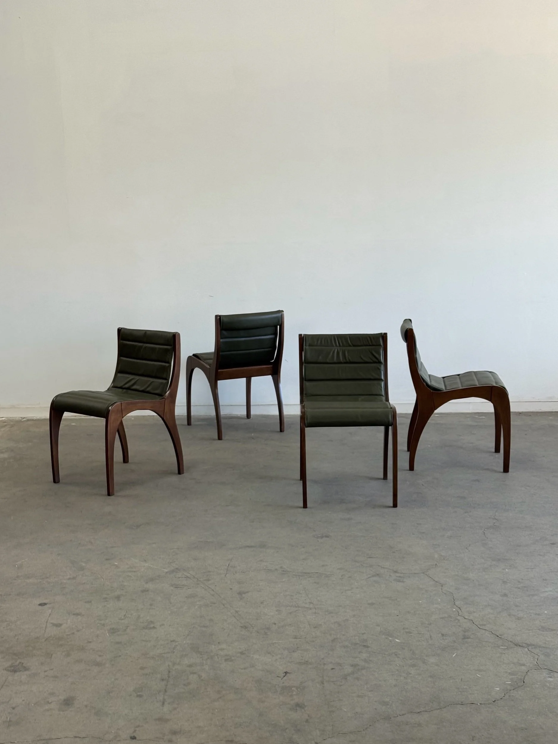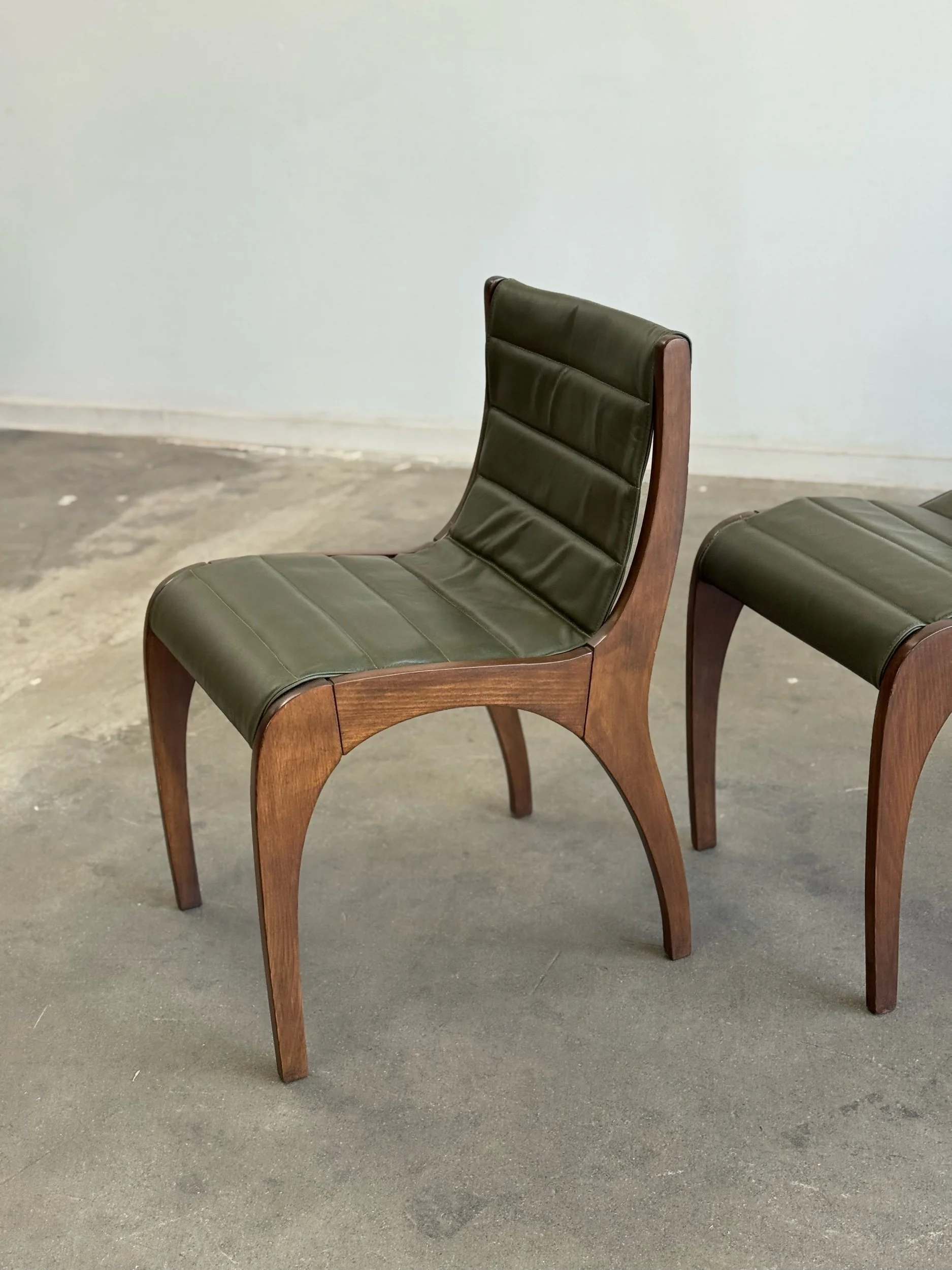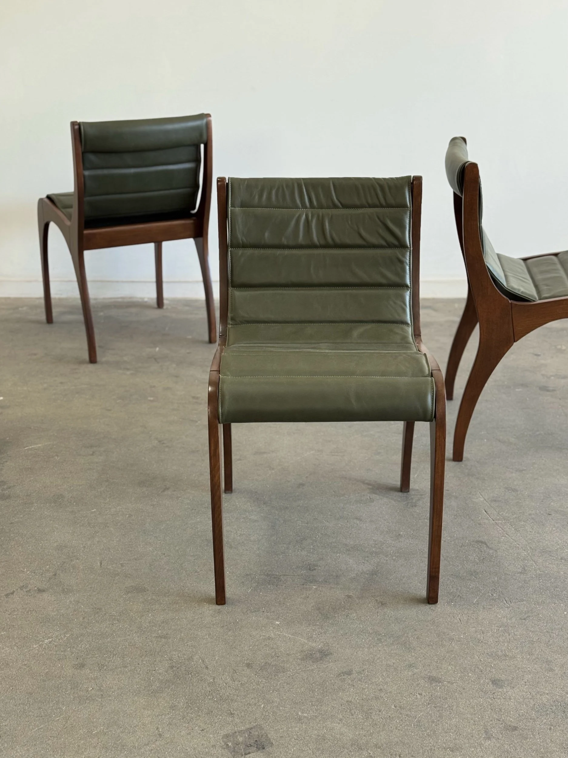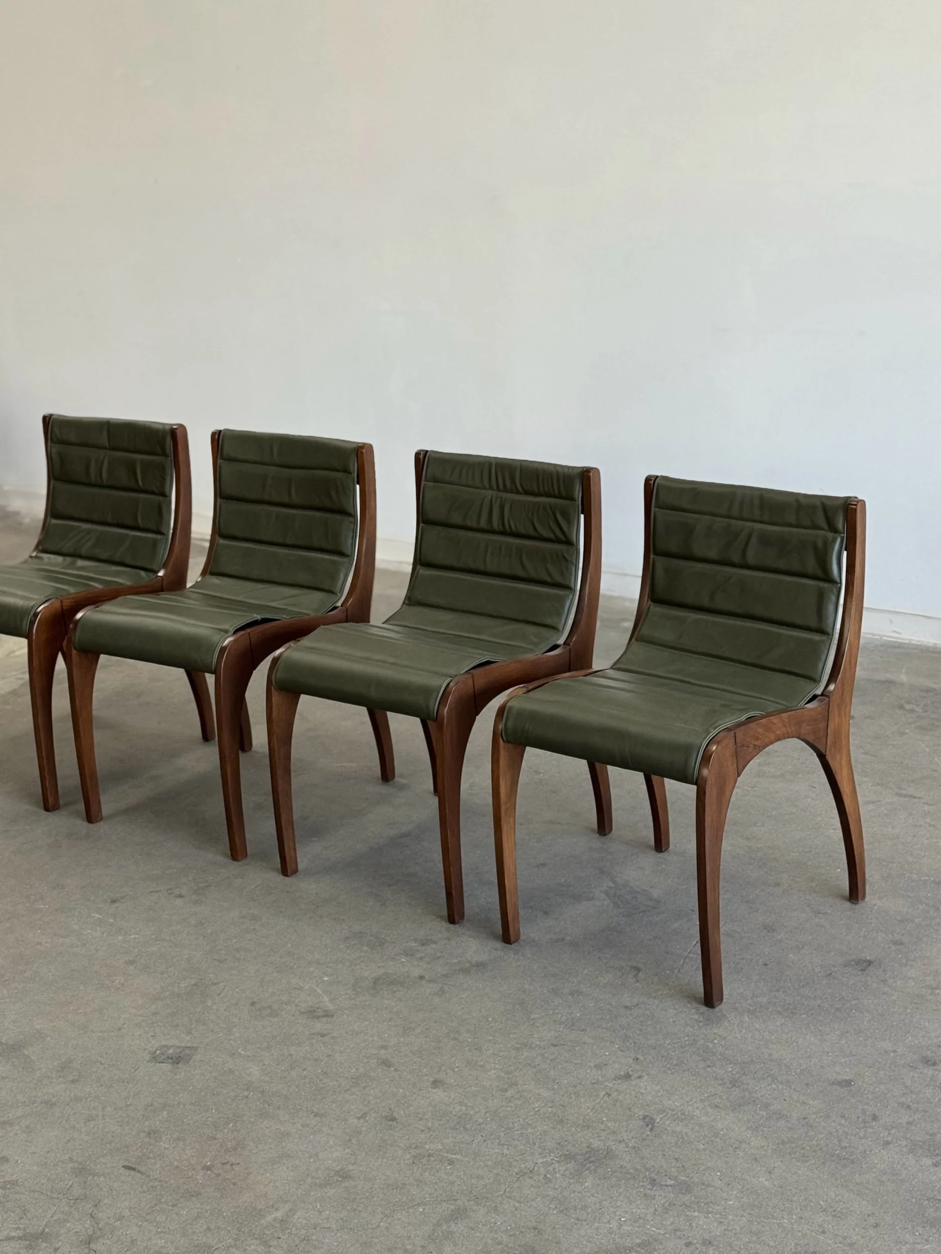 Four vintage dining chairs featuring sculptural solid wood frames and newly upholstered olive green leather seats. Each chair has been fully restored, including refinishing and new channel-stitched leather upholstery that highlights the graceful curve and craftsmanship of the design. The arched legs and contoured seat create a refined, organic silhouette reminiscent of European modernism.