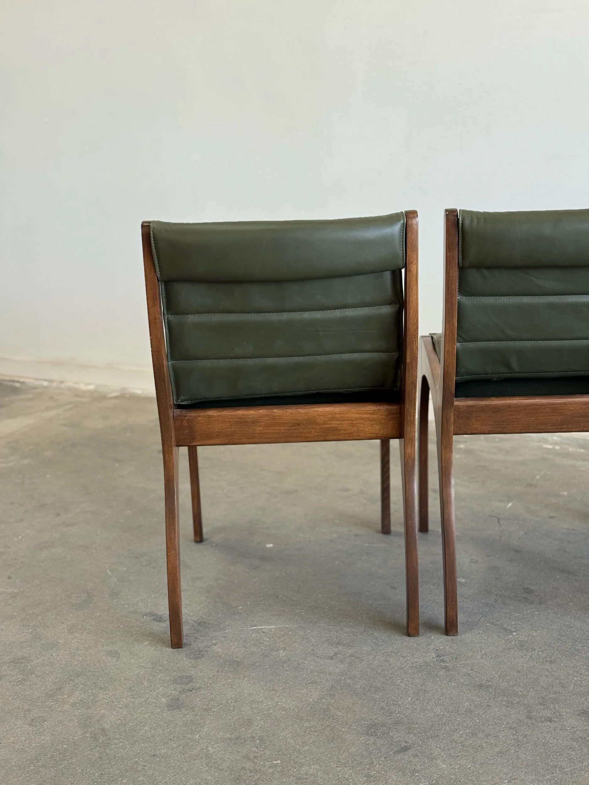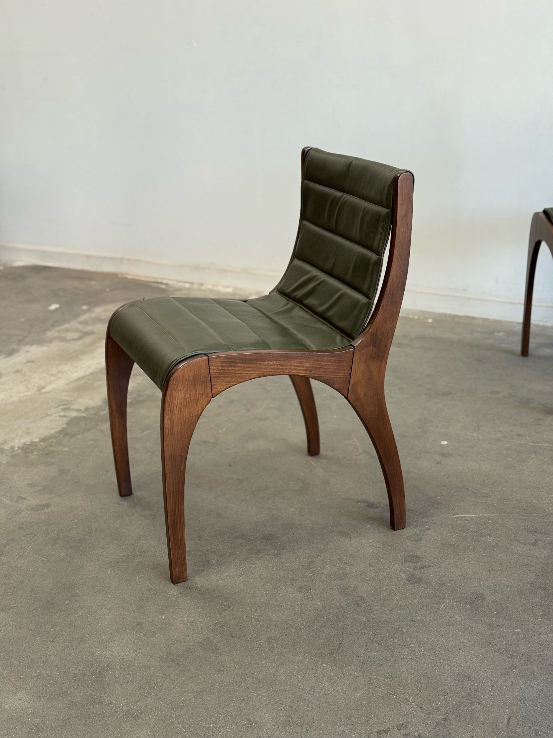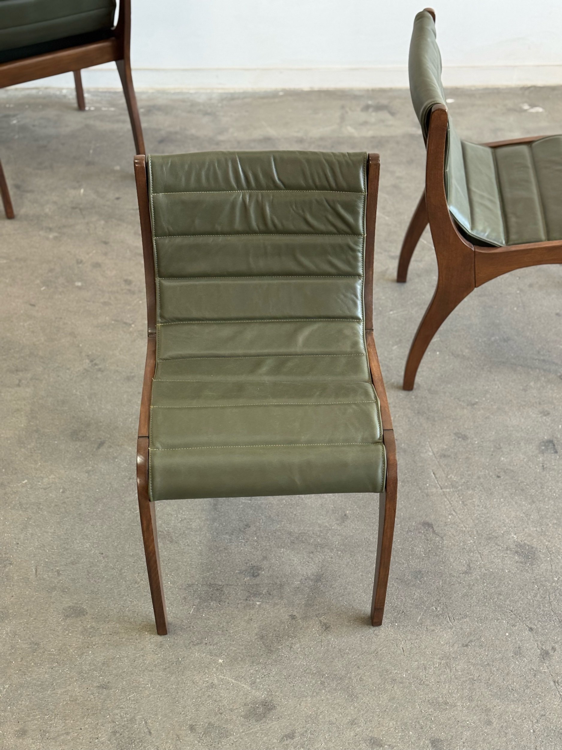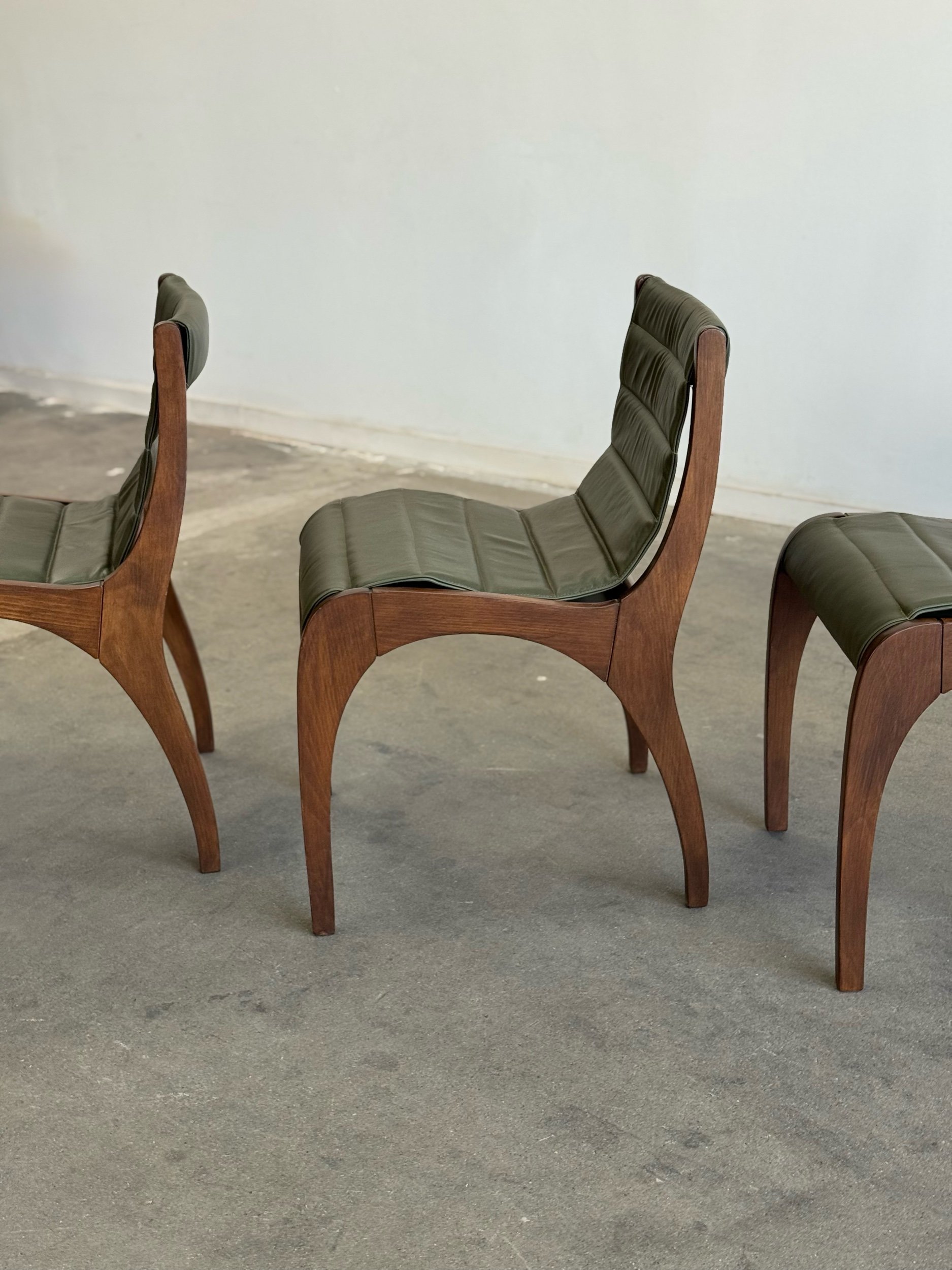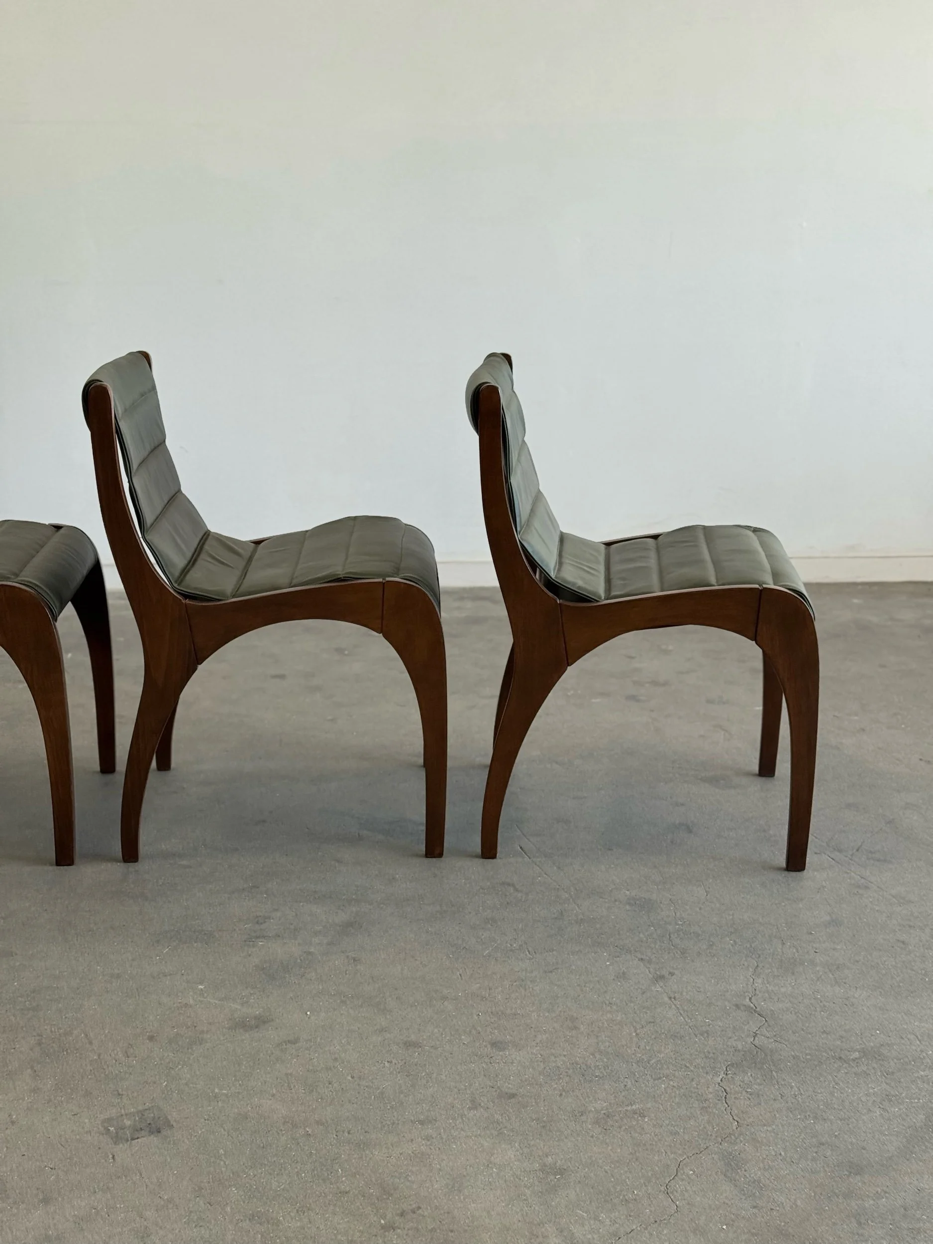 Four vintage dining chairs featuring sculptural solid wood frames and newly upholstered olive green leather seats. Each chair has been fully restored, including refinishing and new channel-stitched leather upholstery that highlights the graceful curve and craftsmanship of the design. The arched legs and contoured seat create a refined, organic silhouette reminiscent of European modernism.