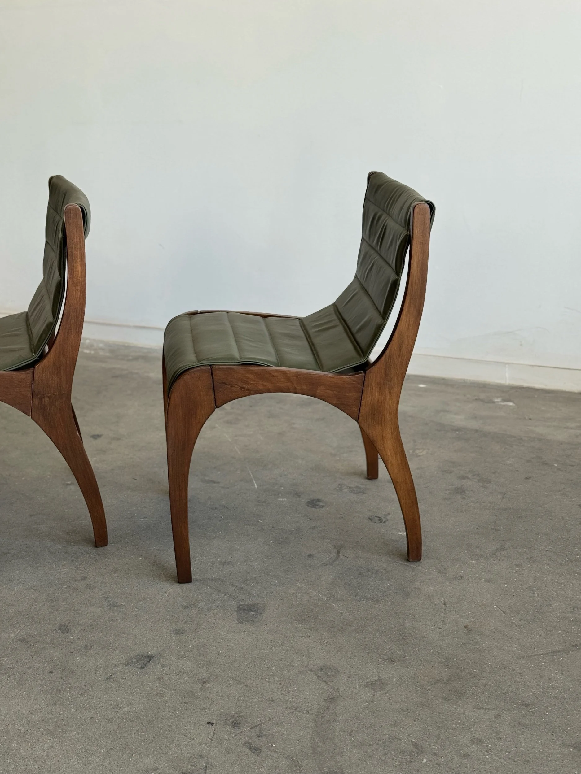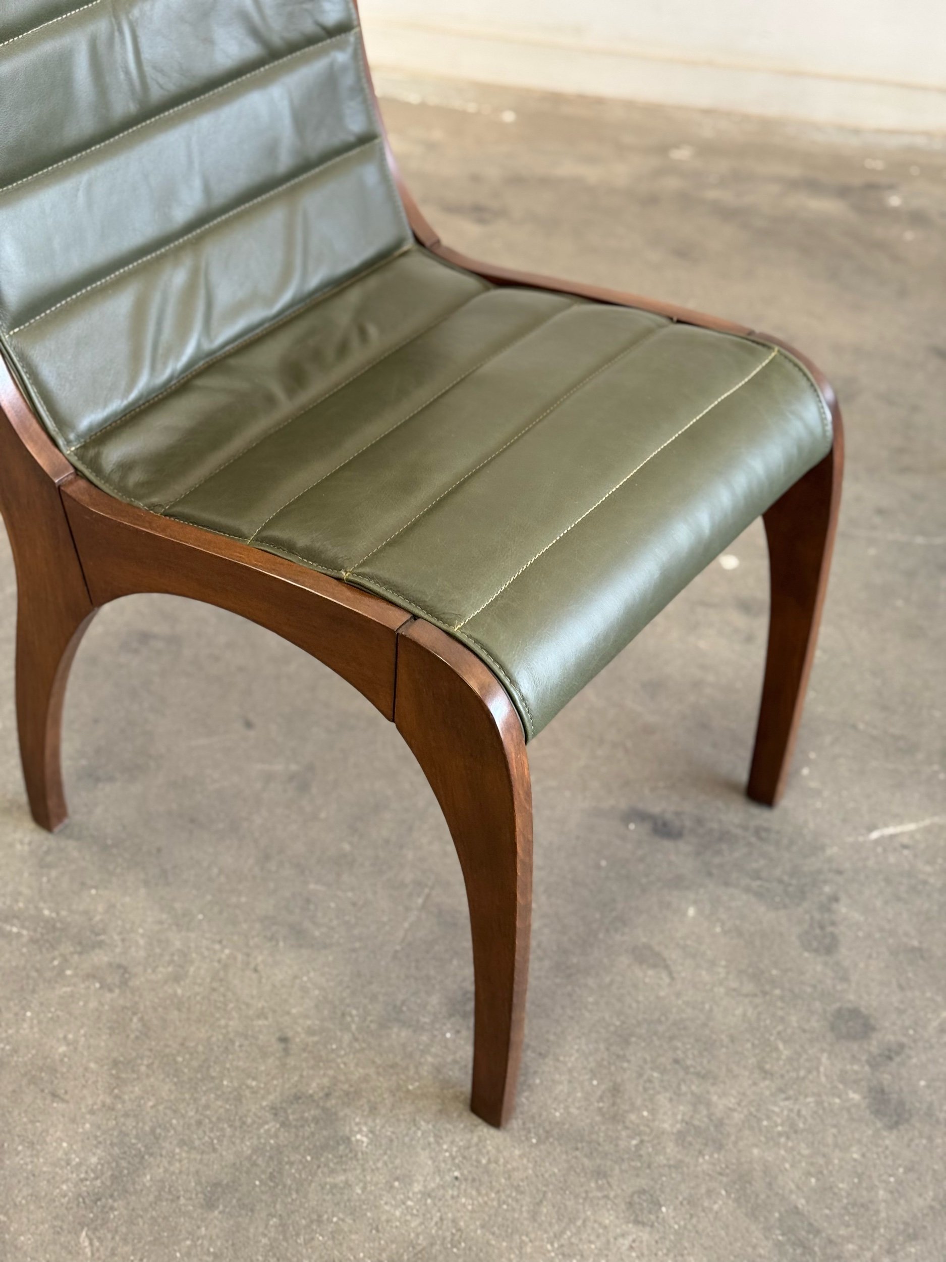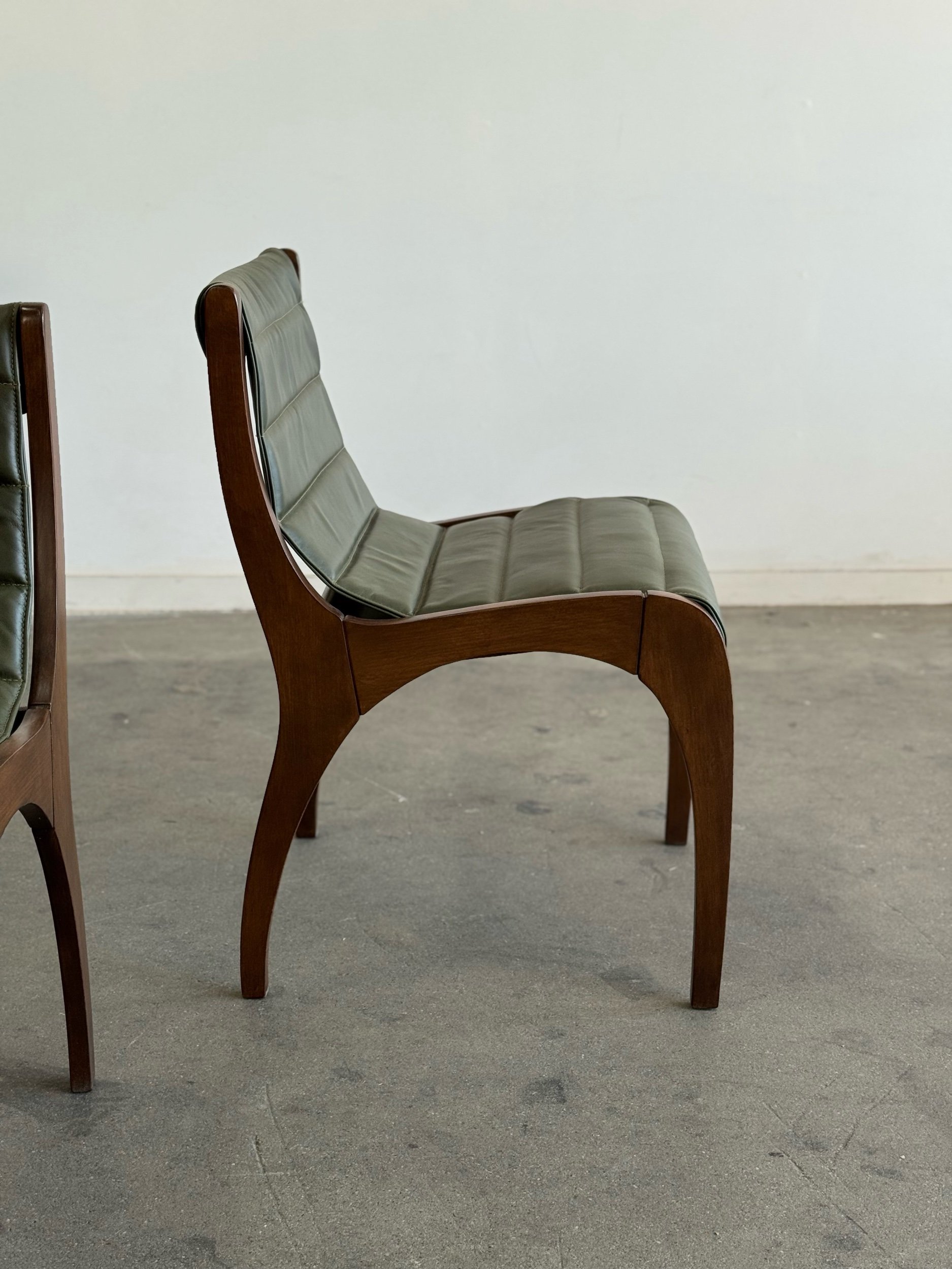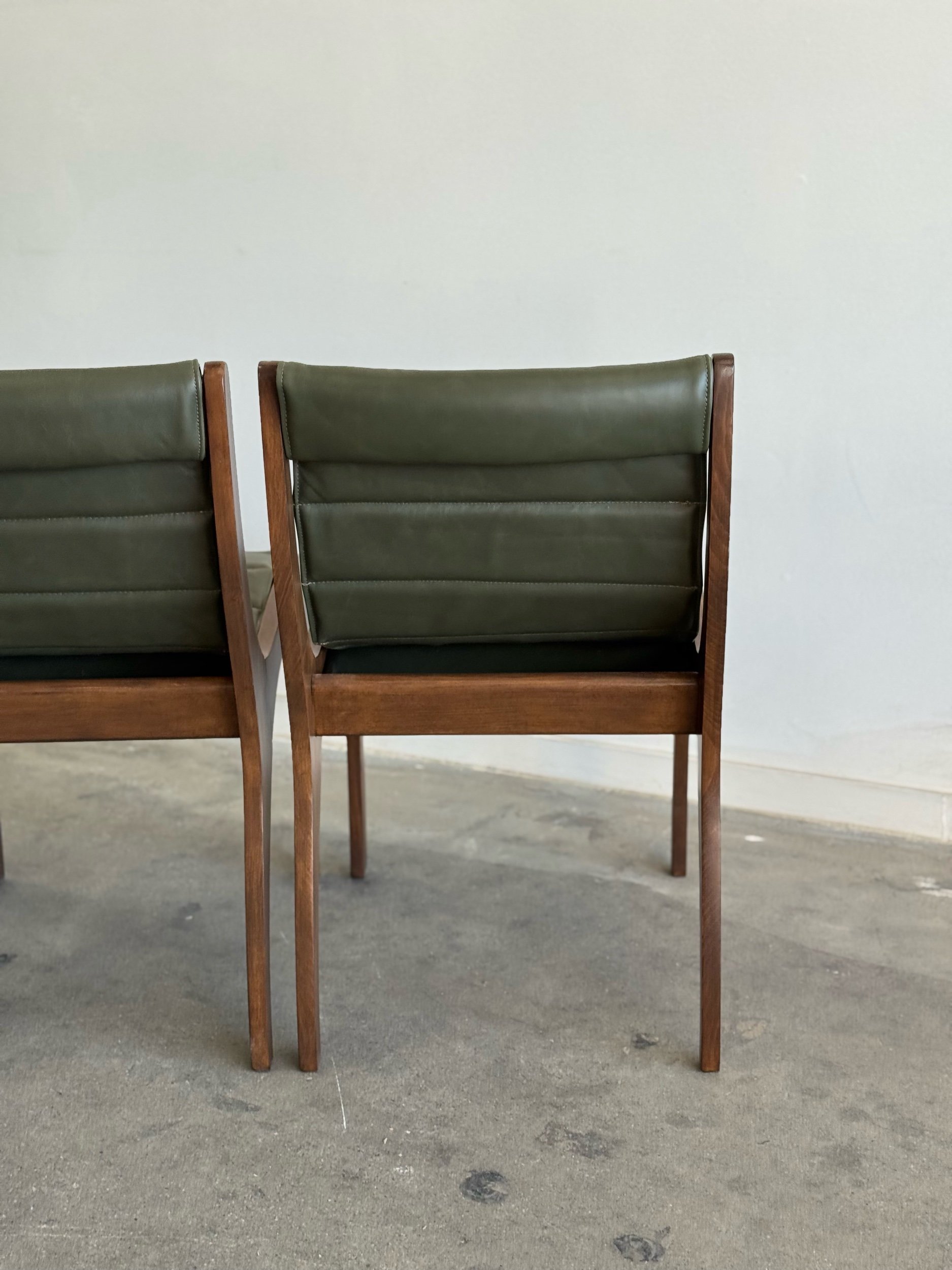 Four vintage dining chairs featuring sculptural solid wood frames and newly upholstered olive green leather seats. Each chair has been fully restored, including refinishing and new channel-stitched leather upholstery that highlights the graceful curve and craftsmanship of the design. The arched legs and contoured seat create a refined, organic silhouette reminiscent of European modernism.