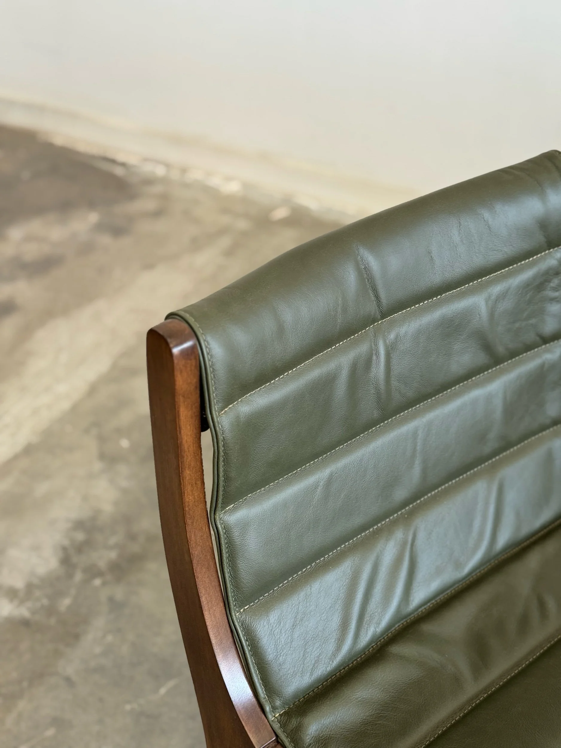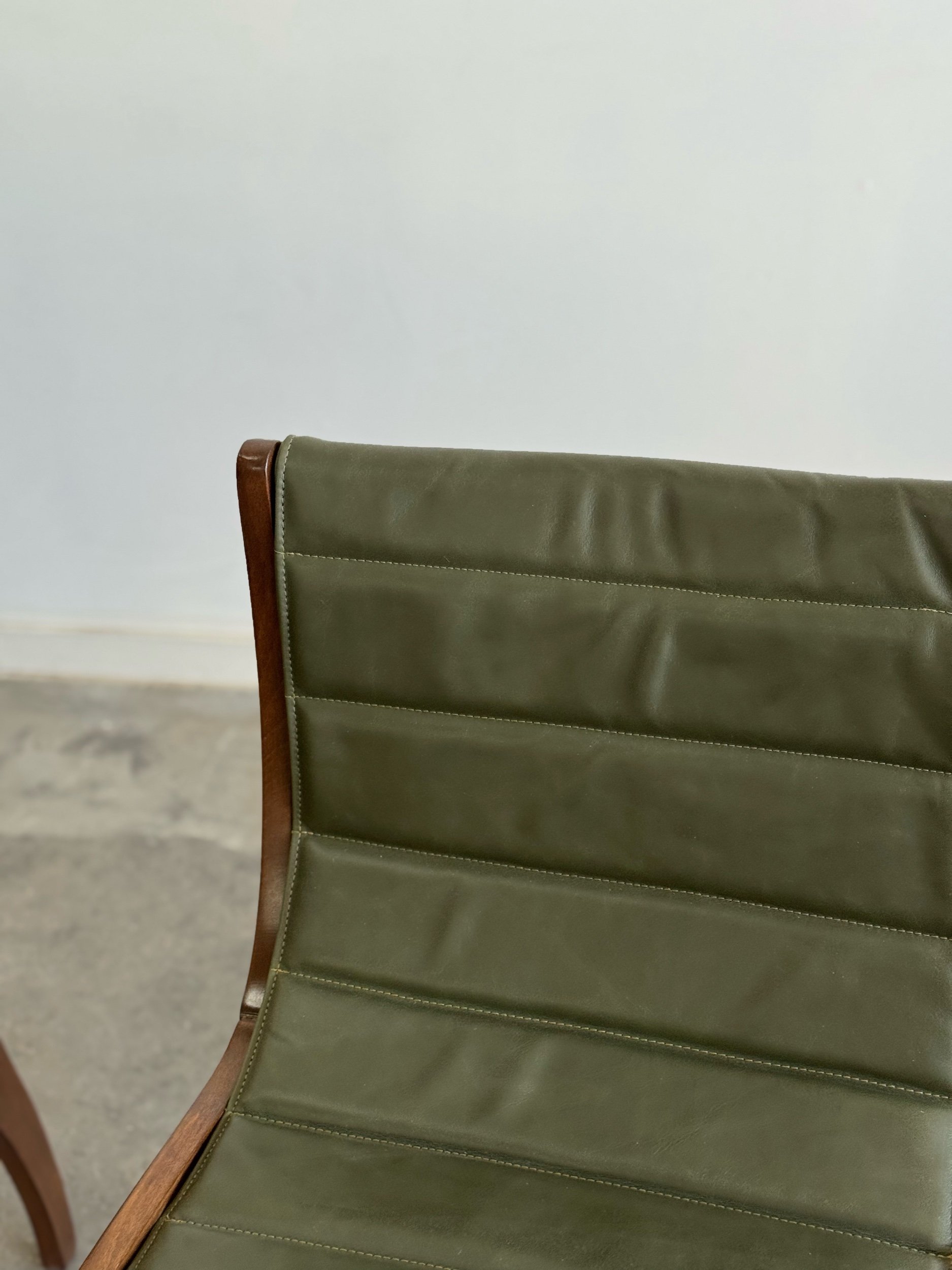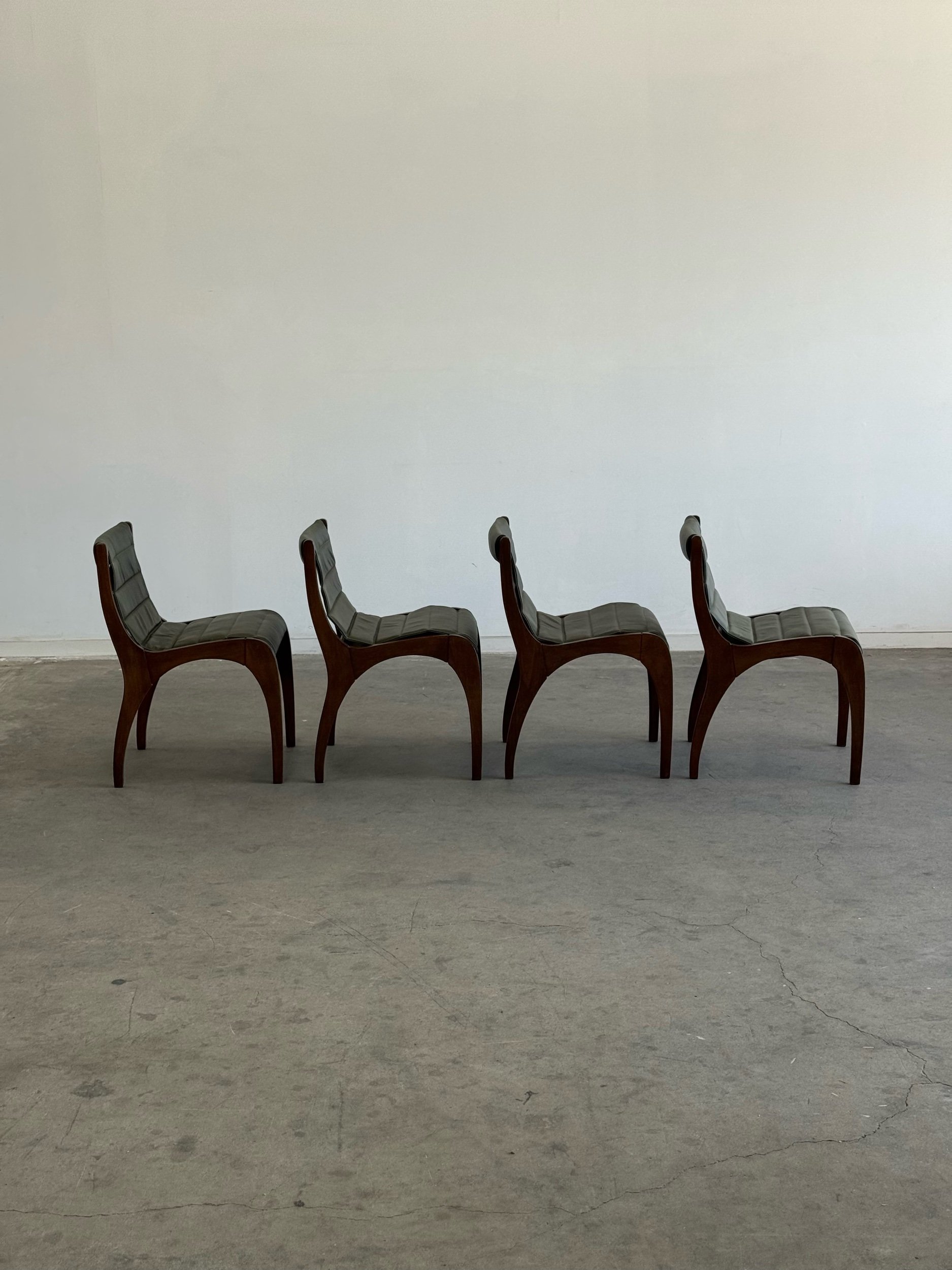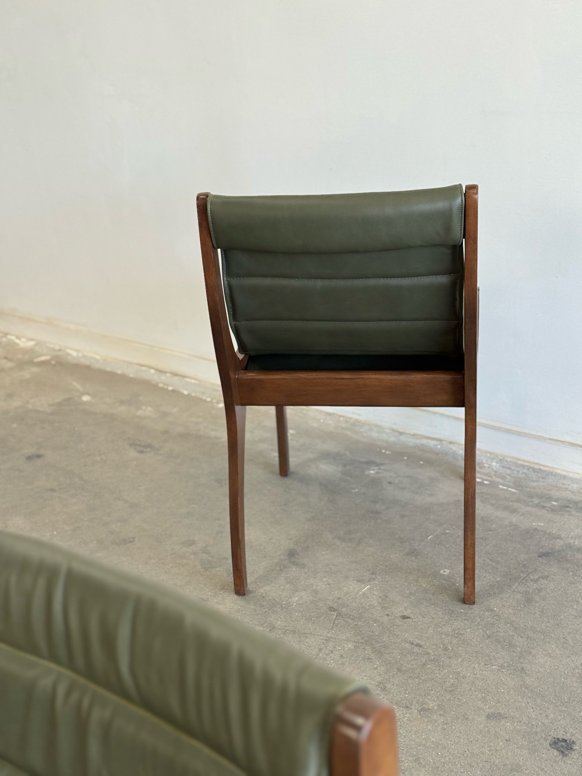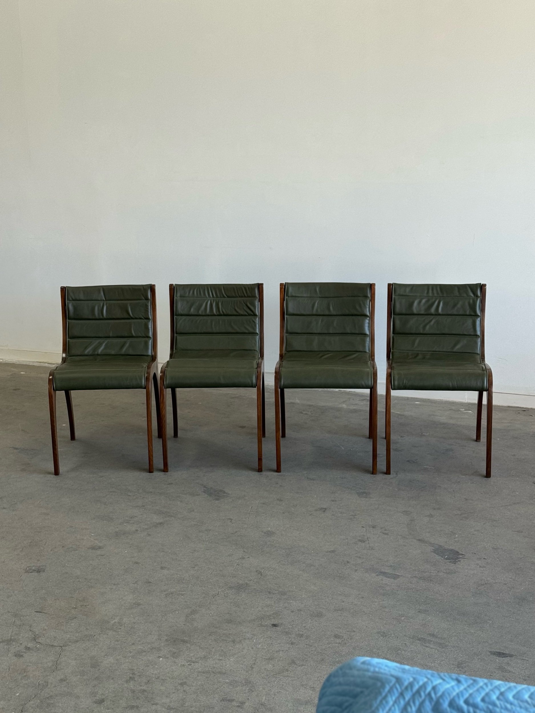 Four vintage dining chairs featuring sculptural solid wood frames and newly upholstered olive green leather seats. Each chair has been fully restored, including refinishing and new channel-stitched leather upholstery that highlights the graceful curve and craftsmanship of the design. The arched legs and contoured seat create a refined, organic silhouette reminiscent of European modernism.