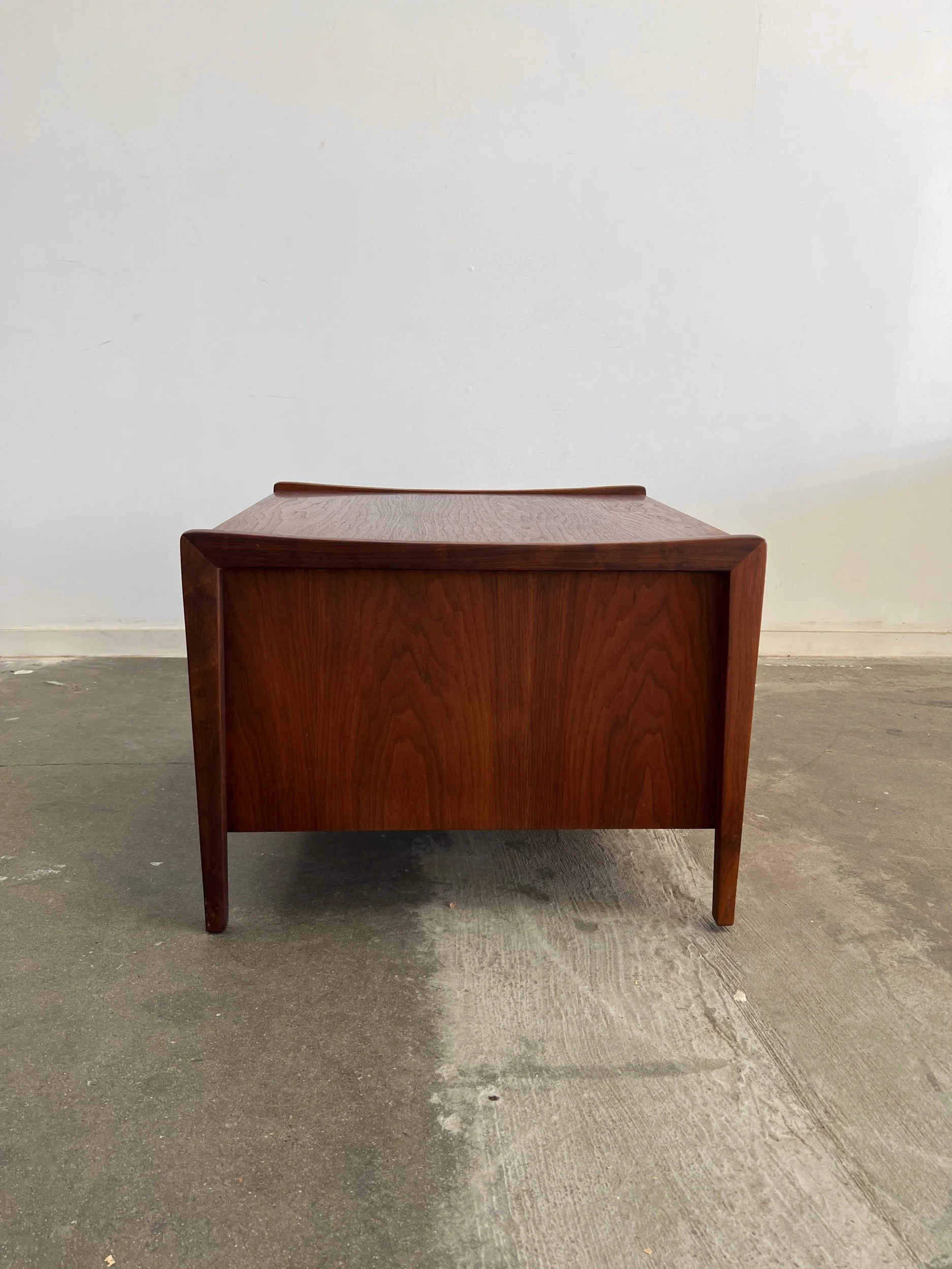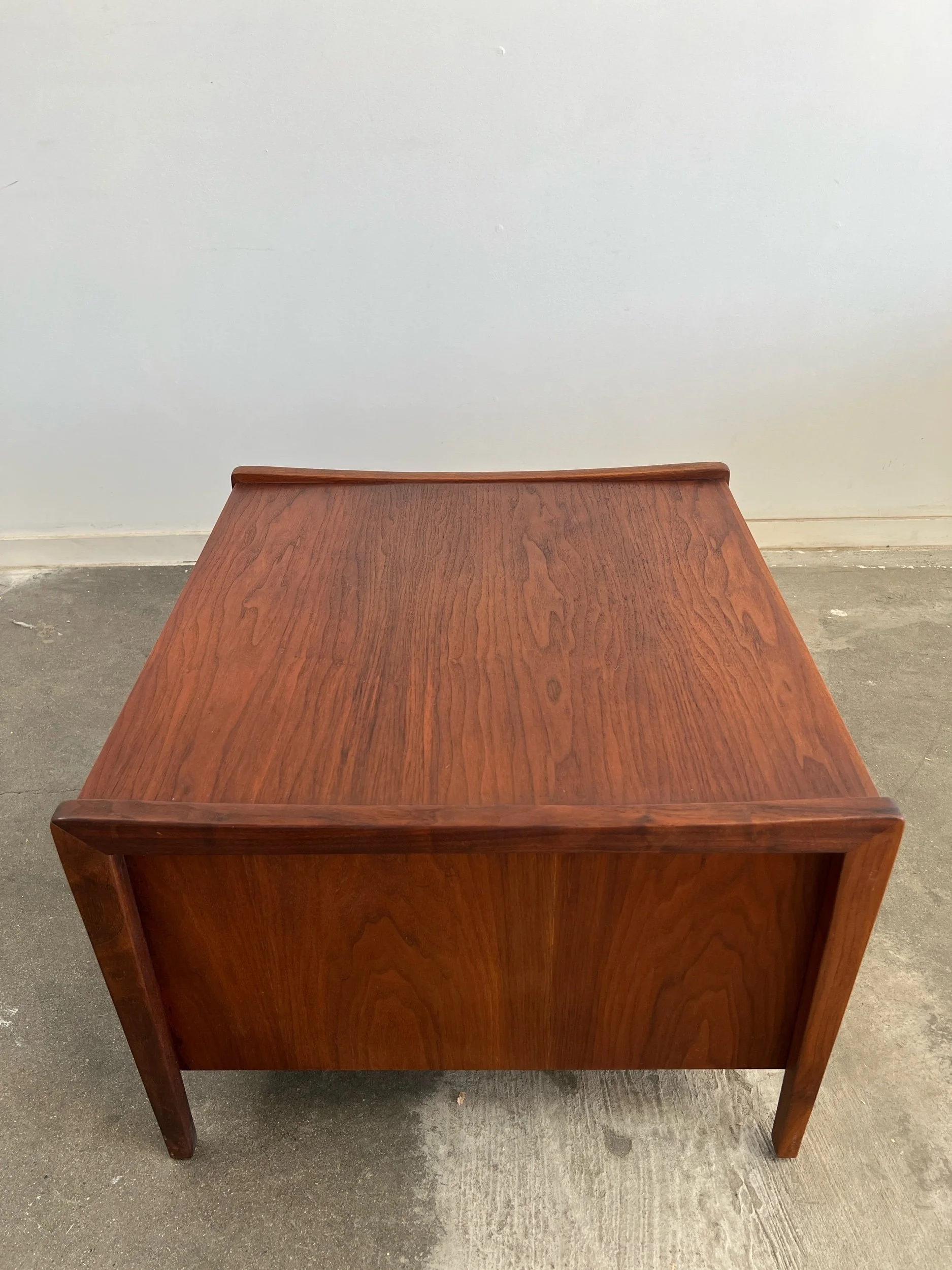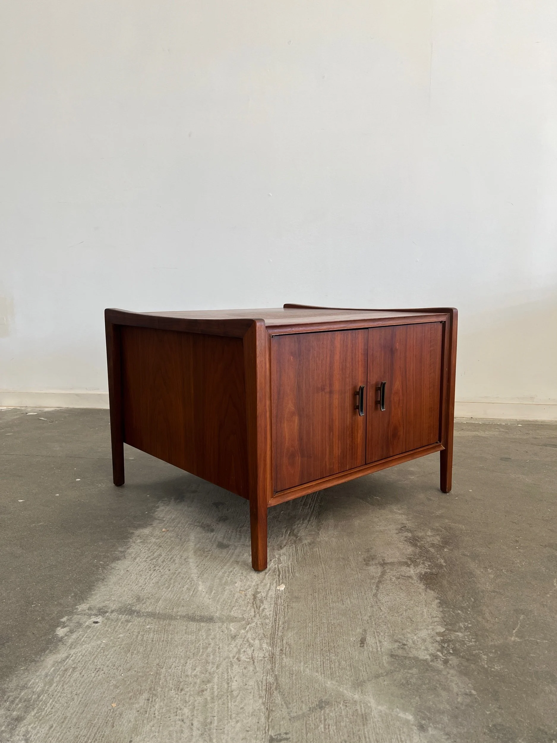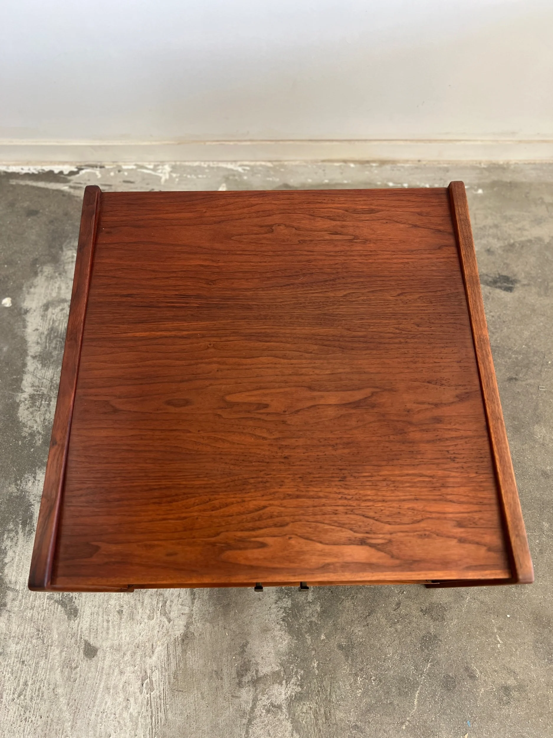 Large side table in great vintage condition. Item features angular solid walnut legs built into the frame. Table shows well in original condition , unit is structurally sound and fully functional.