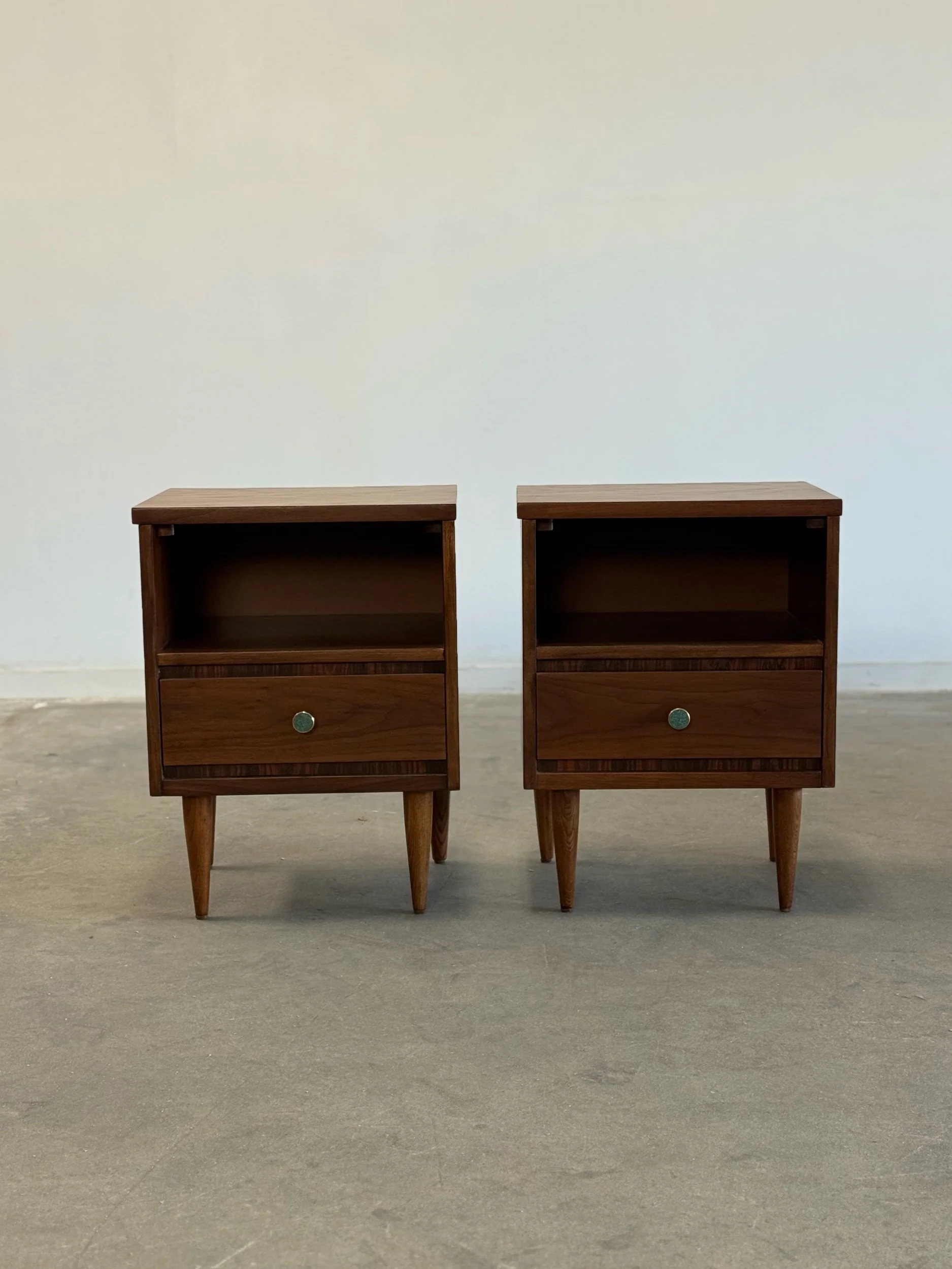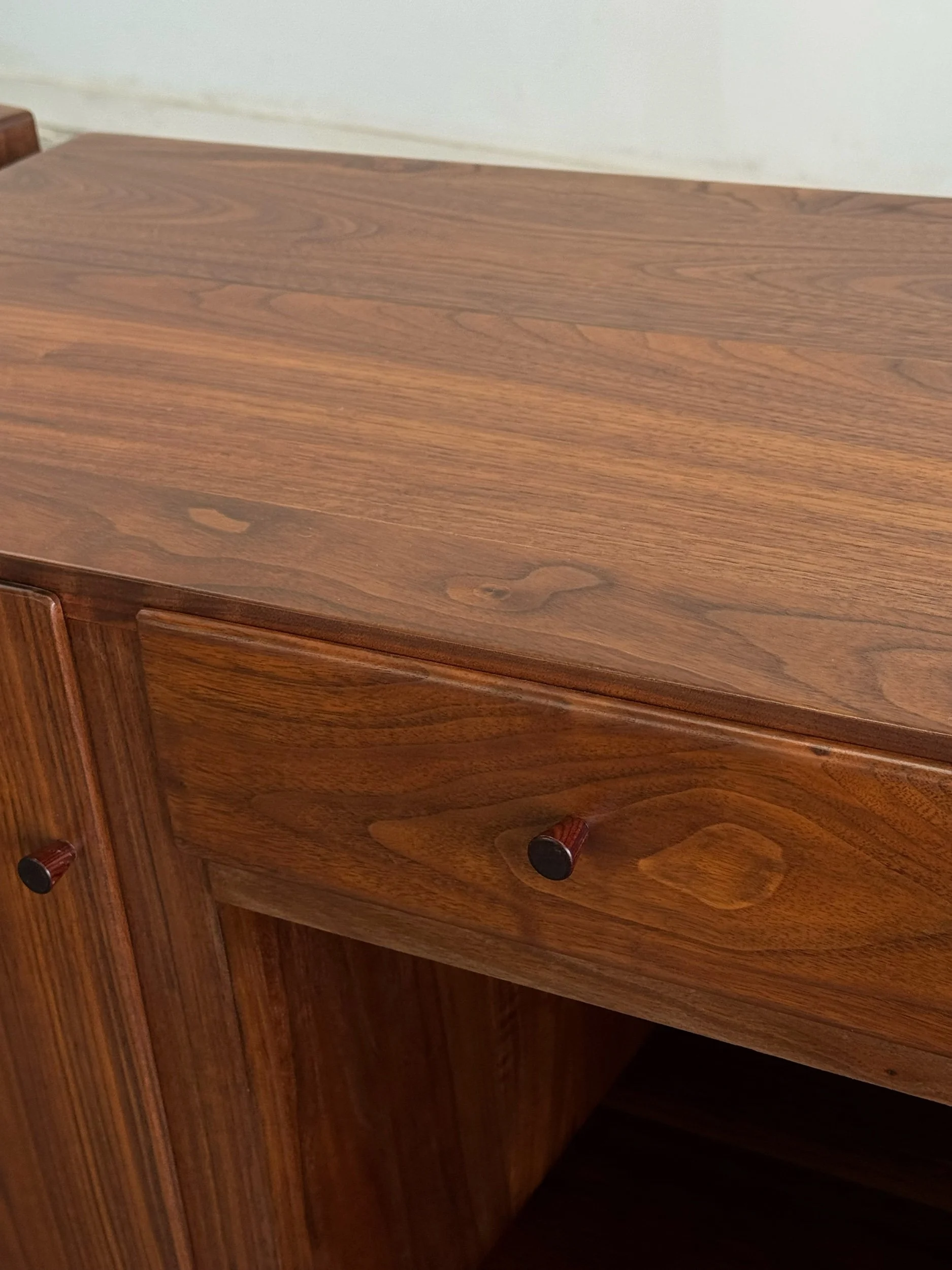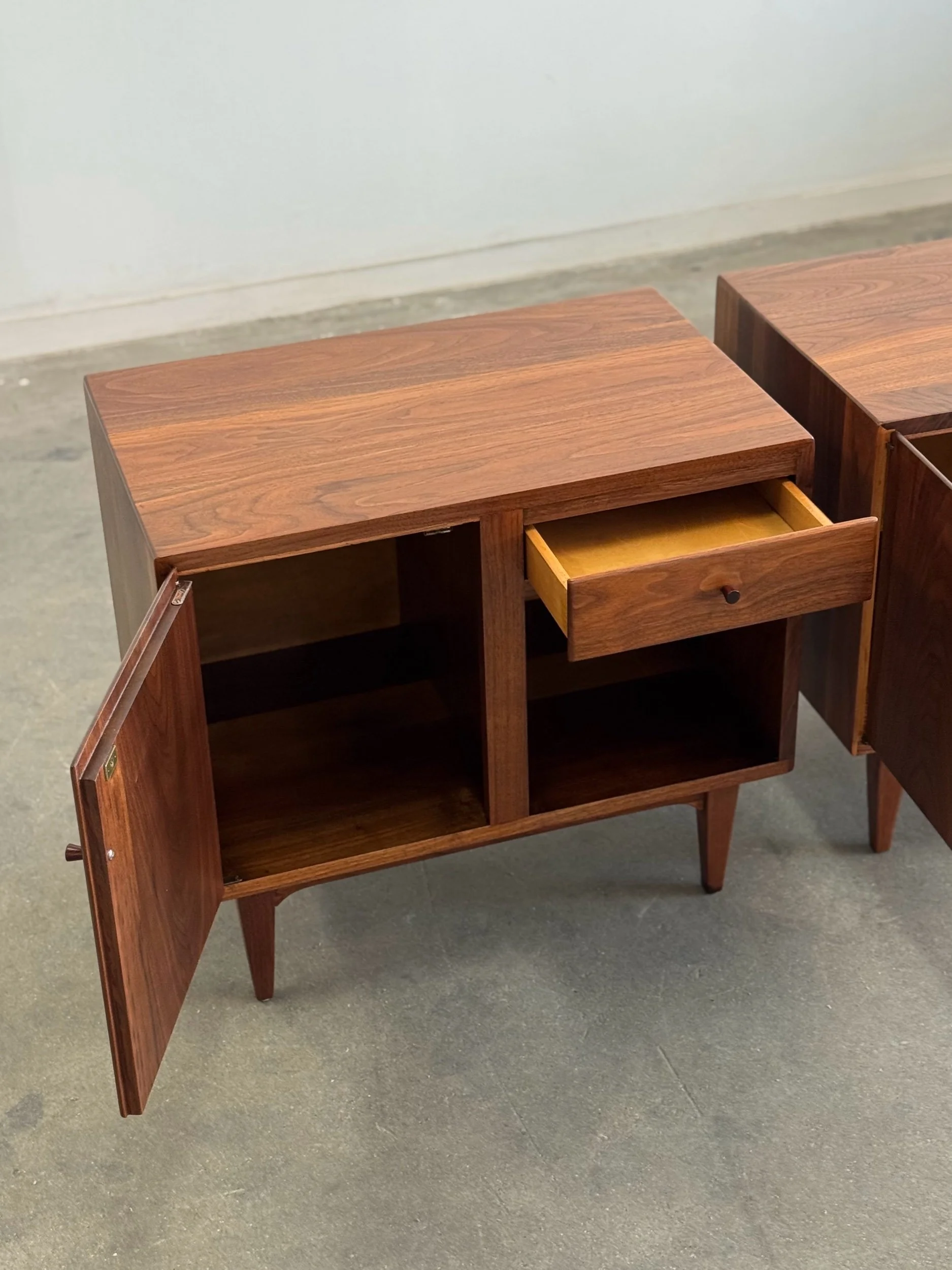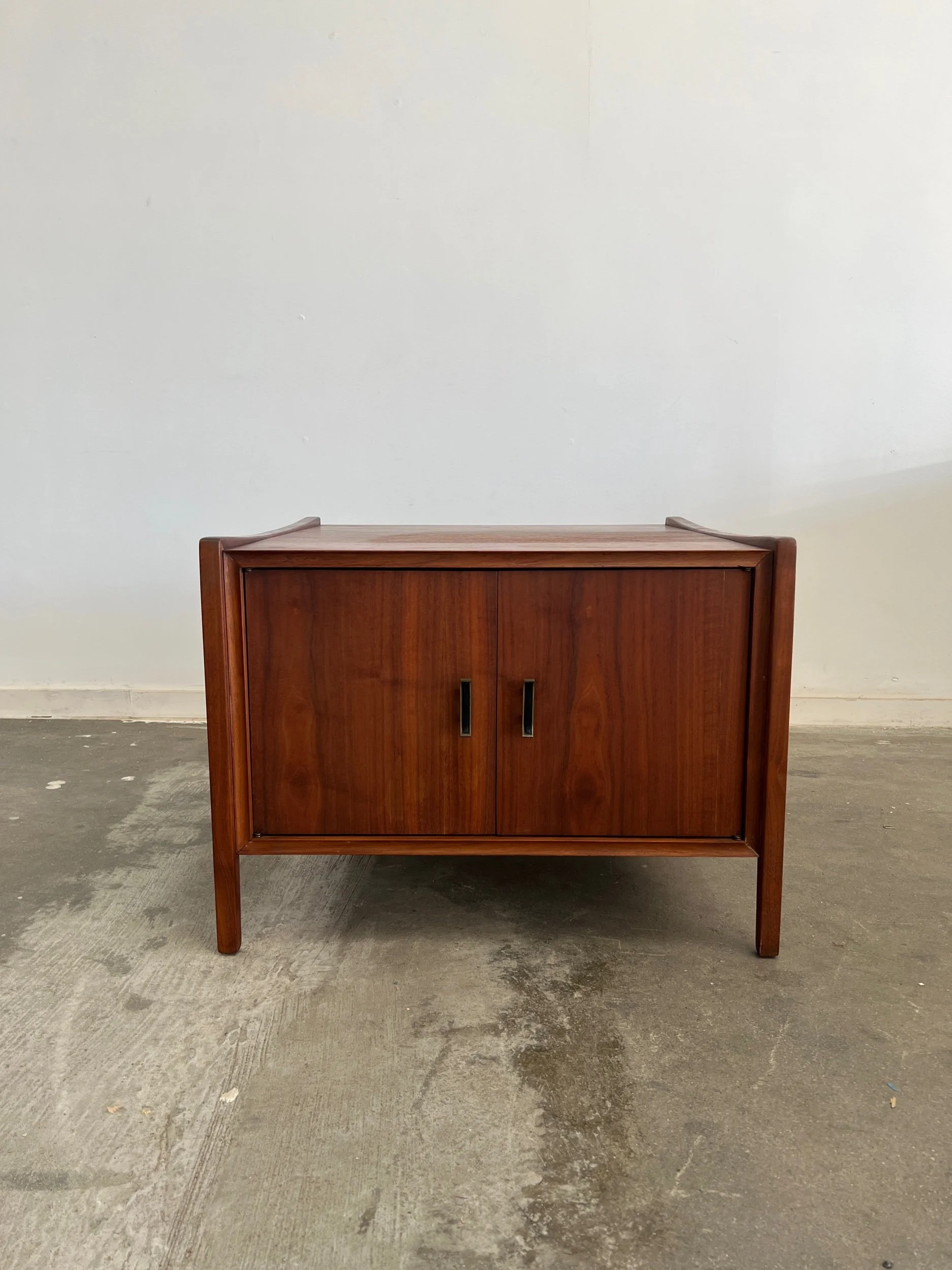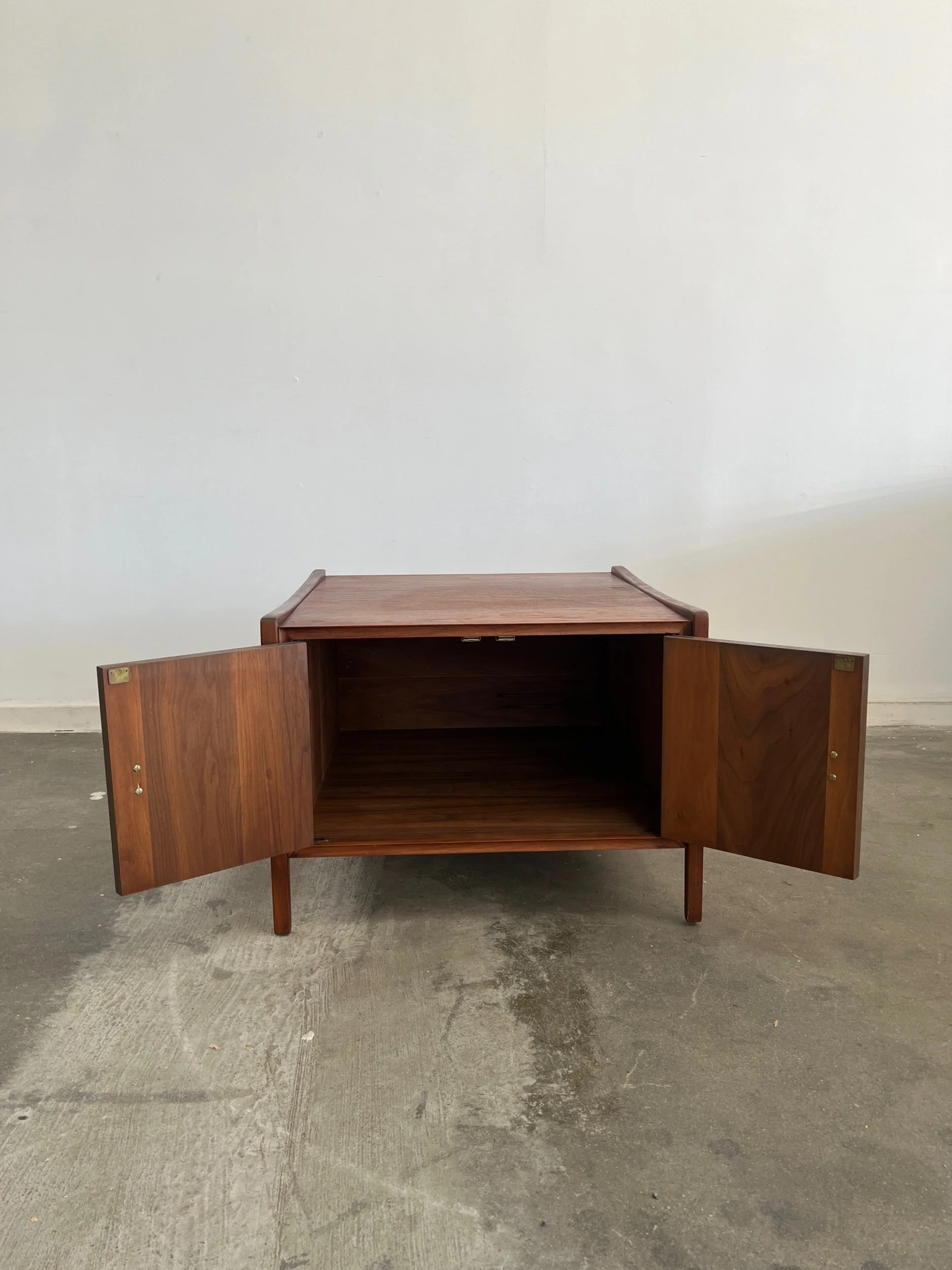 Large side table in great vintage condition. Item features angular solid walnut legs built into the frame. Table shows well in original condition , unit is structurally sound and fully functional.