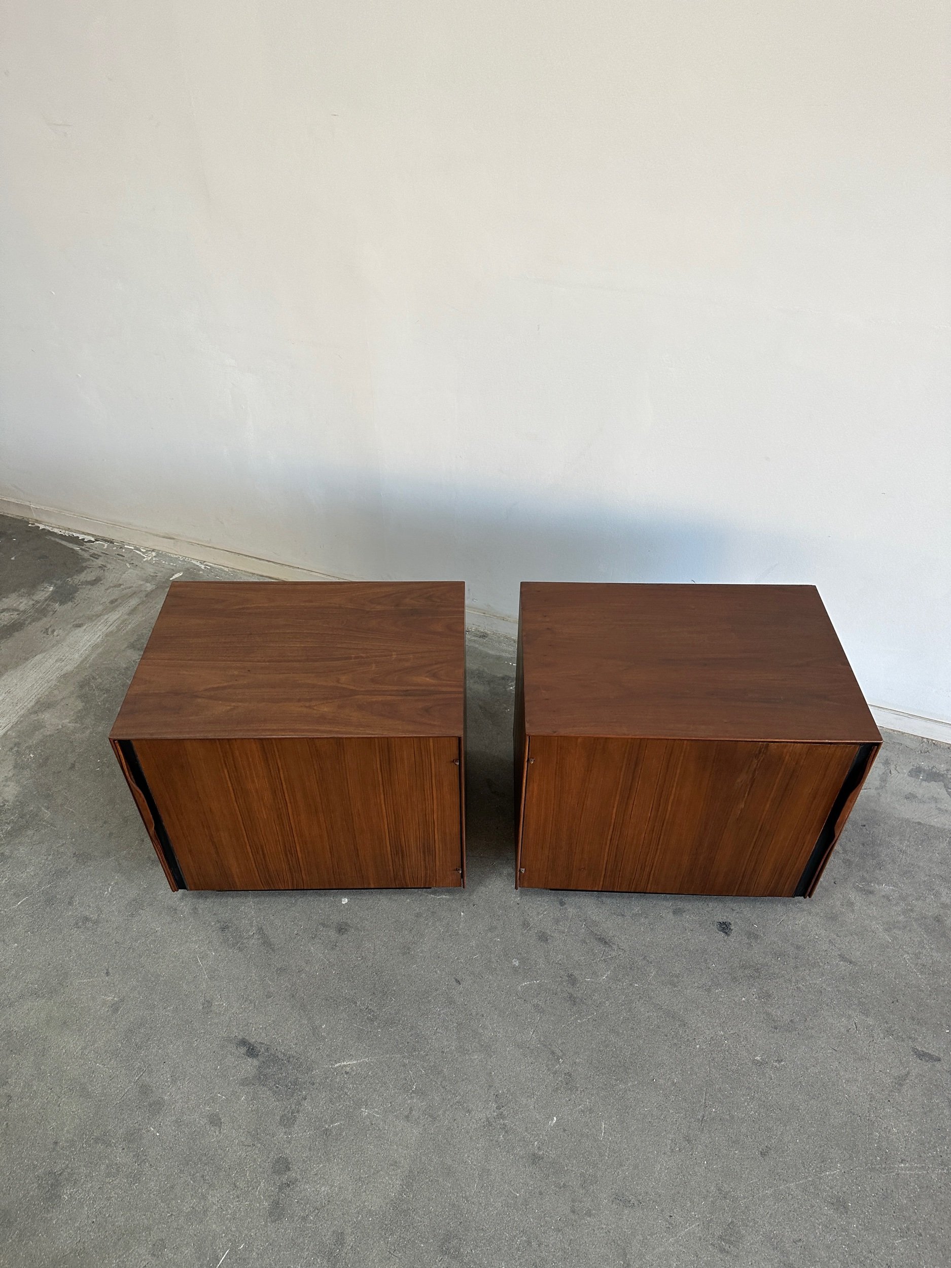 Vintage post modern nightstands in fully restored condition. Units are structurally sound and fully functional. These feature a medium dark walnut finish and hidden pulls. Price is for the pair.