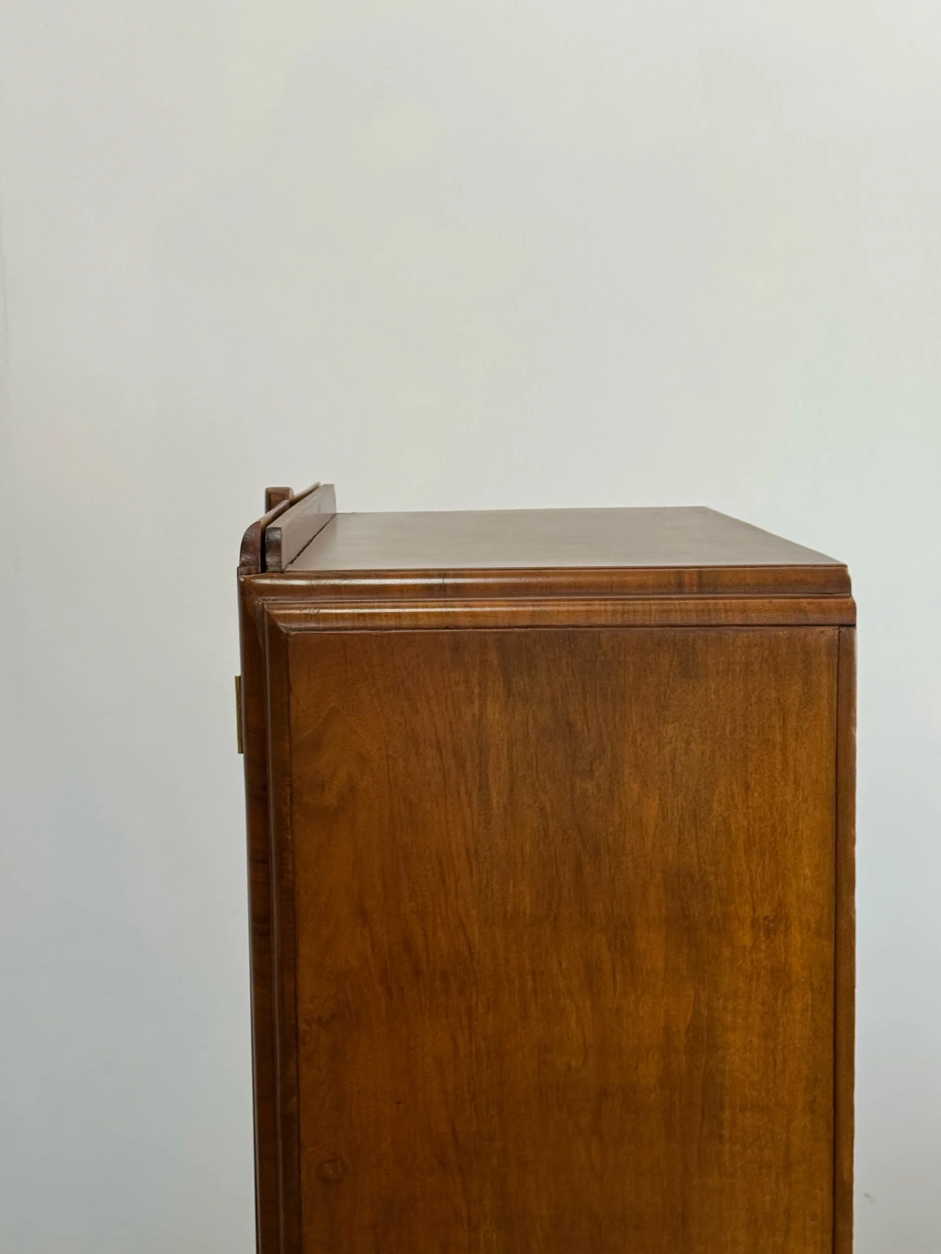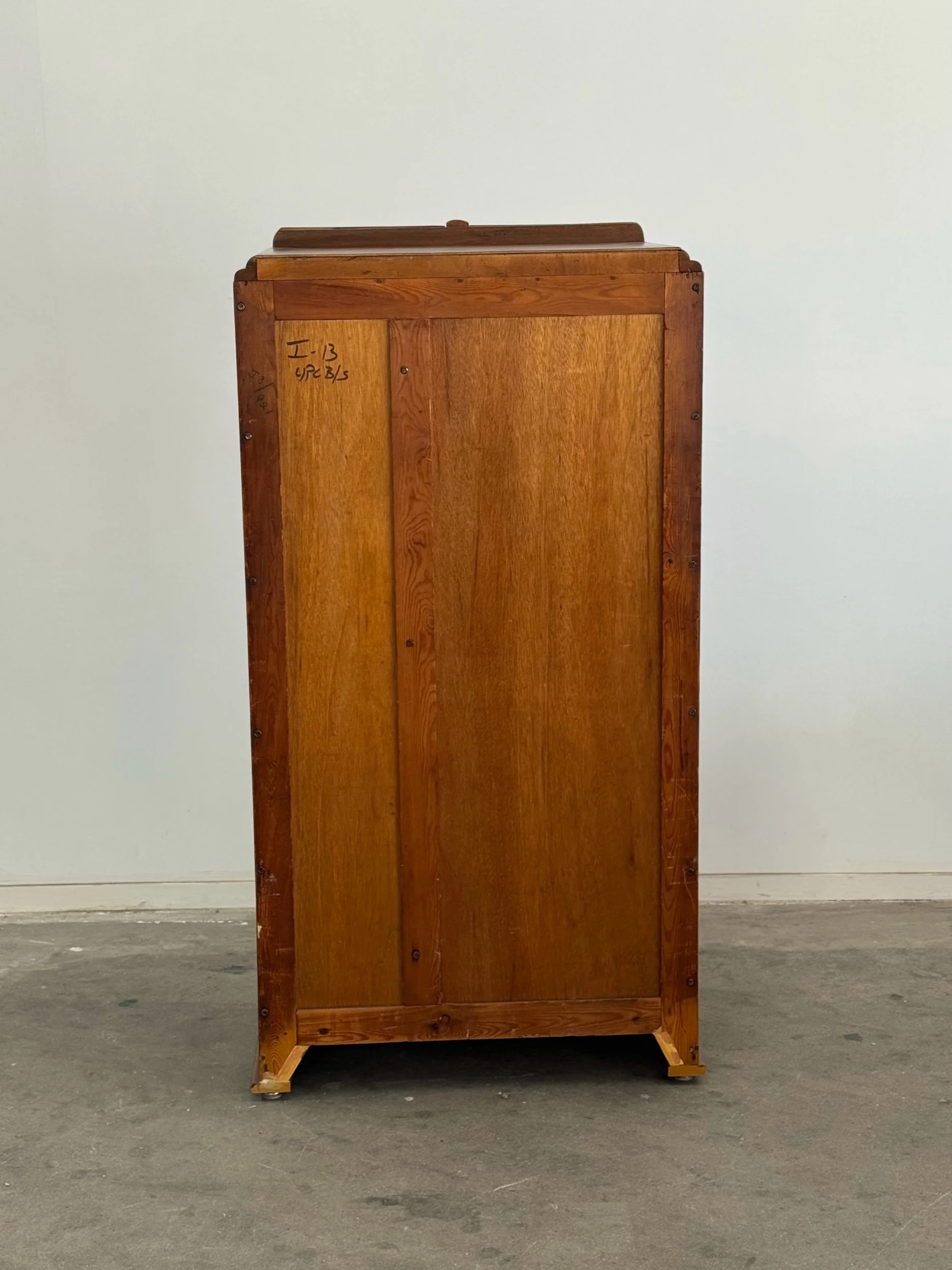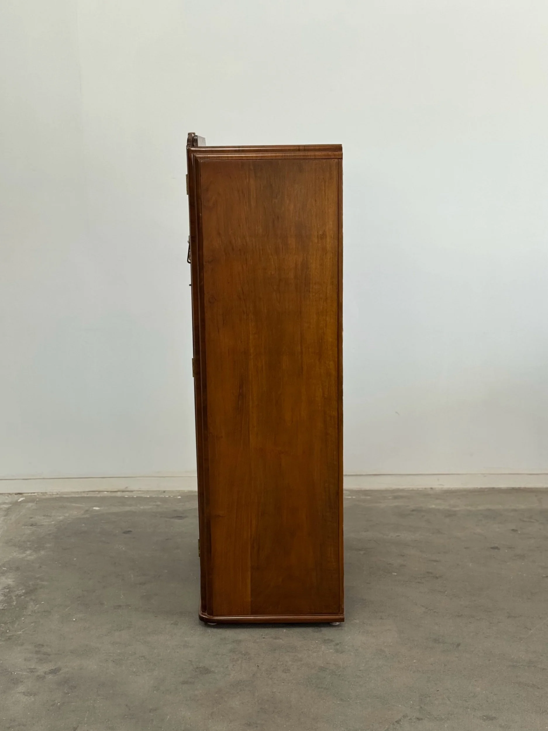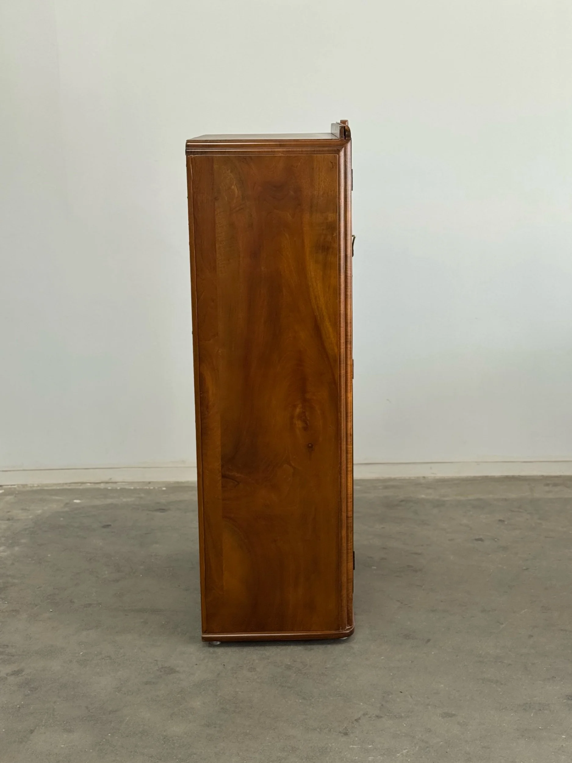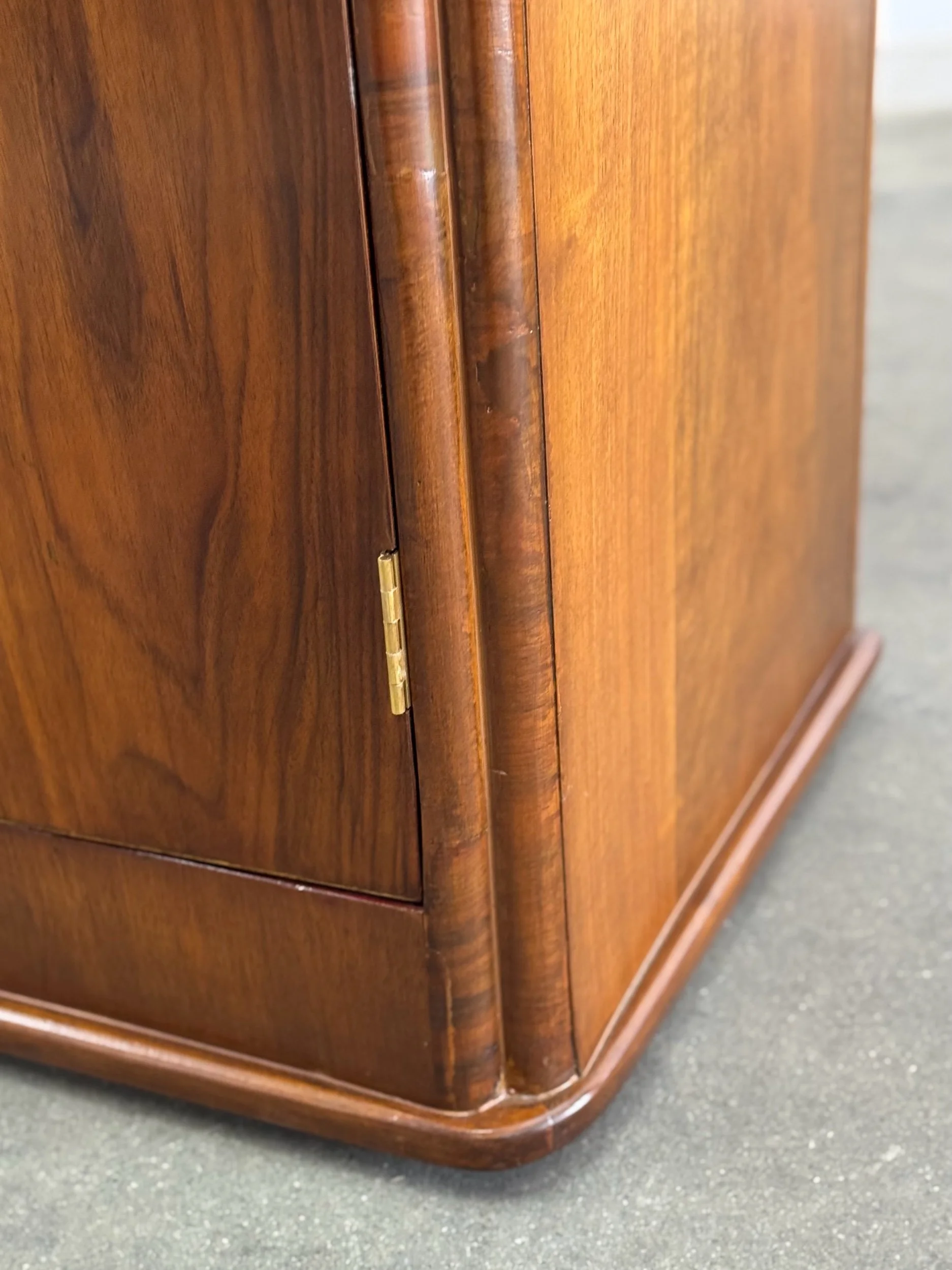 Danish modern corner bookcase in fully restored condition. Item is structurally sound and sturdy with no wobble. Unit features a great angular corner design and ample stretchers for great support.