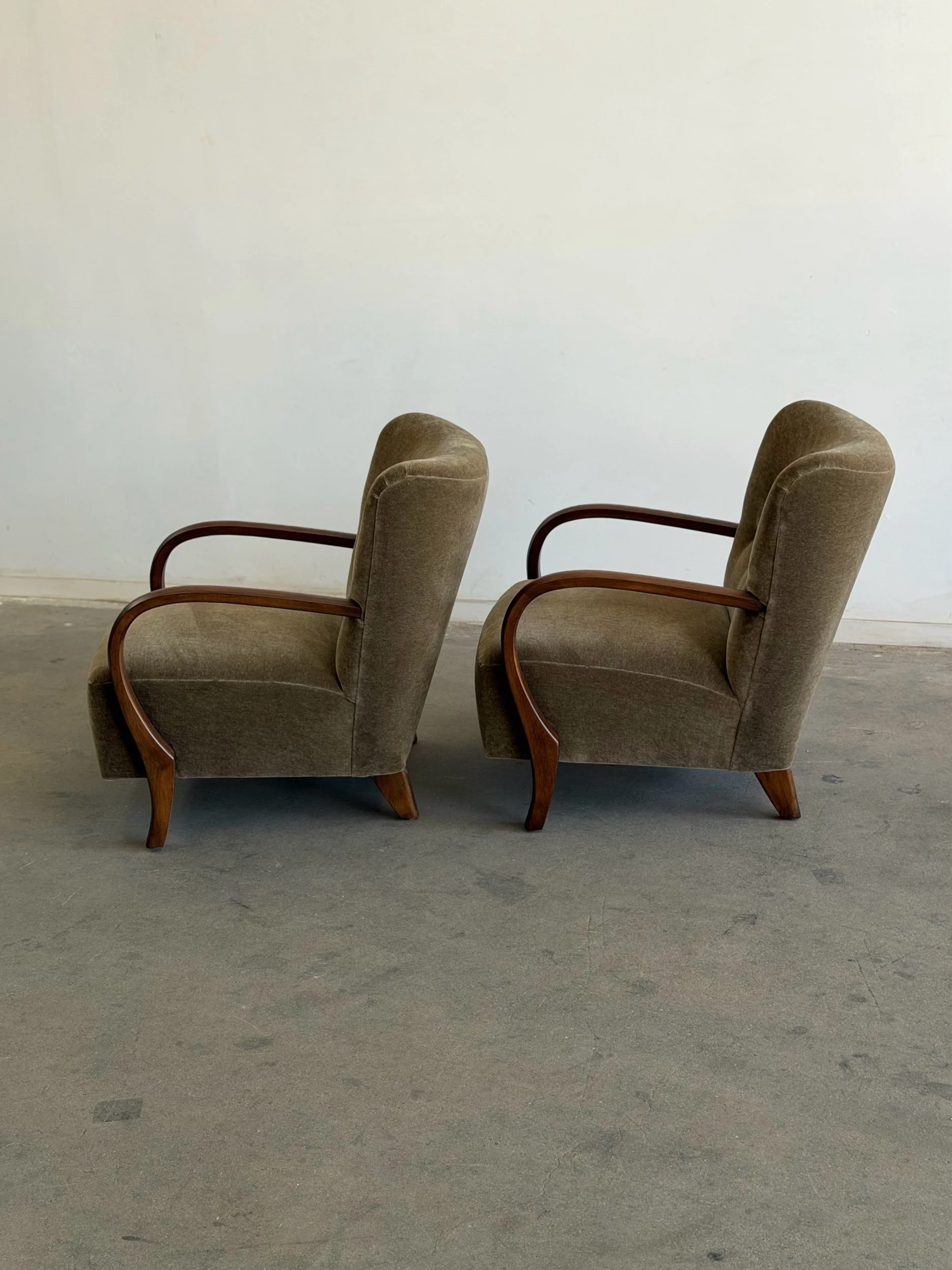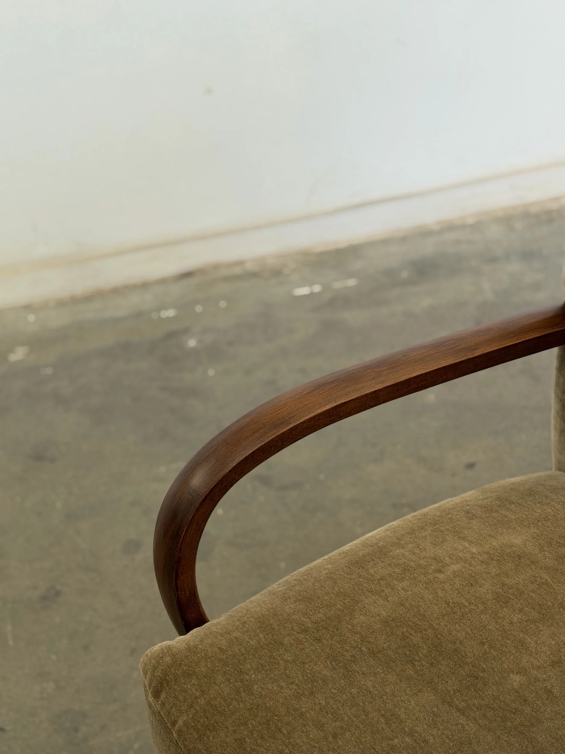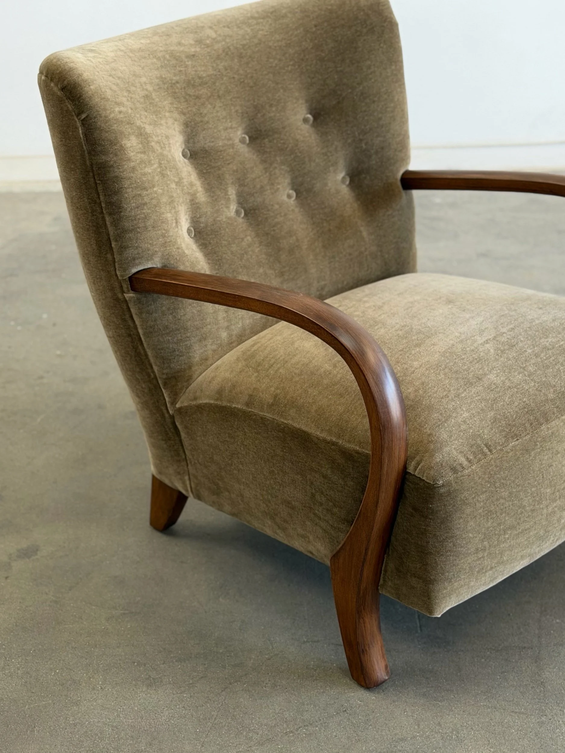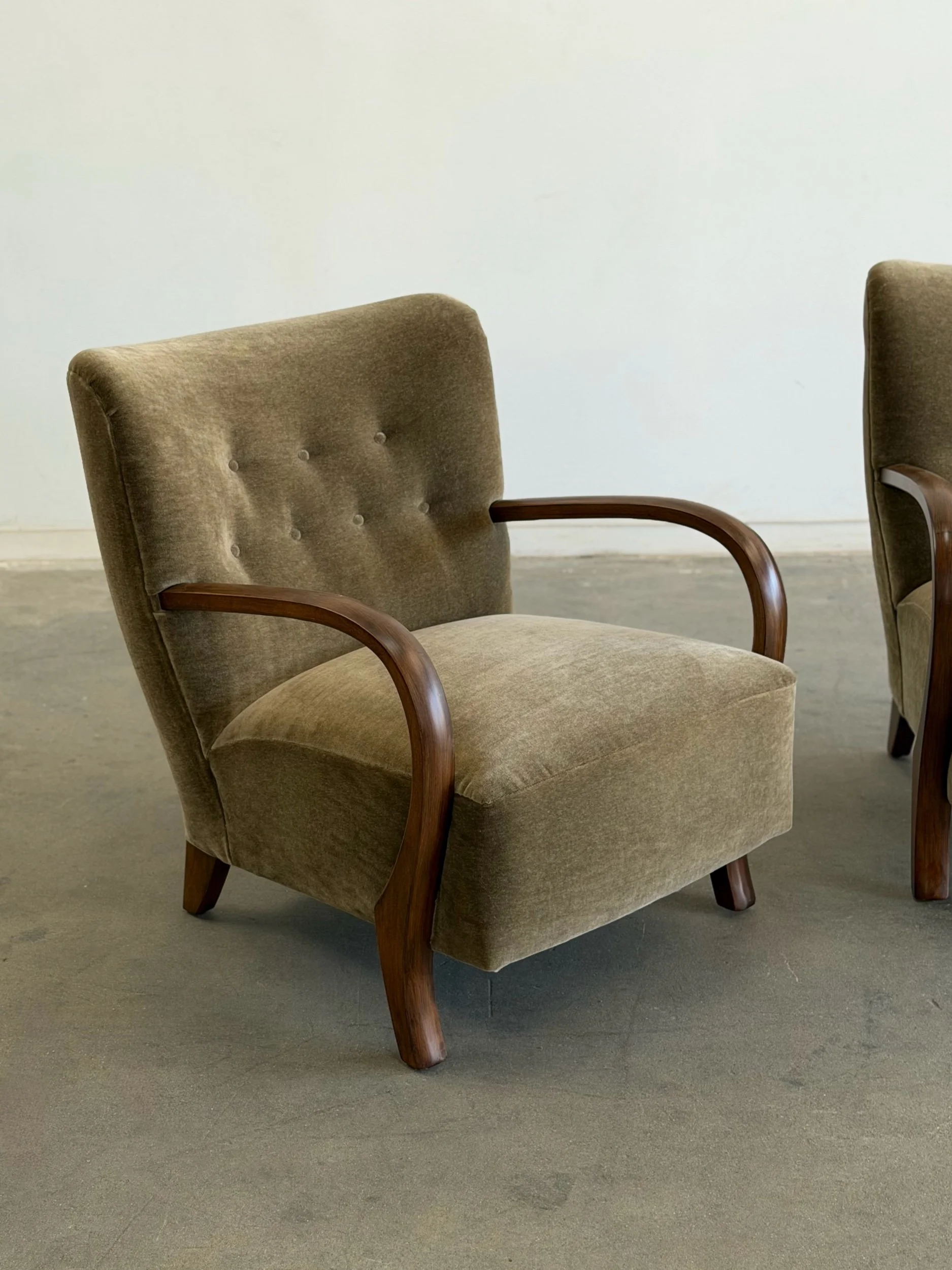 An ode to art deco design, our custom made Jacques lounge chairs feature solid sculptural bentwood arms finished in a rich walnut tone. The low silhouette features a gently reclined back and a generously cushioned seat with suspension springs. This pair is upholstered in olive toned mohair.