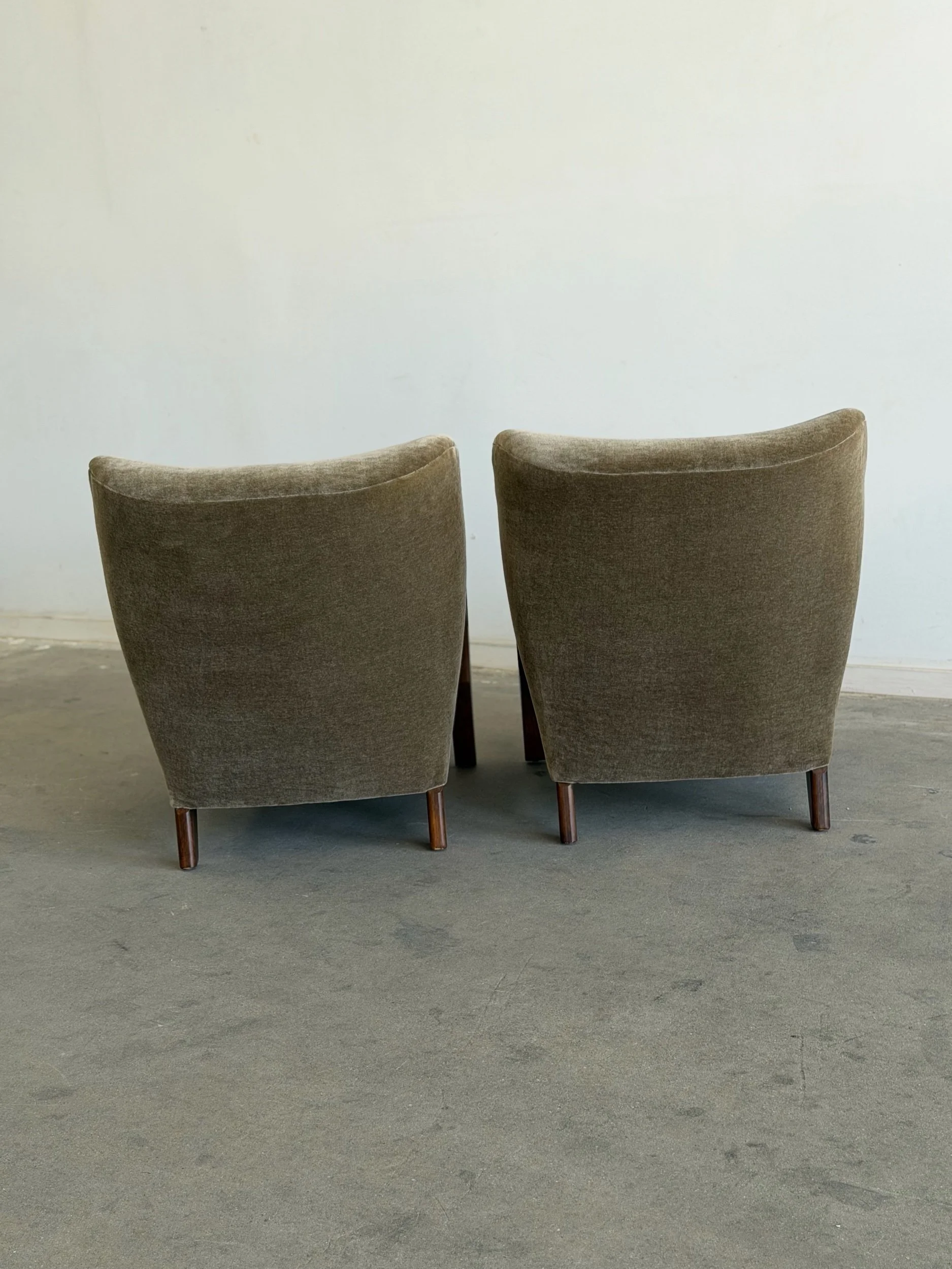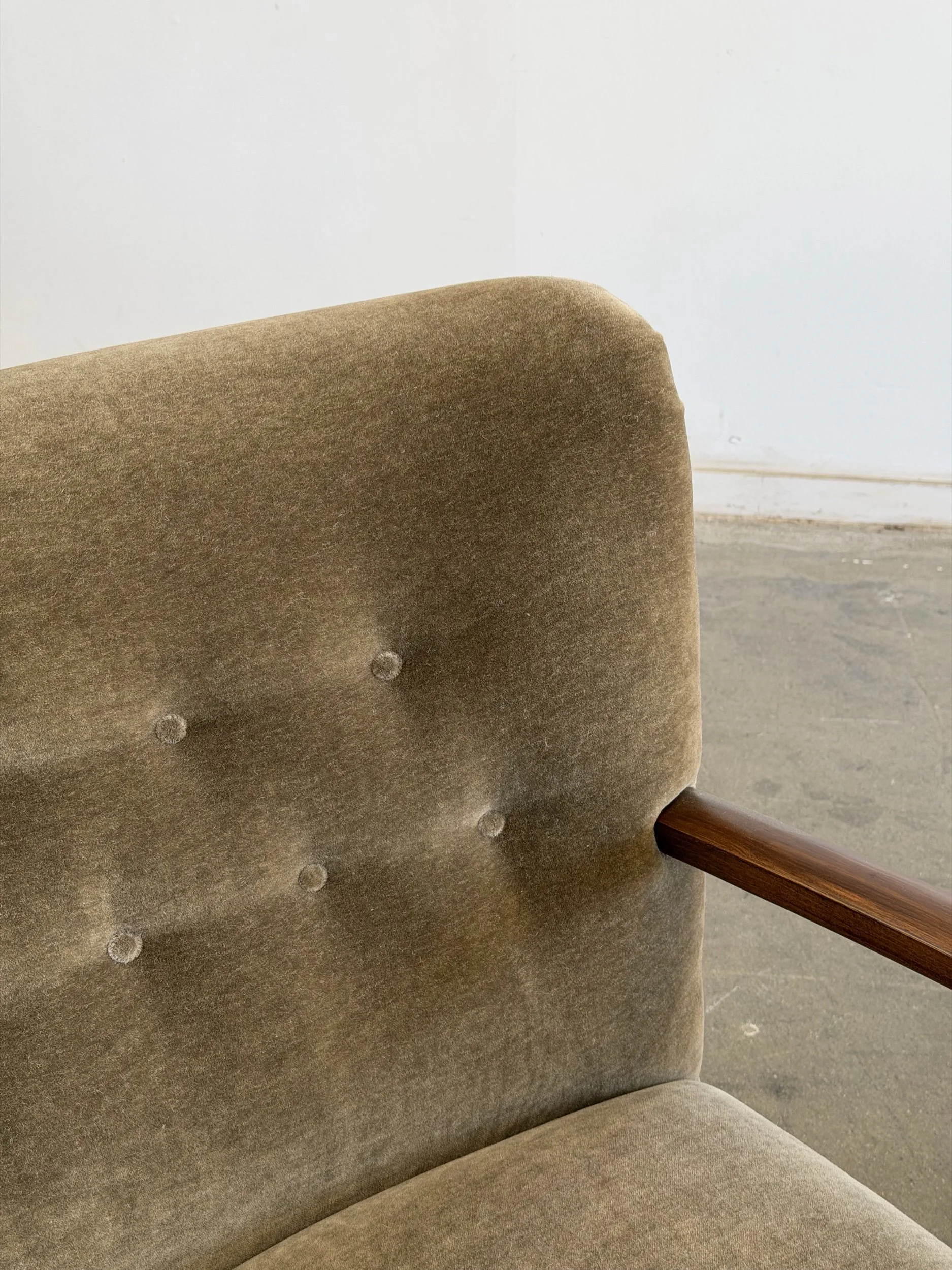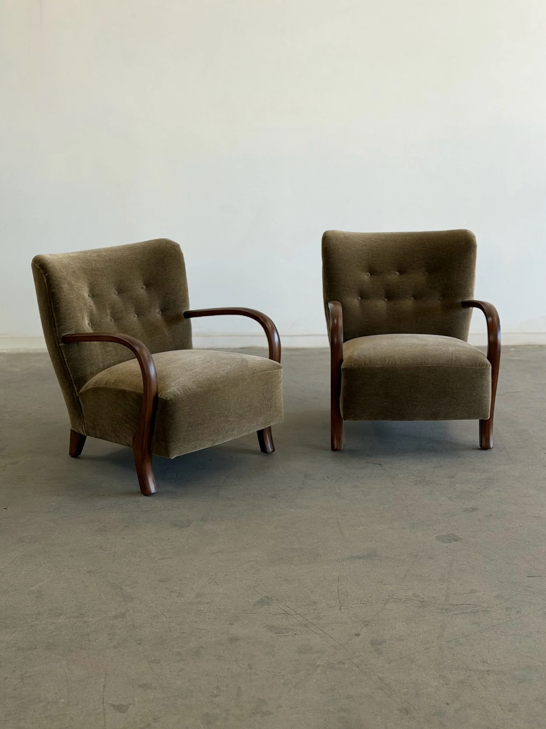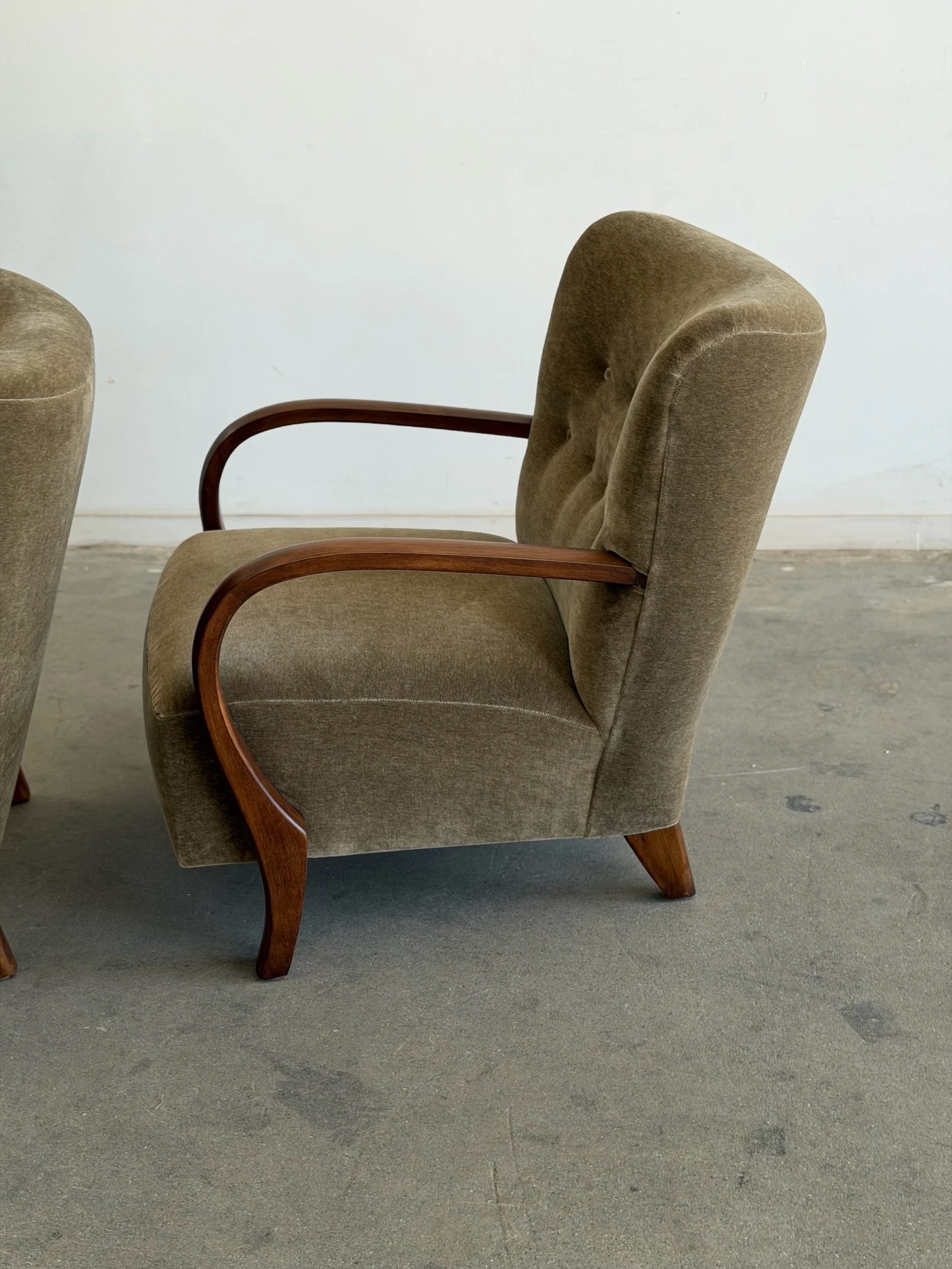 An ode to art deco design, our custom made Jacques lounge chairs feature solid sculptural bentwood arms finished in a rich walnut tone. The low silhouette features a gently reclined back and a generously cushioned seat with suspension springs. This pair is upholstered in olive toned mohair.