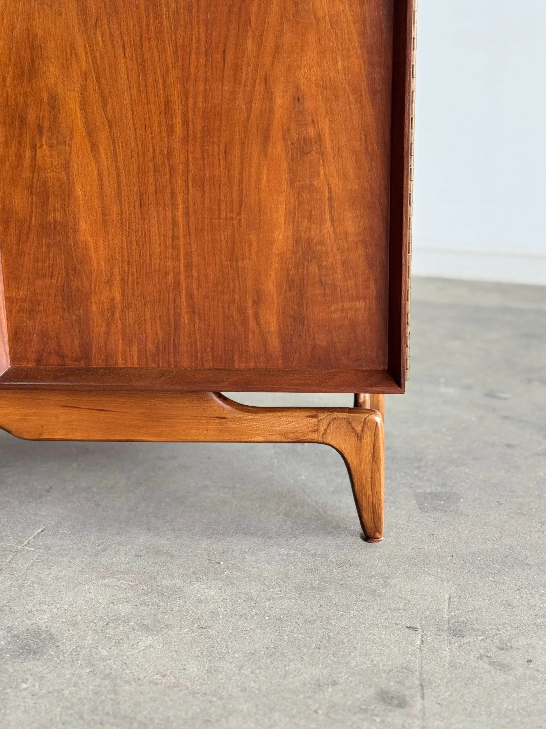 Stunning Mid Century credenza with sculptural legs and amazing drawer pulls. Fully restored walnut credenza, item is structurally sound with no major areas of wear with refinished wood.