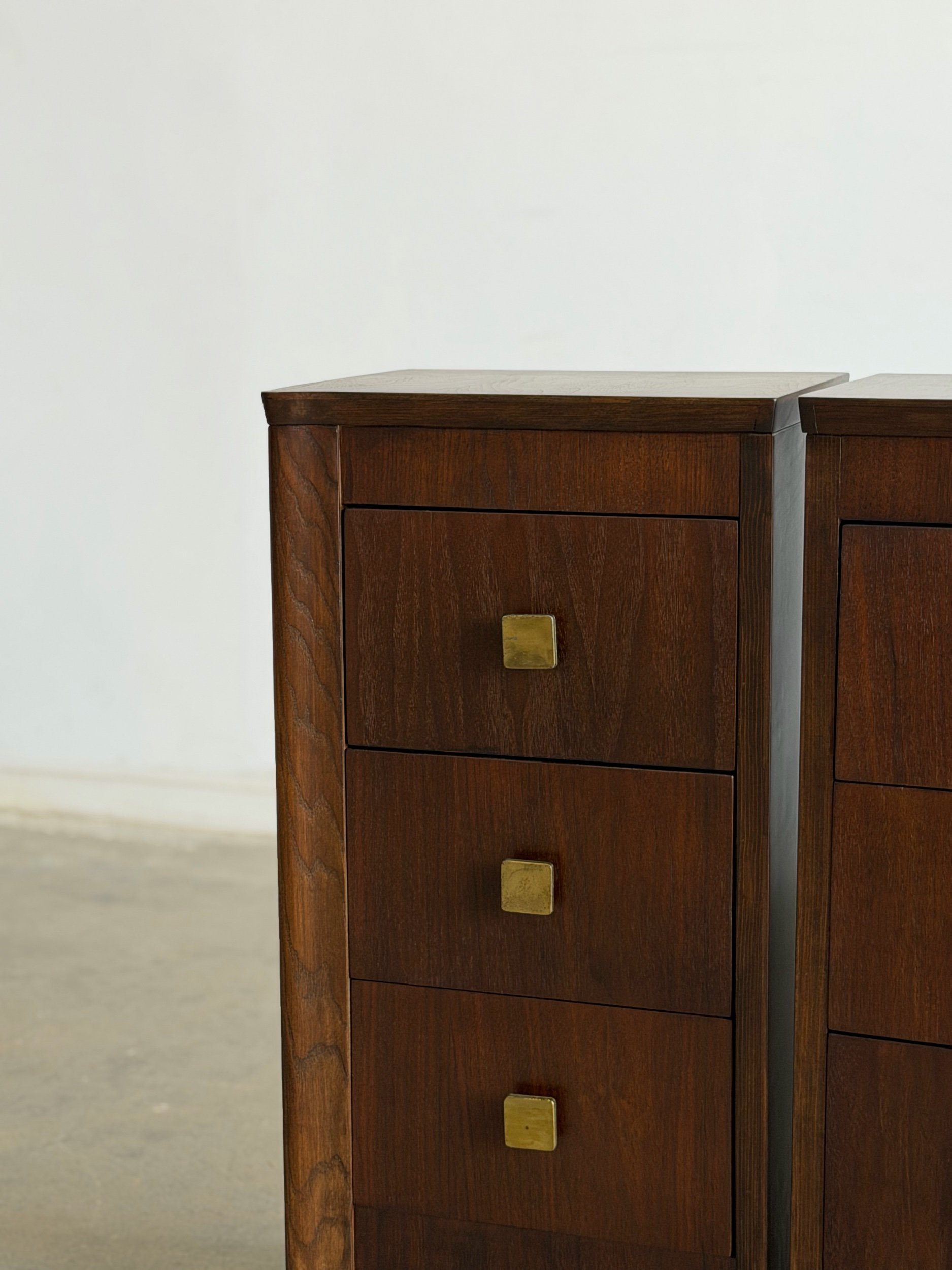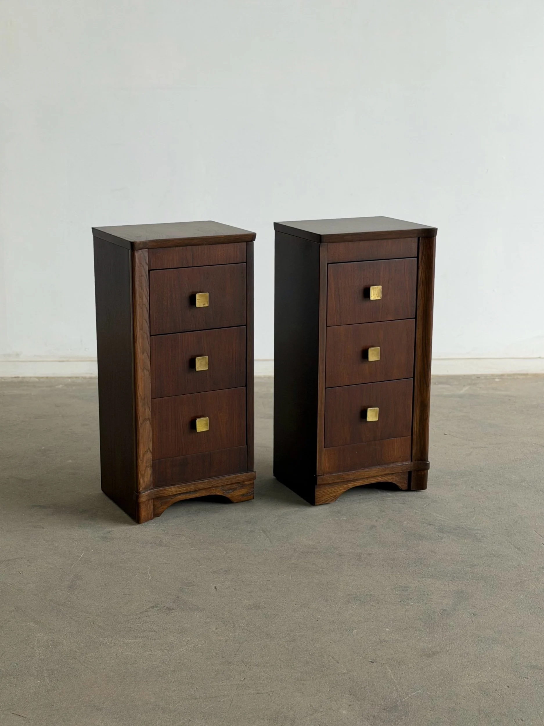 Fully restored rosewood nightstands finished in medium brown walnut. Each unit is structurally sound and fully functional. This pair offers great access to the second tier of open surface storage. They also feature drop down doors for ample access to interior storage. Each unit shows well with no major areas of wear. Price is for the pair.
