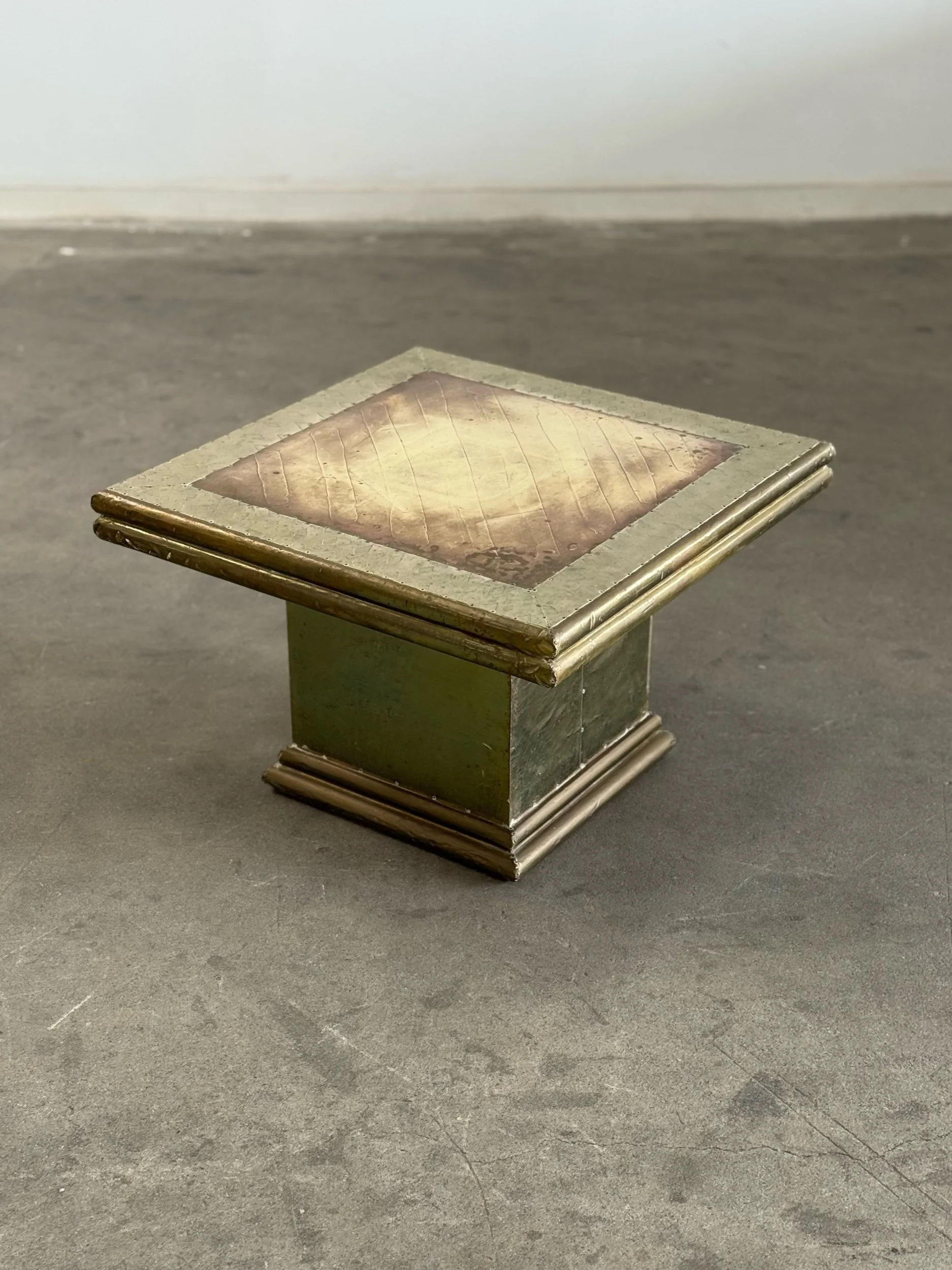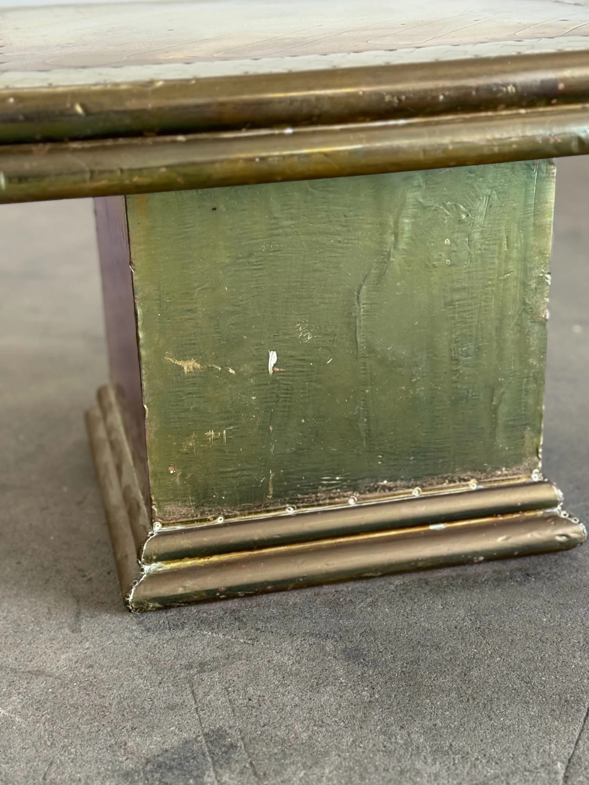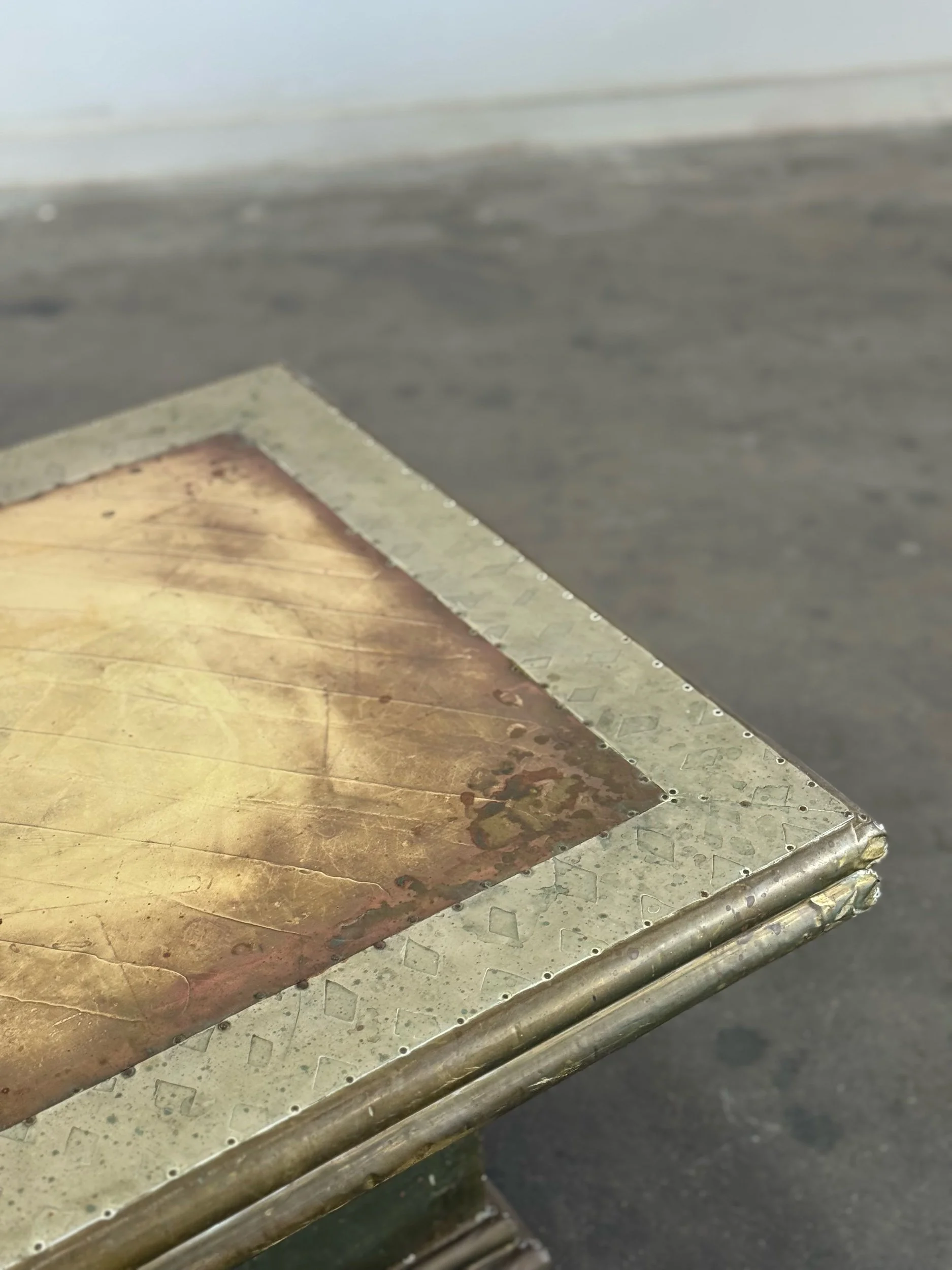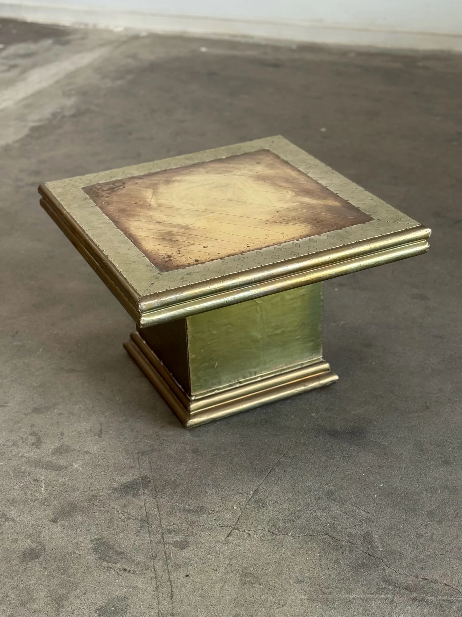 Vintage Hollywood Regency Side Table. Item feature hammered plated metal construction. Table is heavy and structurally sound with lots of patina.