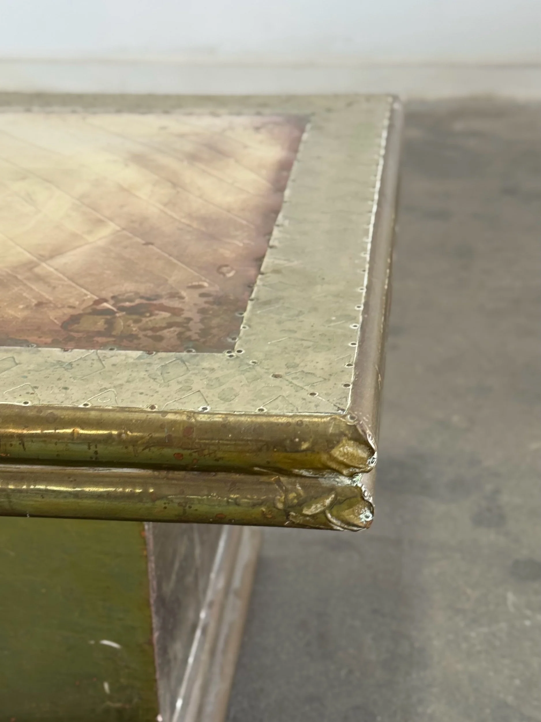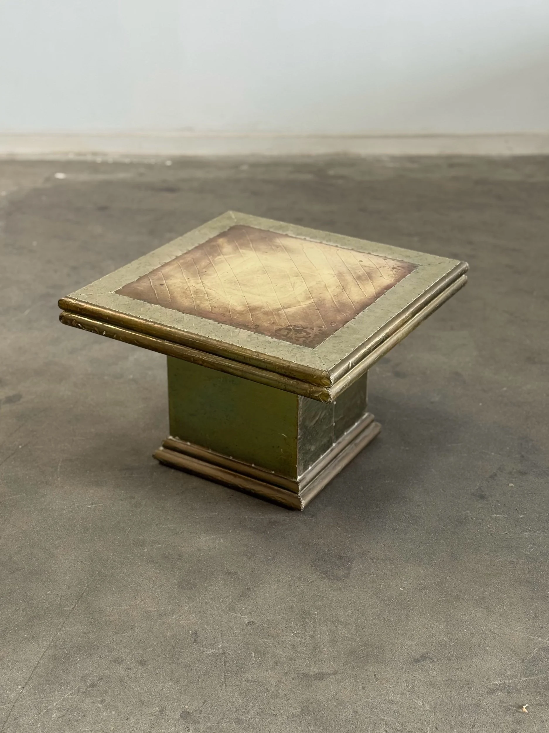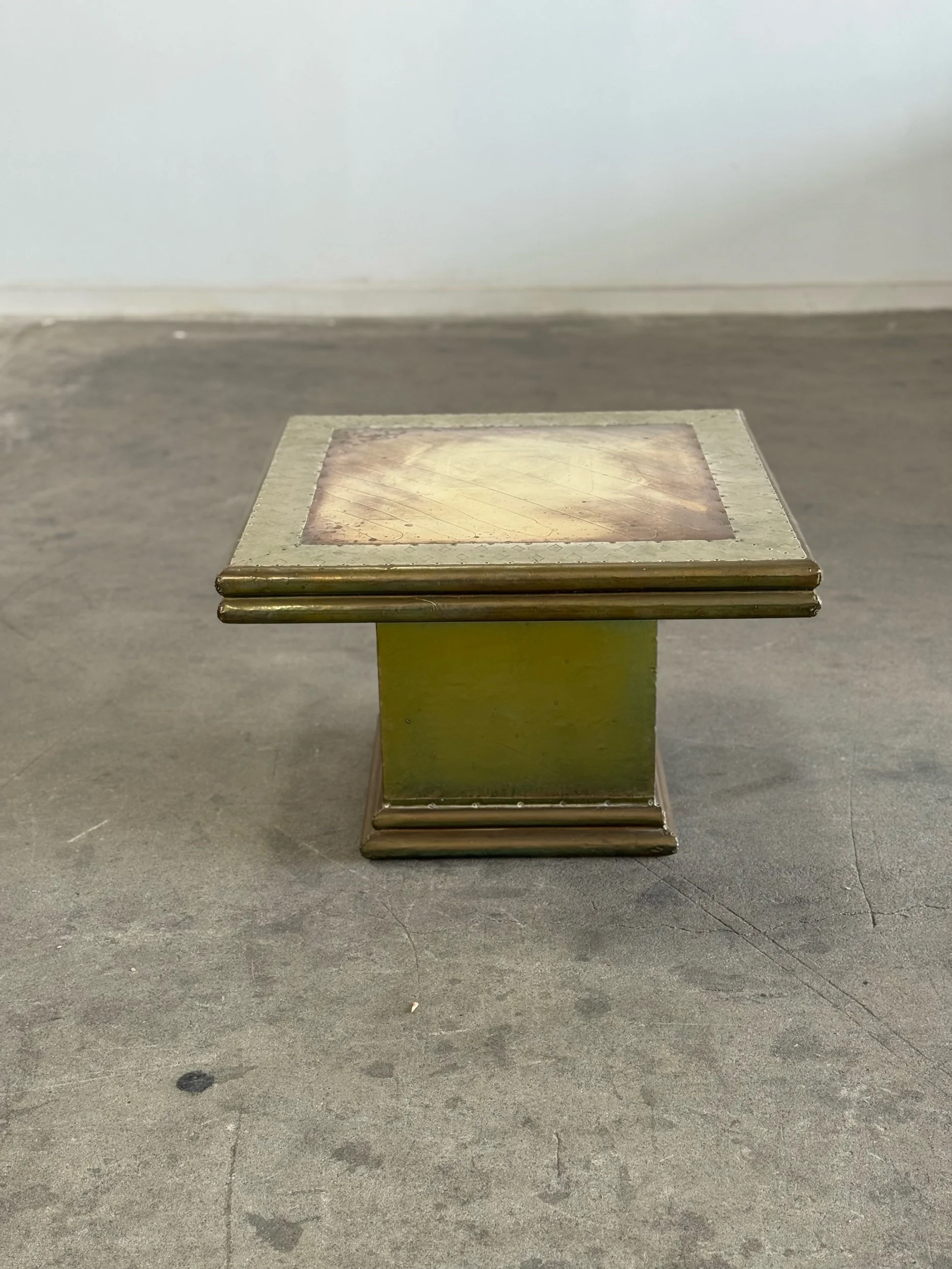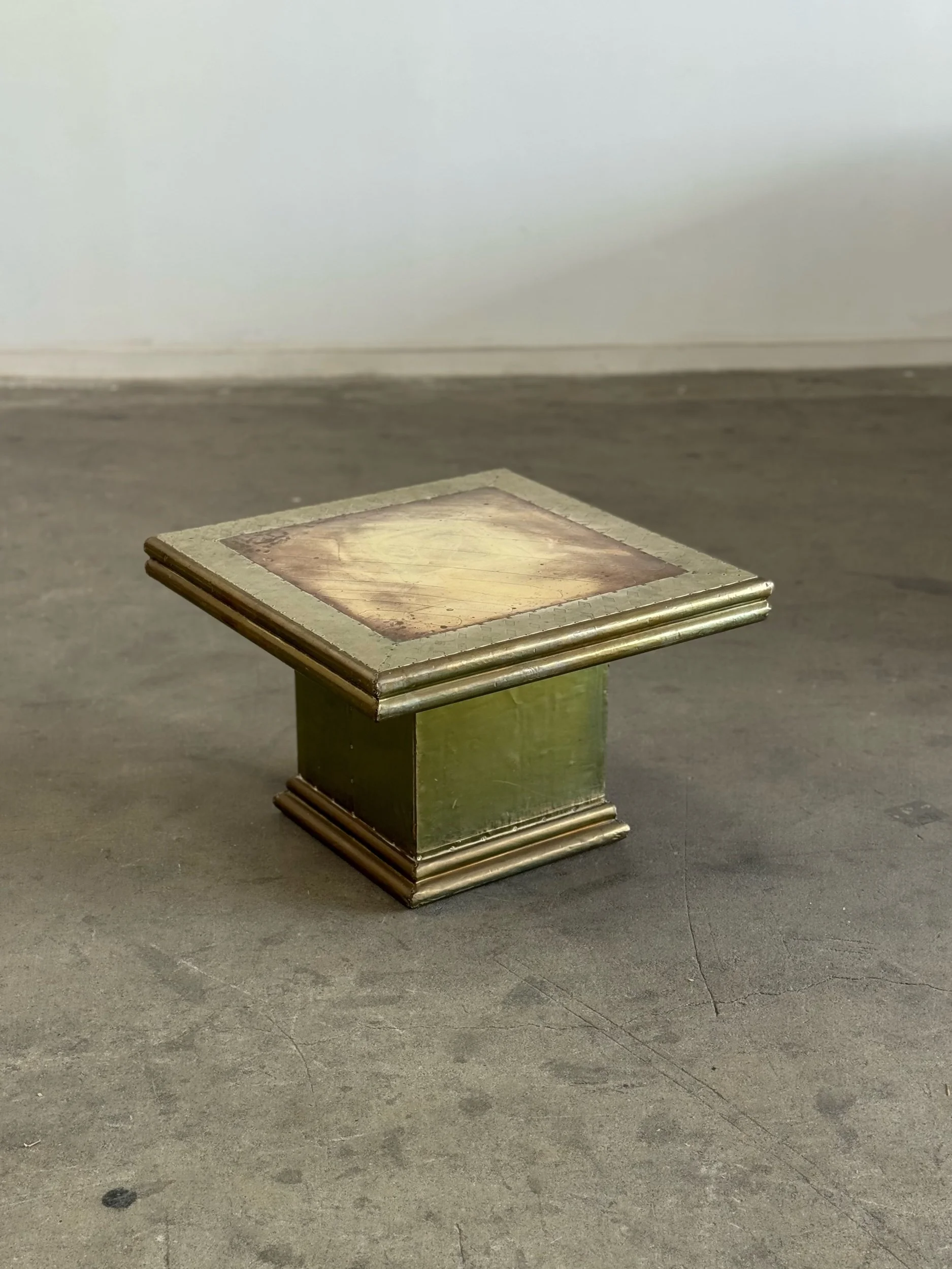 Vintage Hollywood Regency Side Table. Item feature hammered plated metal construction. Table is heavy and structurally sound with lots of patina.