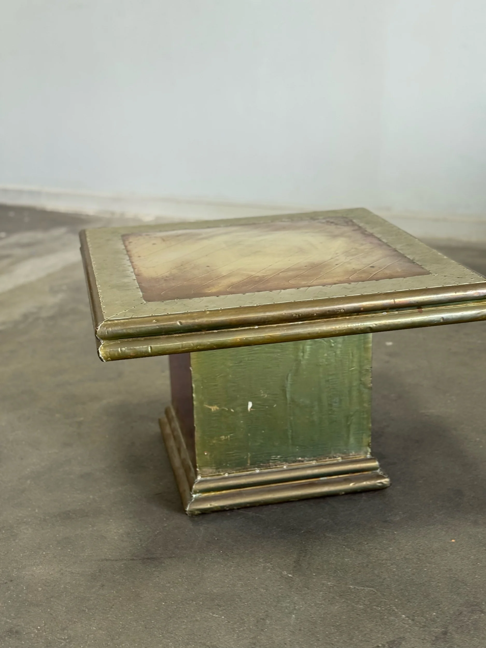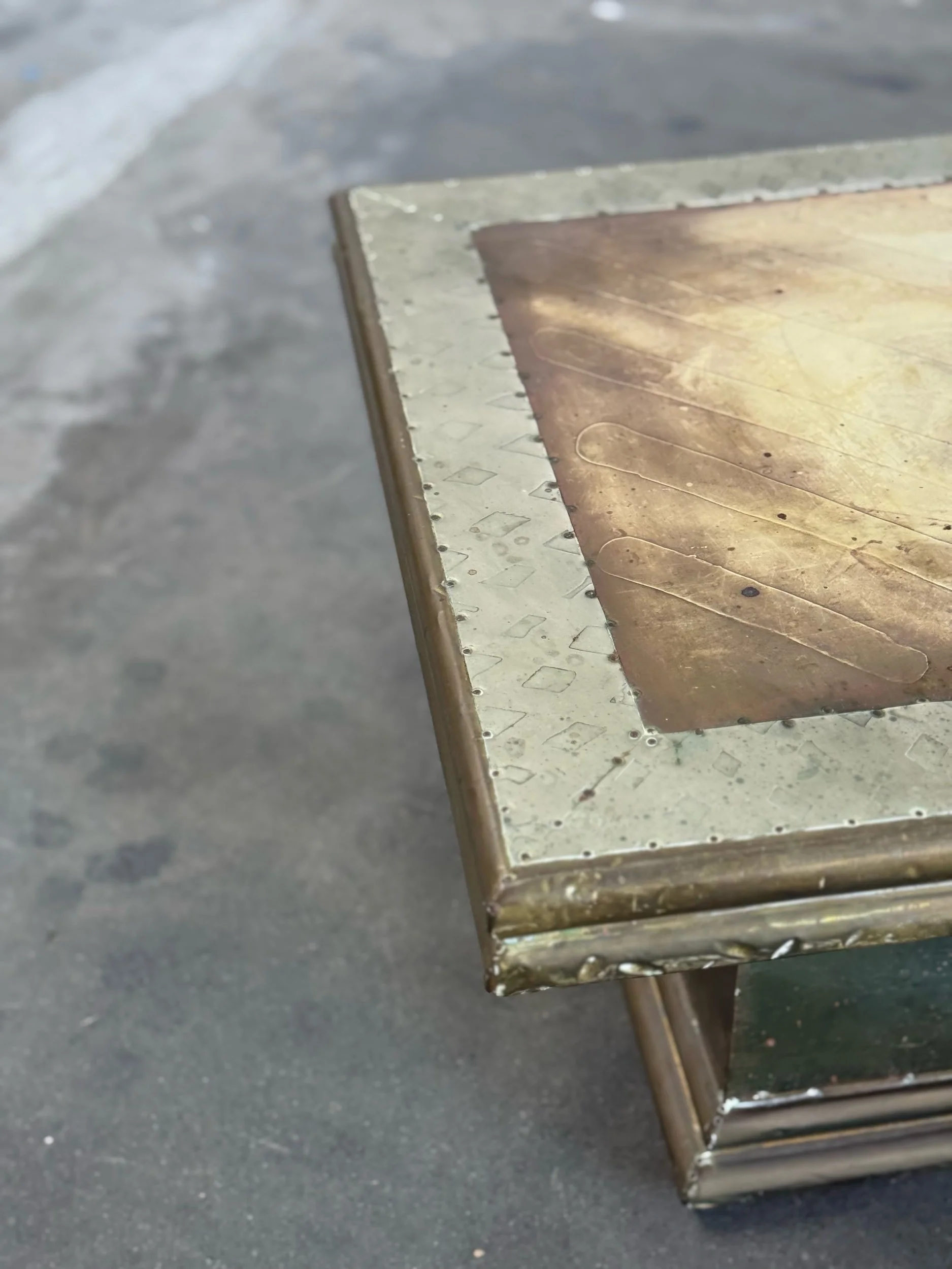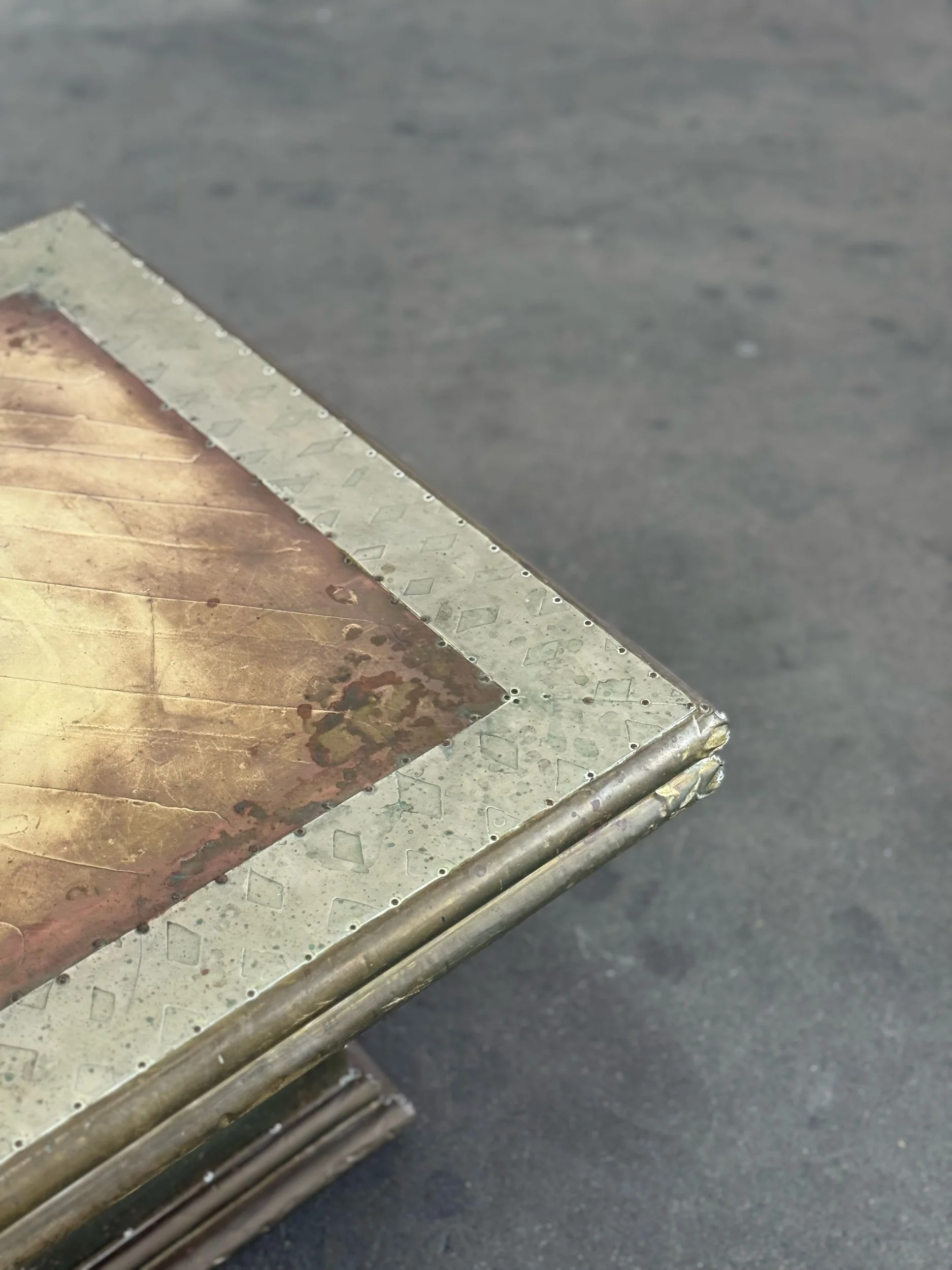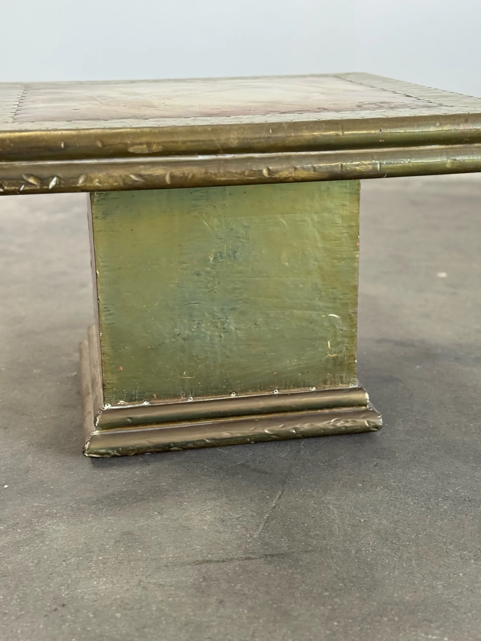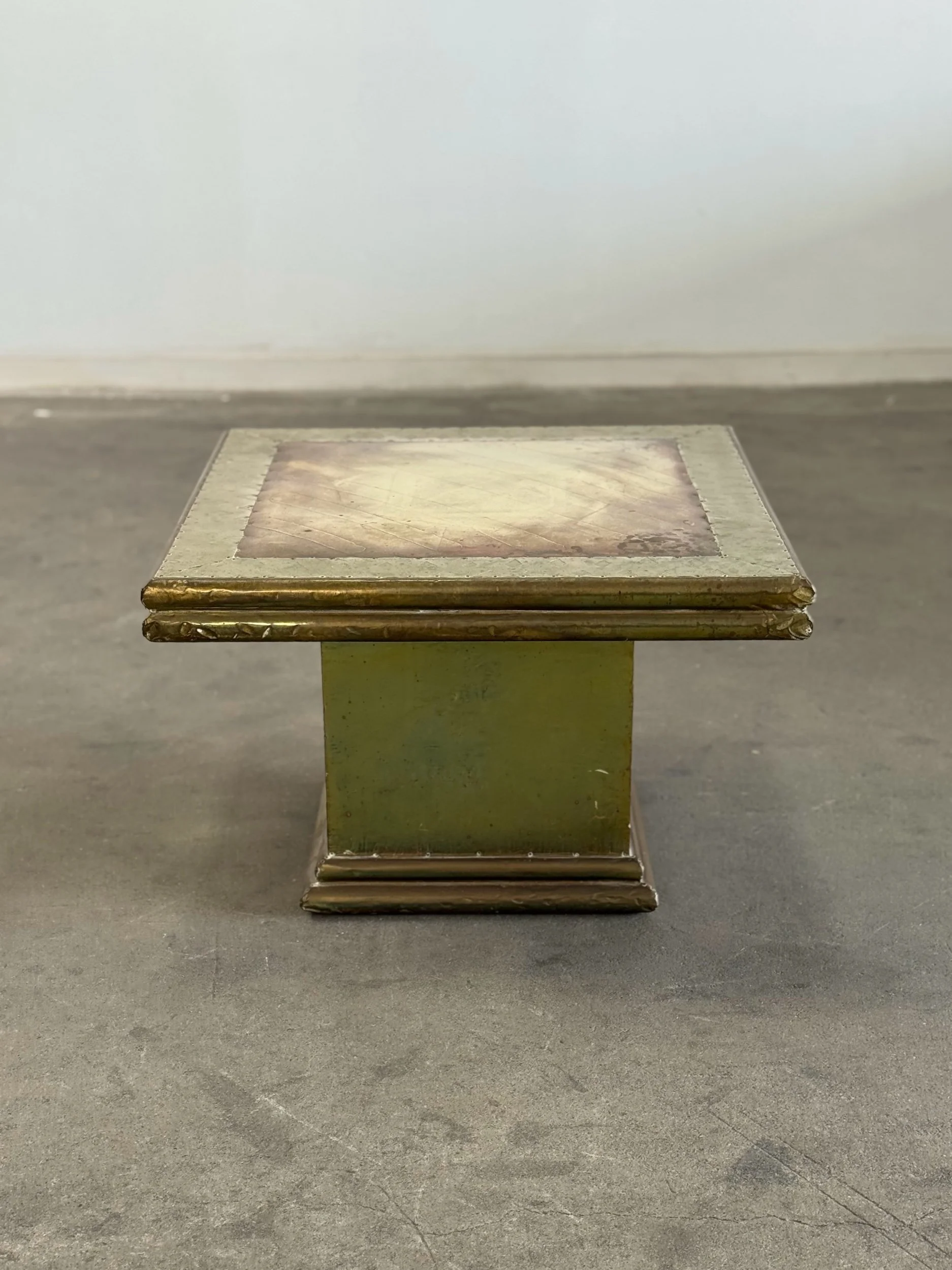 Vintage Hollywood Regency Side Table. Item feature hammered plated metal construction. Table is heavy and structurally sound with lots of patina.