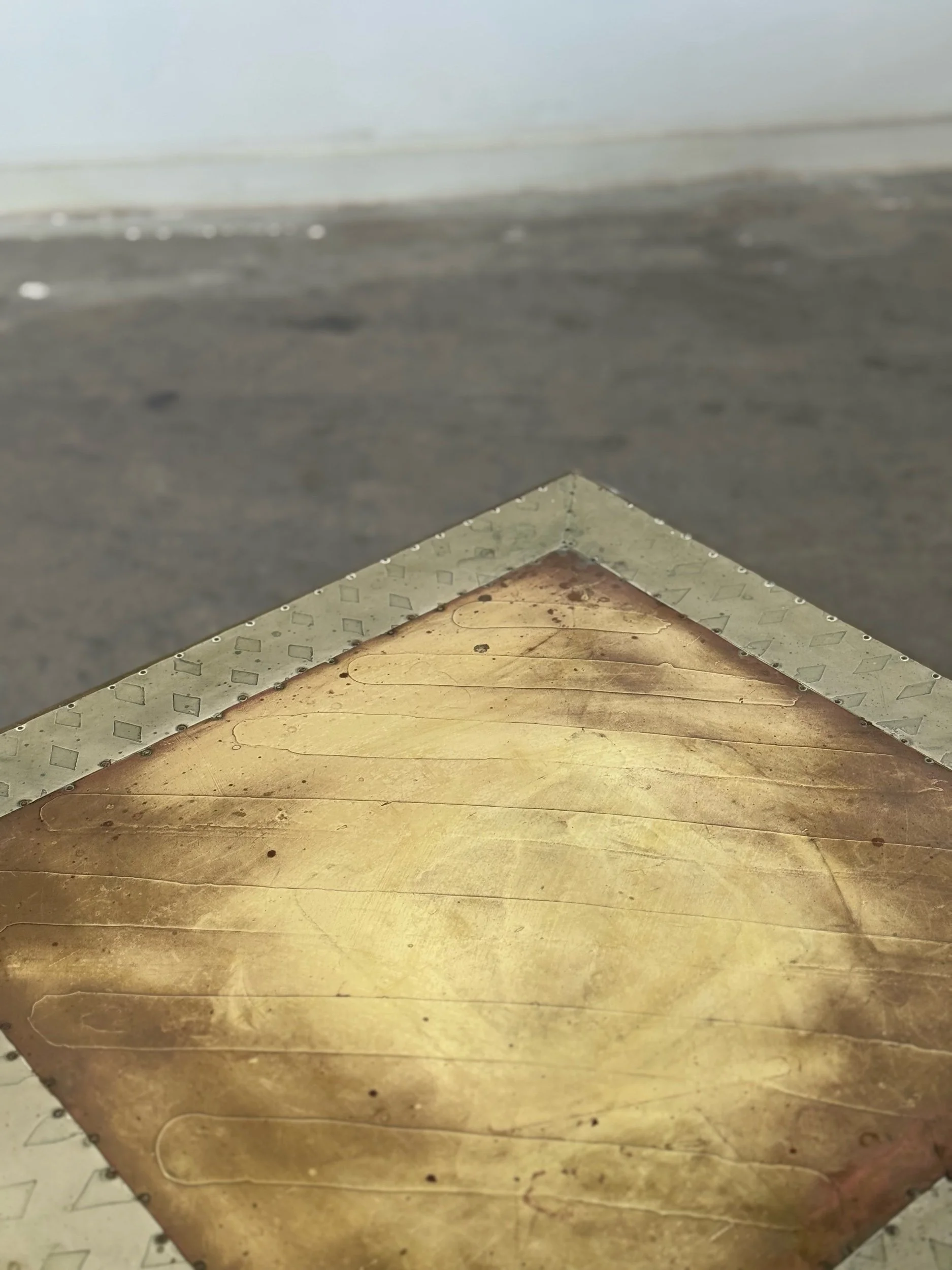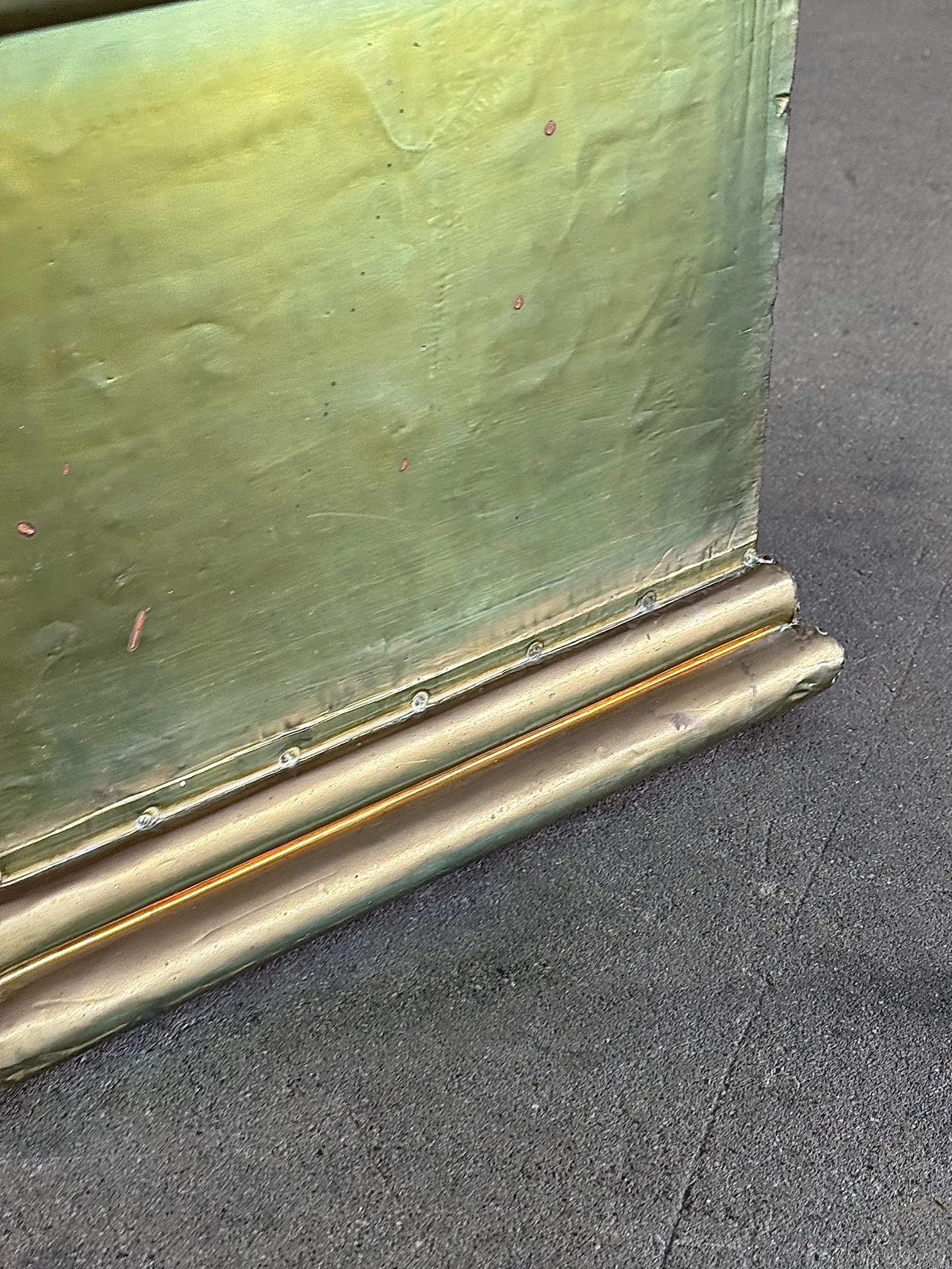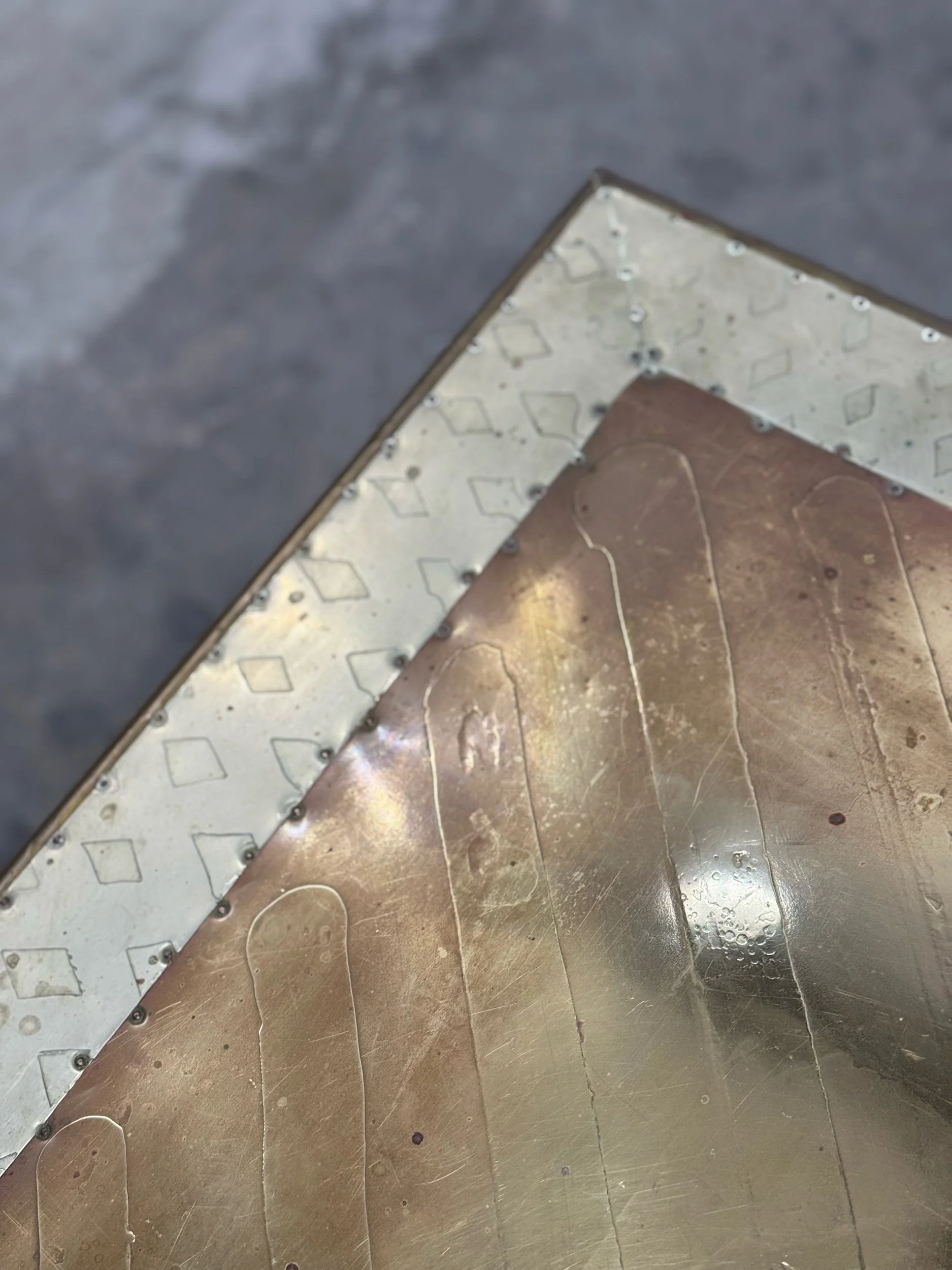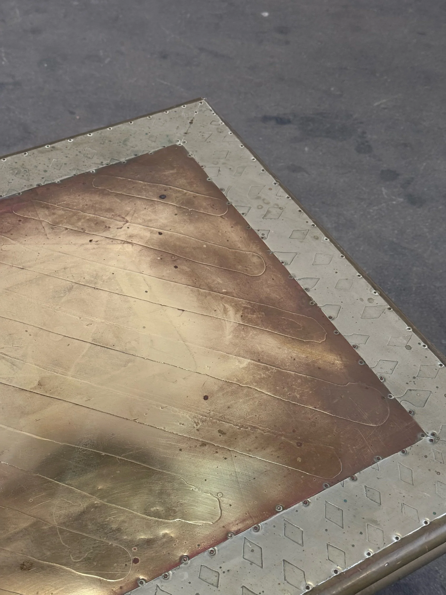 Vintage Hollywood Regency Side Table. Item feature hammered plated metal construction. Table is heavy and structurally sound with lots of patina.