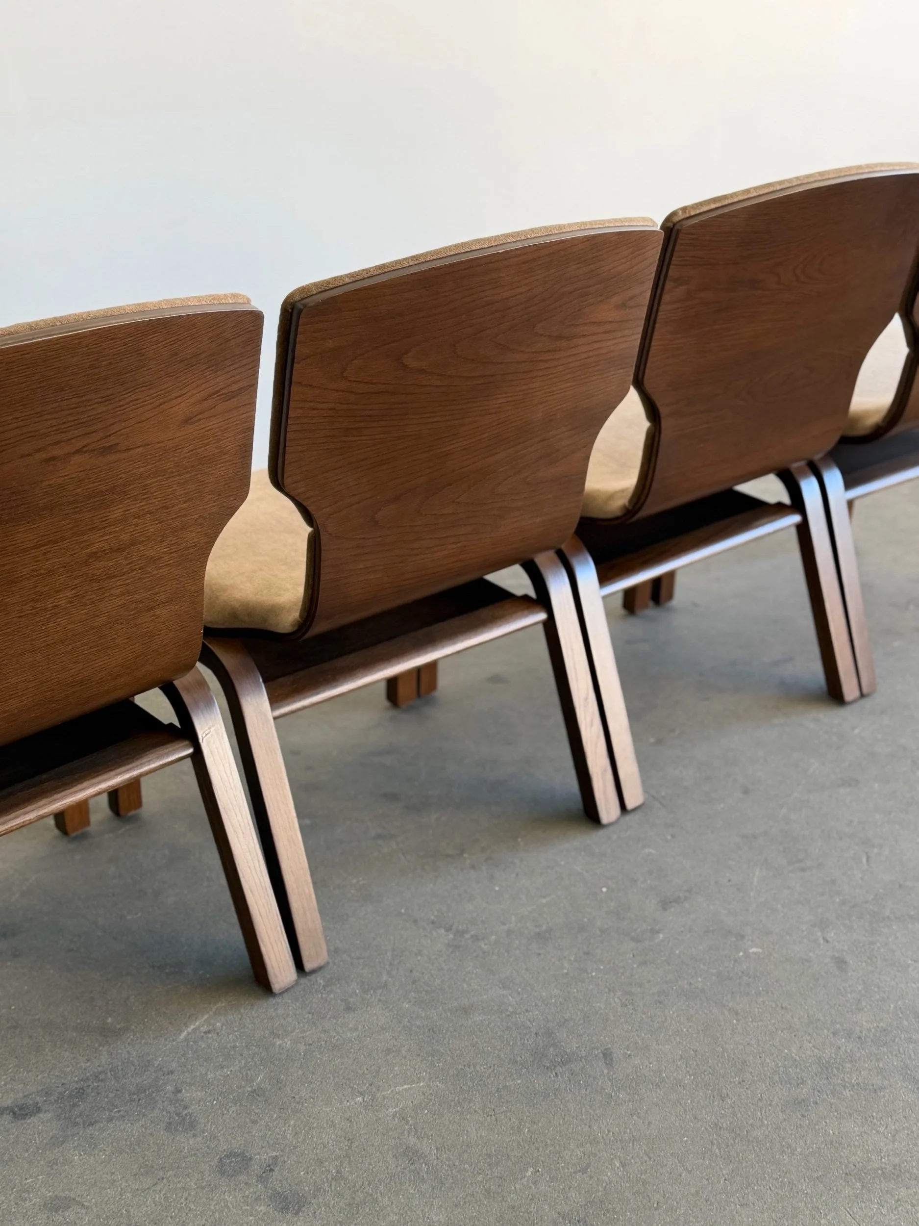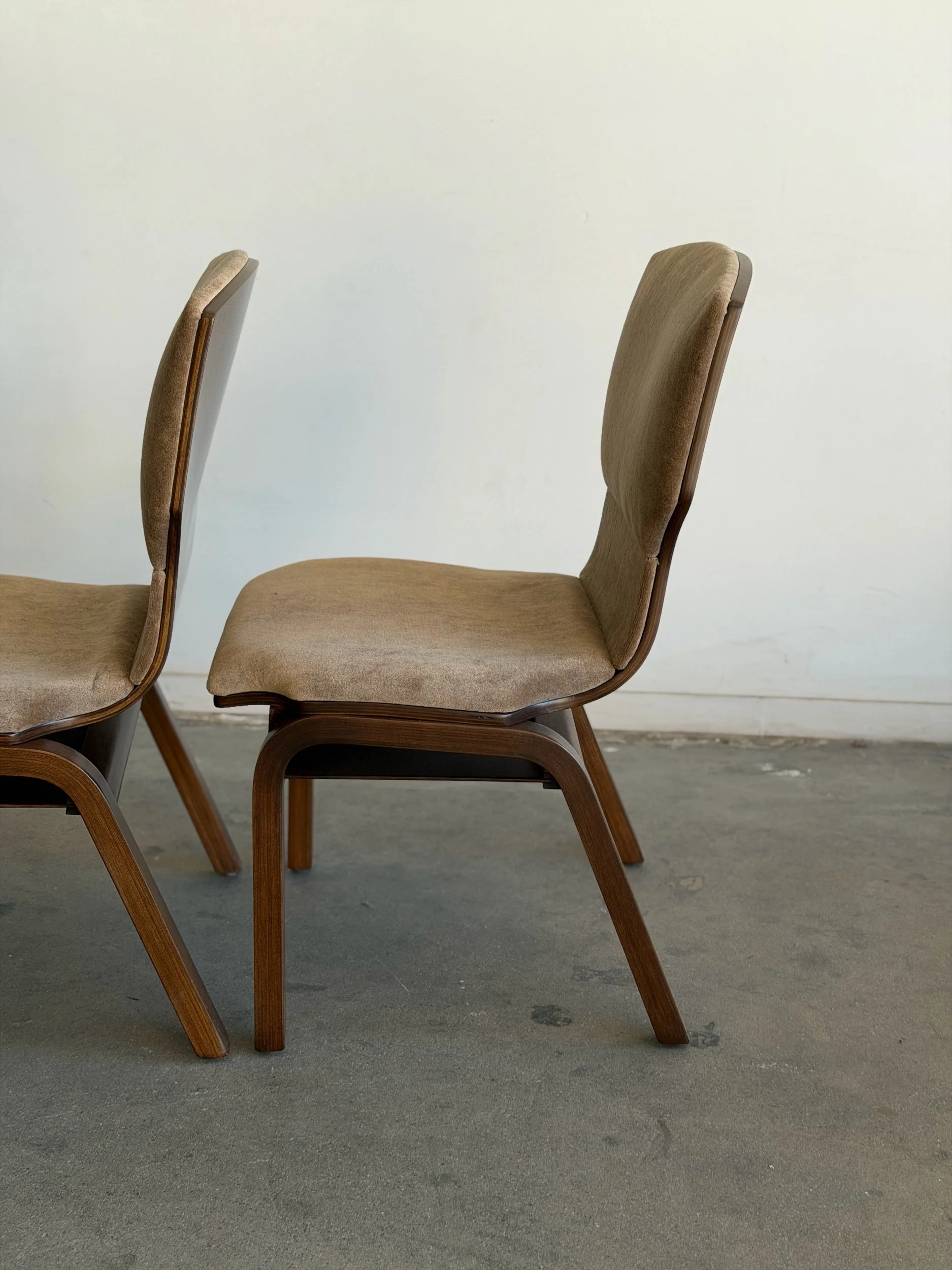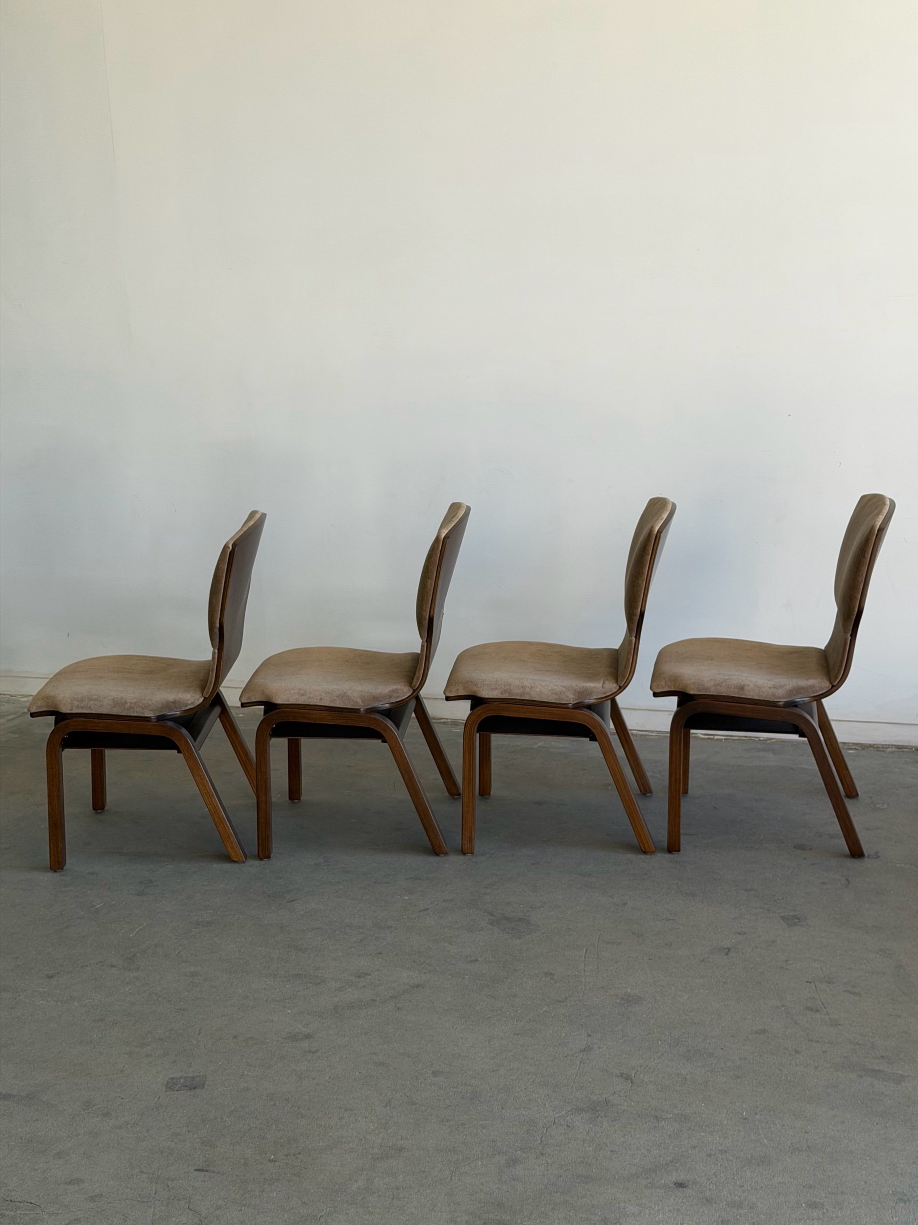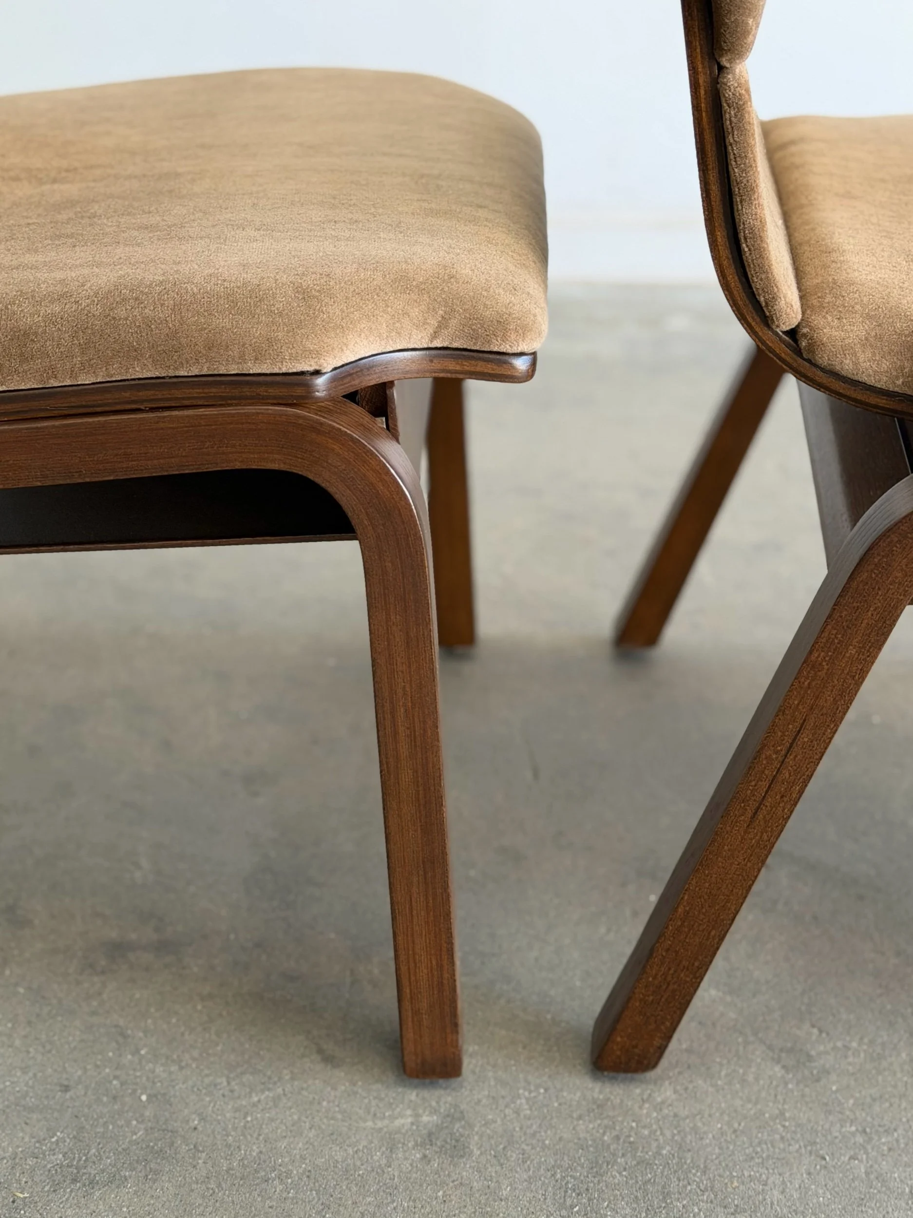 Fully restored bentwood dining chairs in excellent fully restored condition. Each unit shows be structurally sound , sturdy , and can be stacked . Chairs have fresh foam , new upholstery in low pile mohair , and have been finished in a dark walnut finish . Price is for the set of four.