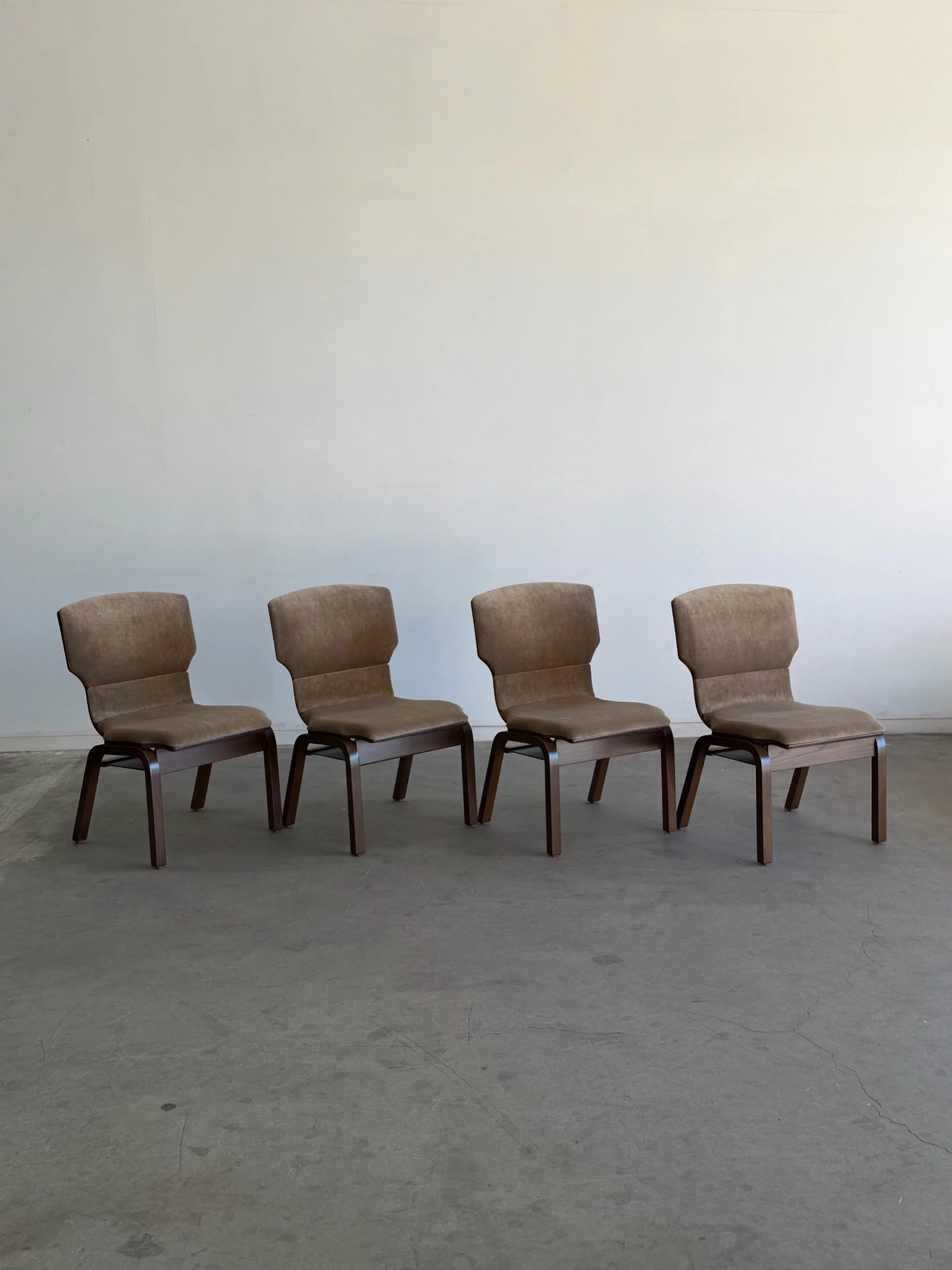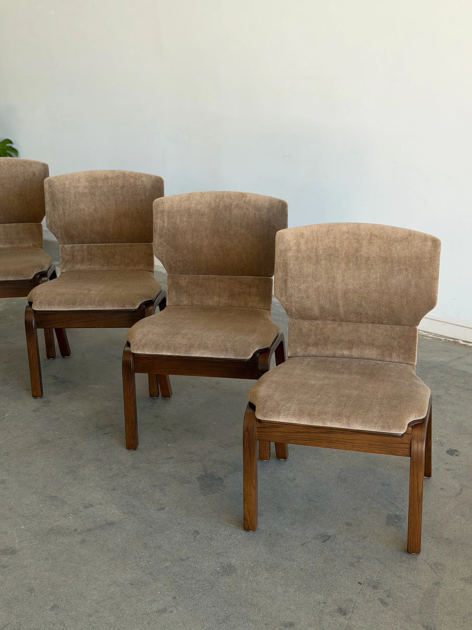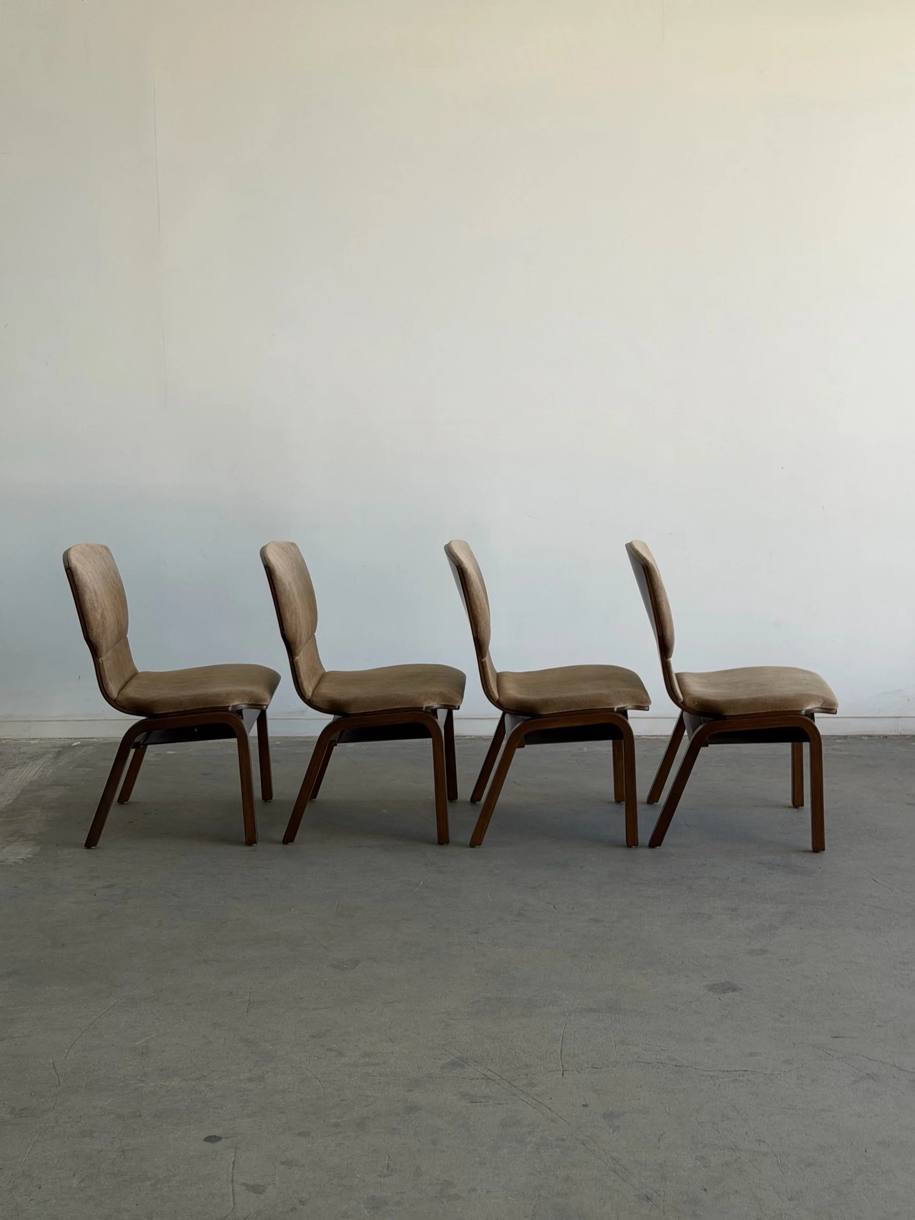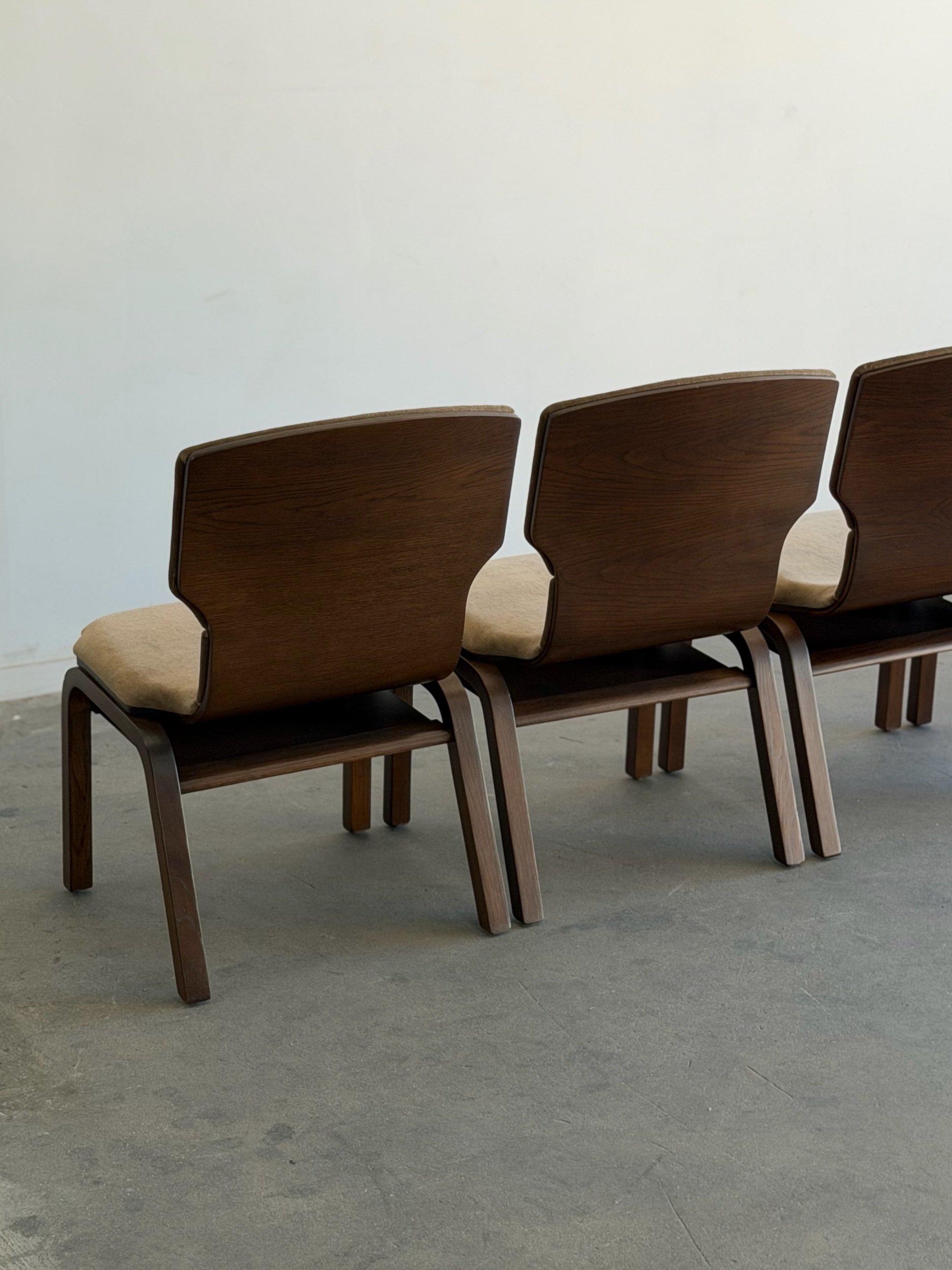 Fully restored bentwood dining chairs in excellent fully restored condition. Each unit shows be structurally sound , sturdy , and can be stacked . Chairs have fresh foam , new upholstery in low pile mohair , and have been finished in a dark walnut finish . Price is for the set of four.