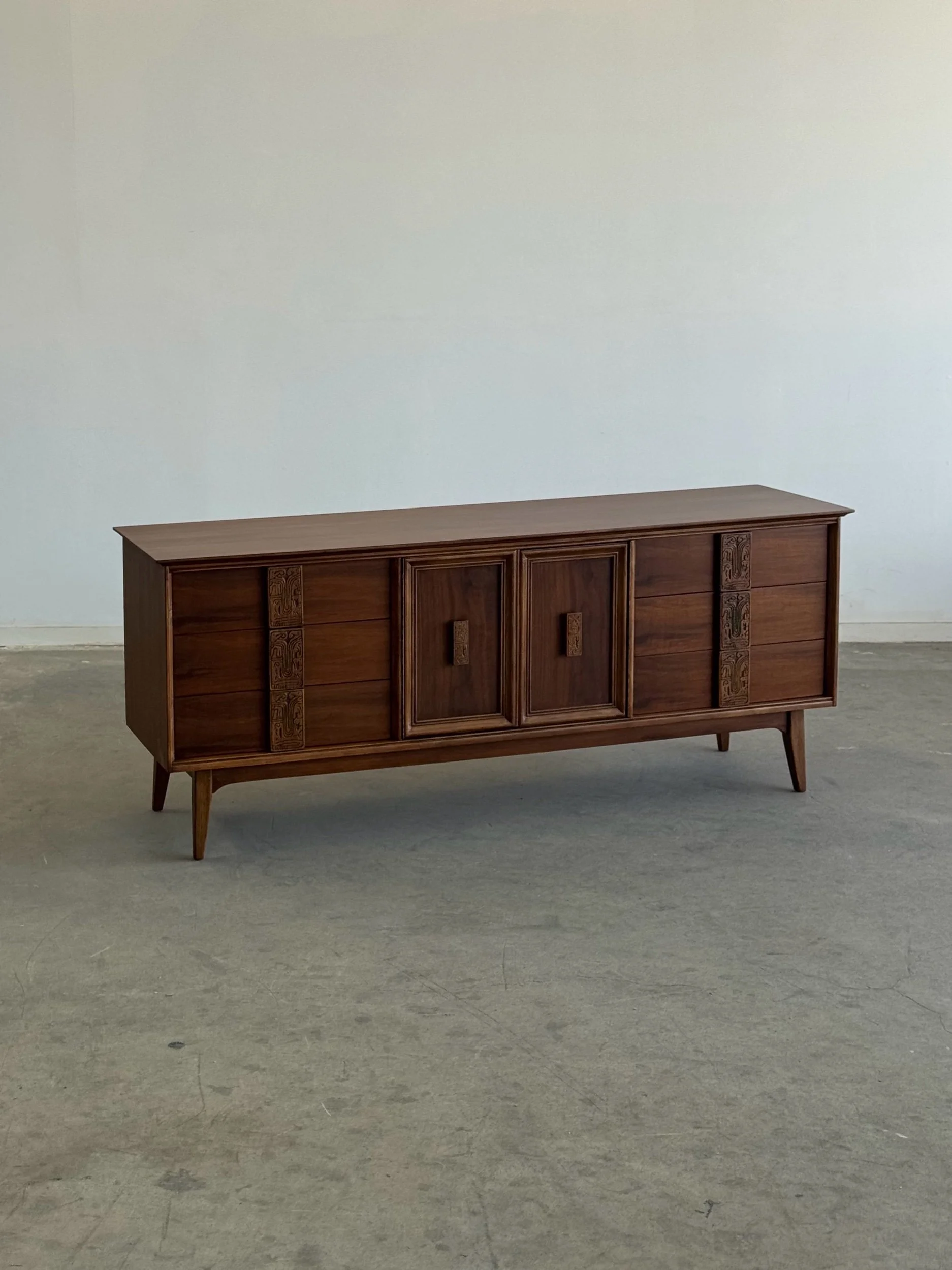 Fully restored walnut and brass two piece cabinet by American of Martinsville. Item shows well with no major areas of wear and each unit is structurally sound and sturdy. Top portion and bottom both features hidden pulls. Top Portion is completely modular and can be removed or moved side to side as needed. Price is for the set.