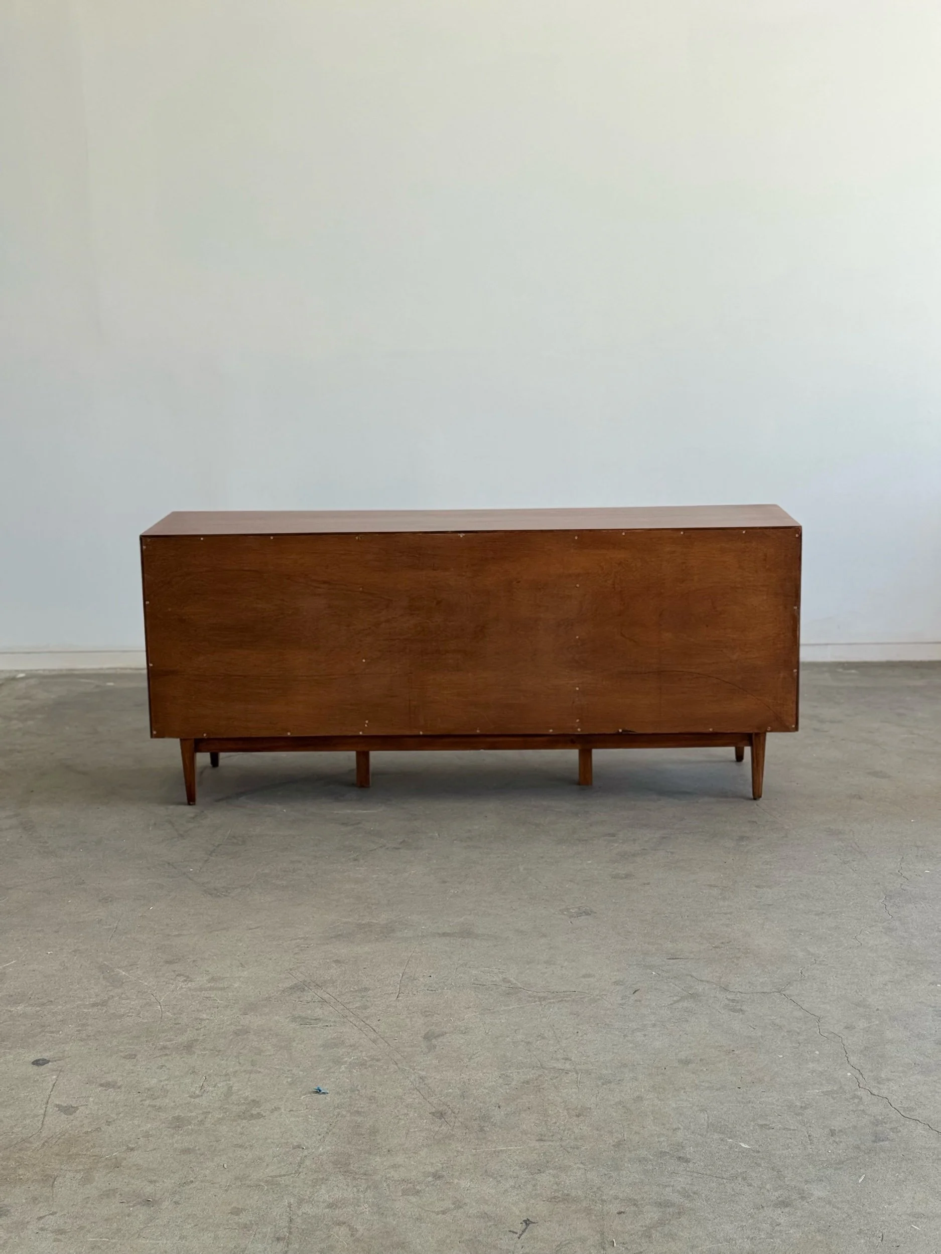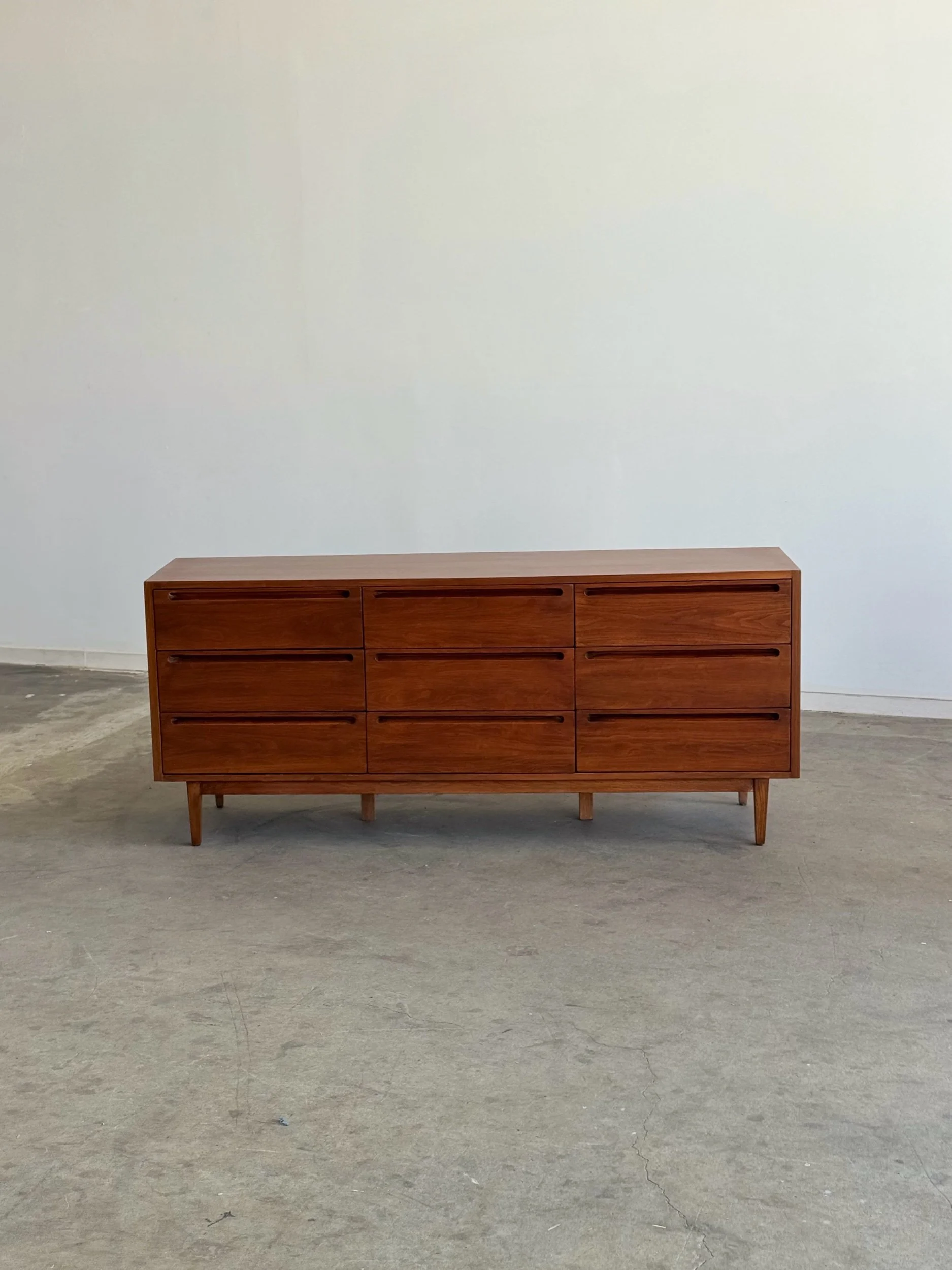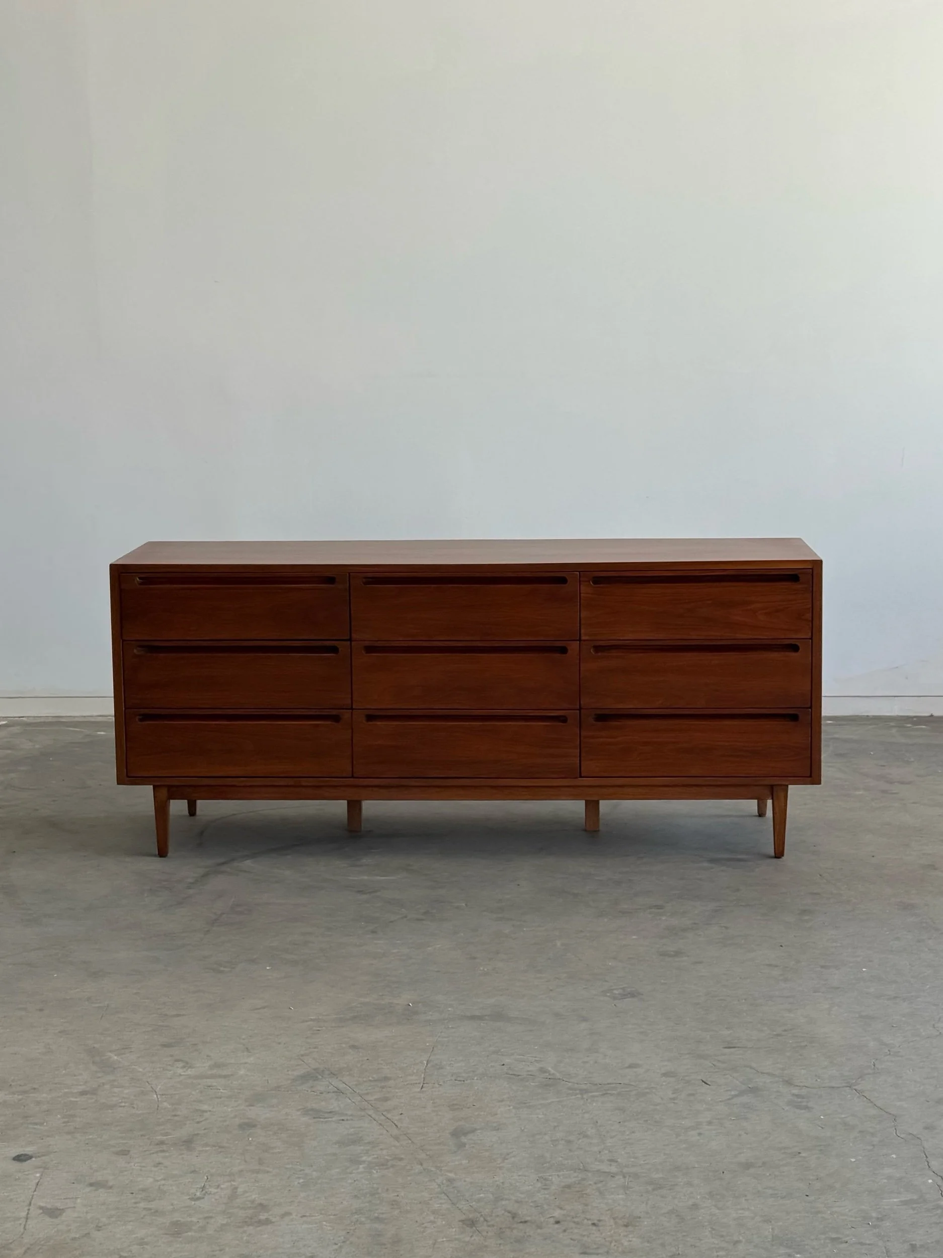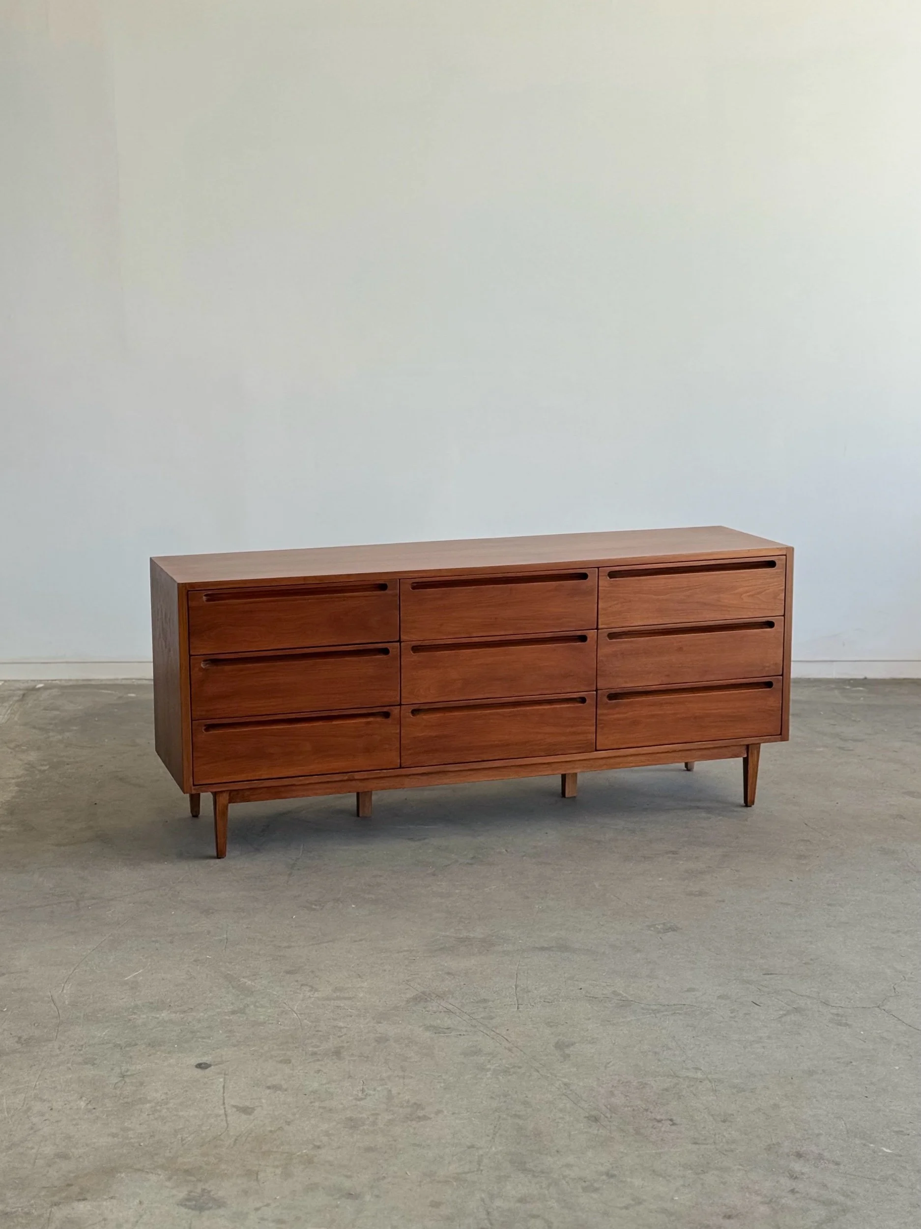 Large dresser in fully restored condition by American of Martinsville. Item is structurally sound and fully functional. Unit has original hardware and sits on solid tapered legs . Unit has drawer stoppers added to keep drawers secured , drawers can still be removed when needed.